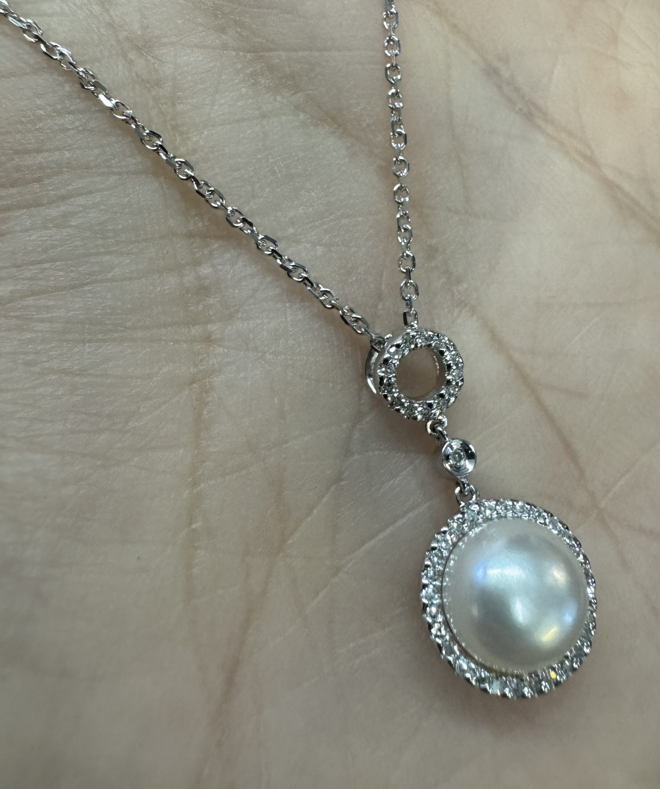 14k White Gold 7.8 MM Button Pearl & Diamond Halo Pendant