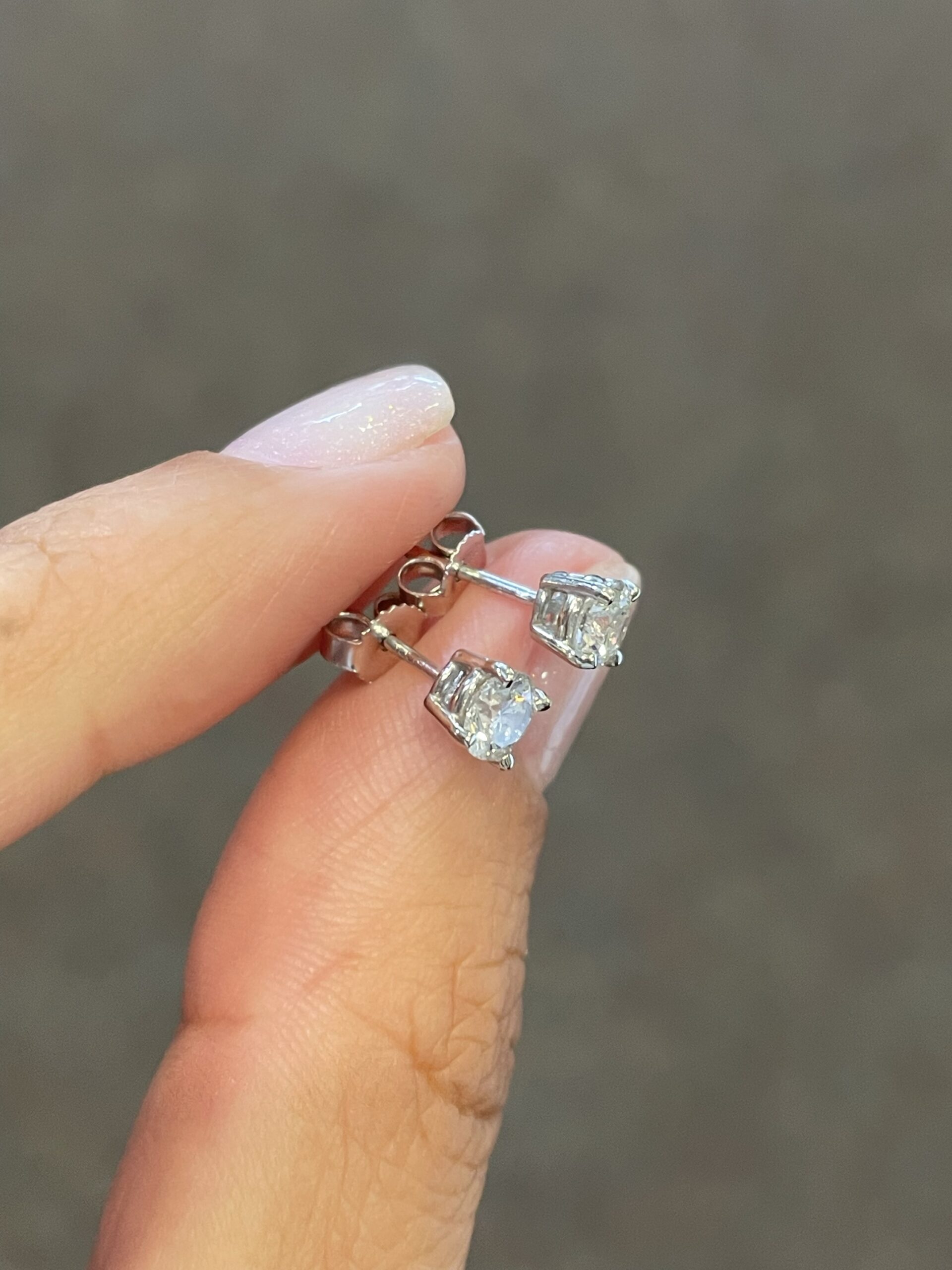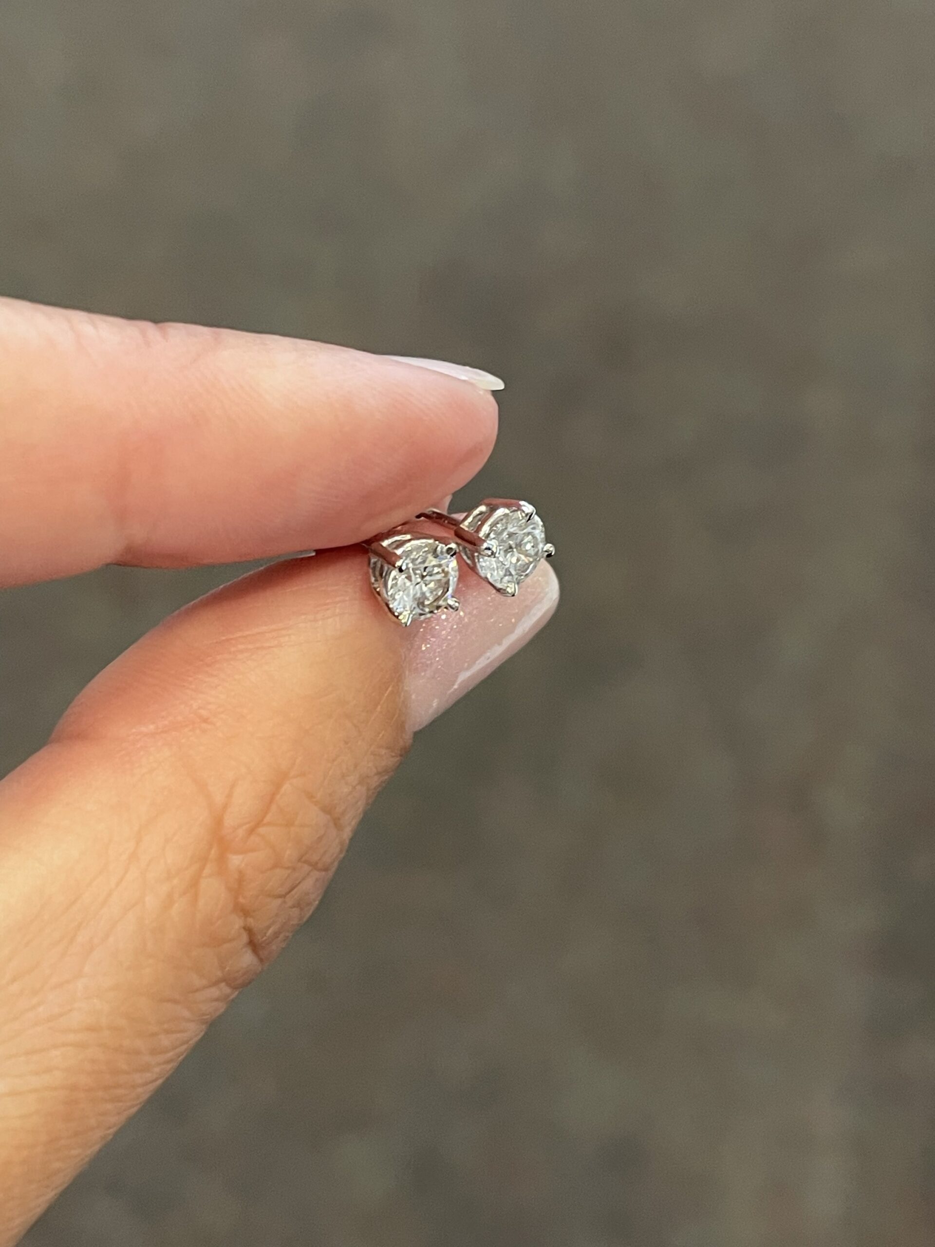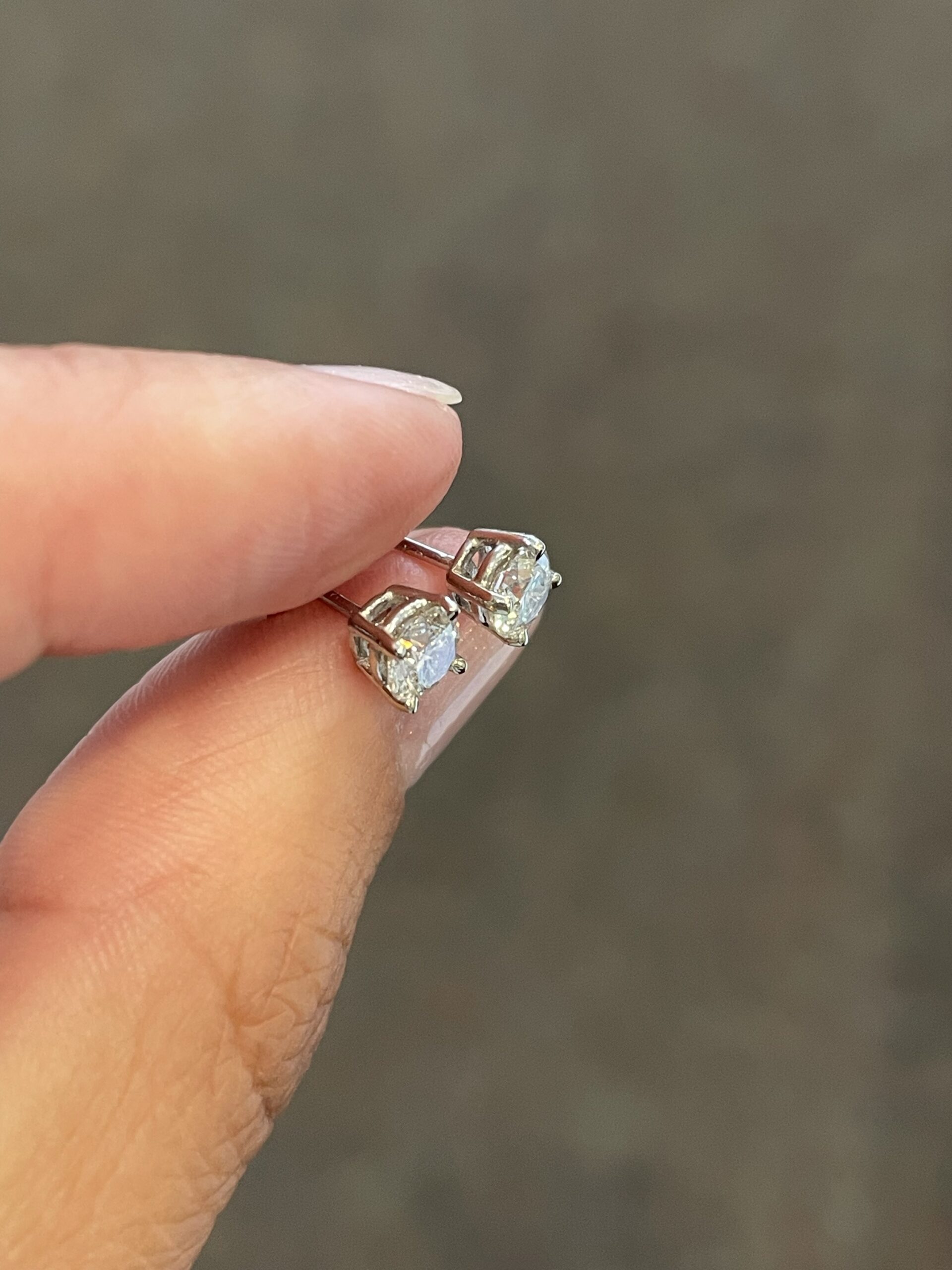 14k white gold genuine .71 Cttw Round Brilliant Cut Diamond stud earrings with 4 prong basket style settings. These 2 diamonds average G in color, and SI1 in clarity. These diamonds are nicely proportioned and well finished. These earrings have an entire weight of 0.9 grams.