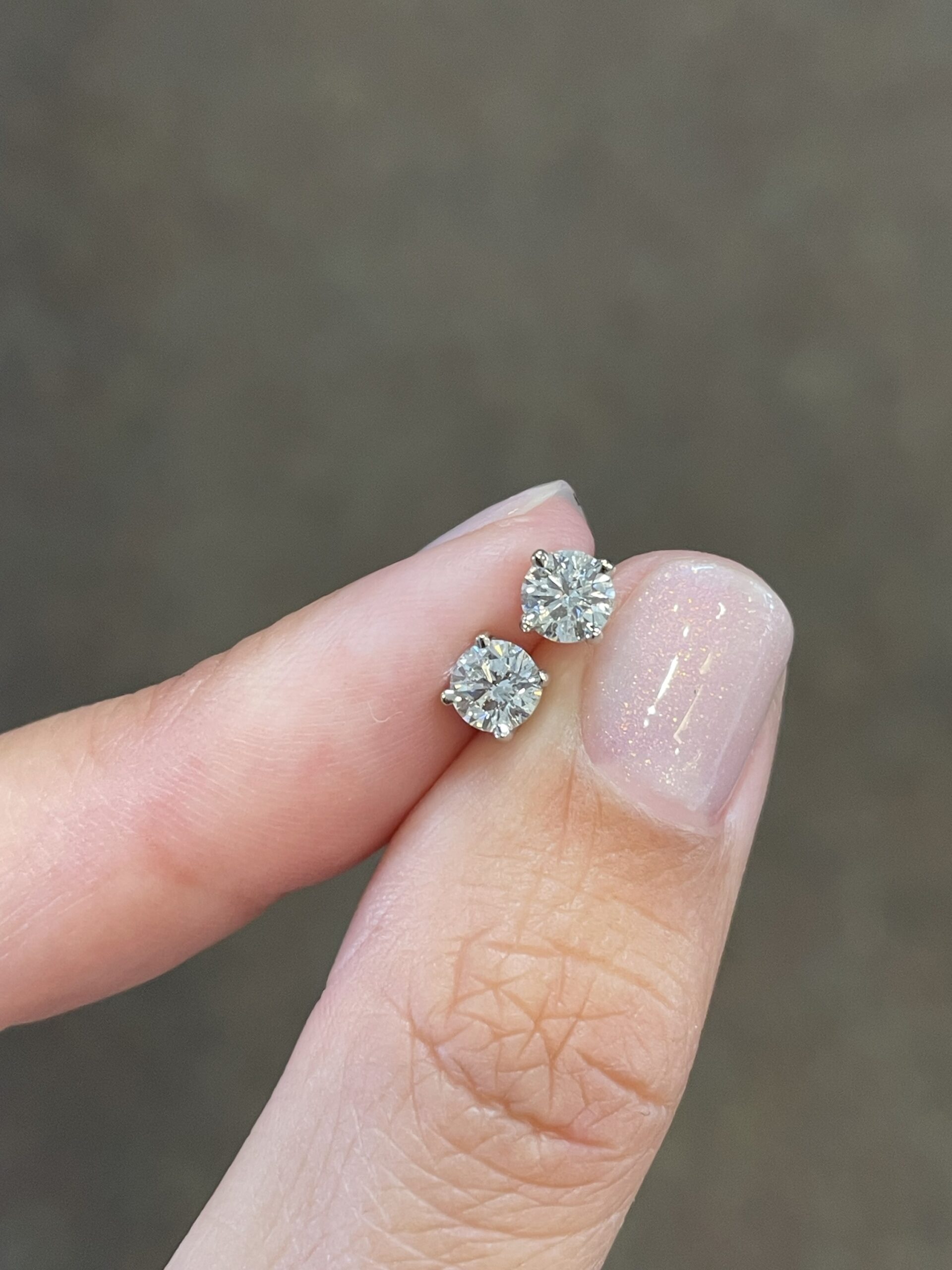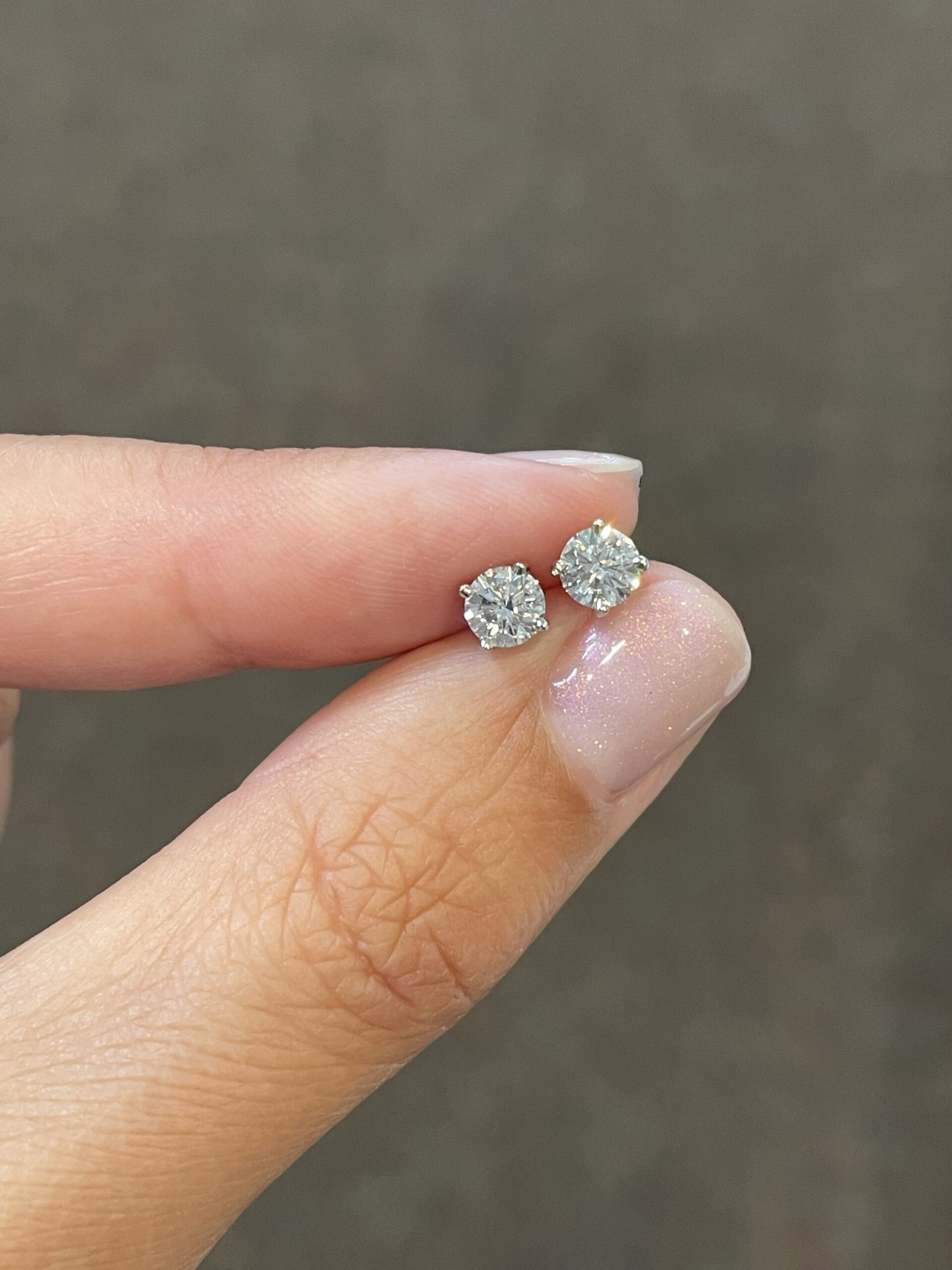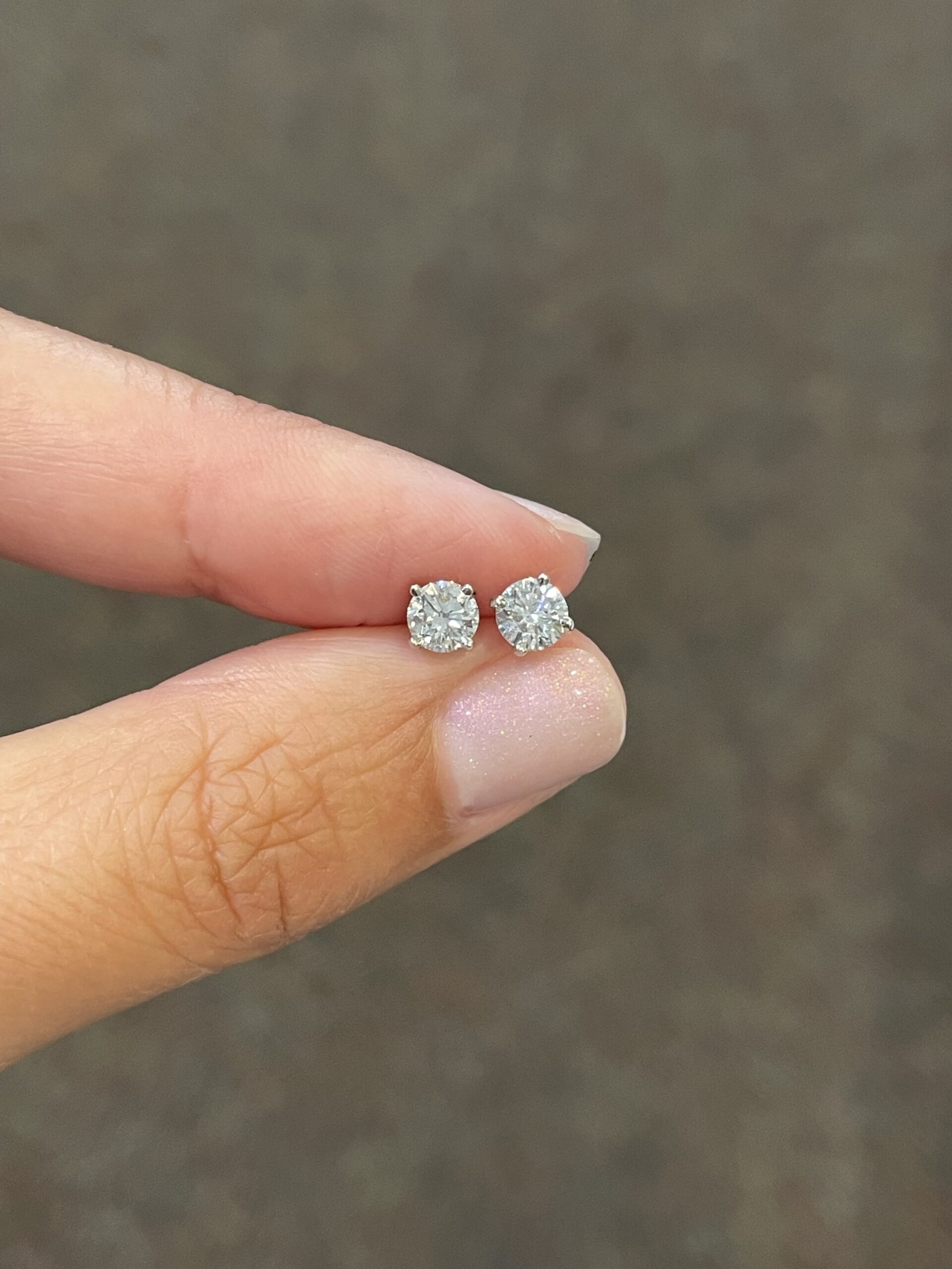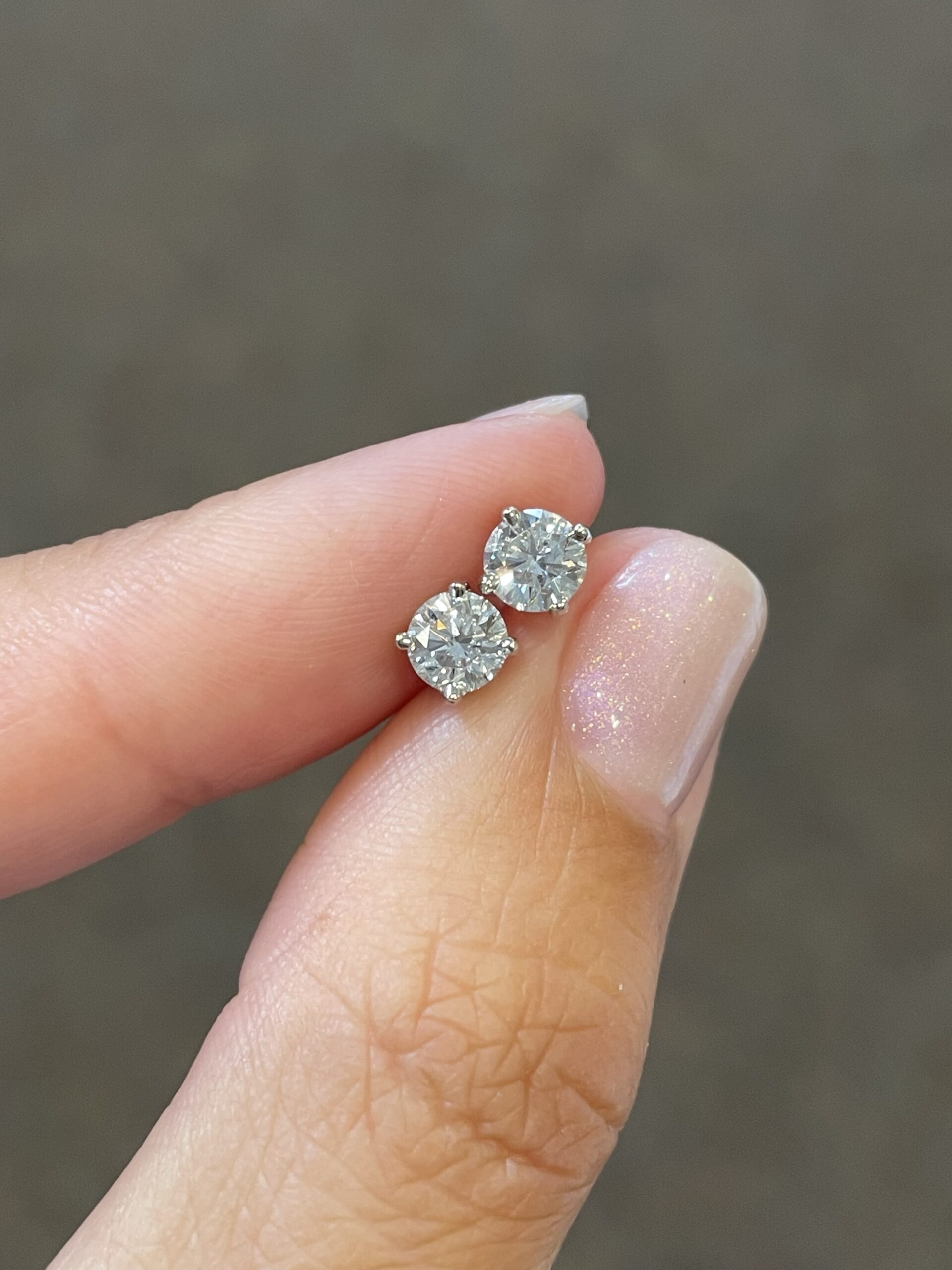 14k white gold genuine .71 Cttw Round Brilliant Cut Diamond stud earrings with 4 prong basket style settings. These 2 diamonds average G in color, and SI1 in clarity. These diamonds are nicely proportioned and well finished. These earrings have an entire weight of 0.9 grams.
