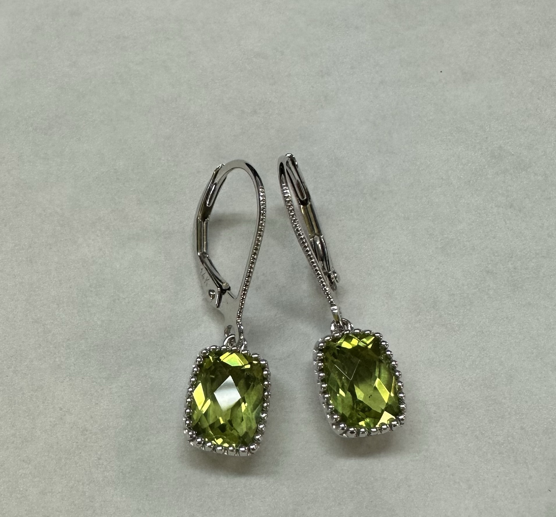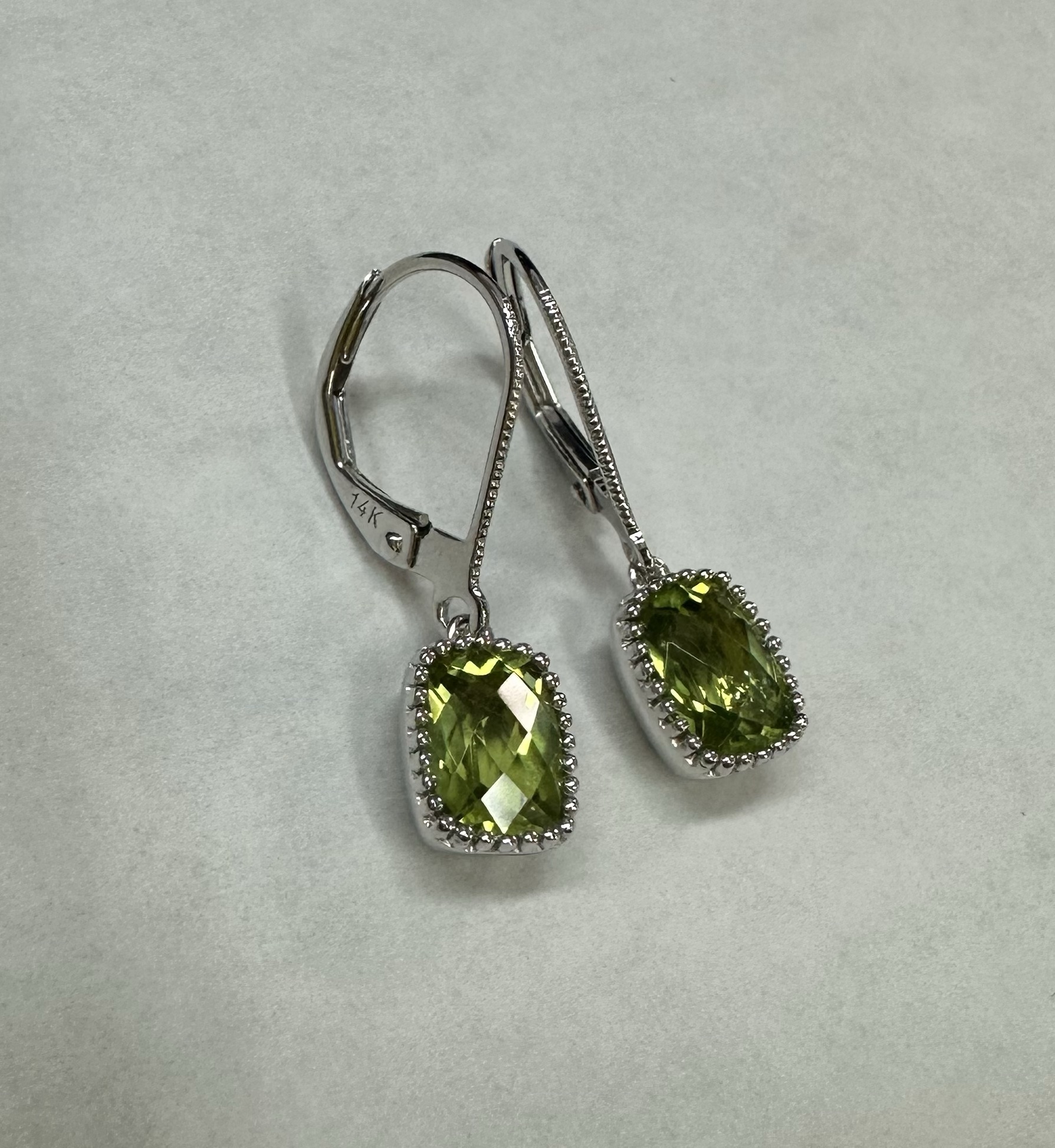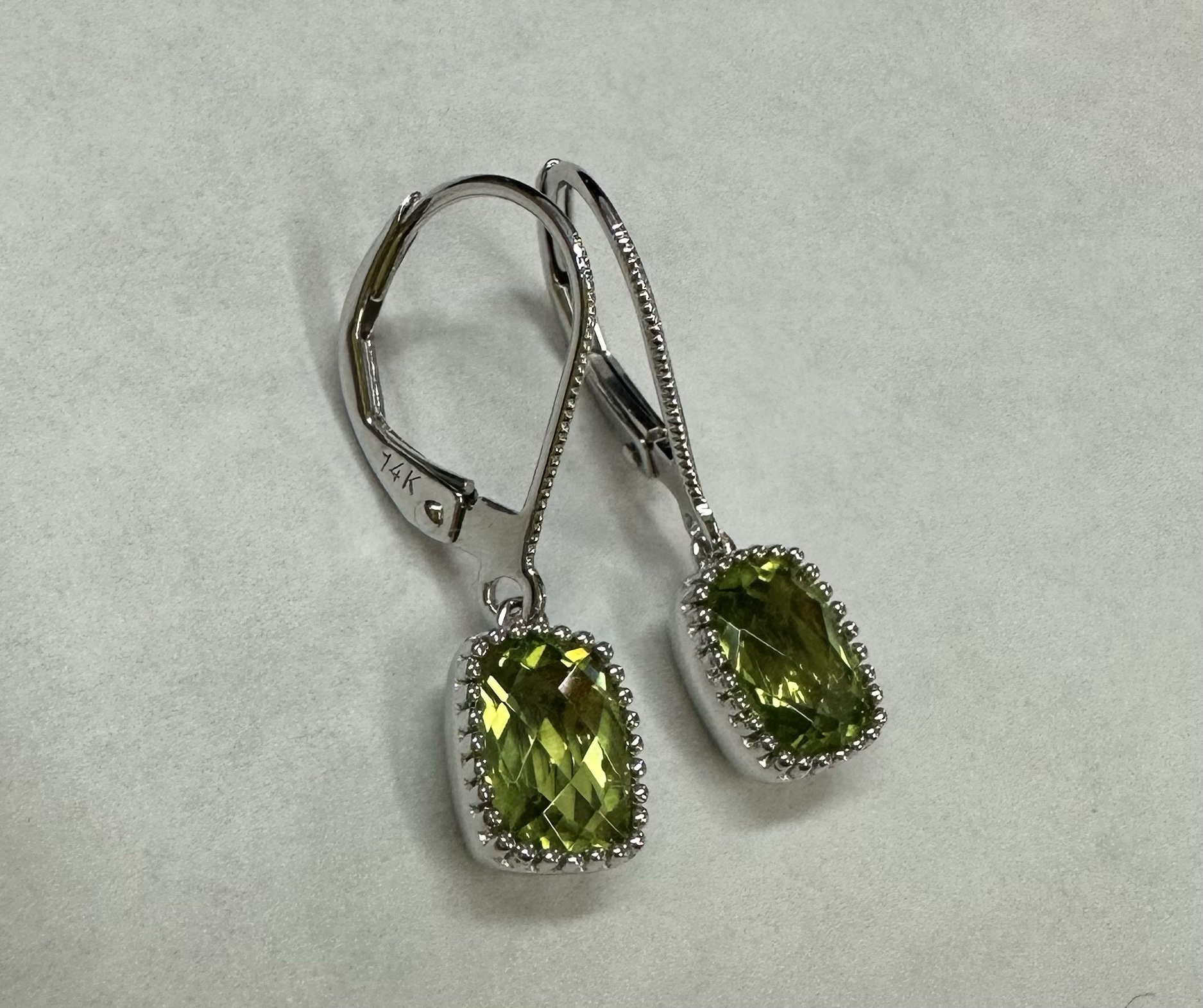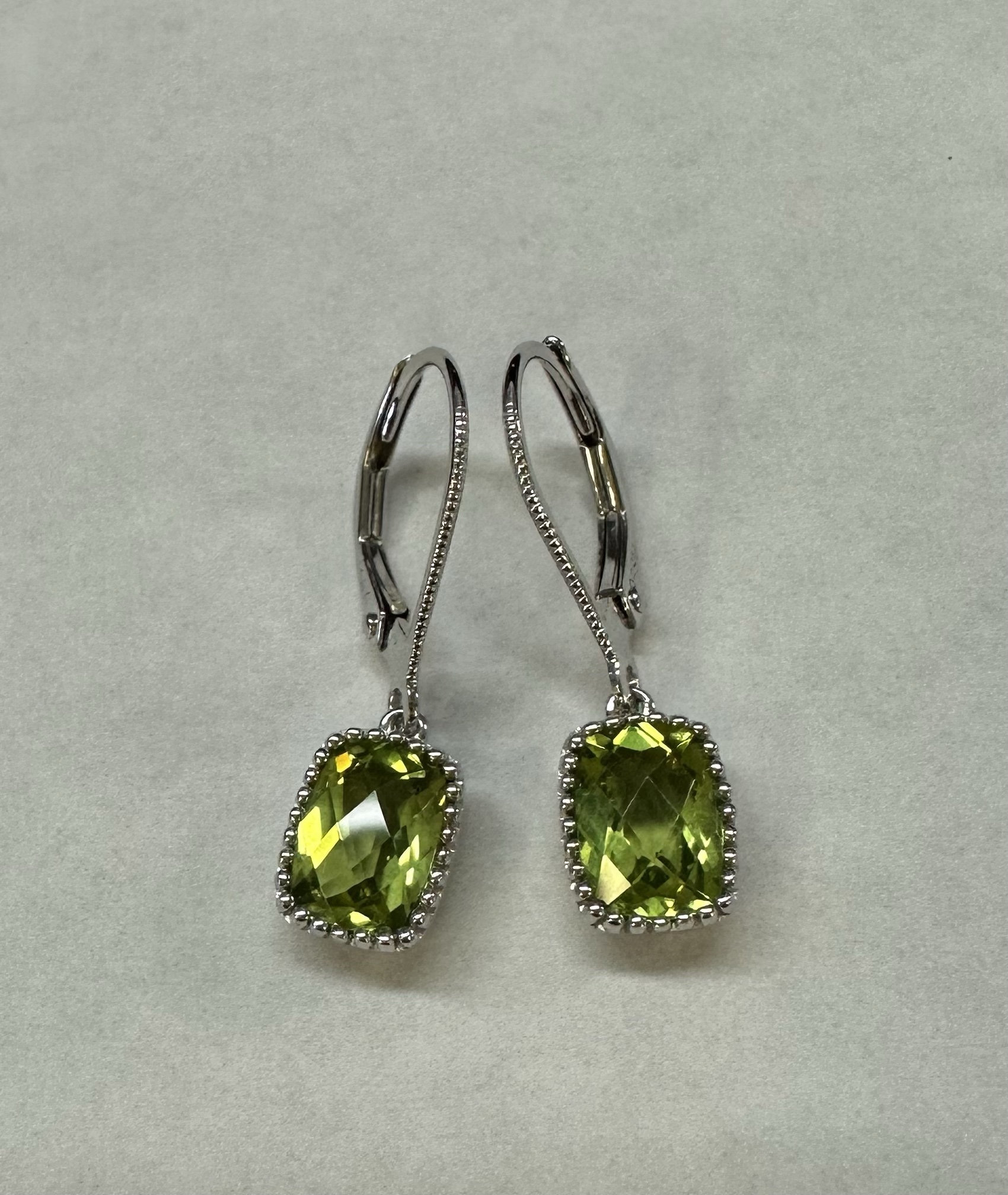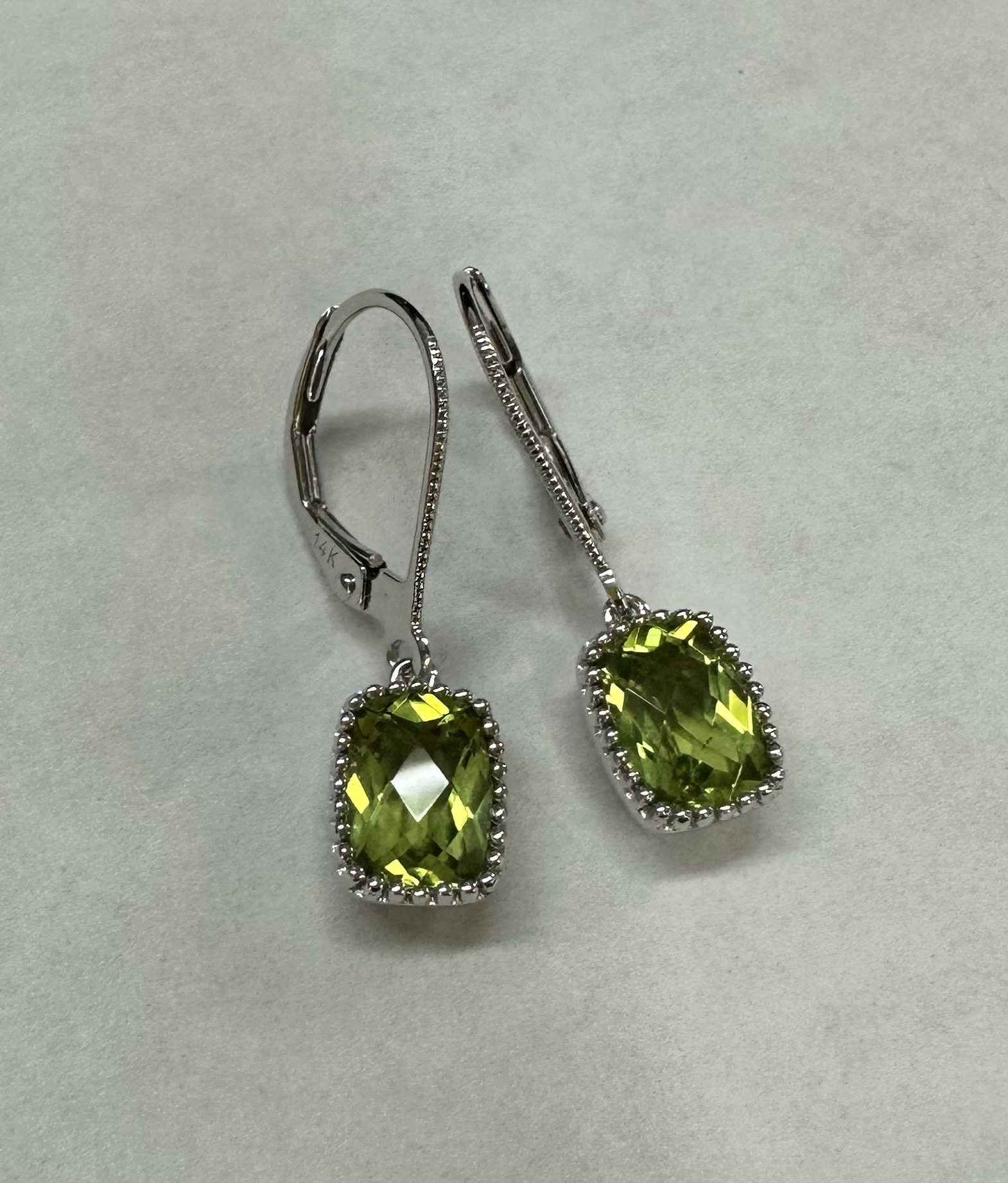 14k white gold genuine bezel set 1.74 cttw Peridot (August birthstone) cushion shaped, faceted lever back dangle earrings with beaded border. These earrings have an entire weight of 2.1 grams.