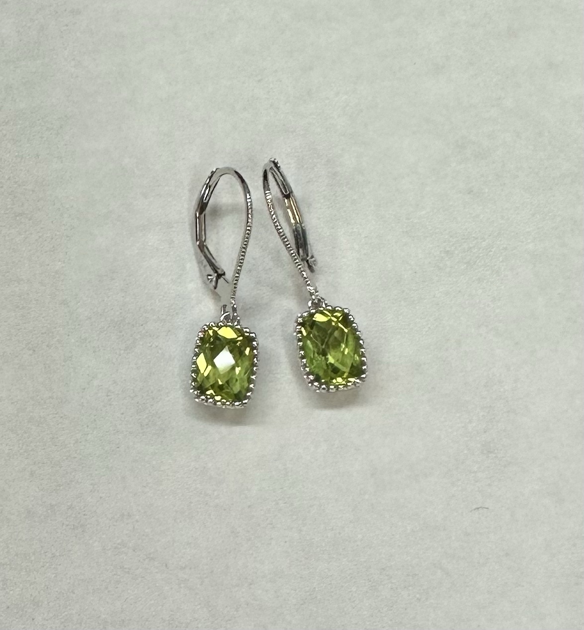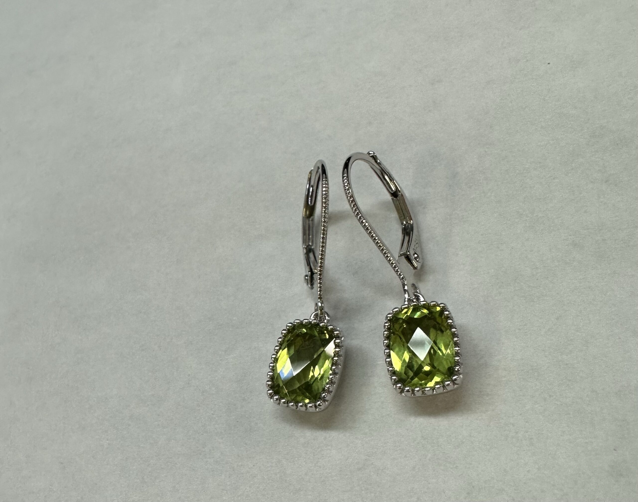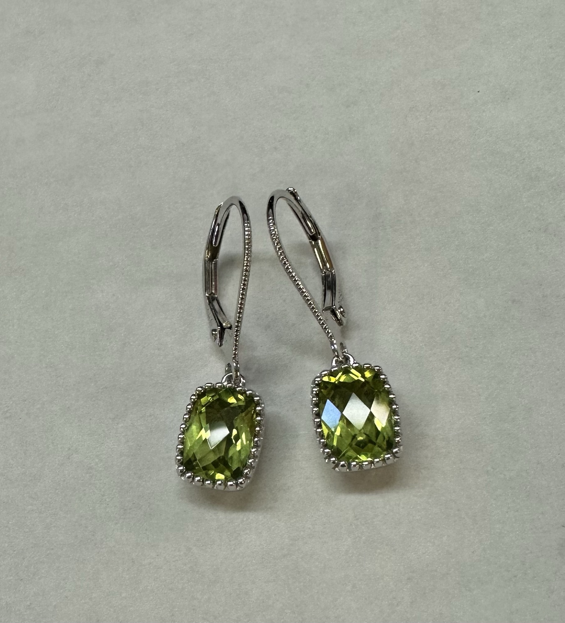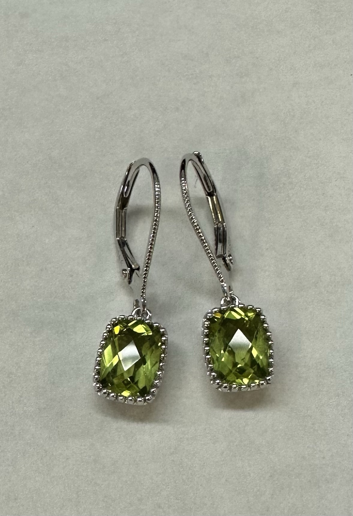 14k white gold genuine bezel set 1.74 cttw Peridot (August birthstone) cushion shaped, faceted lever back dangle earrings with beaded border. These earrings have an entire weight of 2.1 grams.