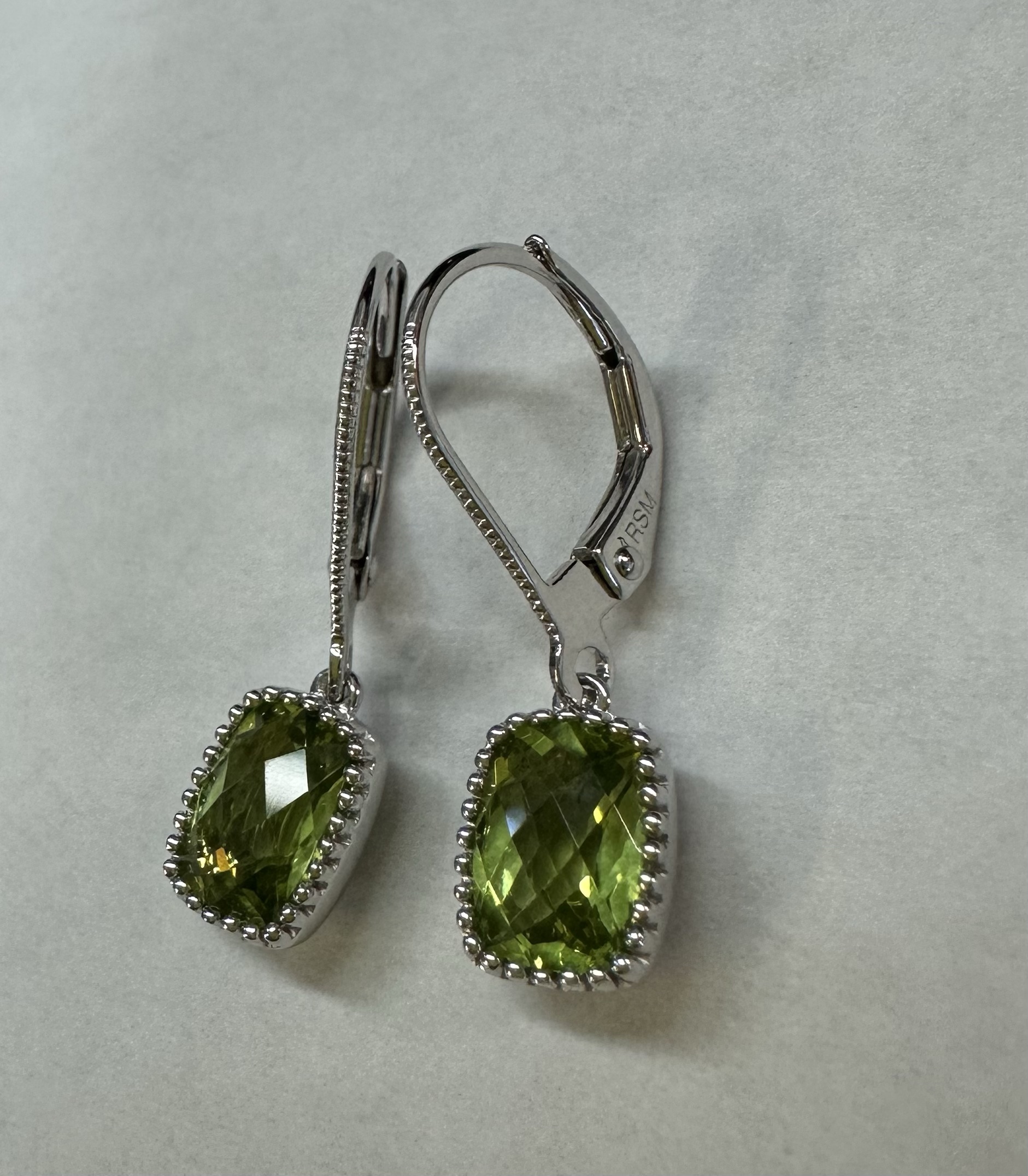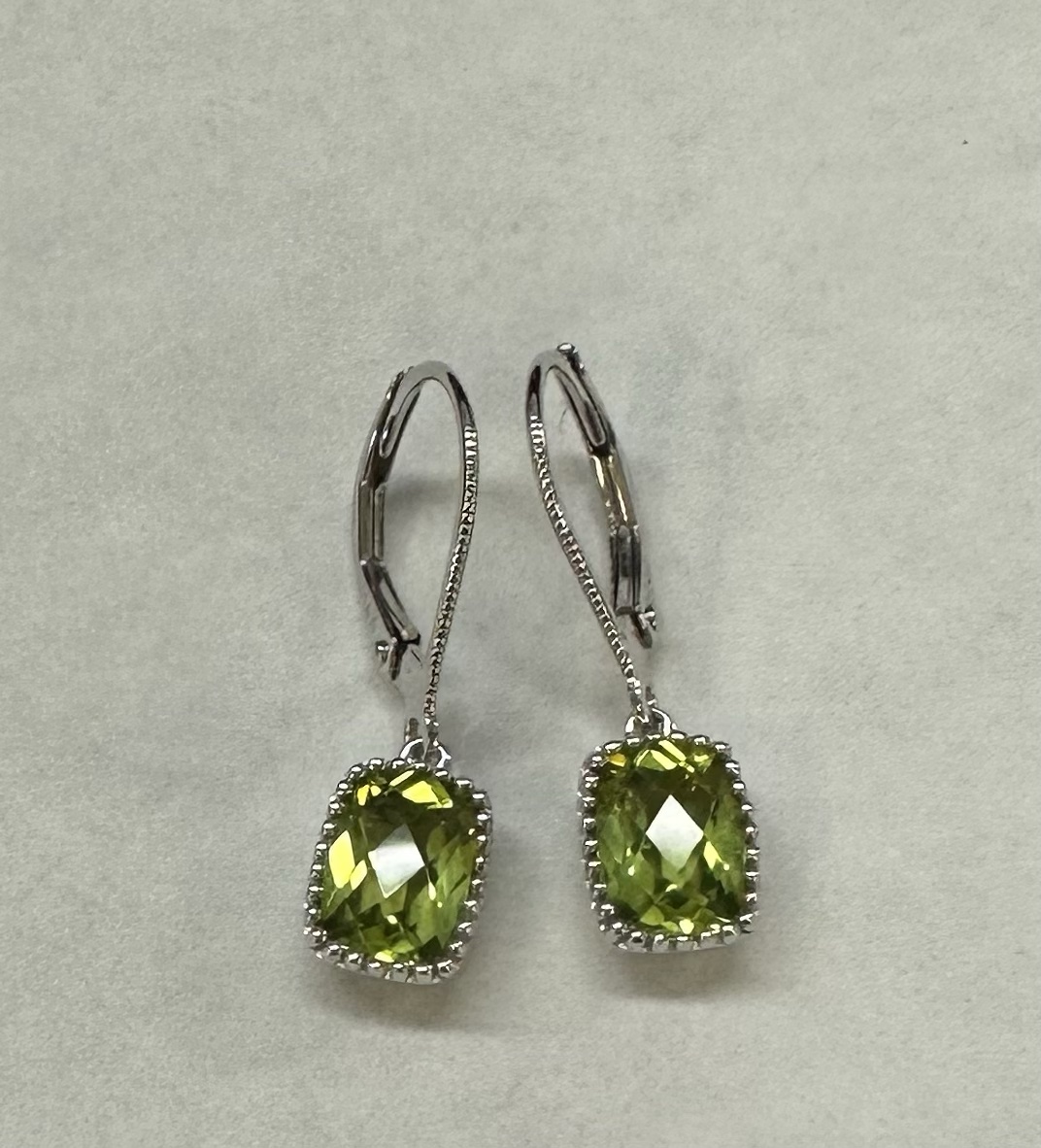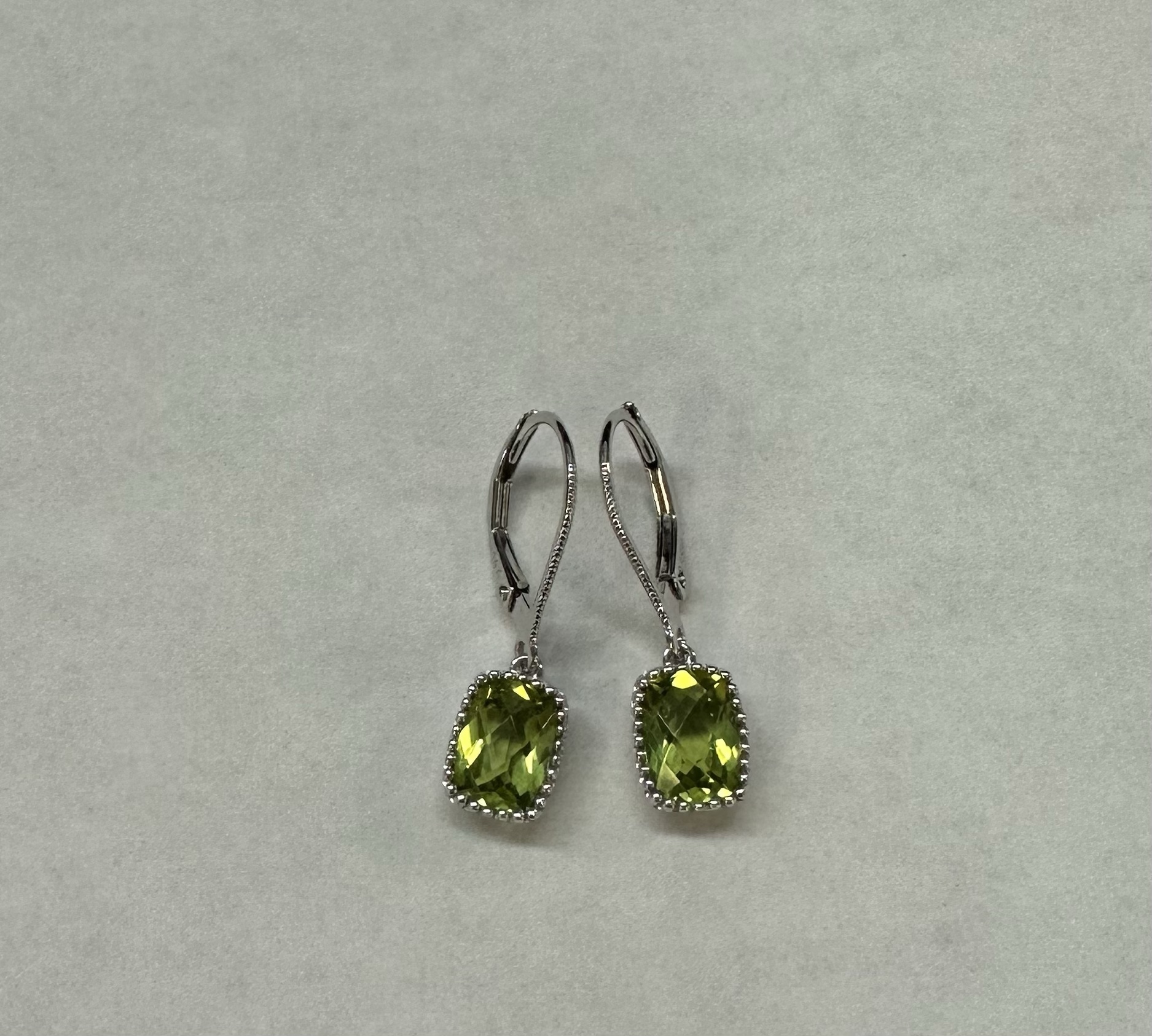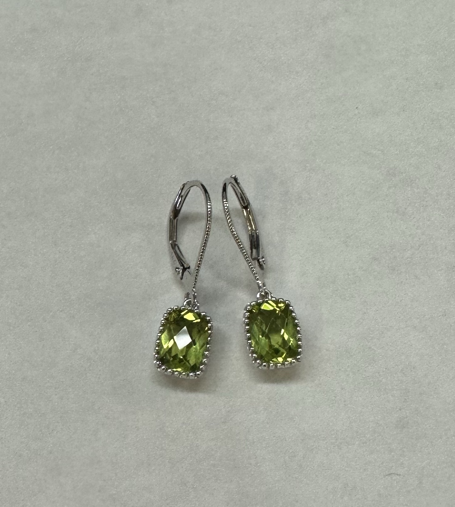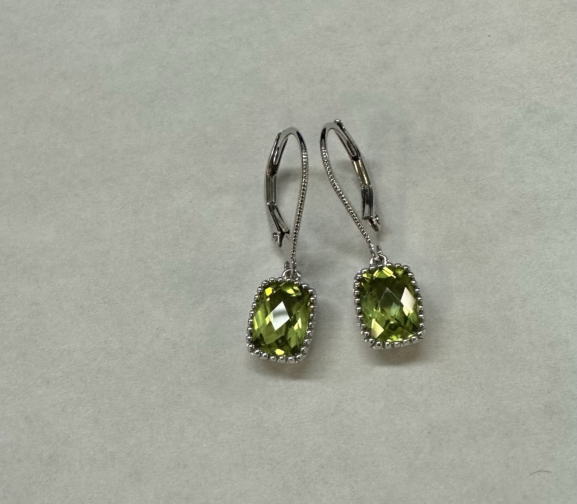14k white gold genuine bezel set 1.74 cttw Peridot (August birthstone) cushion shaped, faceted lever back dangle earrings with beaded border. These earrings have an entire weight of 2.1 grams.