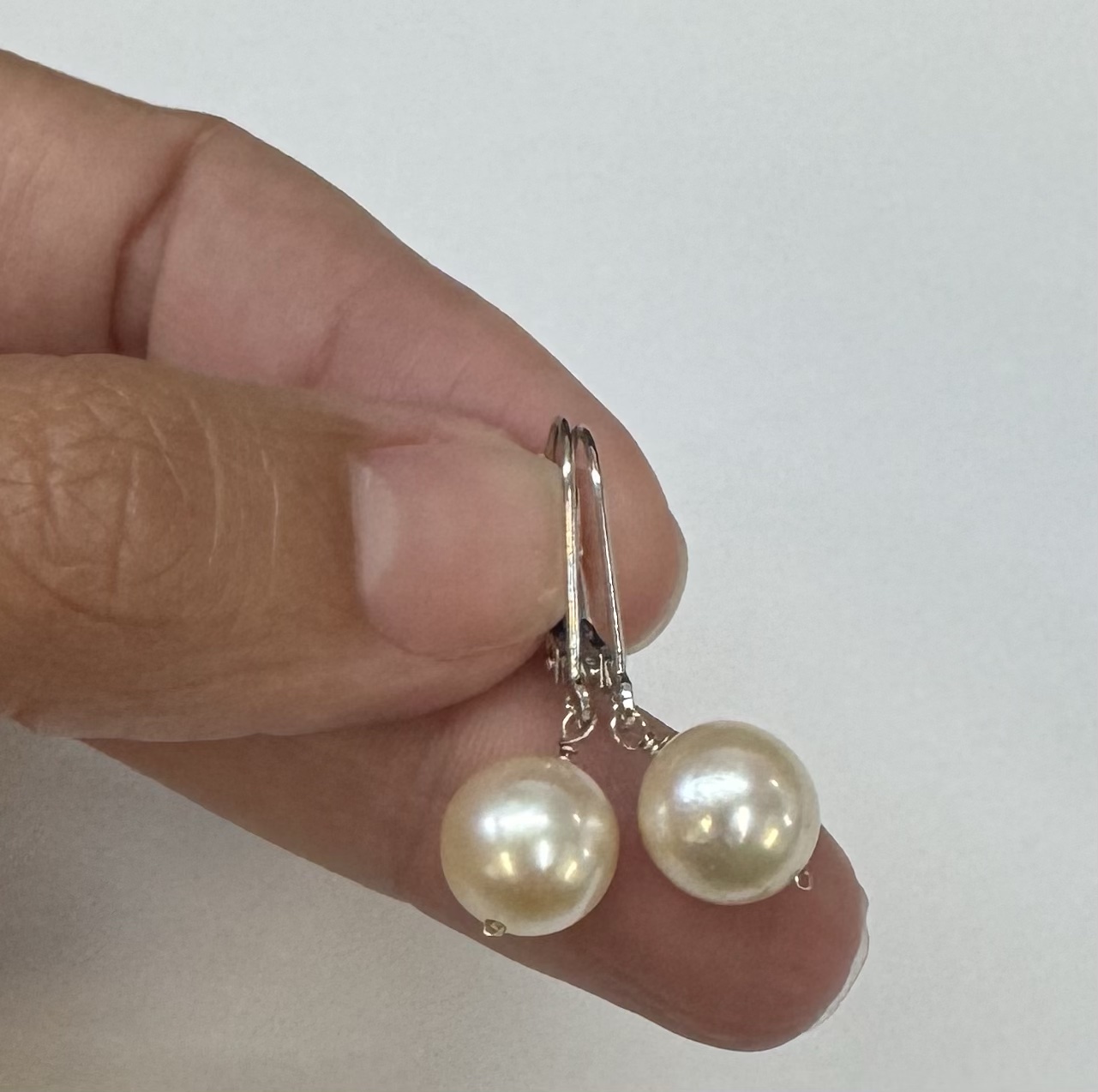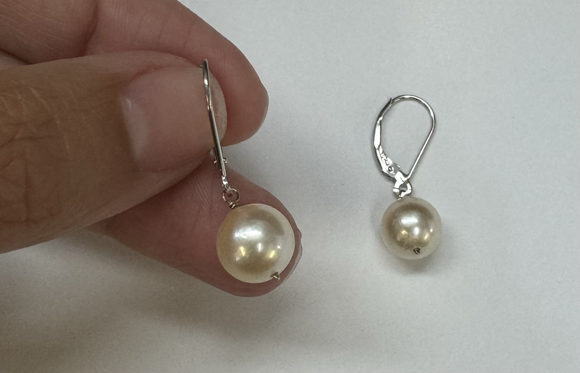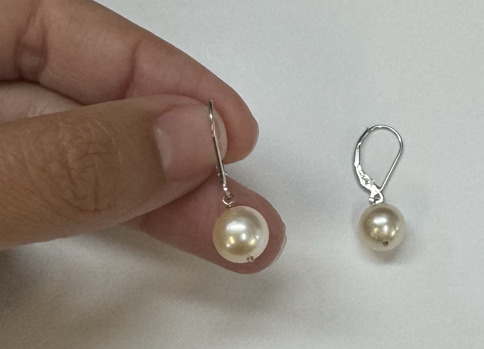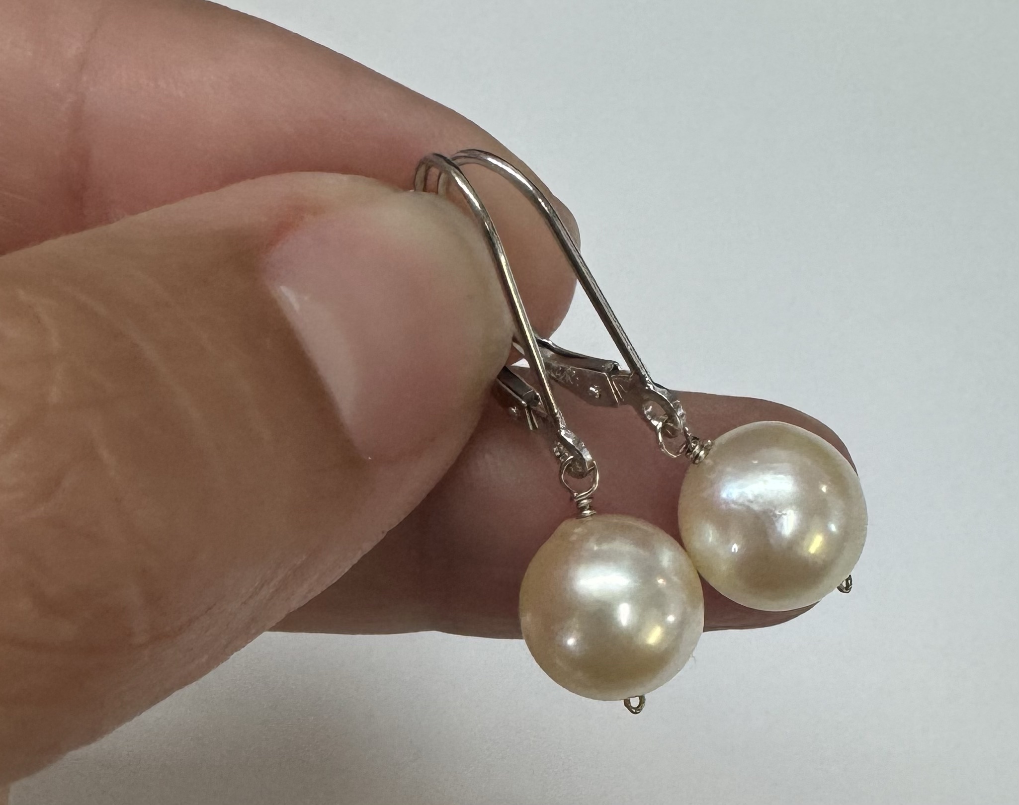 14k white gold 8.9 mm cultured saltwater pearl lever back dangle earrings. These earrings have an entire weight of 2.7 grams.