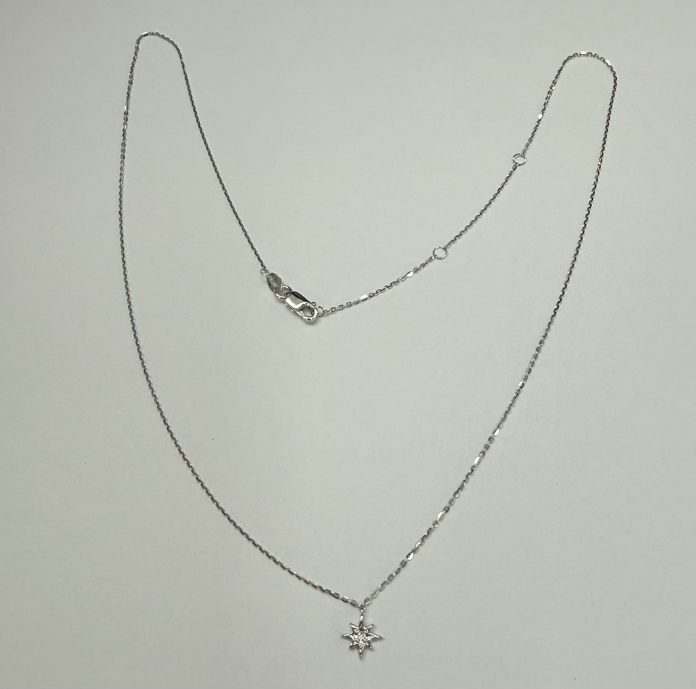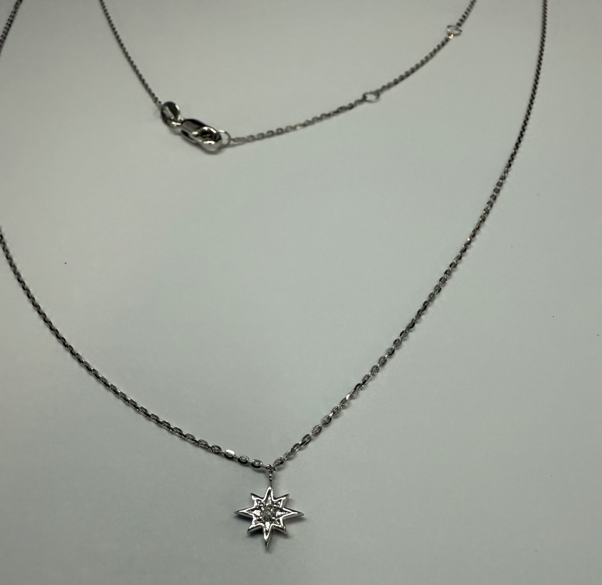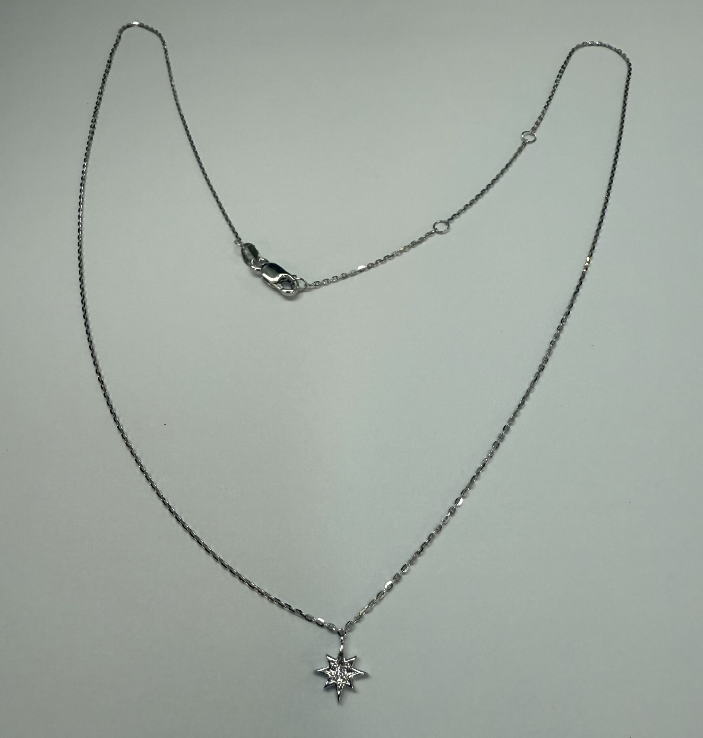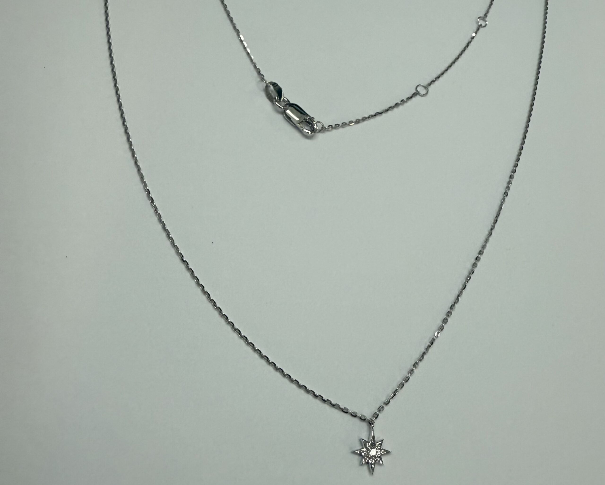 14k white gold delicate genuine .03 cttw Round Brilliant Cut diamond starburst pendant. This diamond has a color grade of G, and a clarity grade of SI. This pendant is adjustable 16-18″, and it has an entire weight of 1.3 grams.