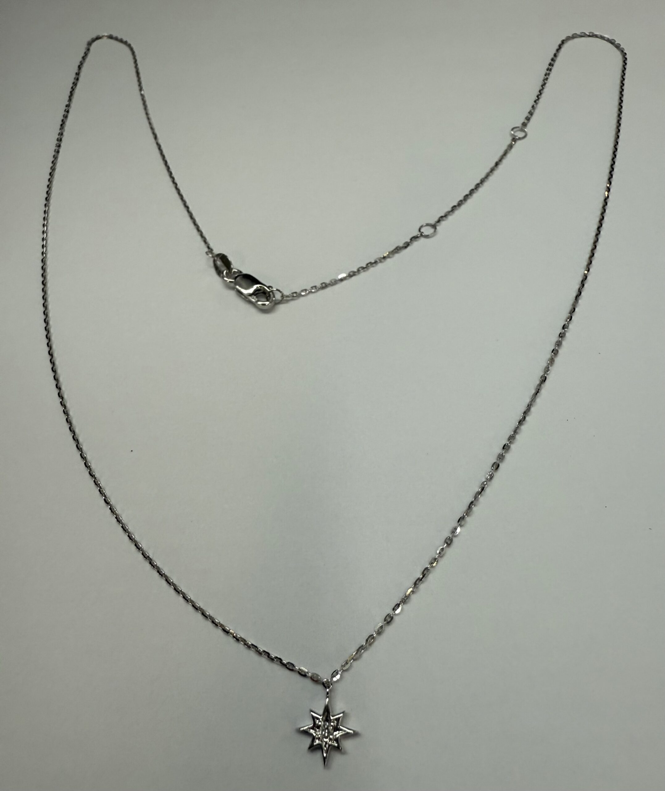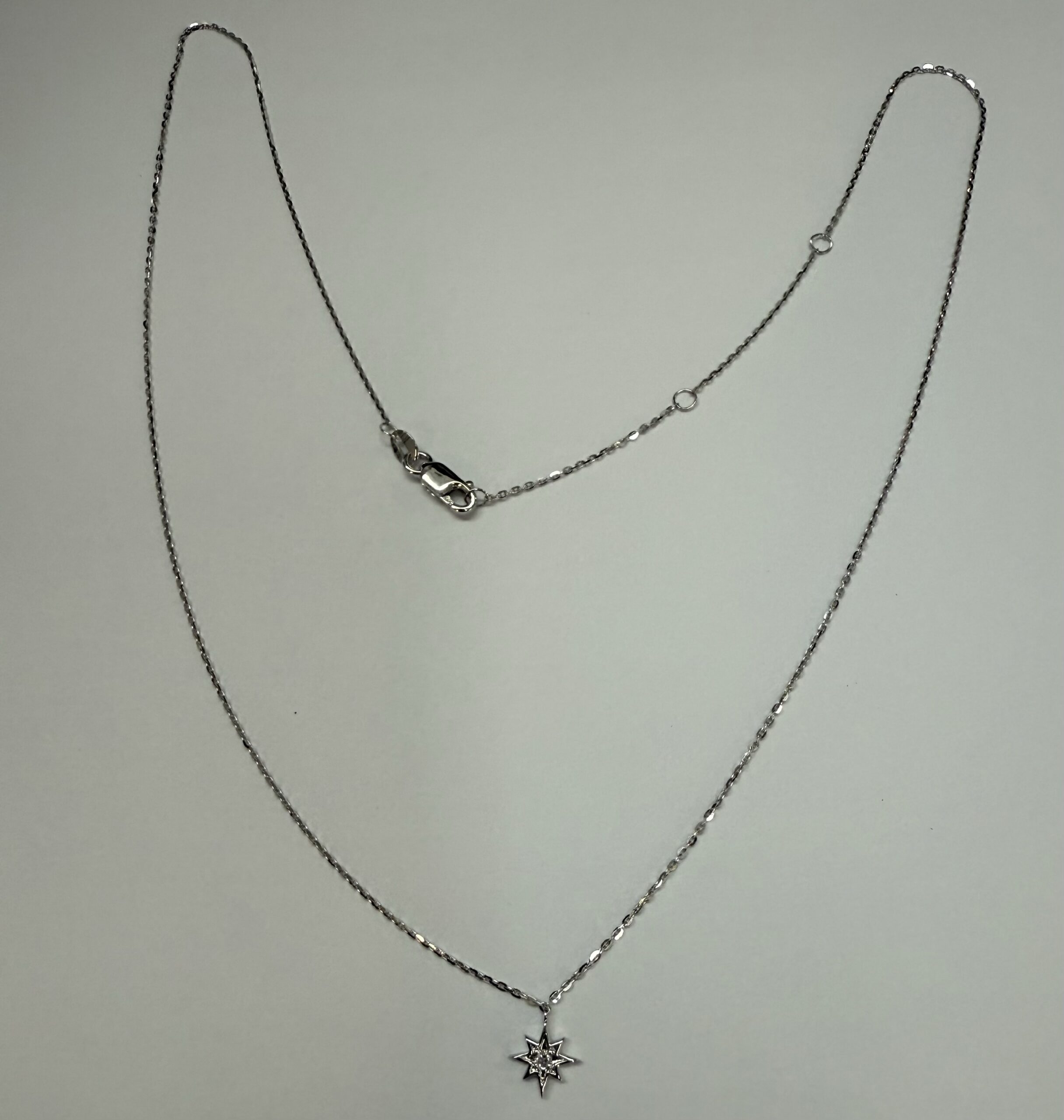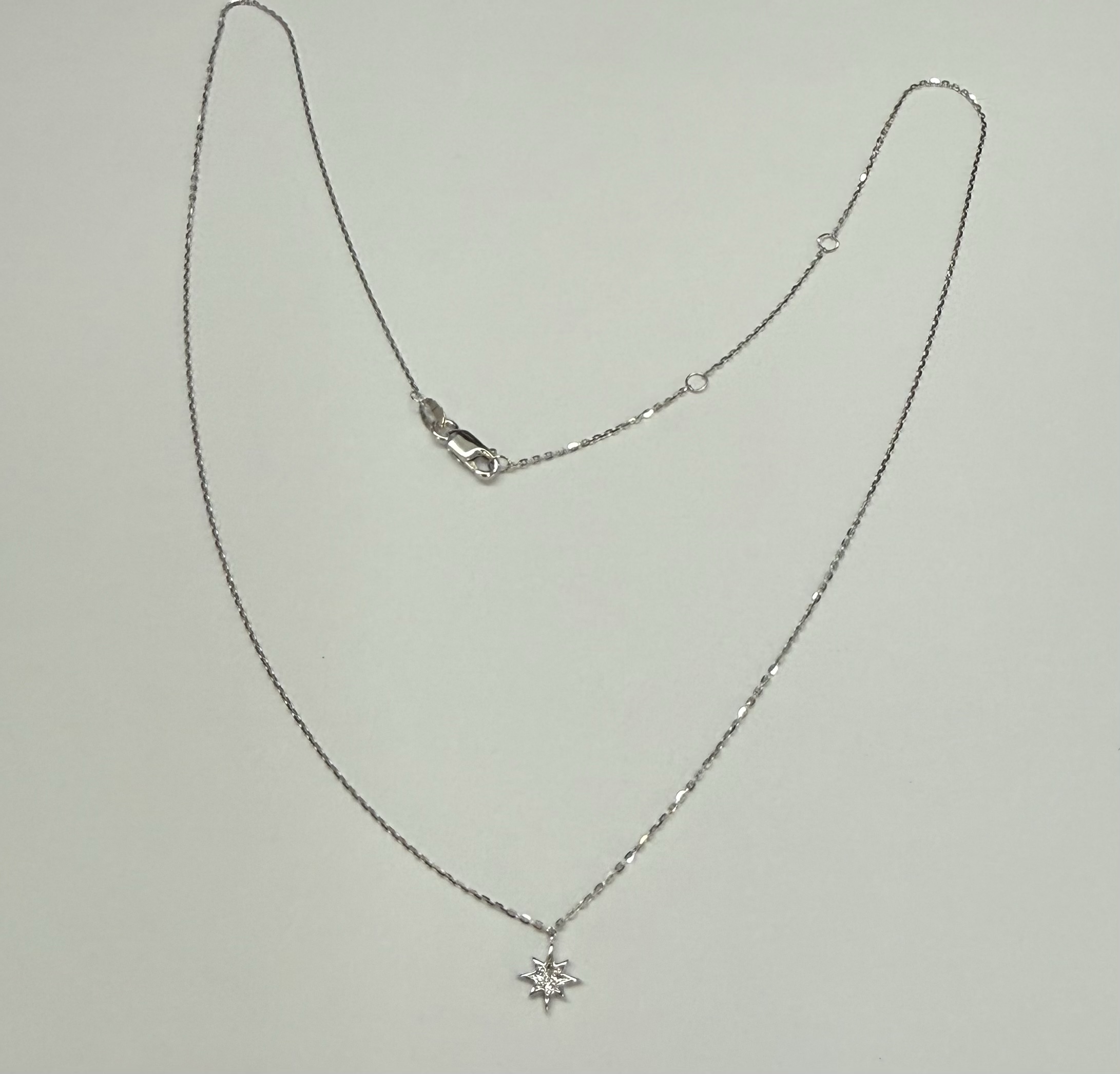 14k white gold delicate genuine .03 cttw Round Brilliant Cut diamond starburst pendant. This diamond has a color grade of G, and a clarity grade of SI. This pendant is adjustable 16-18″, and it has an entire weight of 1.3 grams.