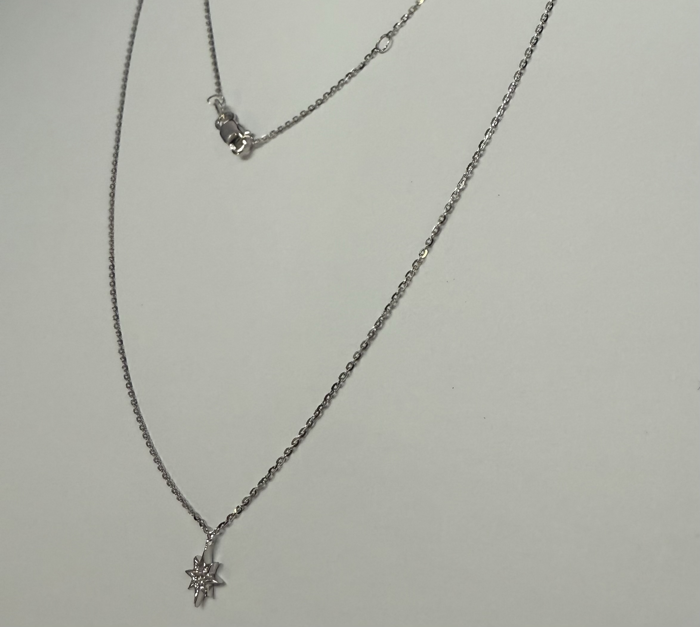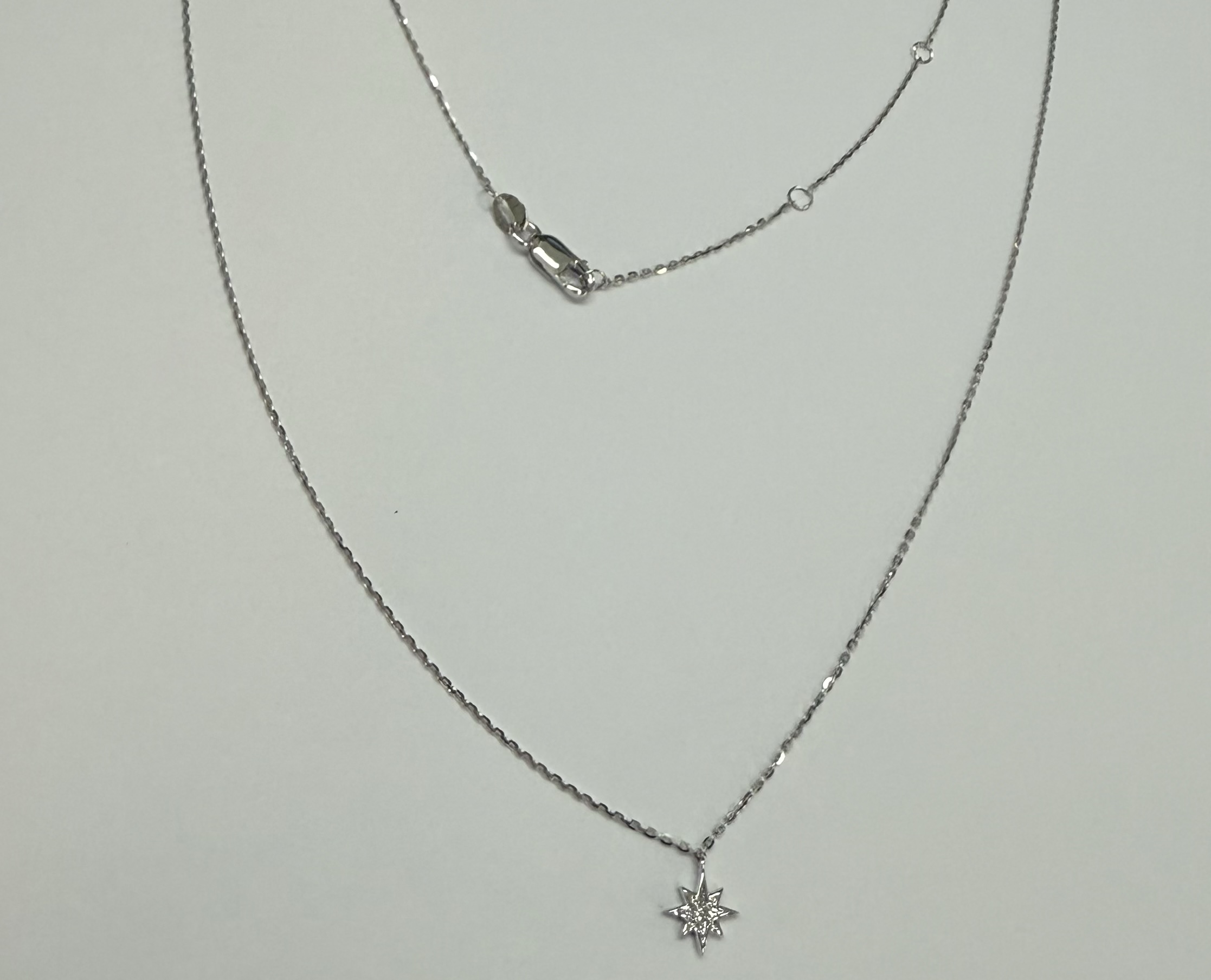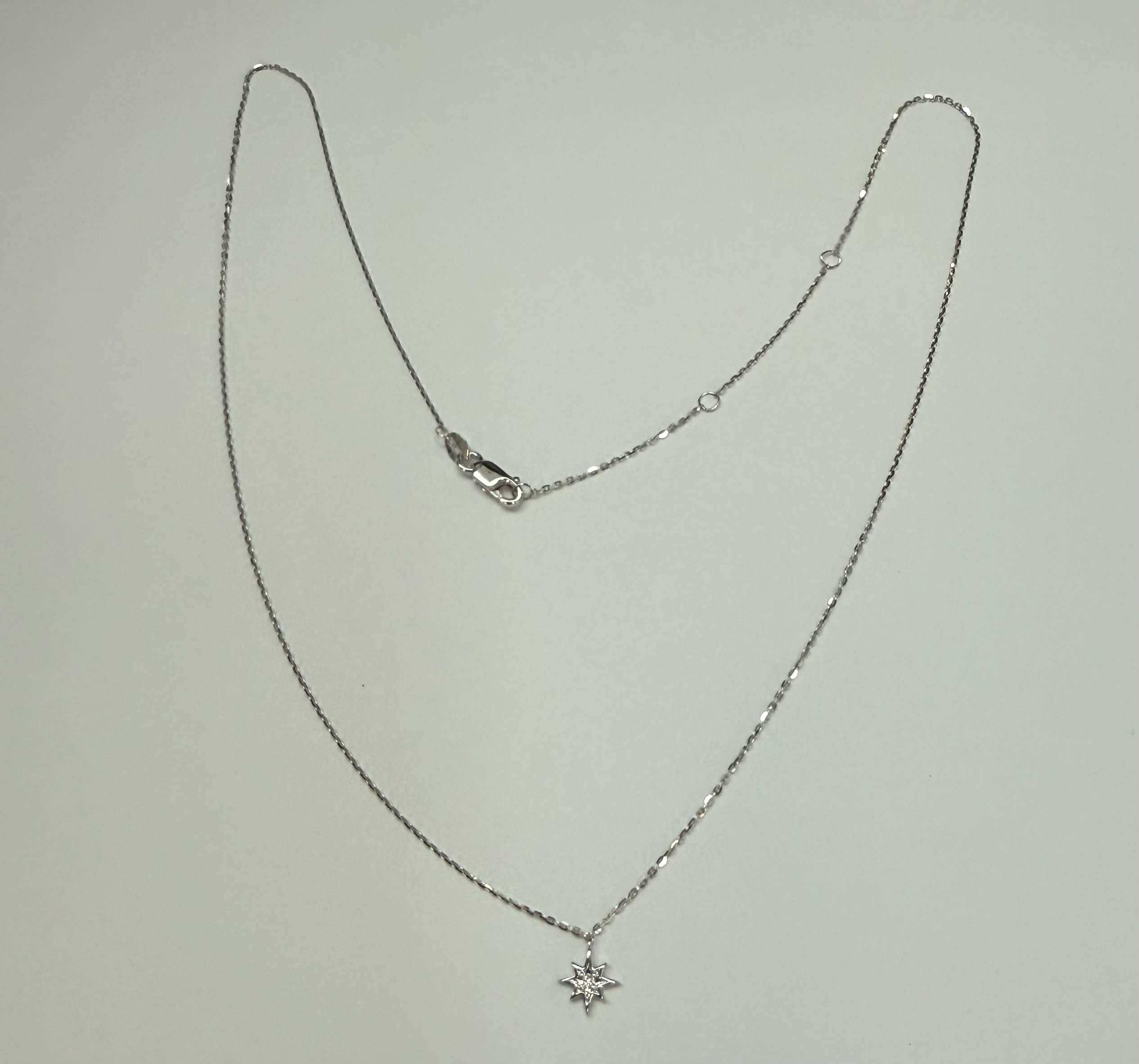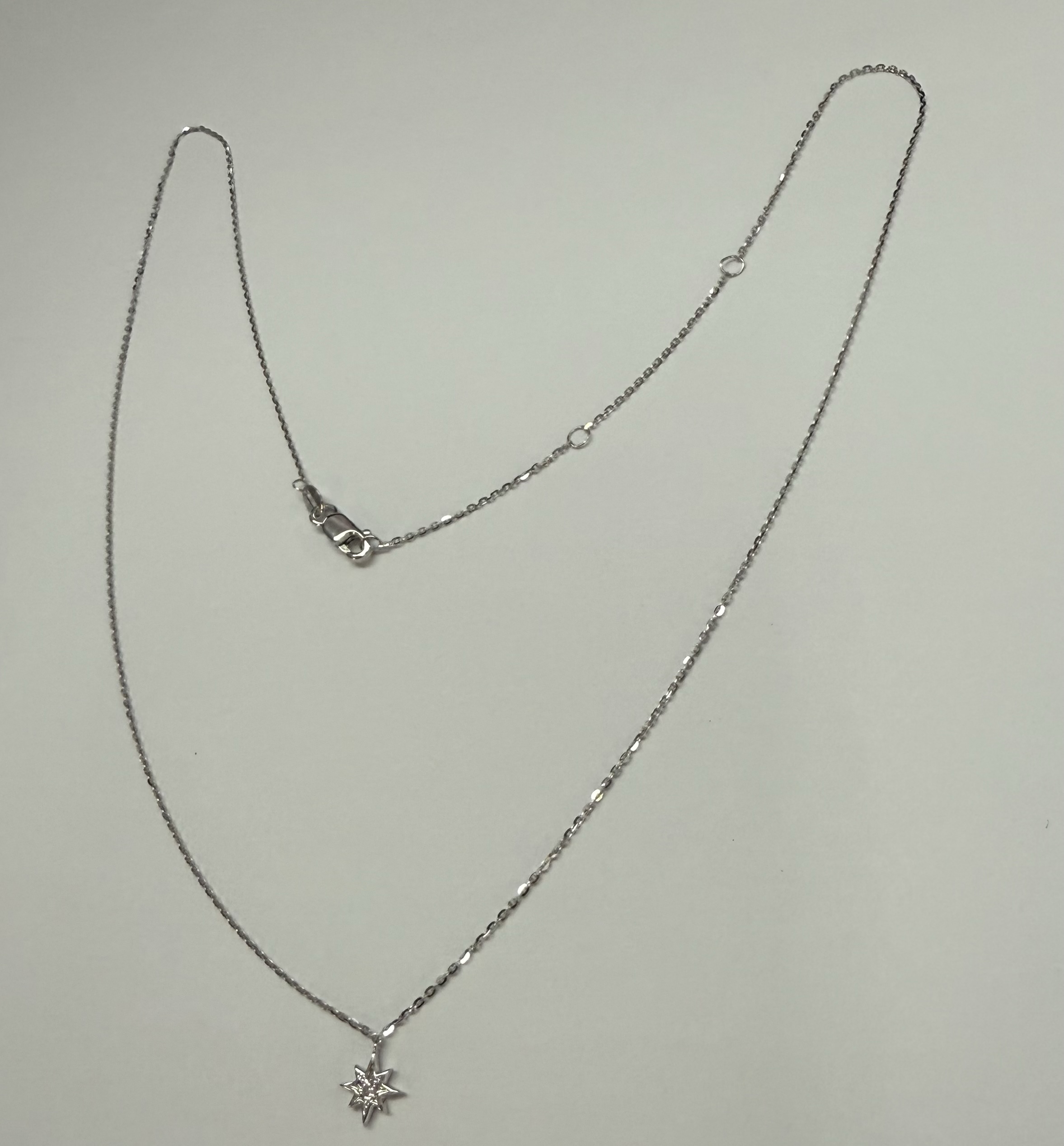 14k white gold delicate genuine .03 cttw Round Brilliant Cut diamond starburst pendant. This diamond has a color grade of G, and a clarity grade of SI. This pendant is adjustable 16-18″, and it has an entire weight of 1.3 grams.