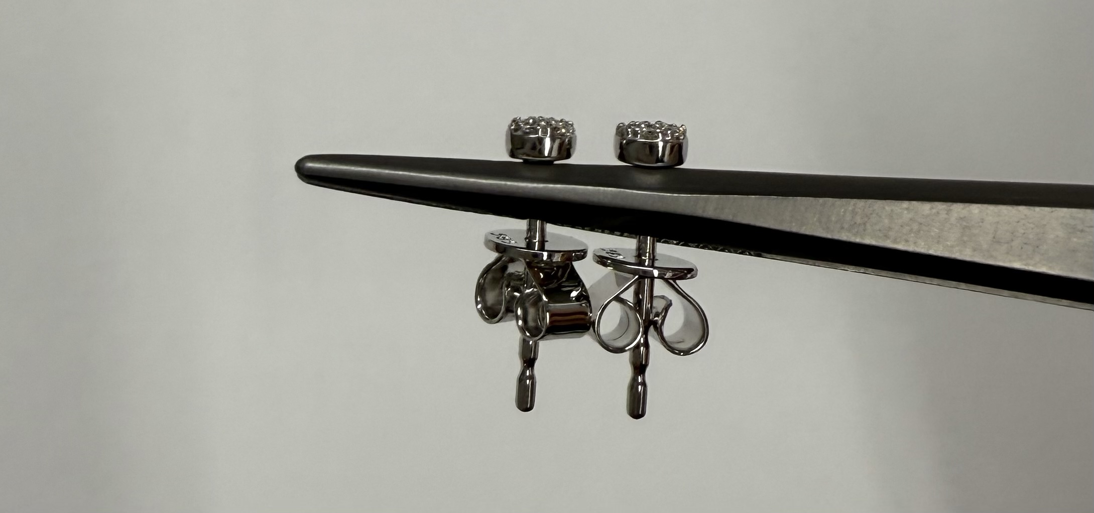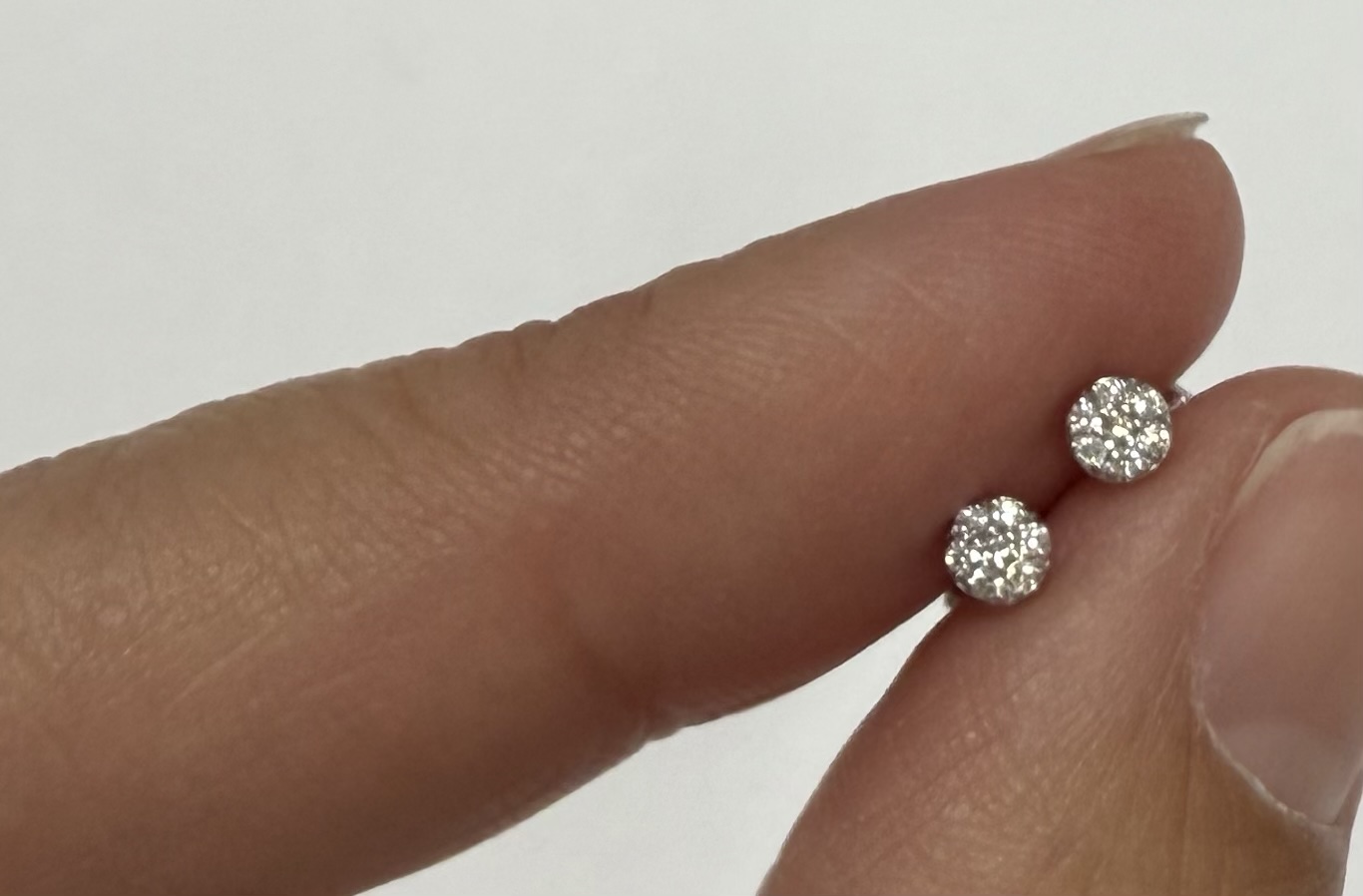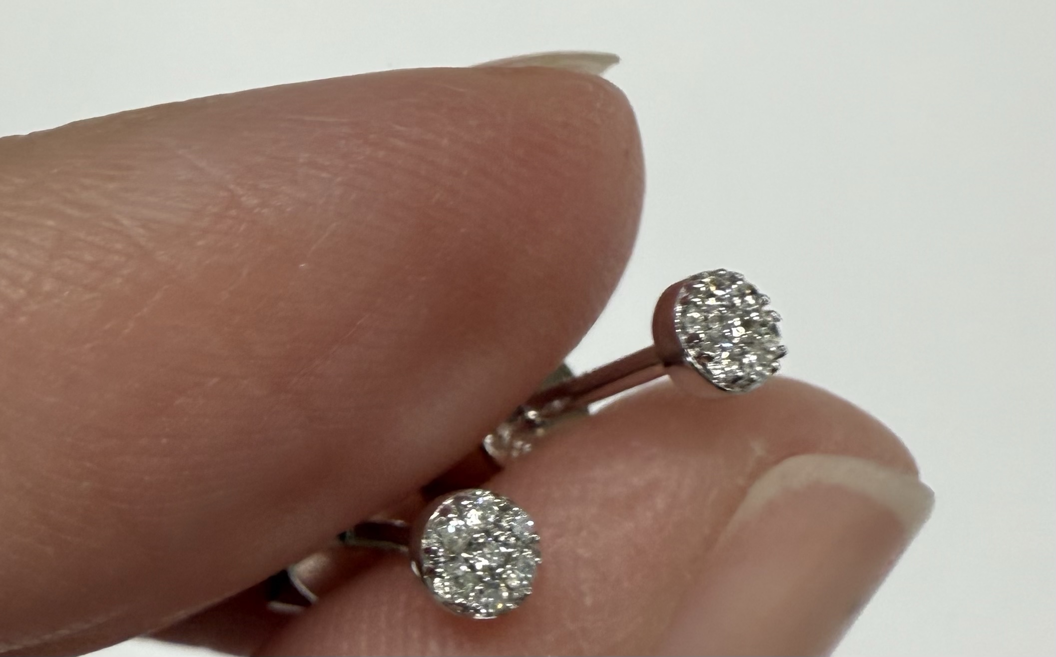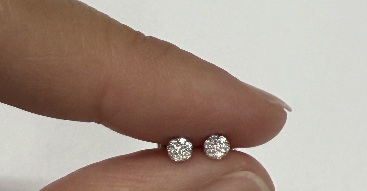 14k white gold genuine .05 cttw Round Brilliant Cut diamond tiny cluster stud earrings. These diamonds average G-H in color, and SI2 in clarity. These earrings have an entire weight of 0.9 grams.