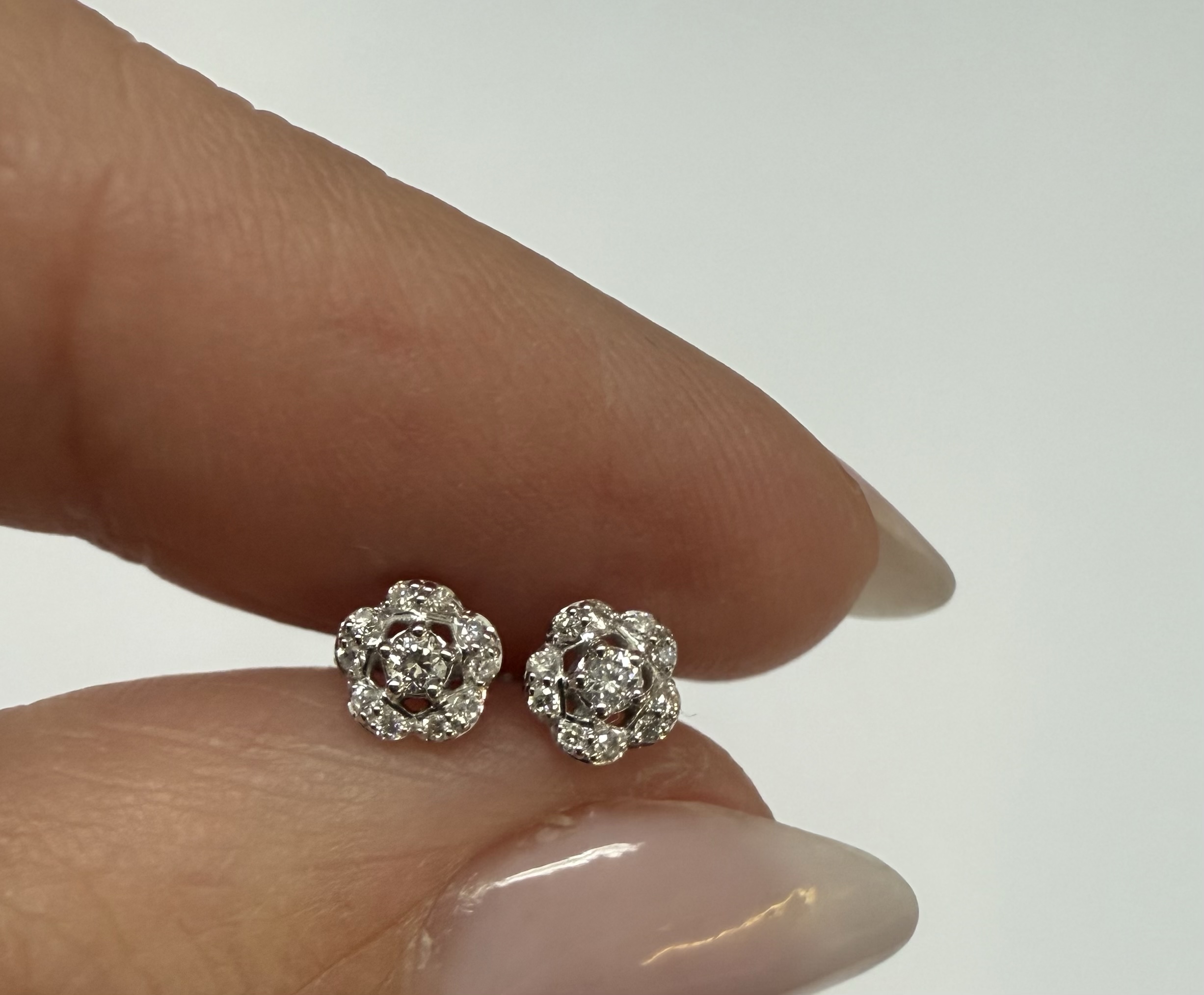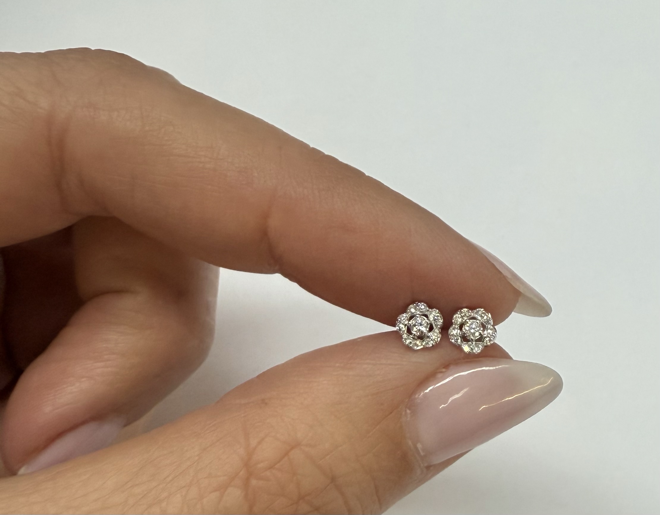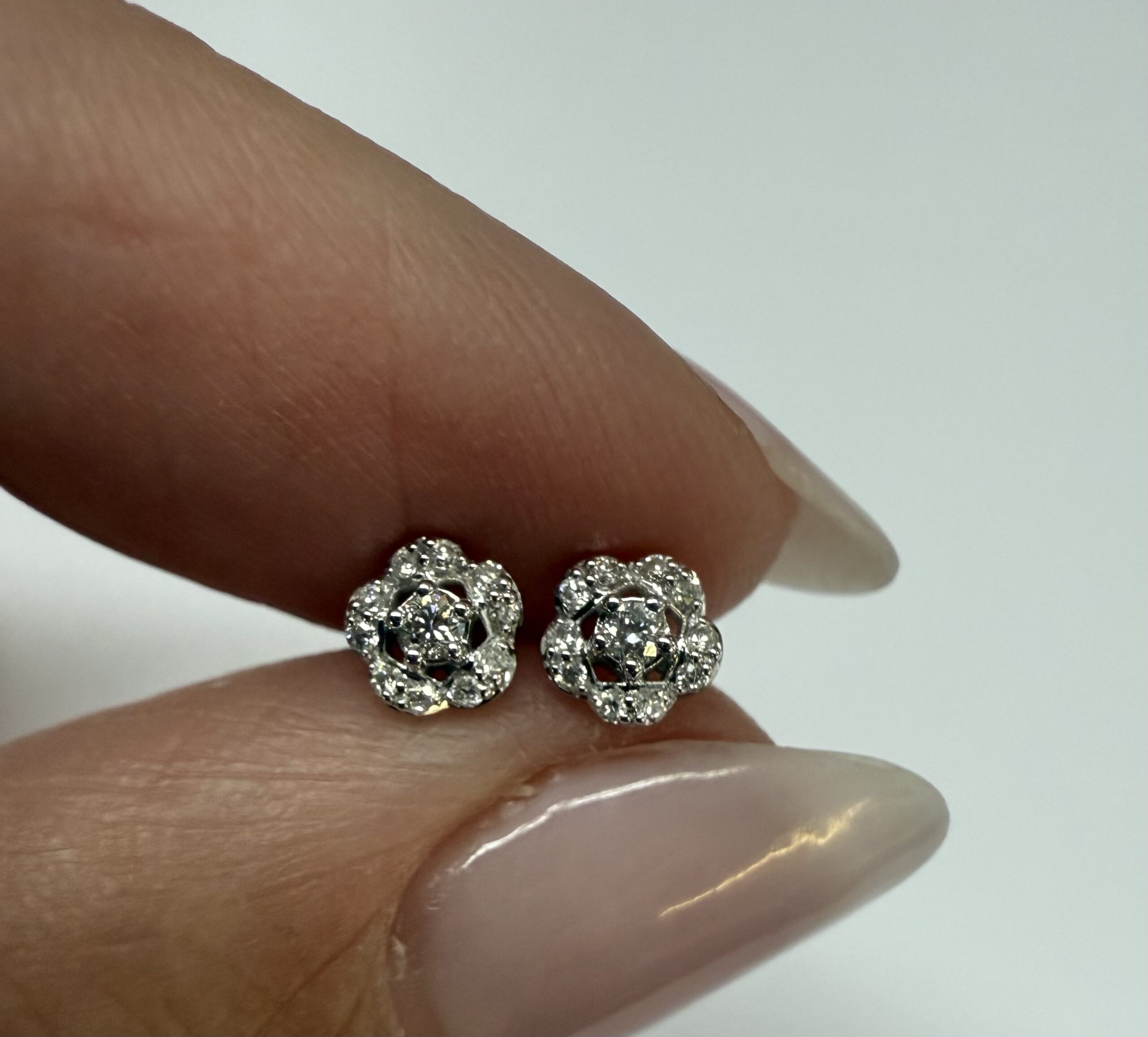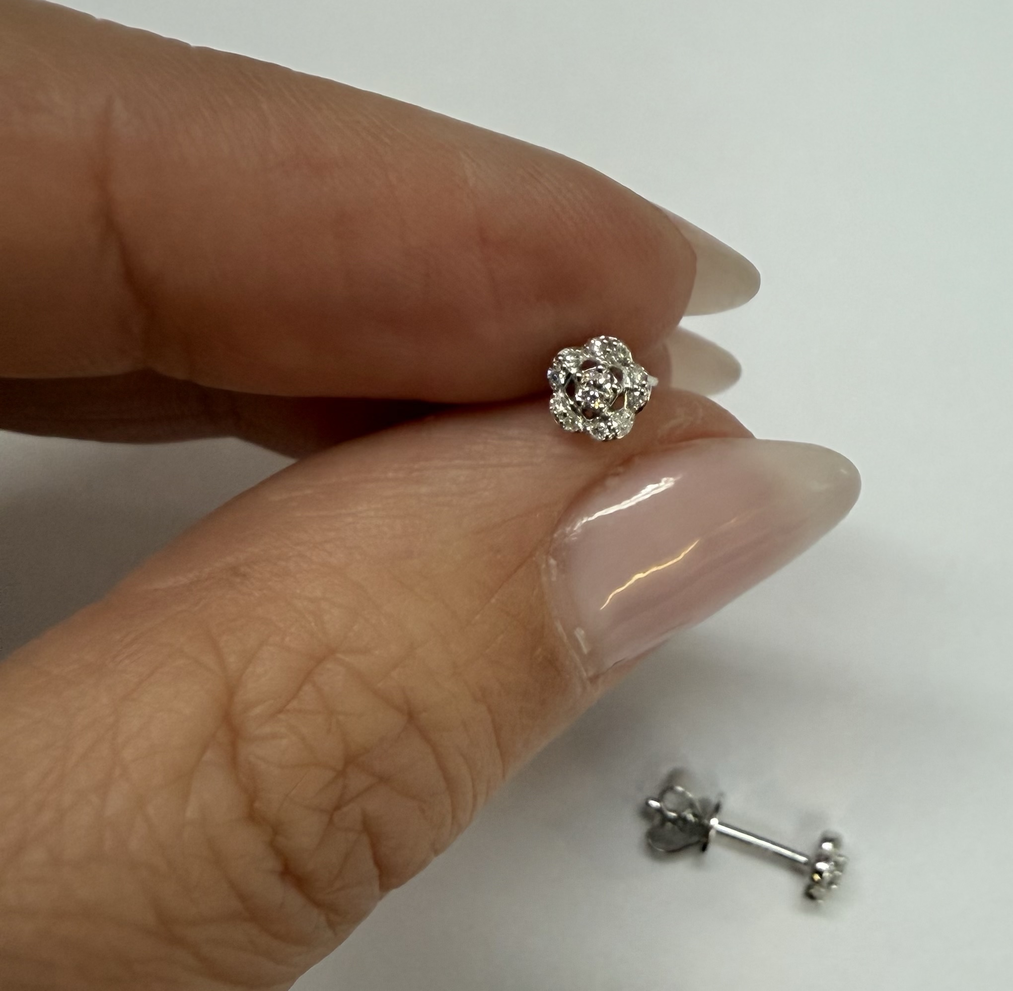 The sweetest 14k white gold genuine .09 cttw Round Brilliant Cut diamond flower motif cluster stud earrings. The diamonds average G in color and SI in clarity. These earrings have an entire weight of 1.0 grams.