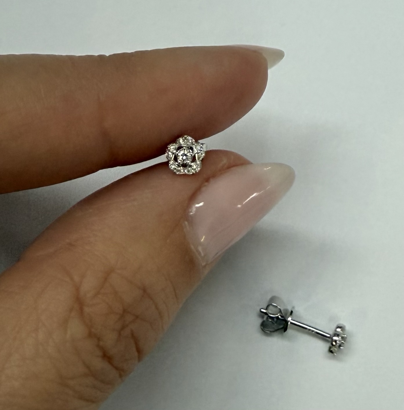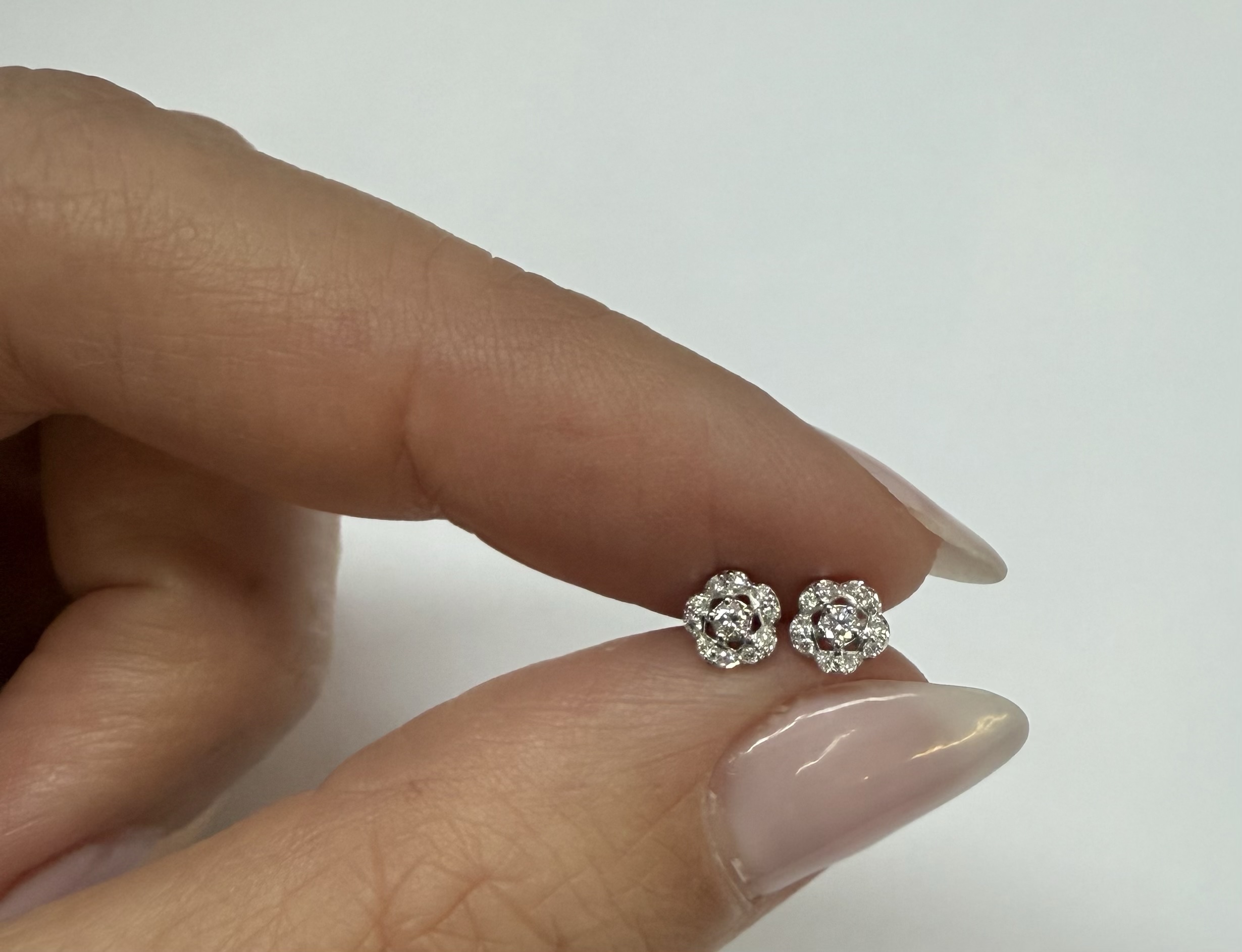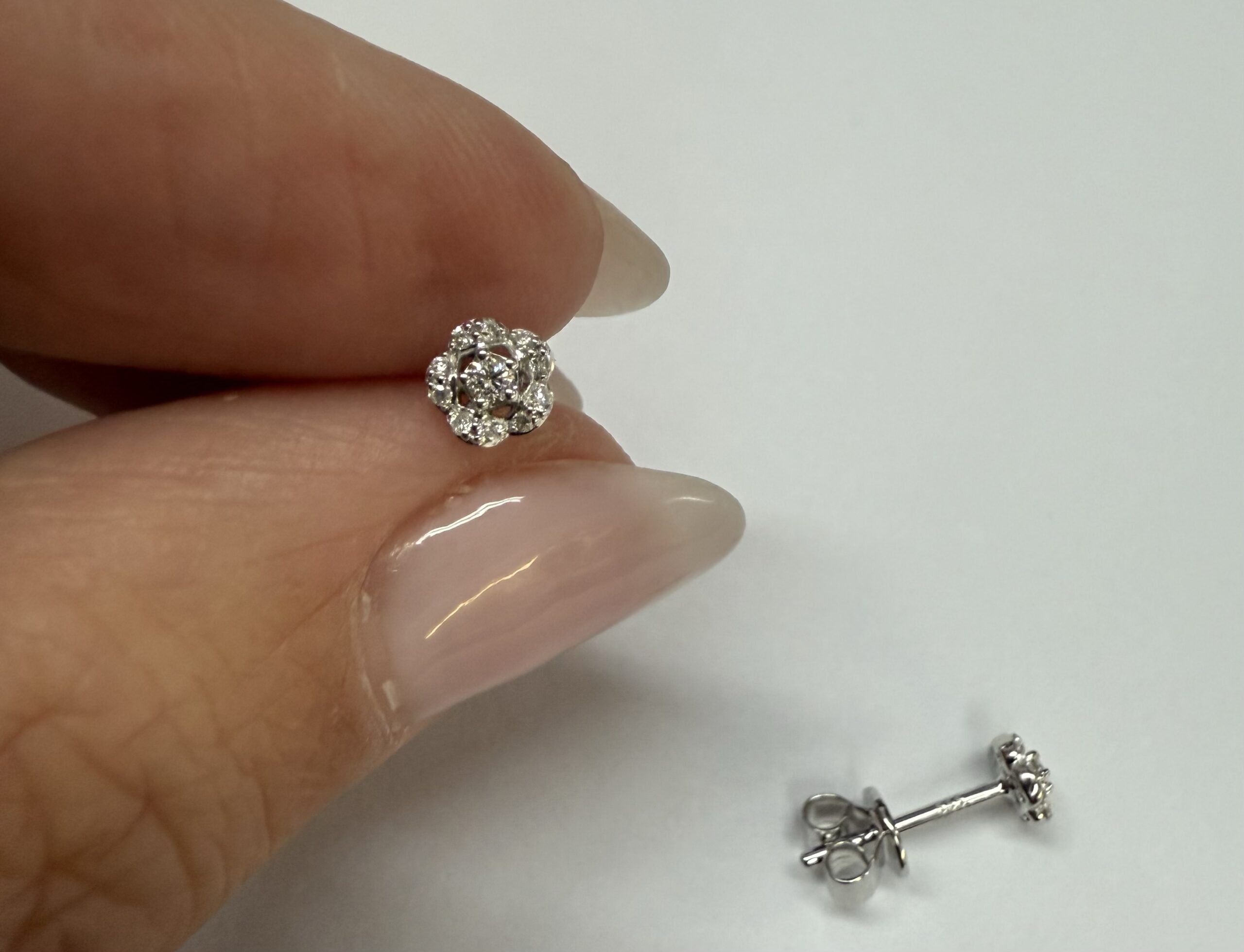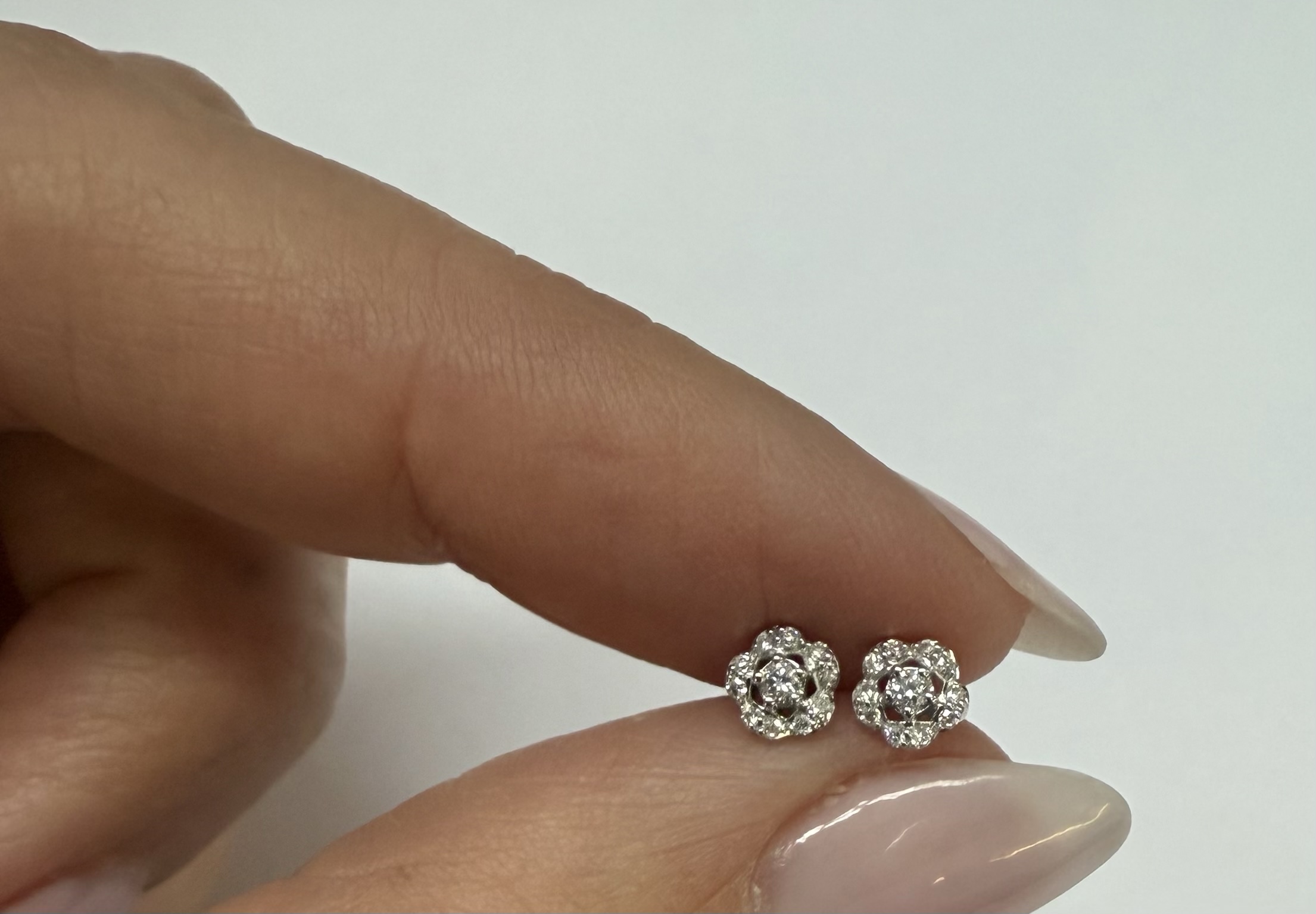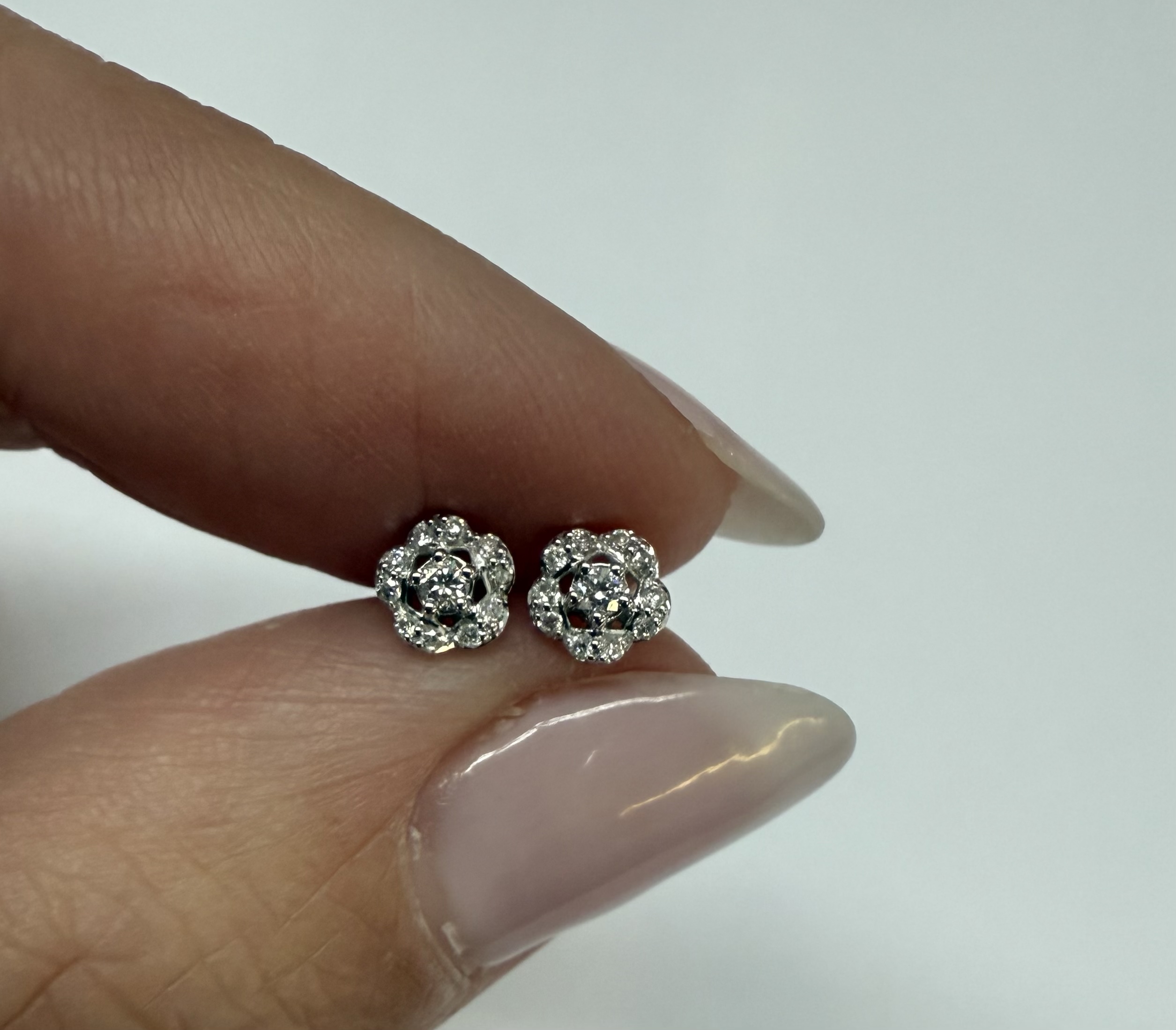 The sweetest 14k white gold genuine .09 cttw Round Brilliant Cut diamond flower motif cluster stud earrings. The diamonds average G in color and SI in clarity. These earrings have an entire weight of 1.0 grams.