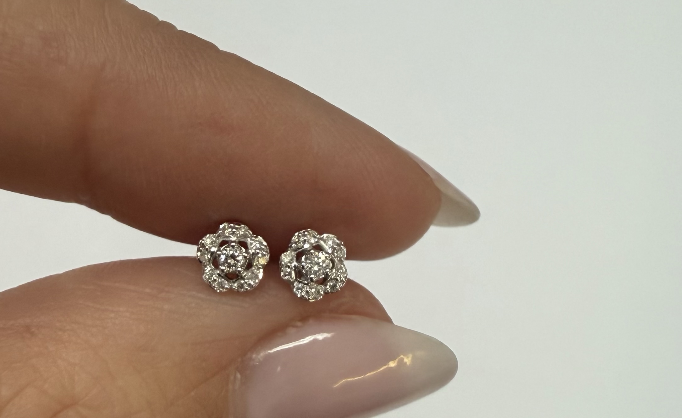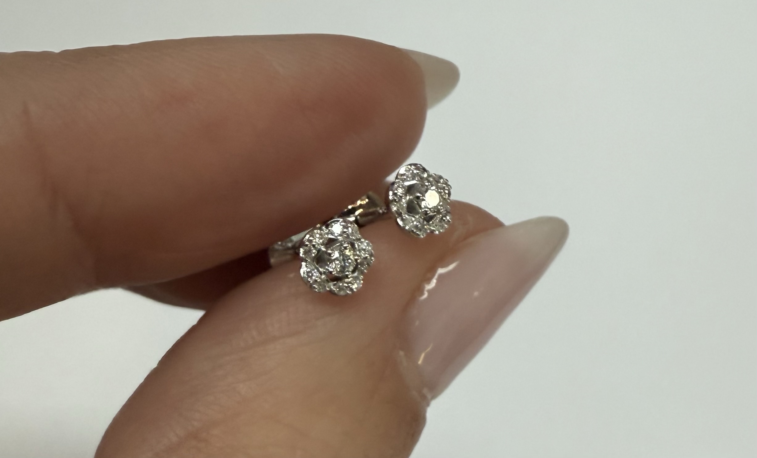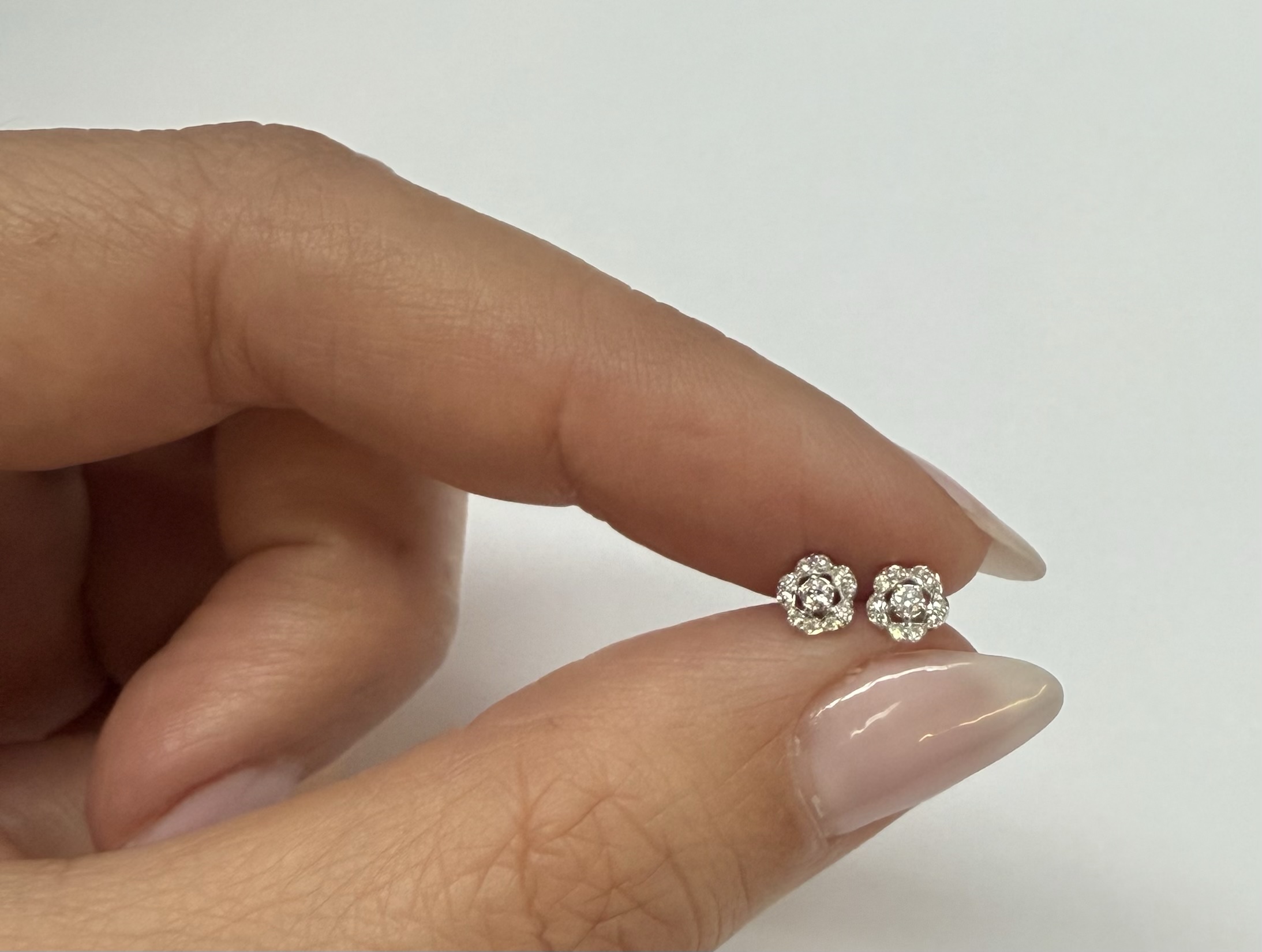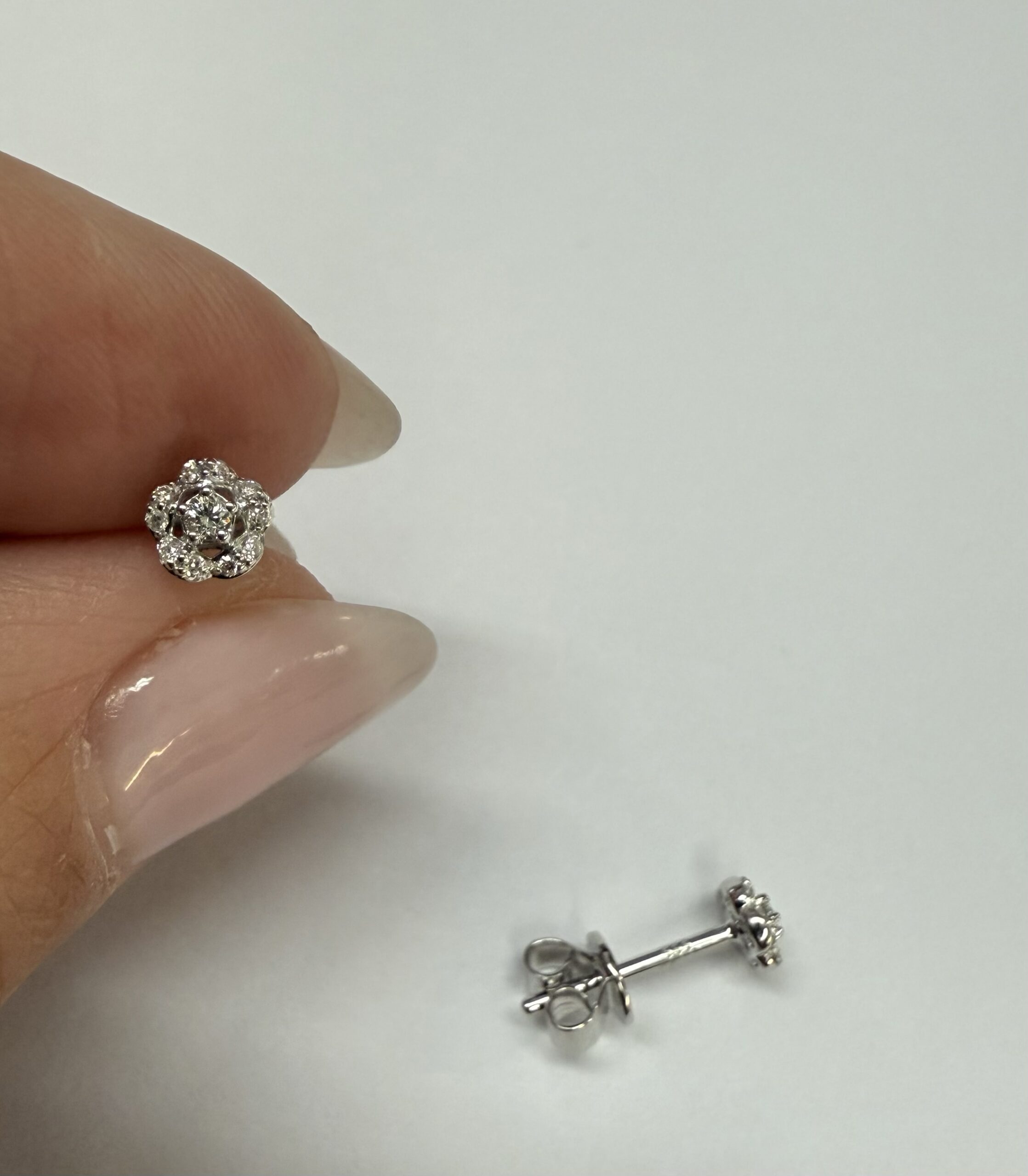 The sweetest 14k white gold genuine .09 cttw Round Brilliant Cut diamond flower motif cluster stud earrings. The diamonds average G in color and SI in clarity. These earrings have an entire weight of 1.0 grams.