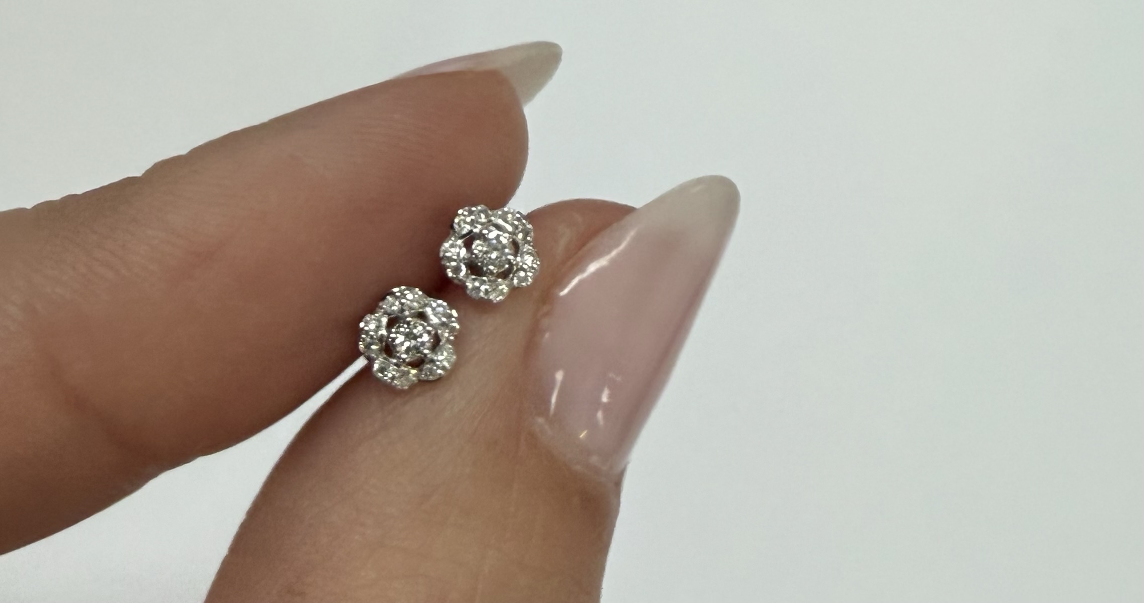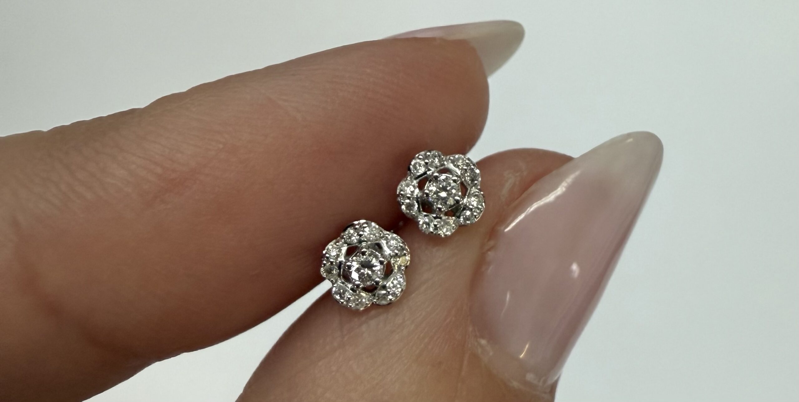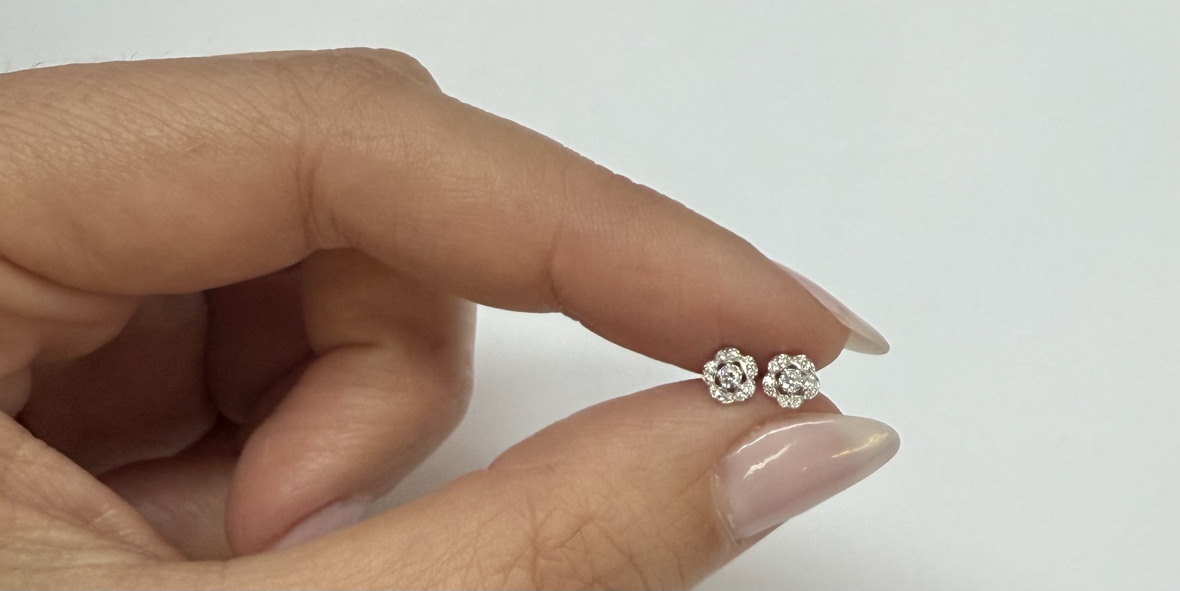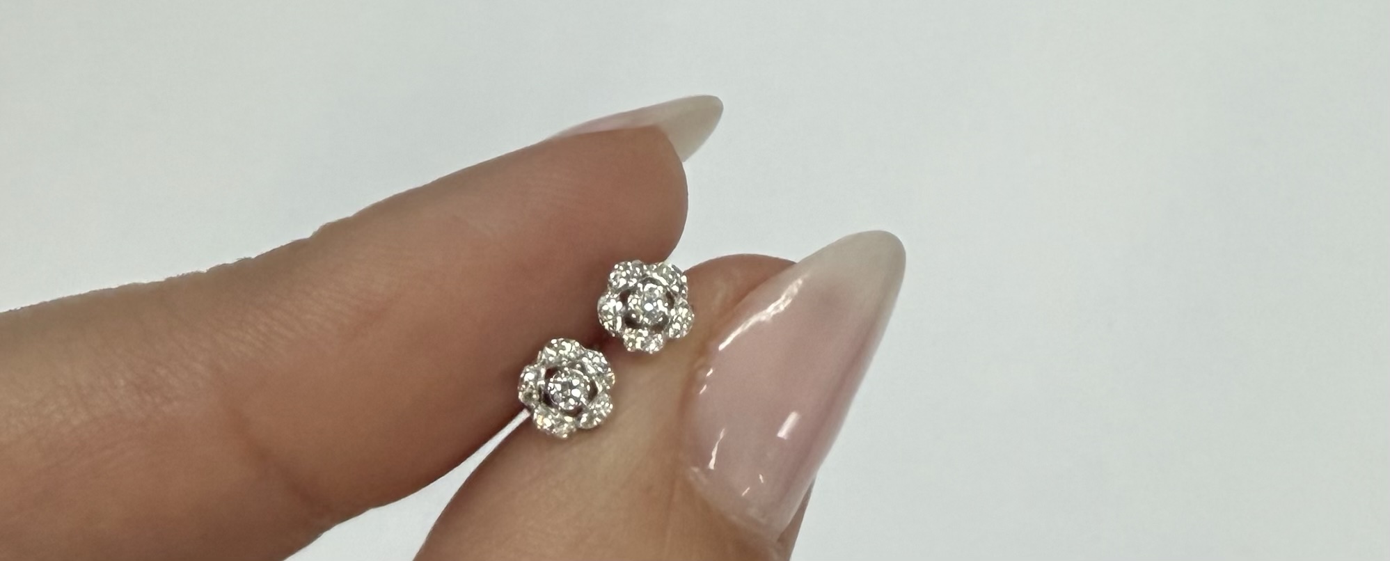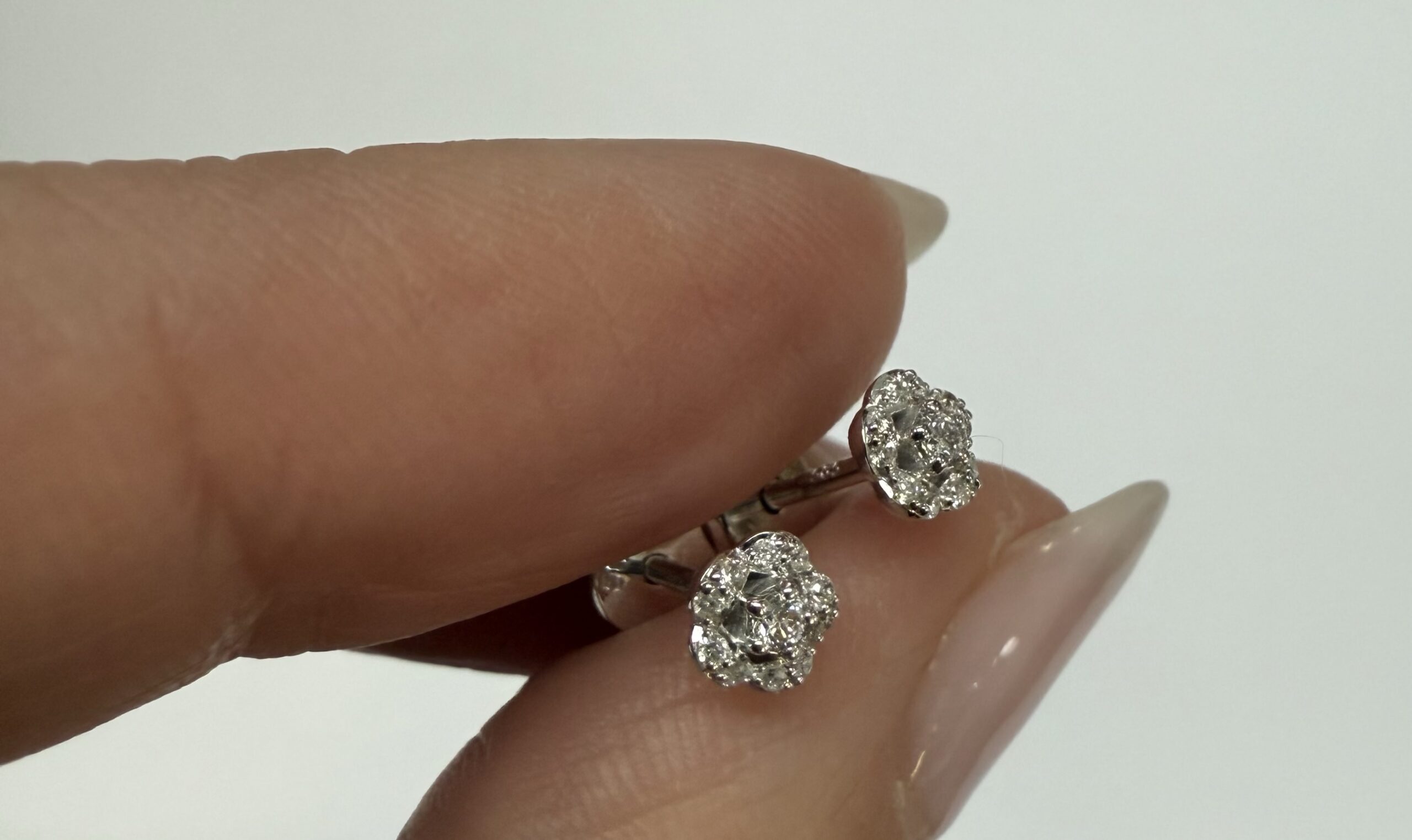 The sweetest 14k white gold genuine .09 cttw Round Brilliant Cut diamond flower motif cluster stud earrings. The diamonds average G in color and SI in clarity. These earrings have an entire weight of 1.0 grams.