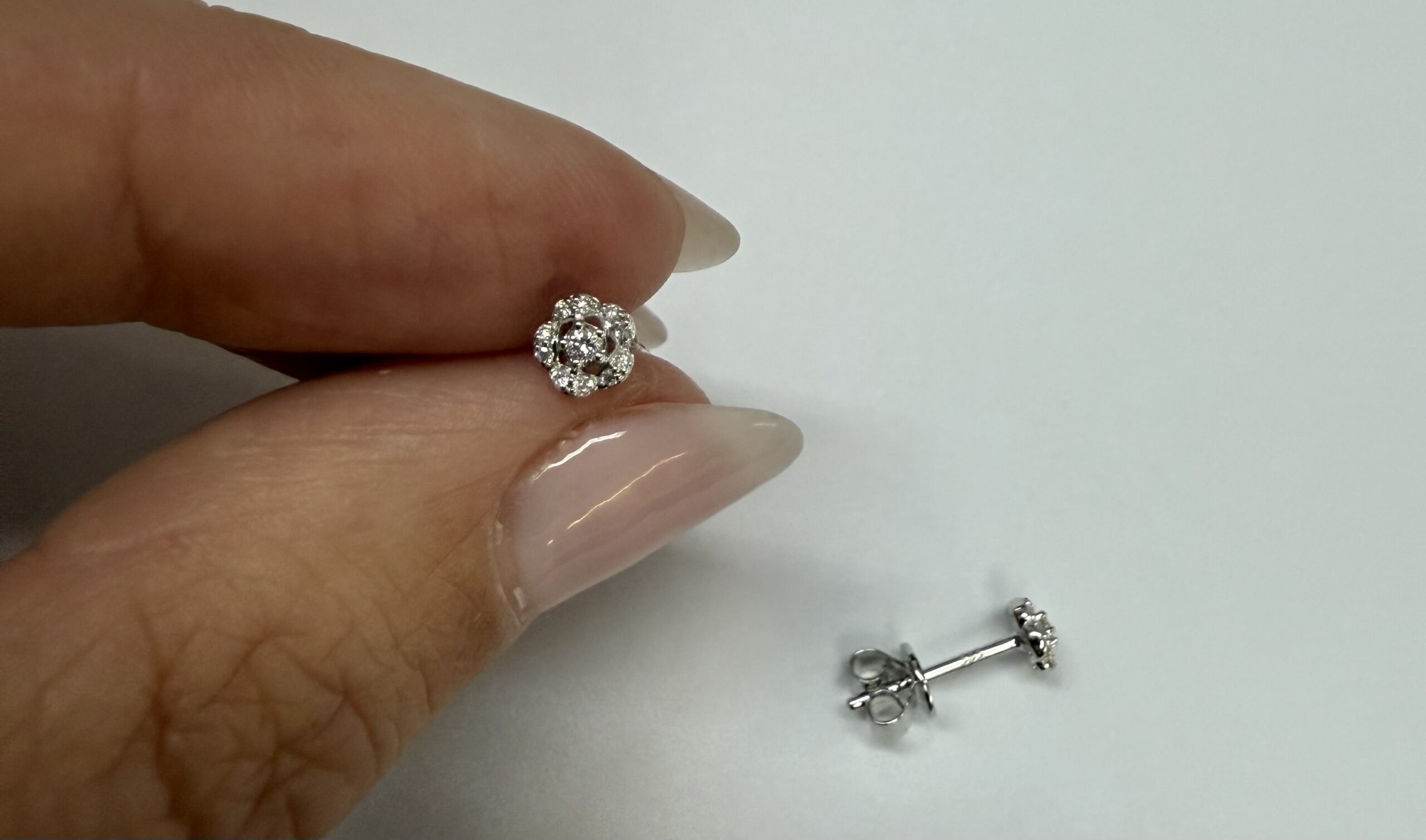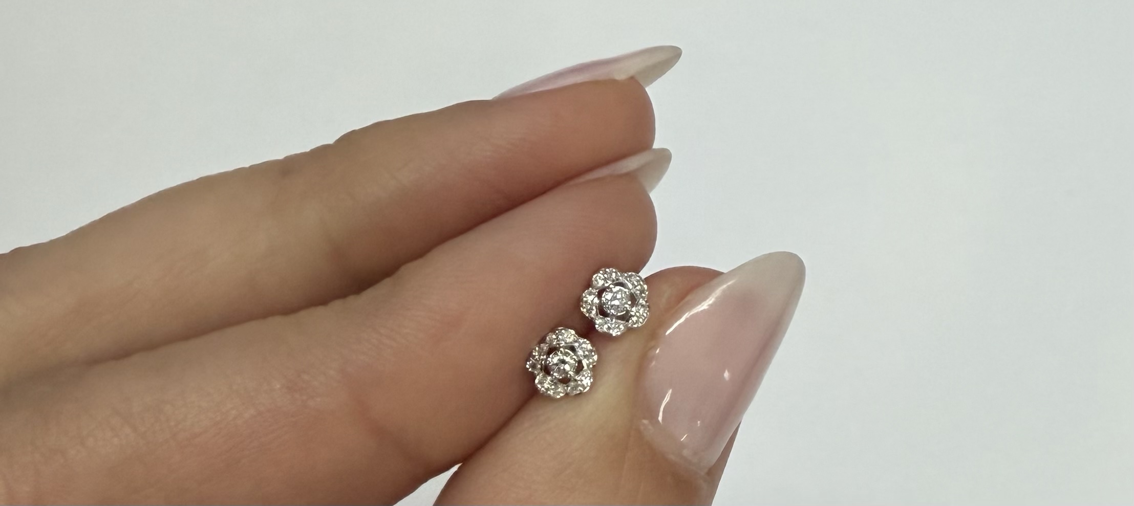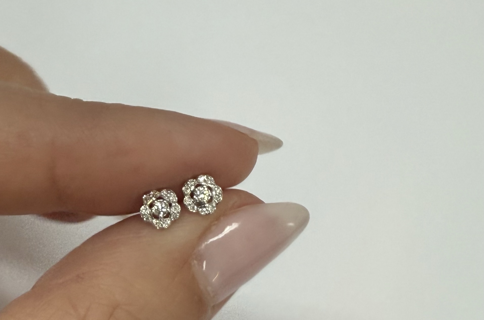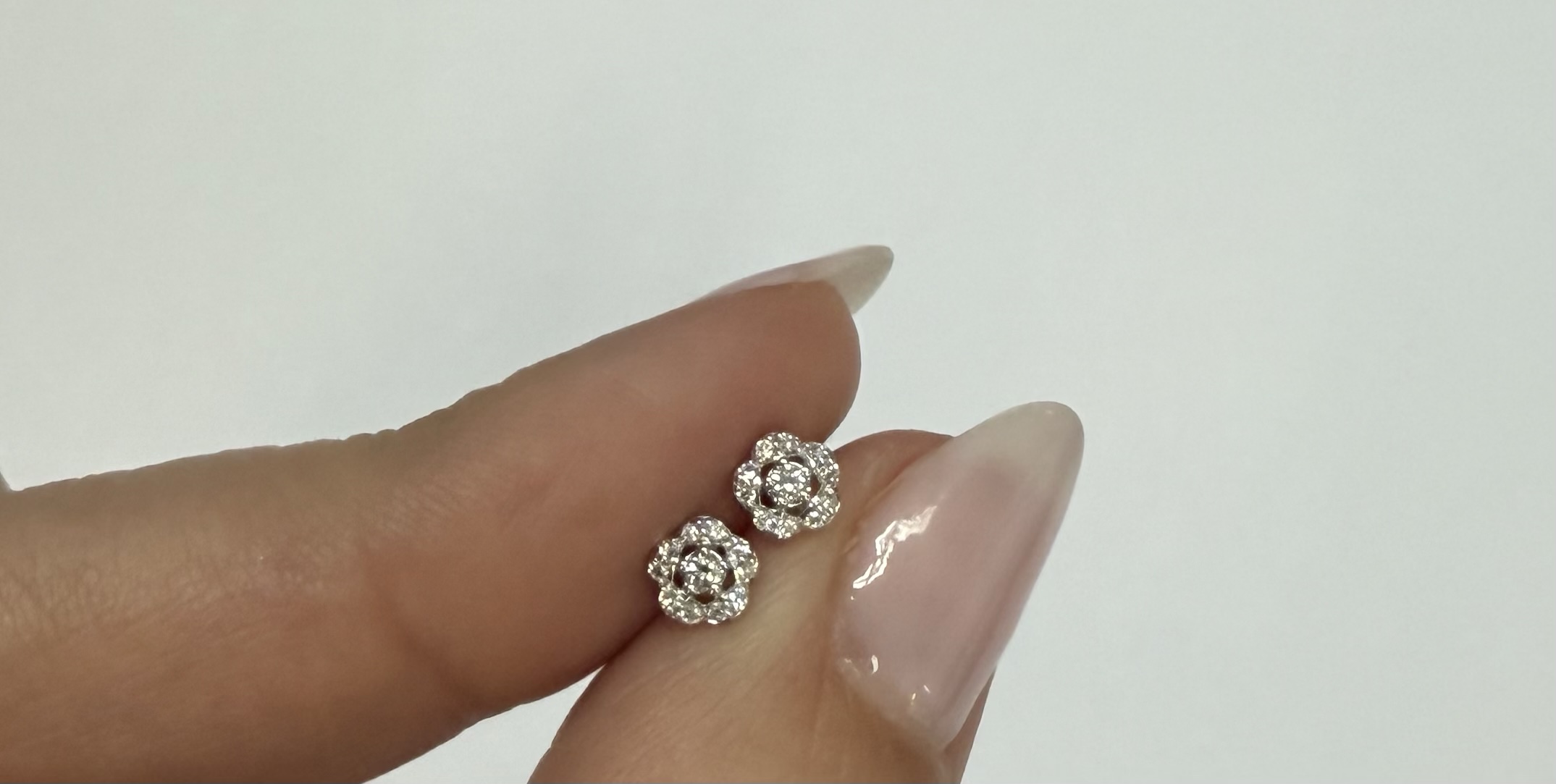 The sweetest 14k white gold genuine .09 cttw Round Brilliant Cut diamond flower motif cluster stud earrings. The diamonds average G in color and SI in clarity. These earrings have an entire weight of 1.0 grams.