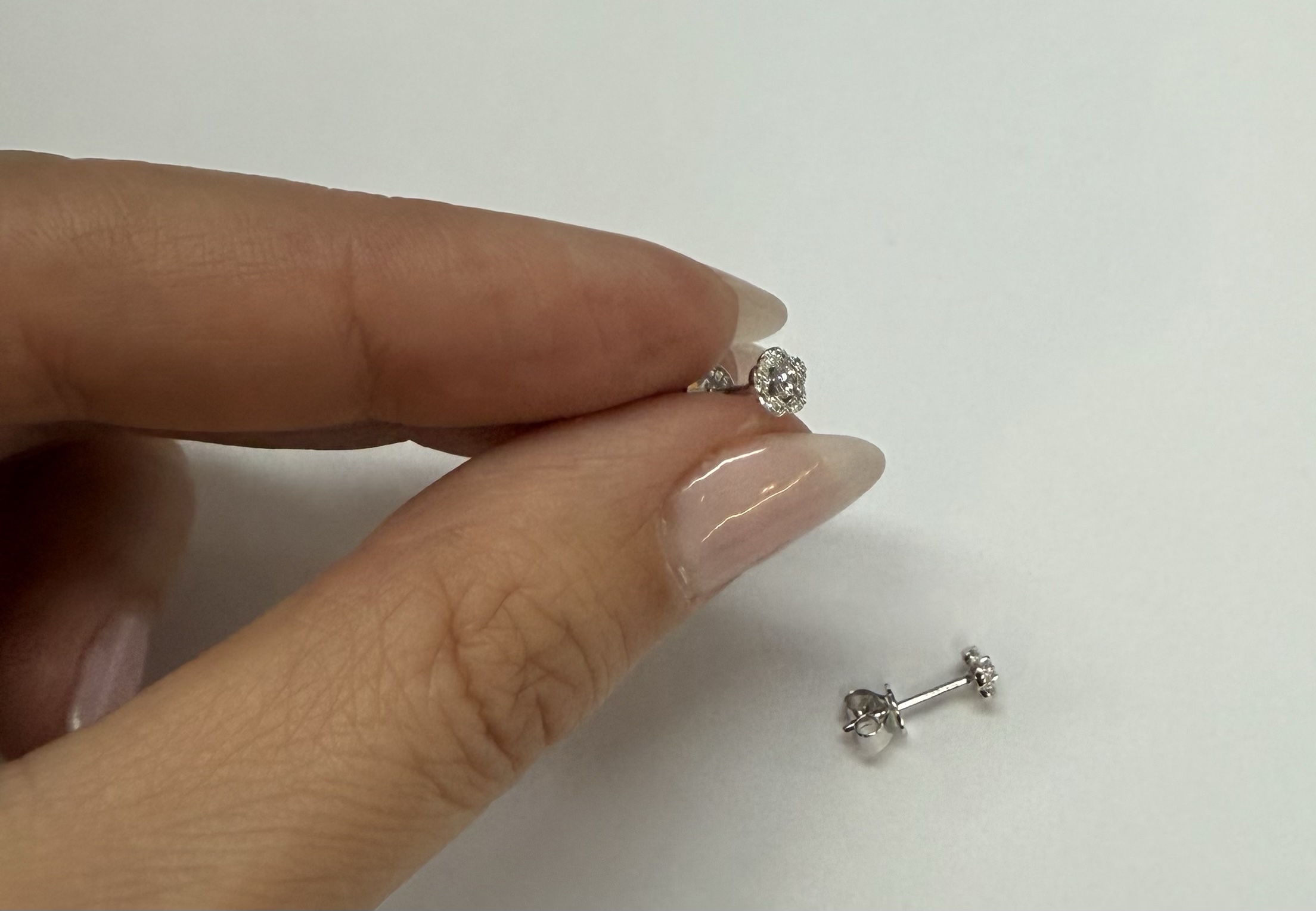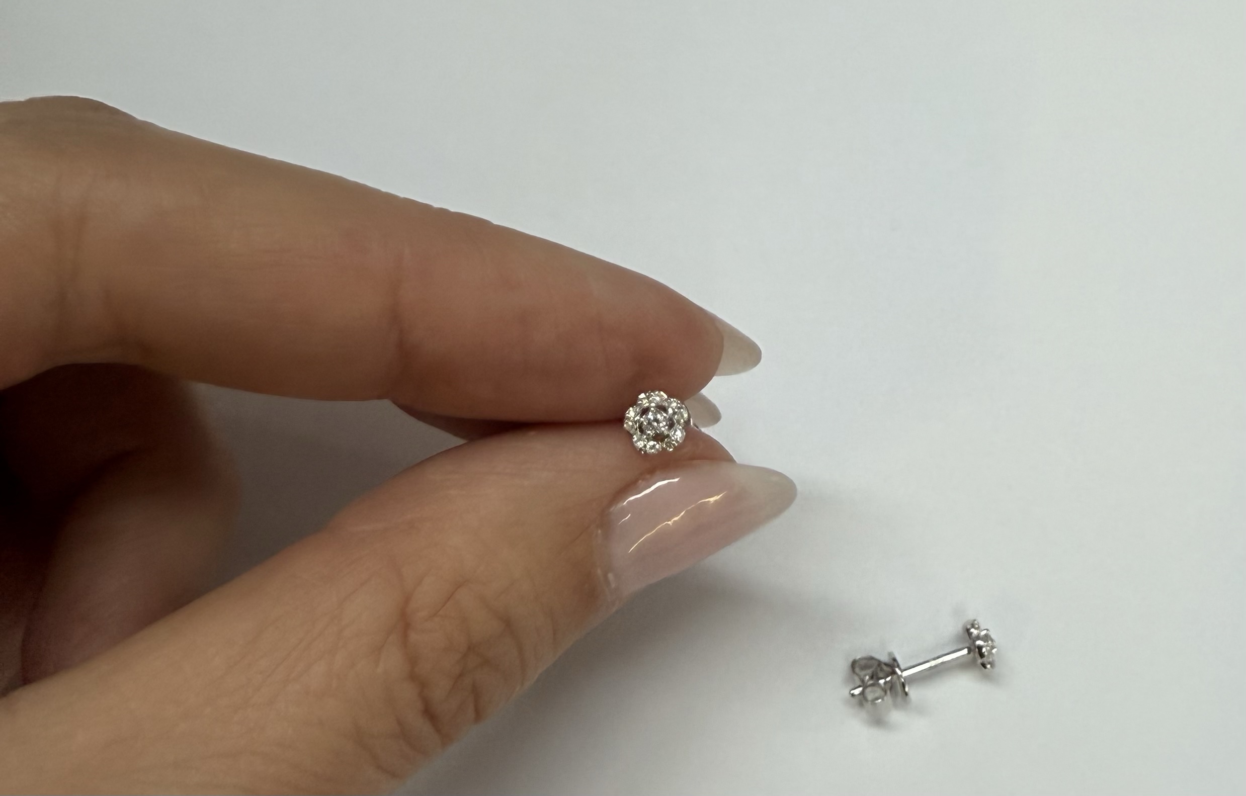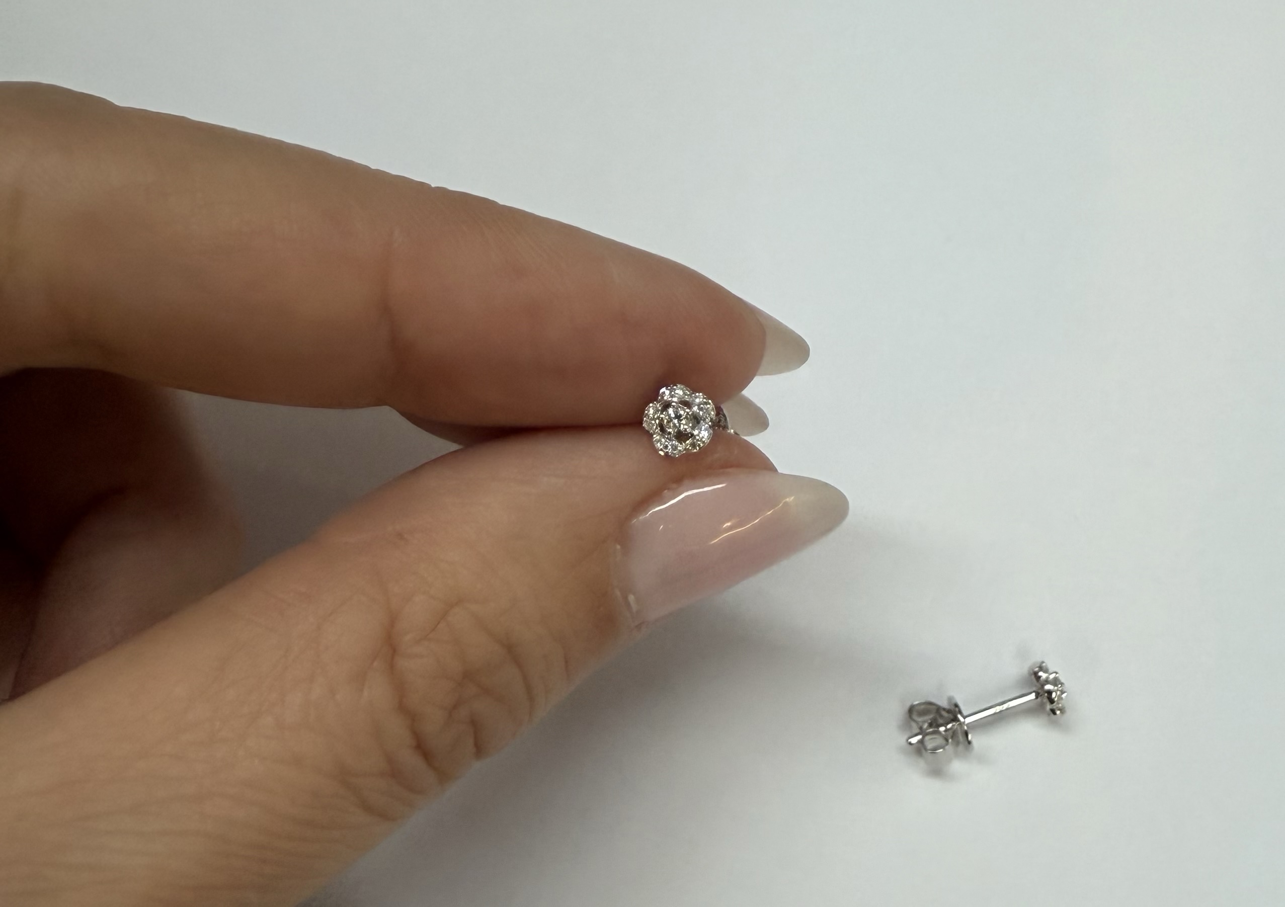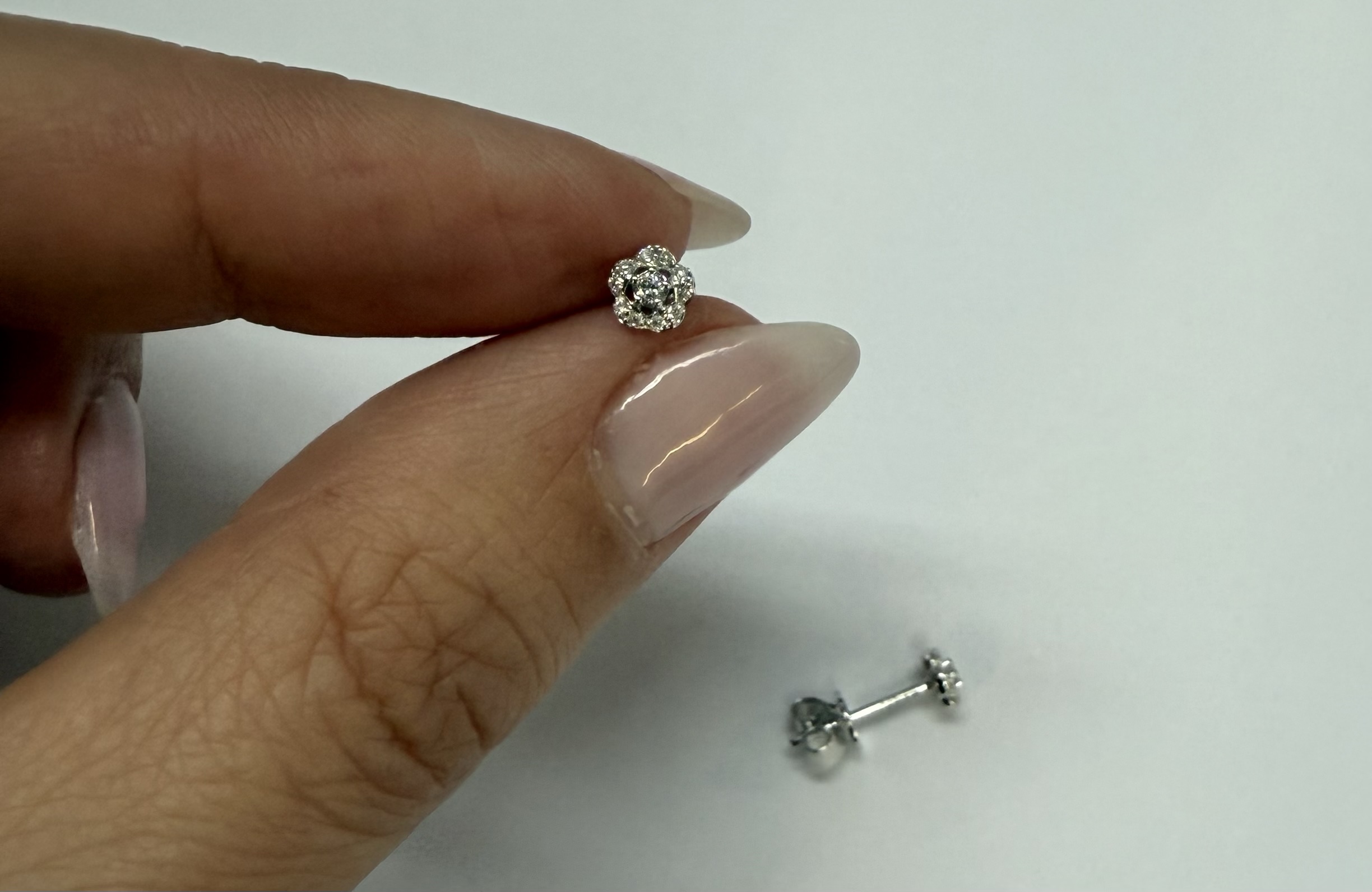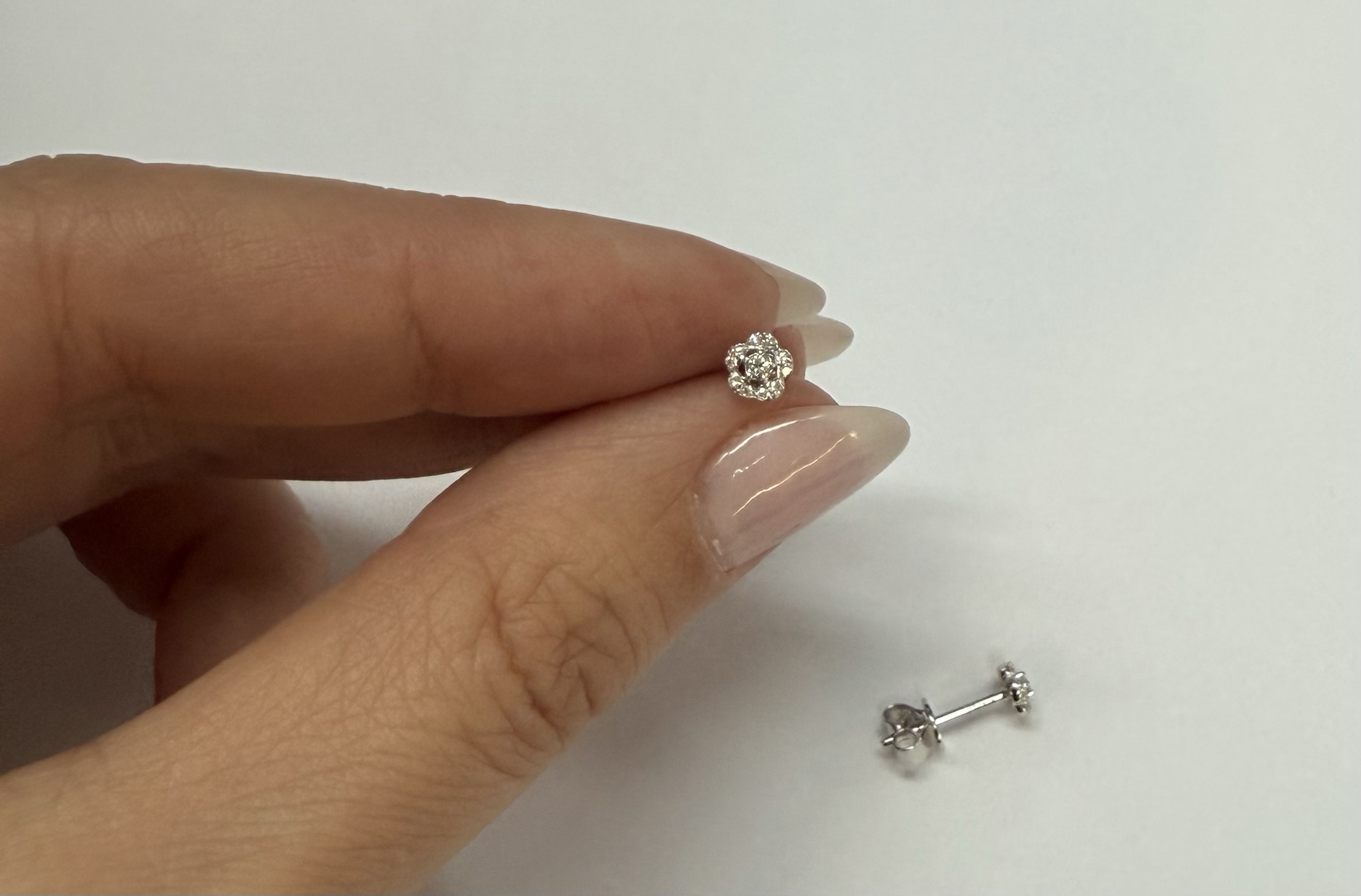 The sweetest 14k white gold genuine .09 cttw Round Brilliant Cut diamond flower motif cluster stud earrings. The diamonds average G in color and SI in clarity. These earrings have an entire weight of 1.0 grams.