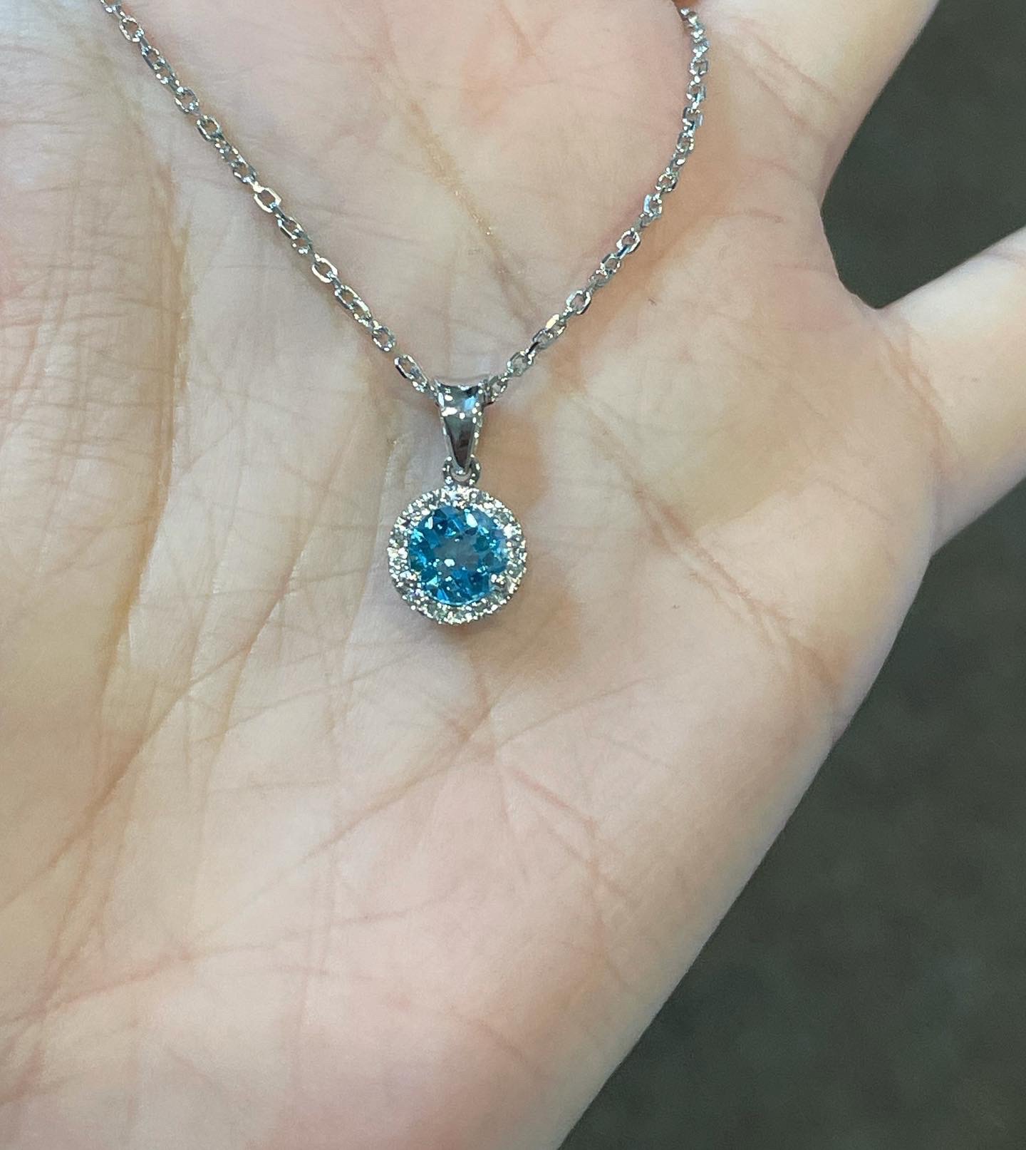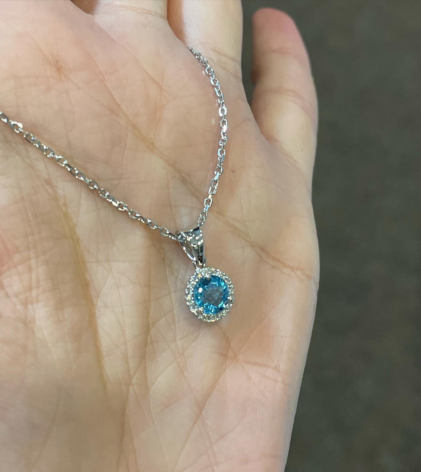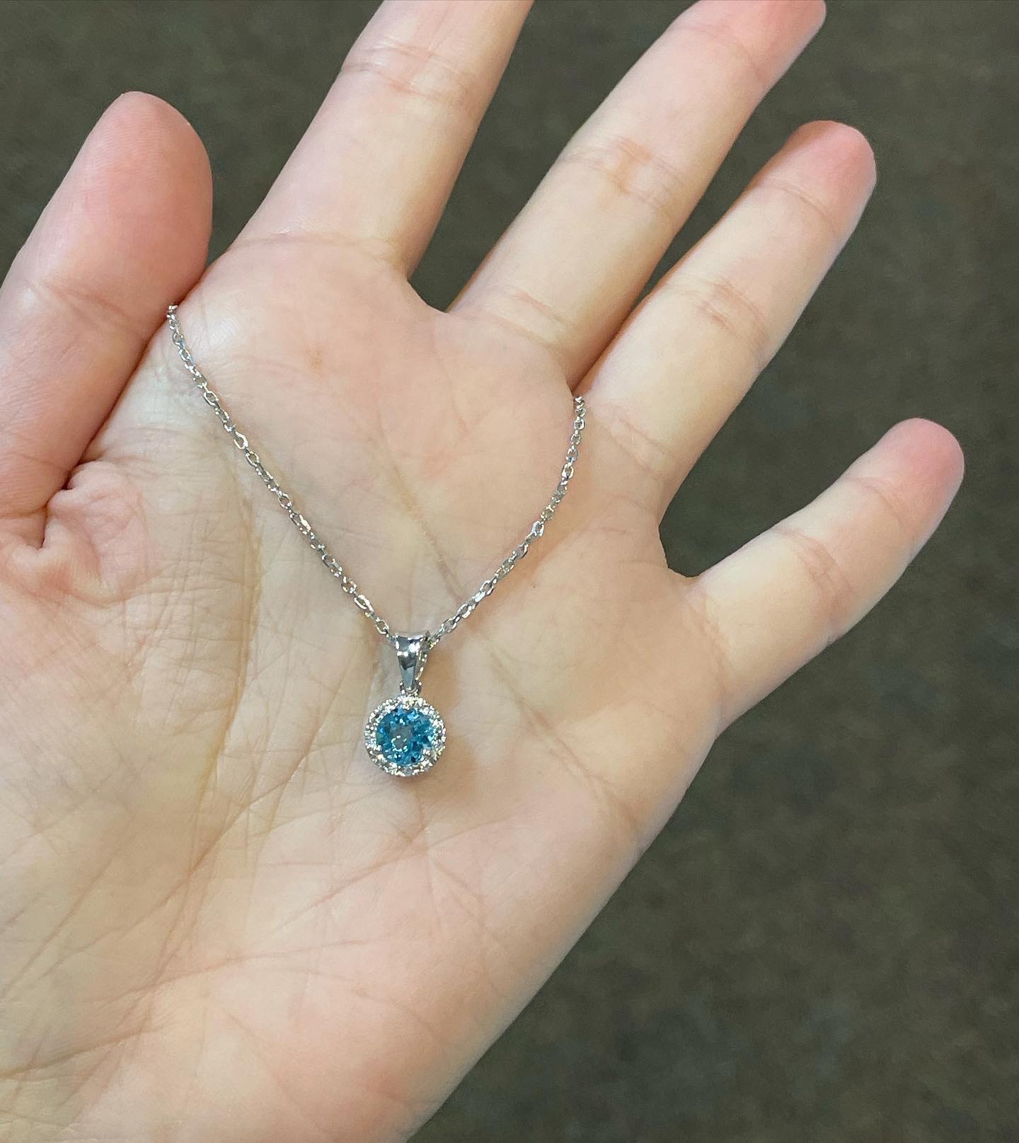 14k white gold genuine Round Brilliant Cut, faceted 1 carat Swiss Blue Topaz & .08 Cttw genuine Round Brilliant Cut diamond halo pendant. These diamonds average G-H in color and SI in clarity. This pendant is suspended from a glittery 14k white gold 20″ forzantina chain. This chain can be shortened if needed.