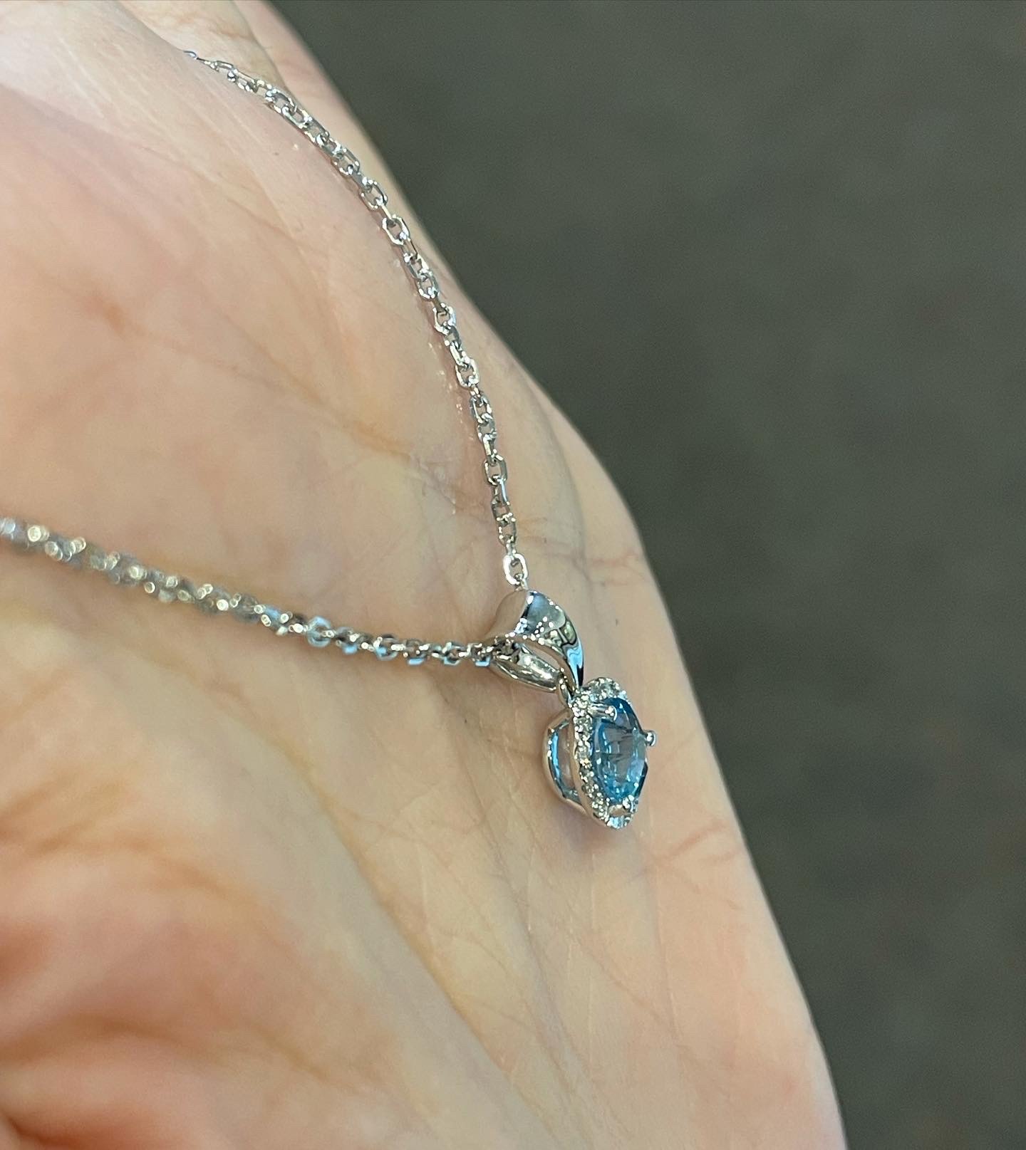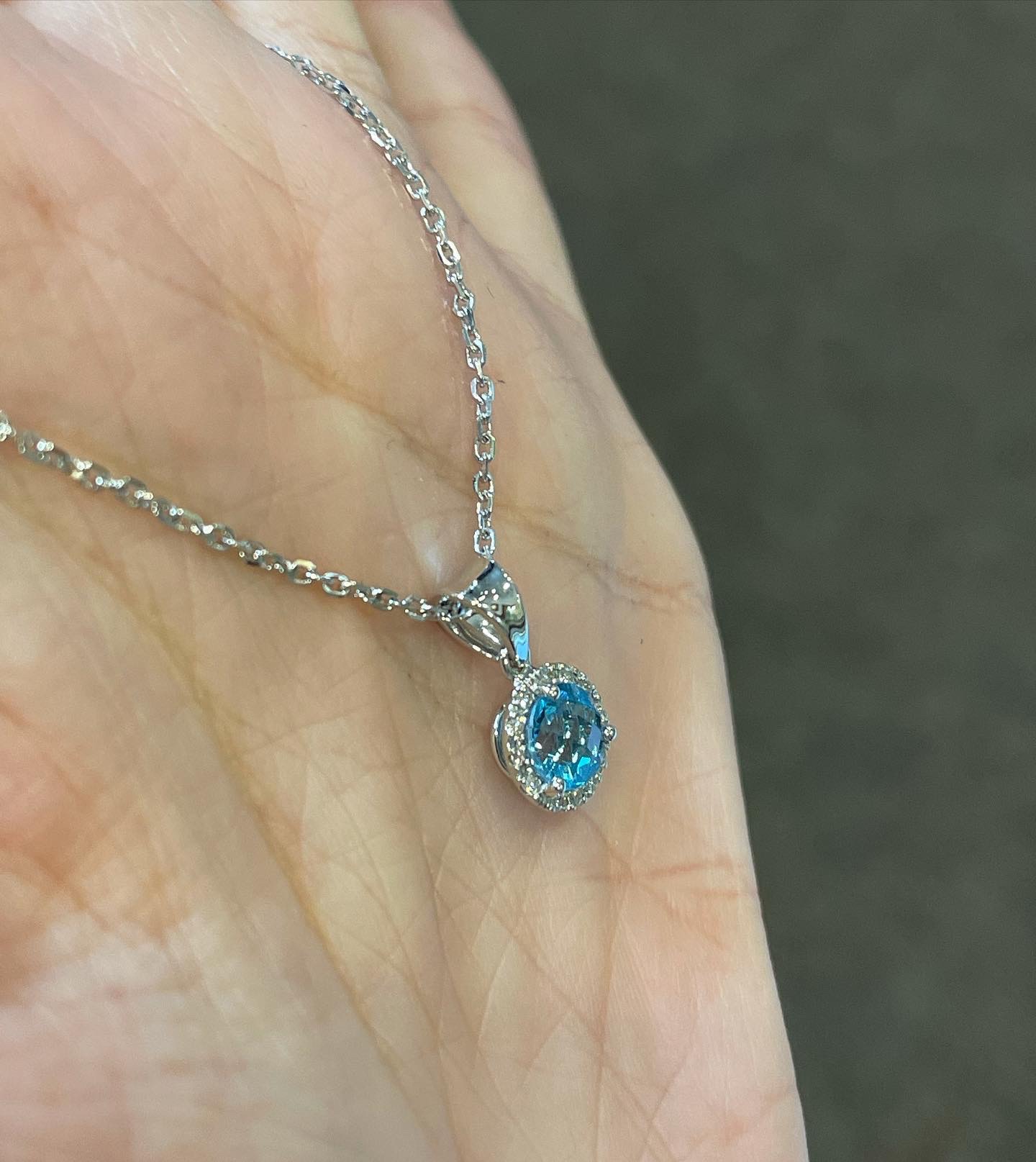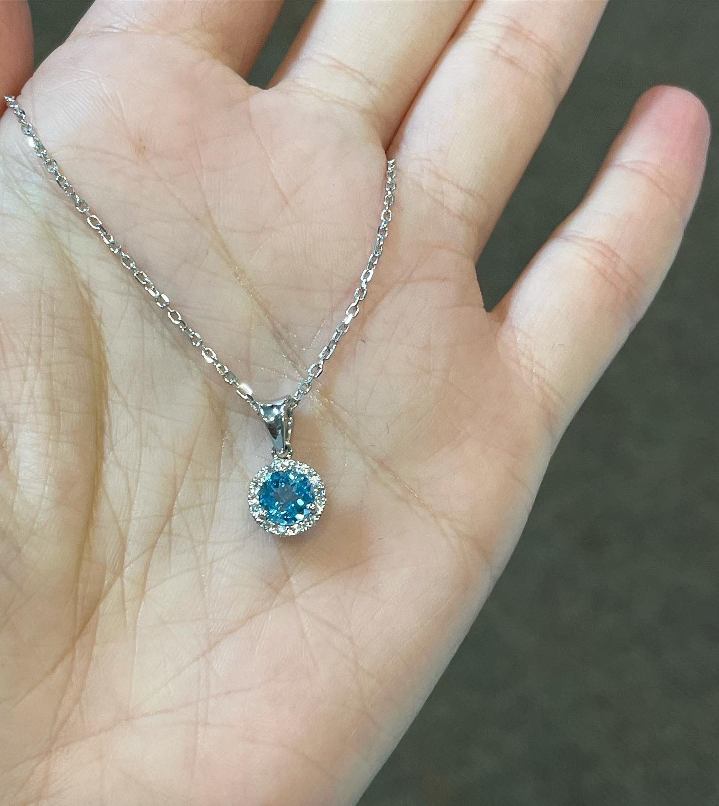 14k white gold genuine Round Brilliant Cut, faceted 1 carat Swiss Blue Topaz & .08 Cttw genuine Round Brilliant Cut diamond halo pendant. These diamonds average G-H in color and SI in clarity. This pendant is suspended from a glittery 14k white gold 20″ forzantina chain. This chain can be shortened if needed.