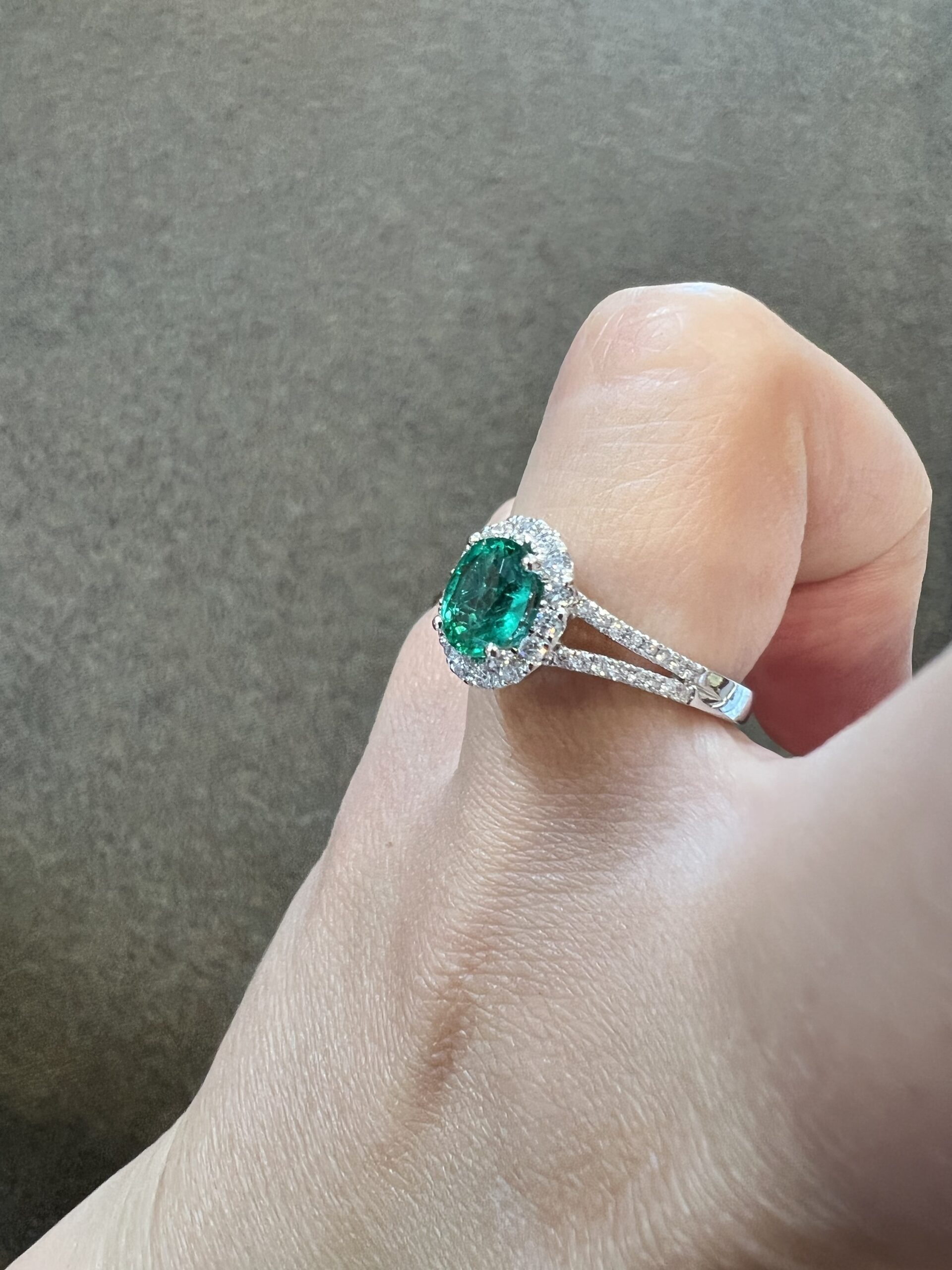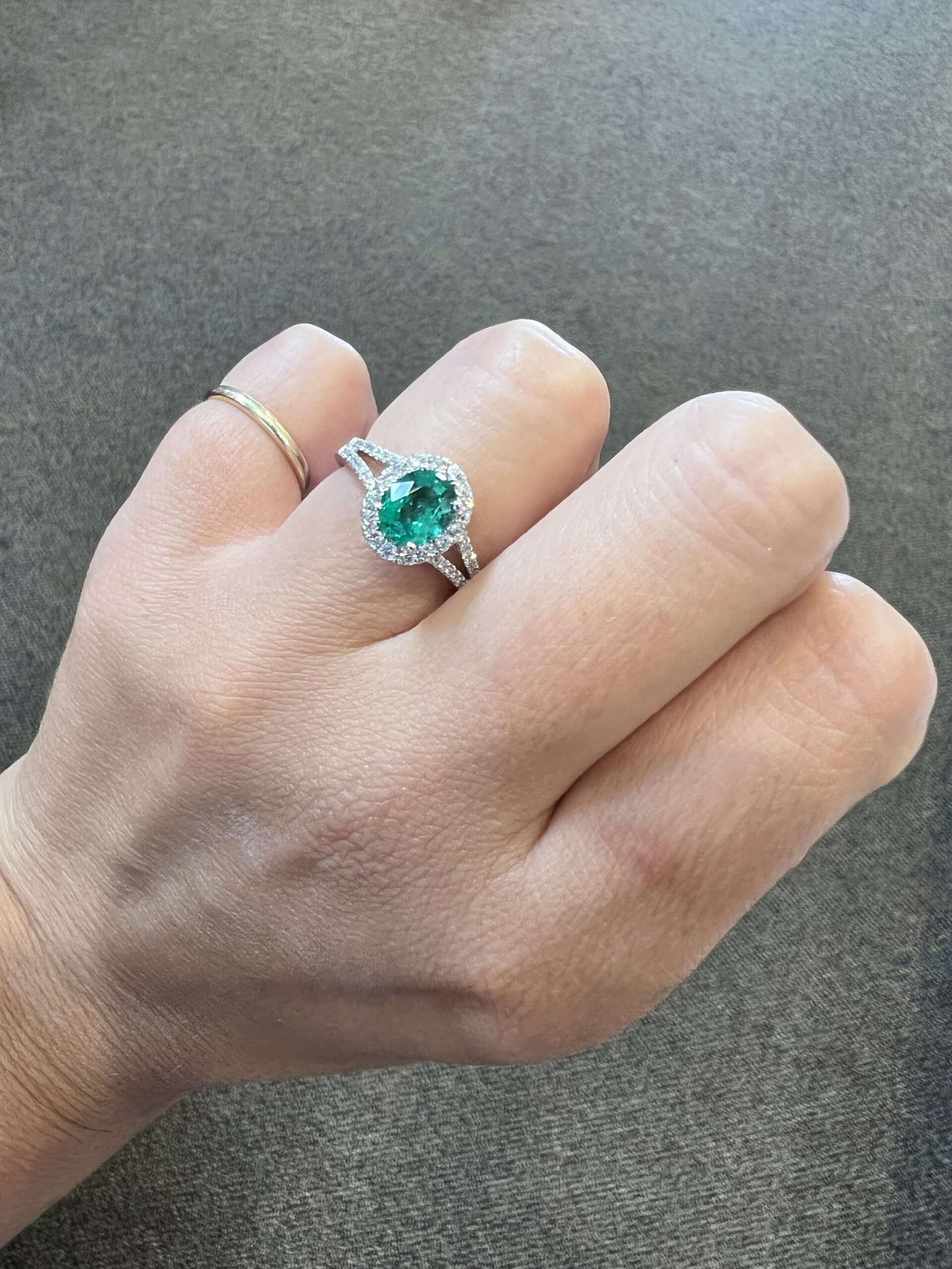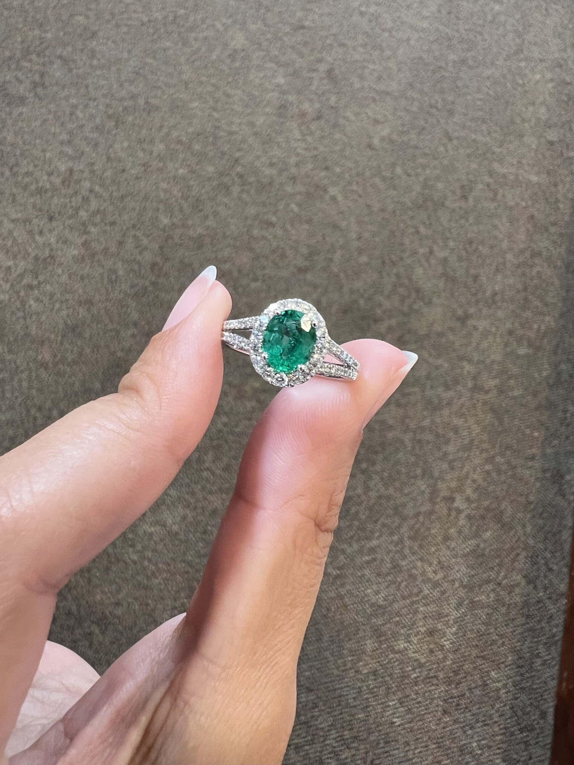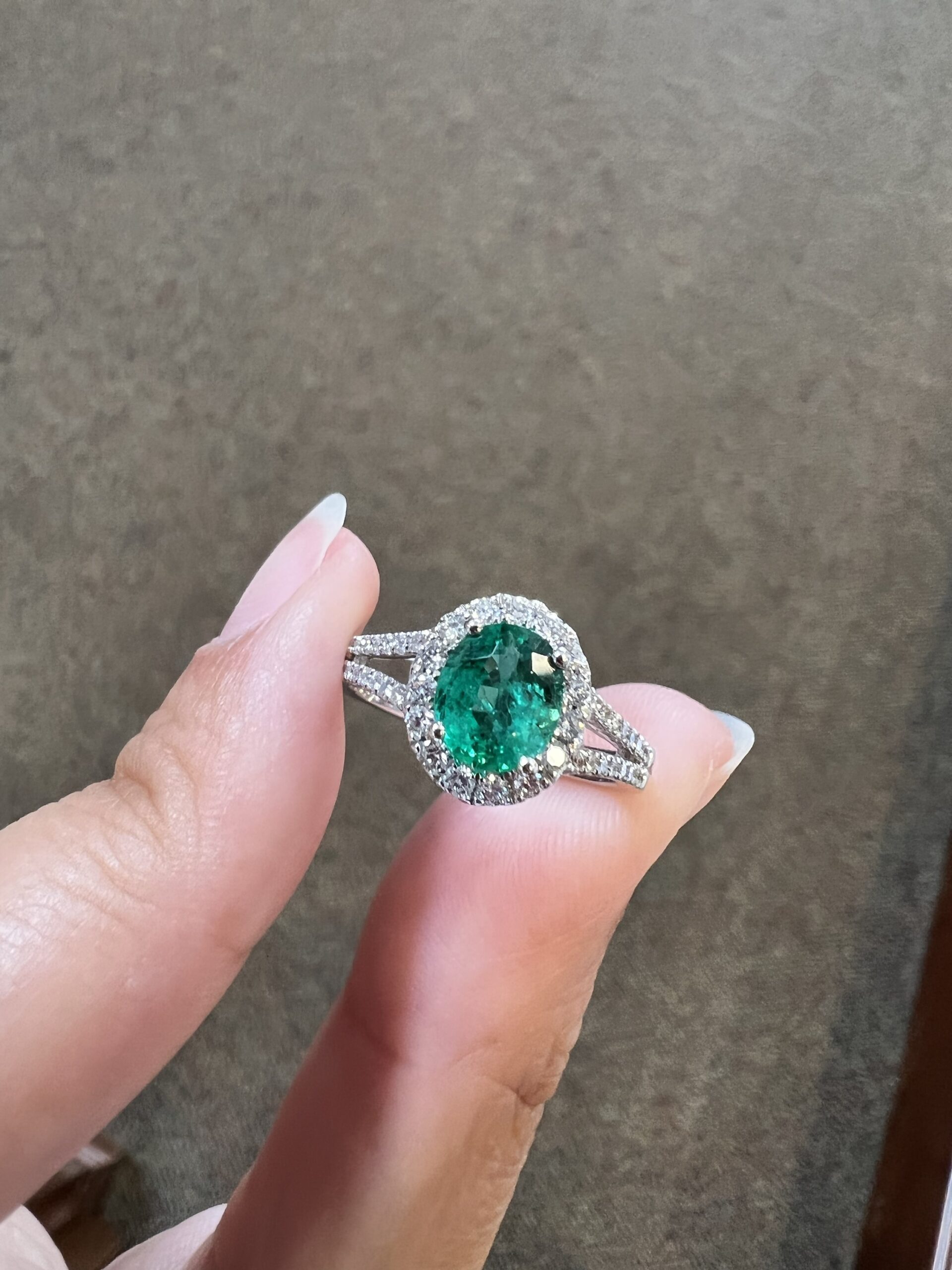 18k white gold genuine oval shaped, faceted, 1.03 carat Emerald (May birthstone) and genuine .39 Cttw Round Brilliant Cut diamond halo ring with split shank. These diamonds average G-H in color, and SI in clarity. The Emerald has vivid light to medium green color and good clarity. This ring has an entire weight of 4.0 grams. This ring is a finger size 6 3/4, but it can be reasonably sized. Please make note of the size needed in the comments section at checkout.