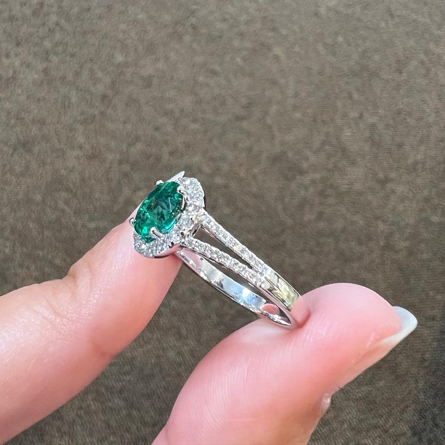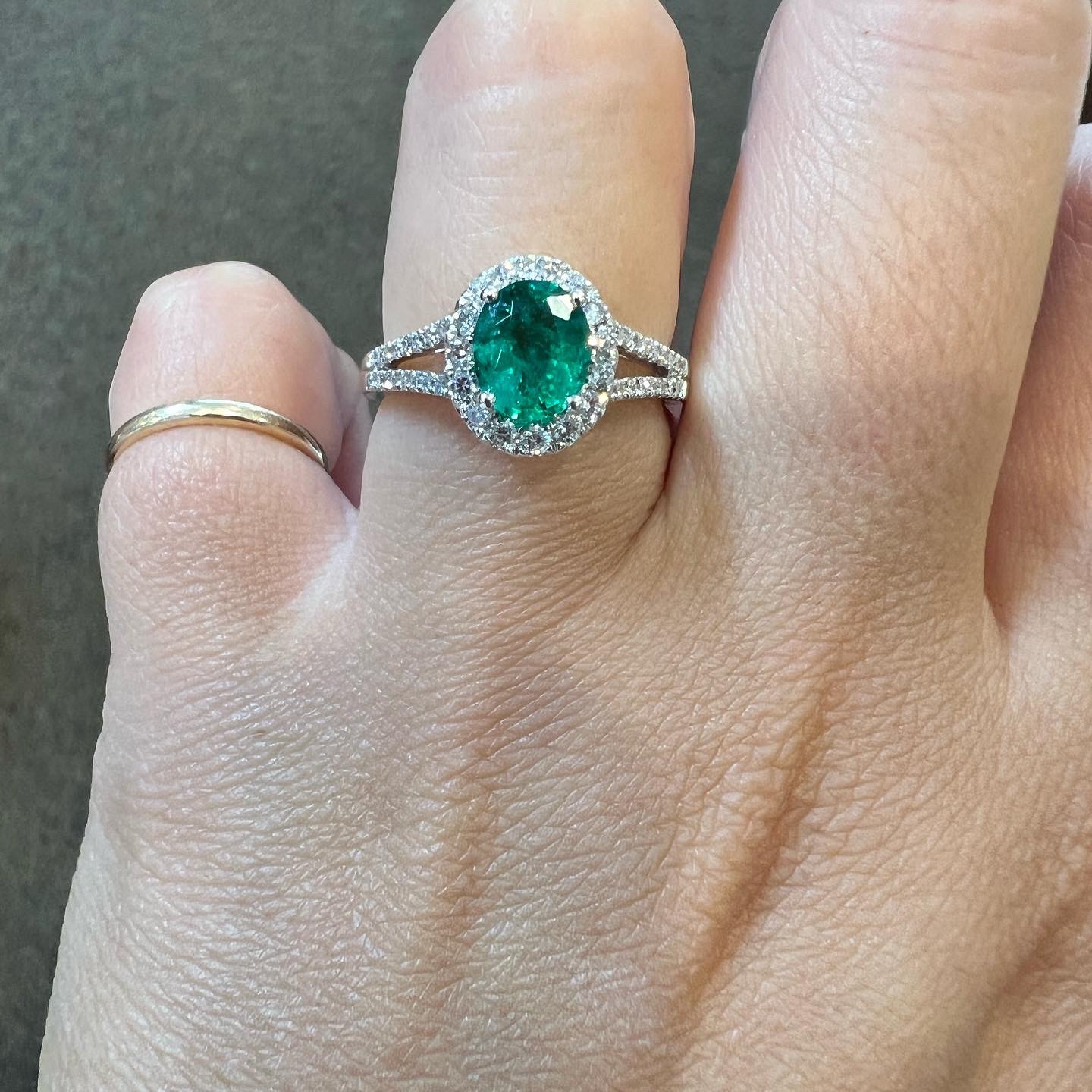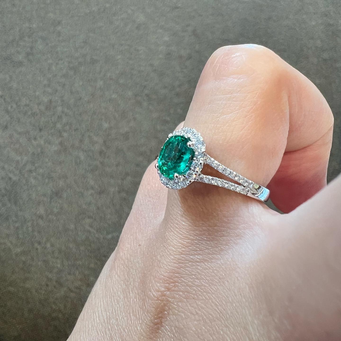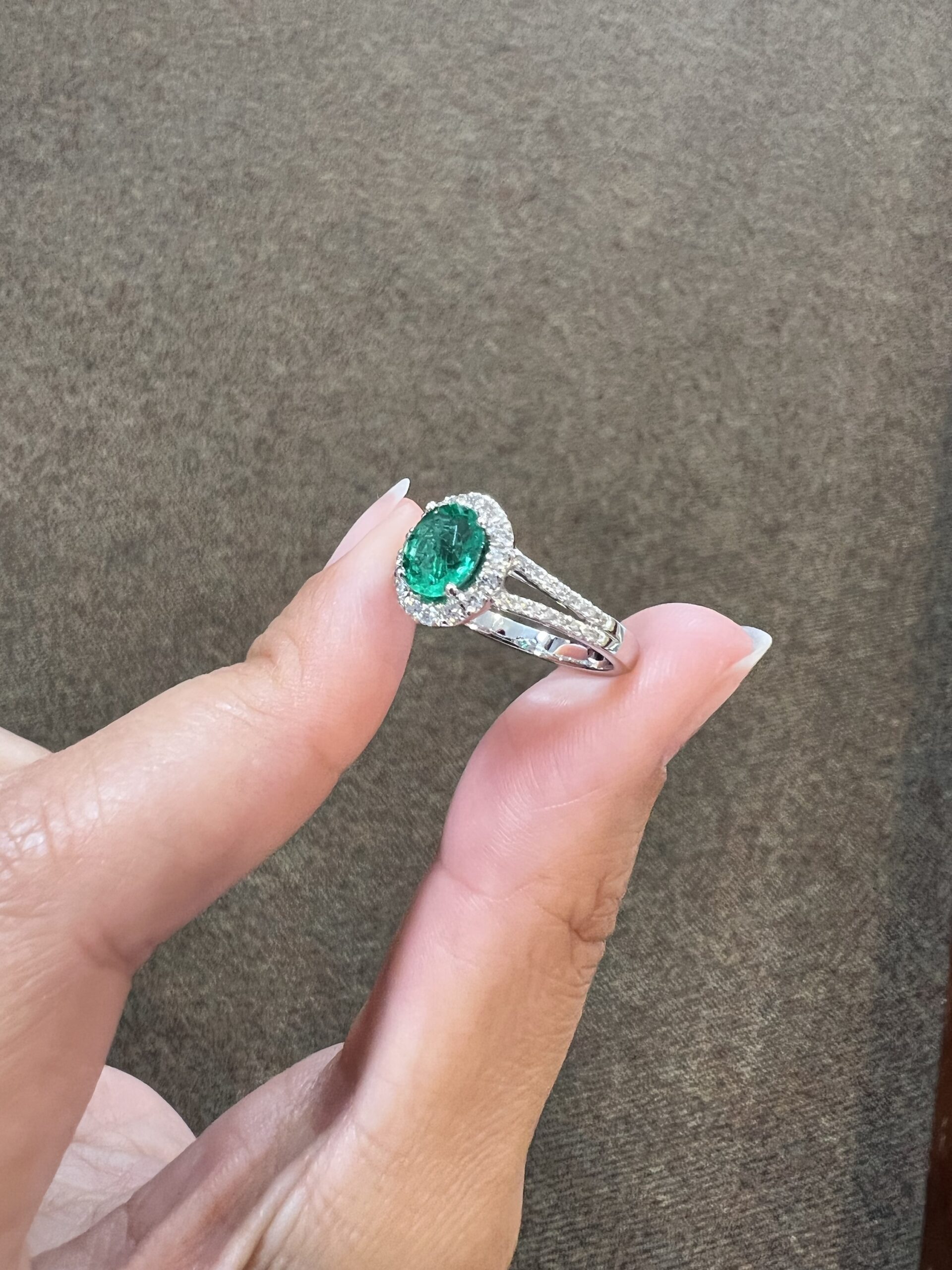 18k white gold genuine oval shaped, faceted, 1.03 carat Emerald (May birthstone) and genuine .39 Cttw Round Brilliant Cut diamond halo ring with split shank. These diamonds average G-H in color, and SI in clarity. The Emerald has vivid light to medium green color and good clarity. This ring has an entire weight of 4.0 grams. This ring is a finger size 6 3/4, but it can be reasonably sized. Please make note of the size needed in the comments section at checkout.