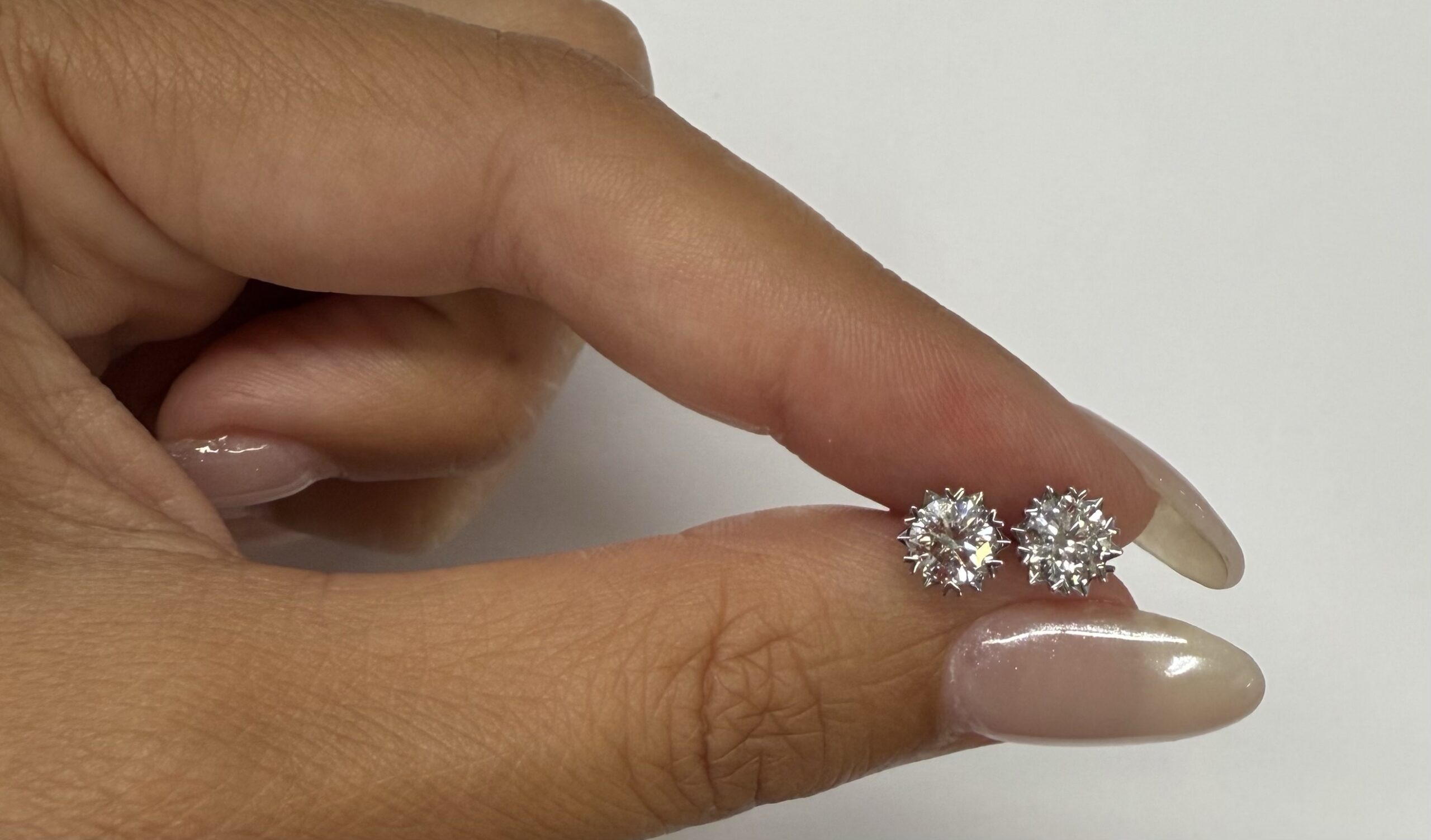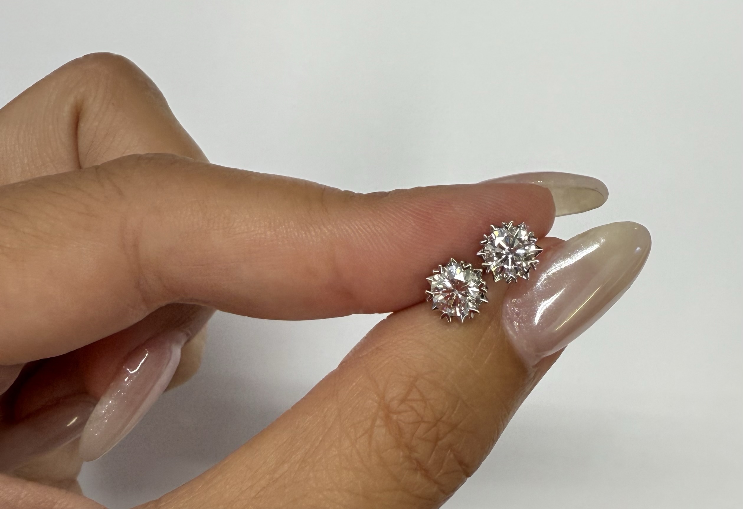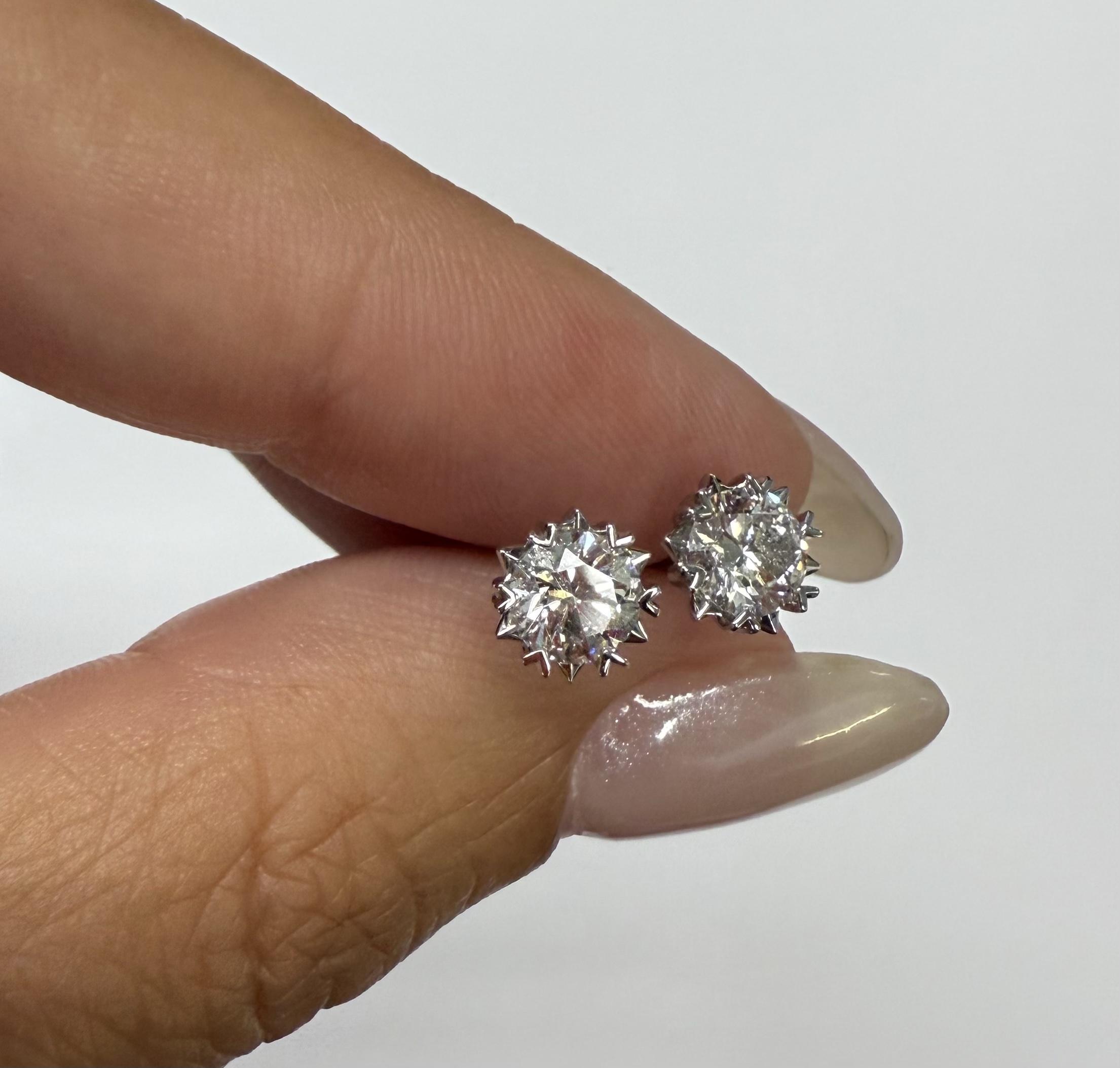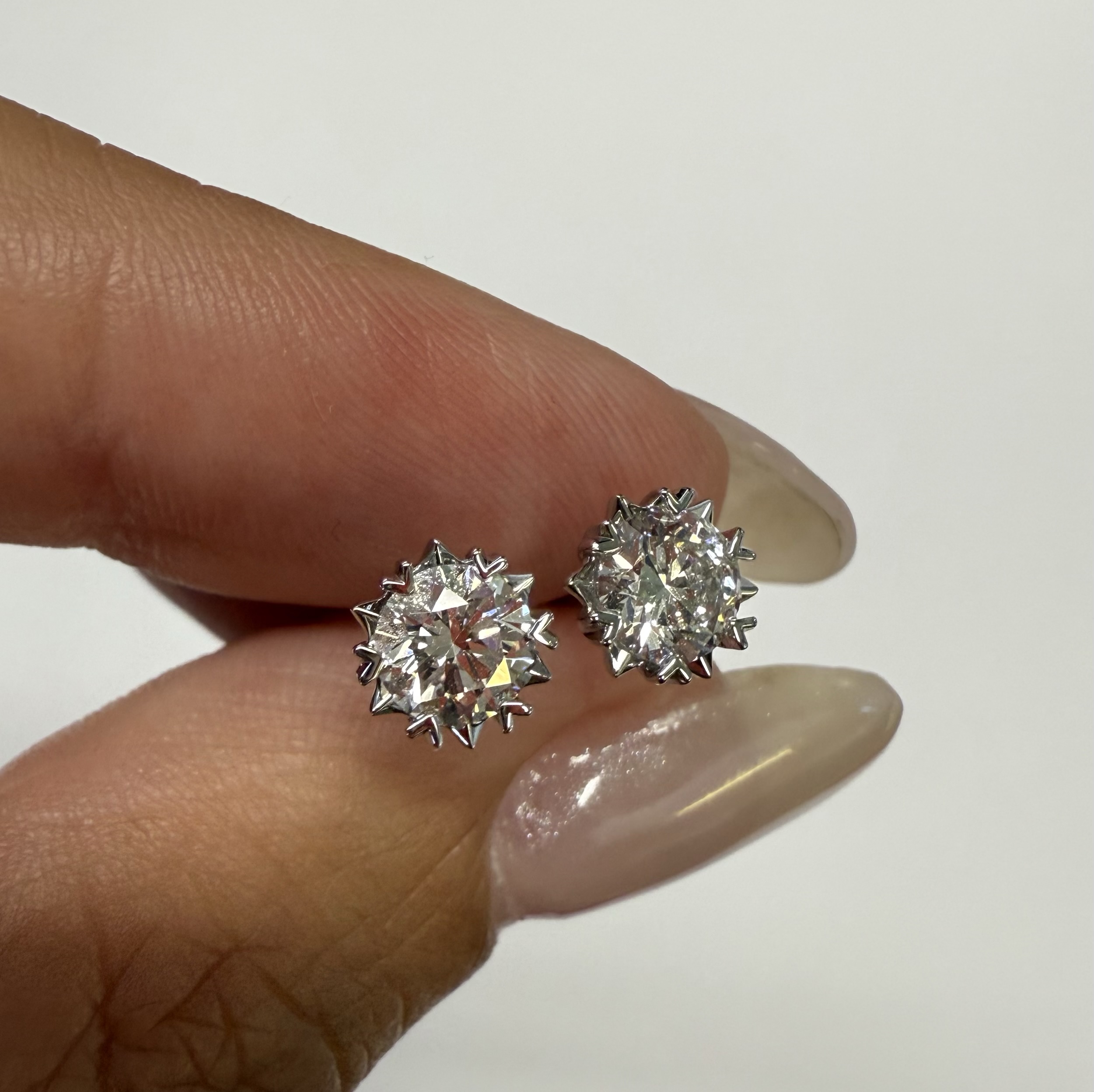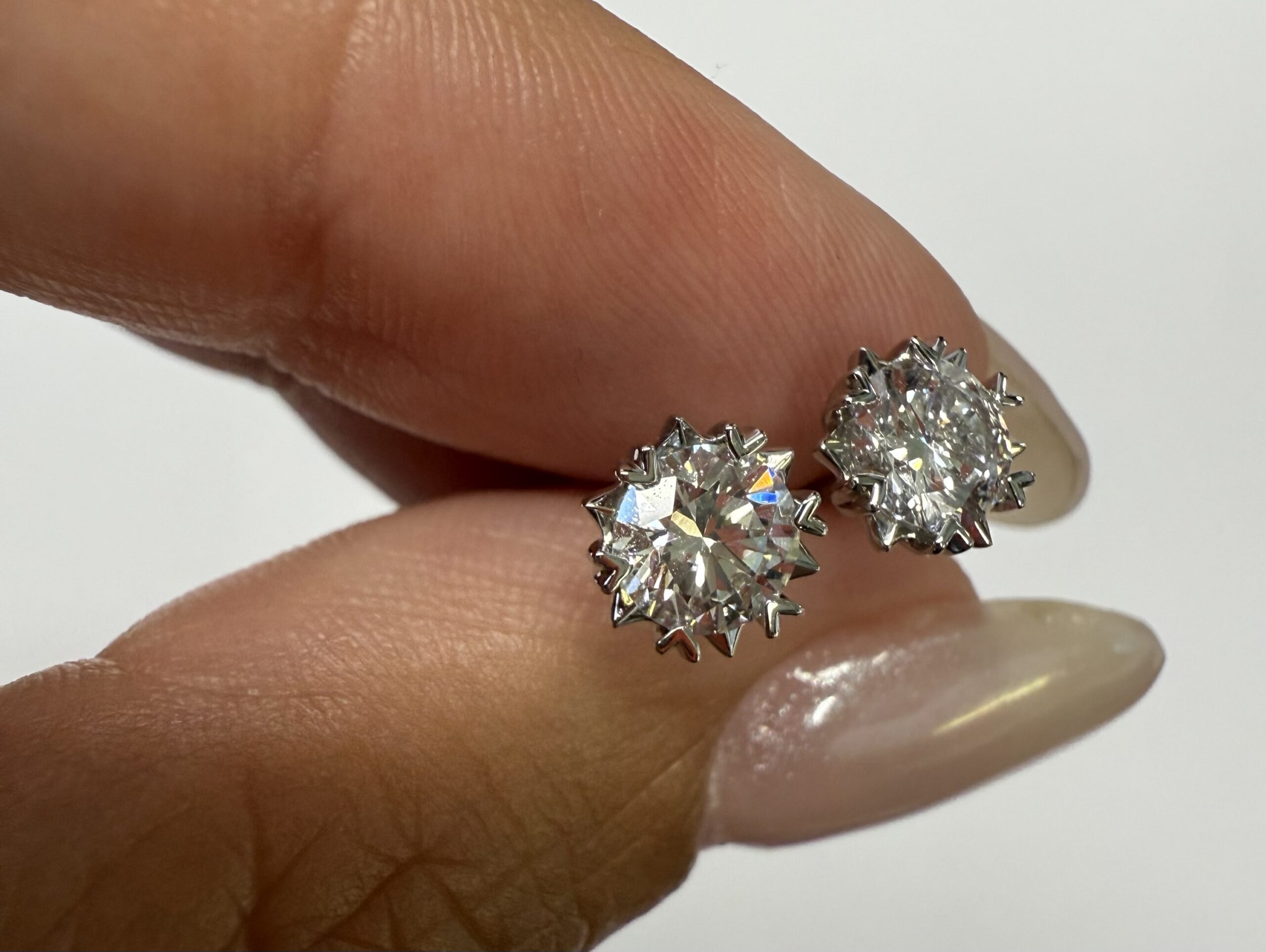 14k white gold genuine 1.03 cttw Laboratory Grown Round Brilliant Cut diamond multi-prong stud earrings. These diamonds average F in color, and VS2 in clarity. These earrings have an entire weight of grams.