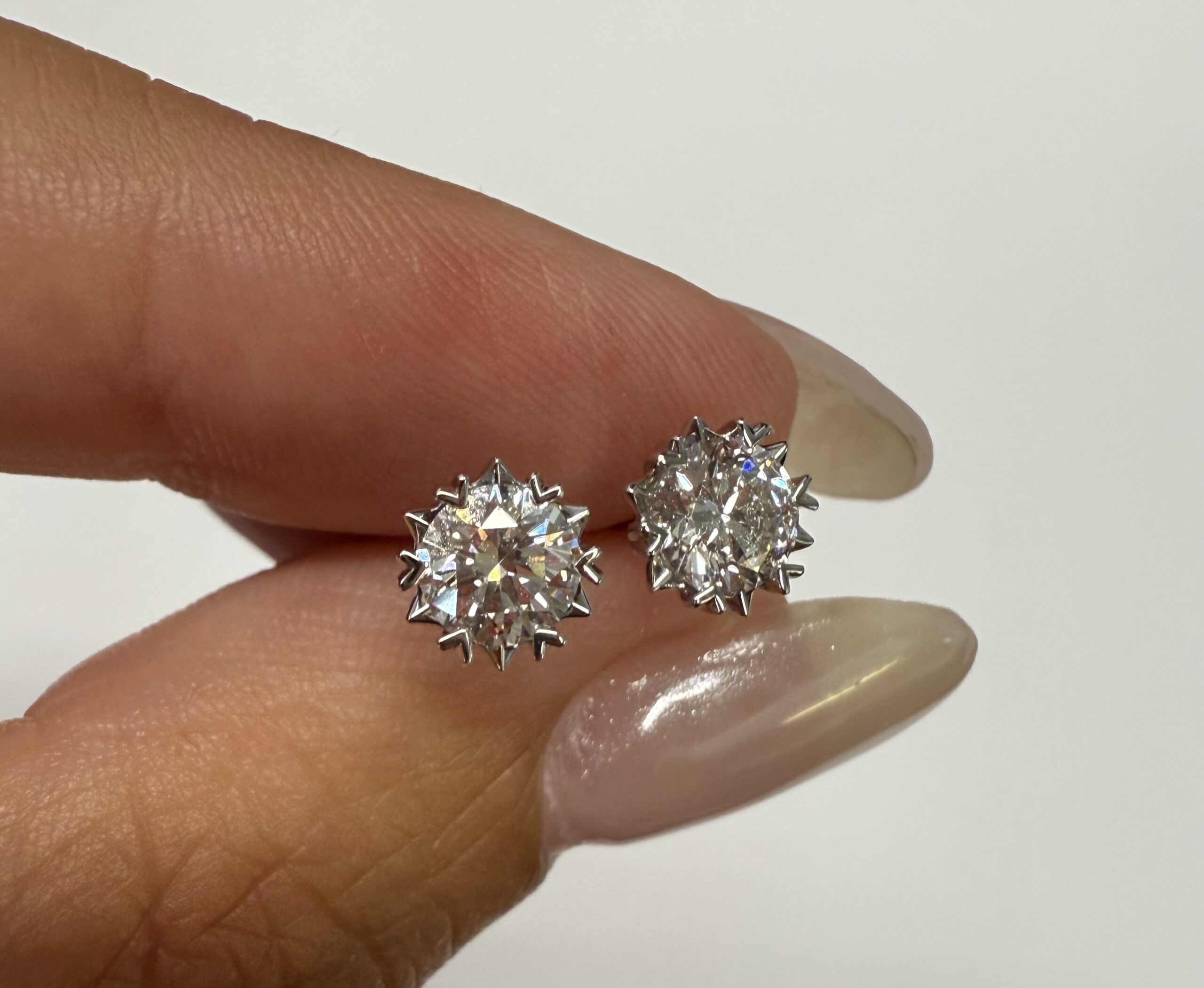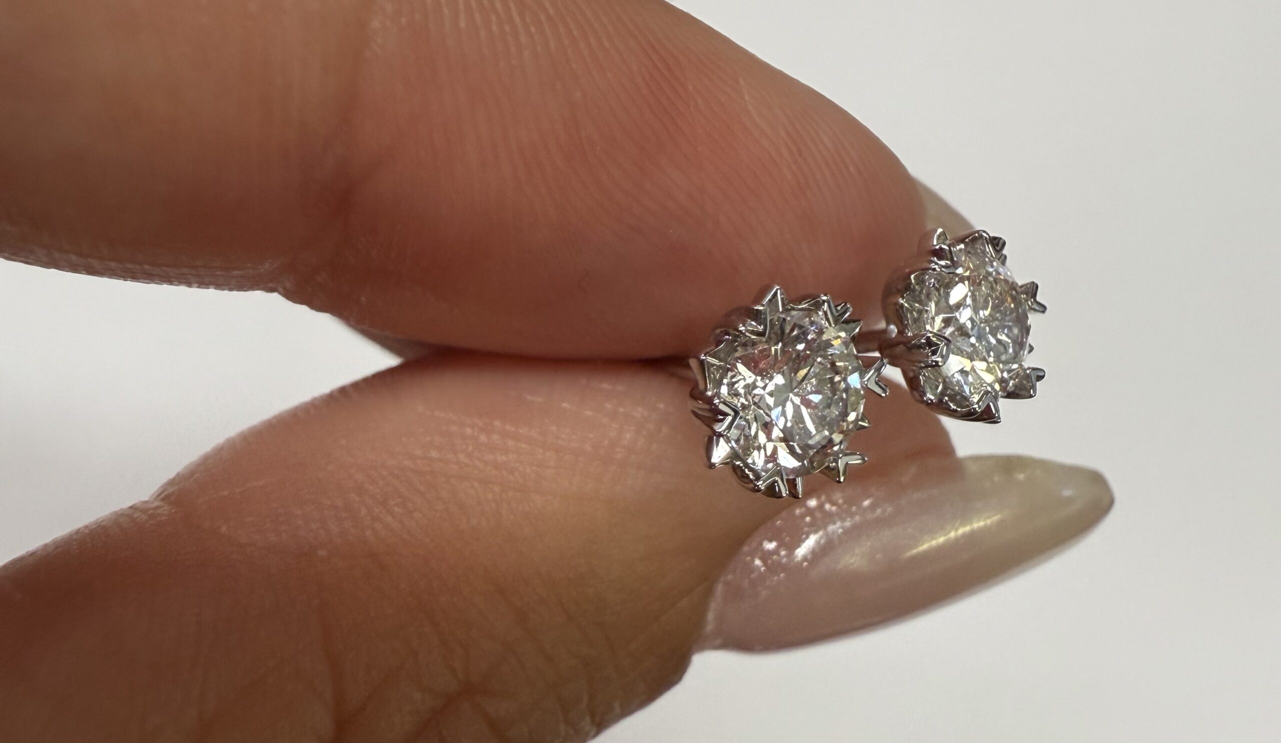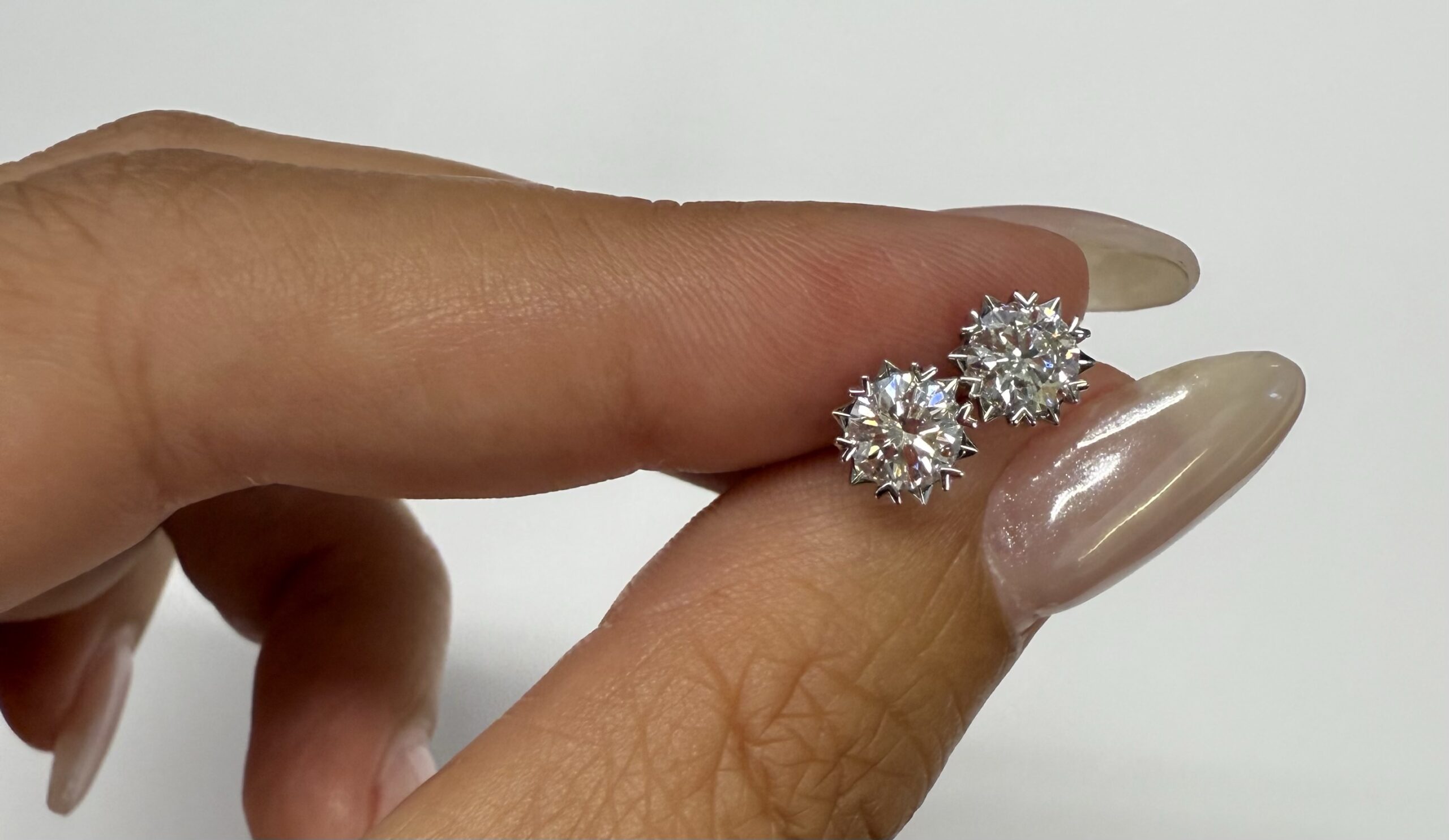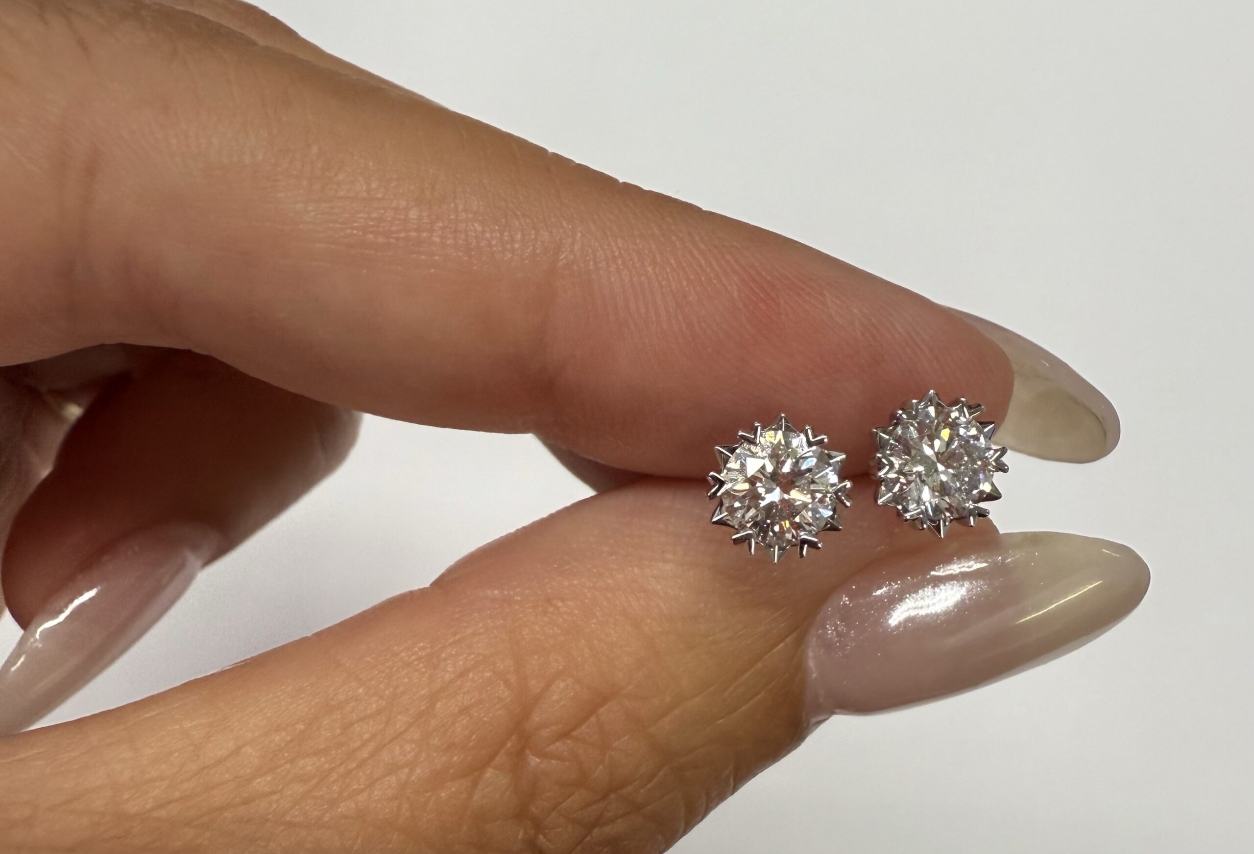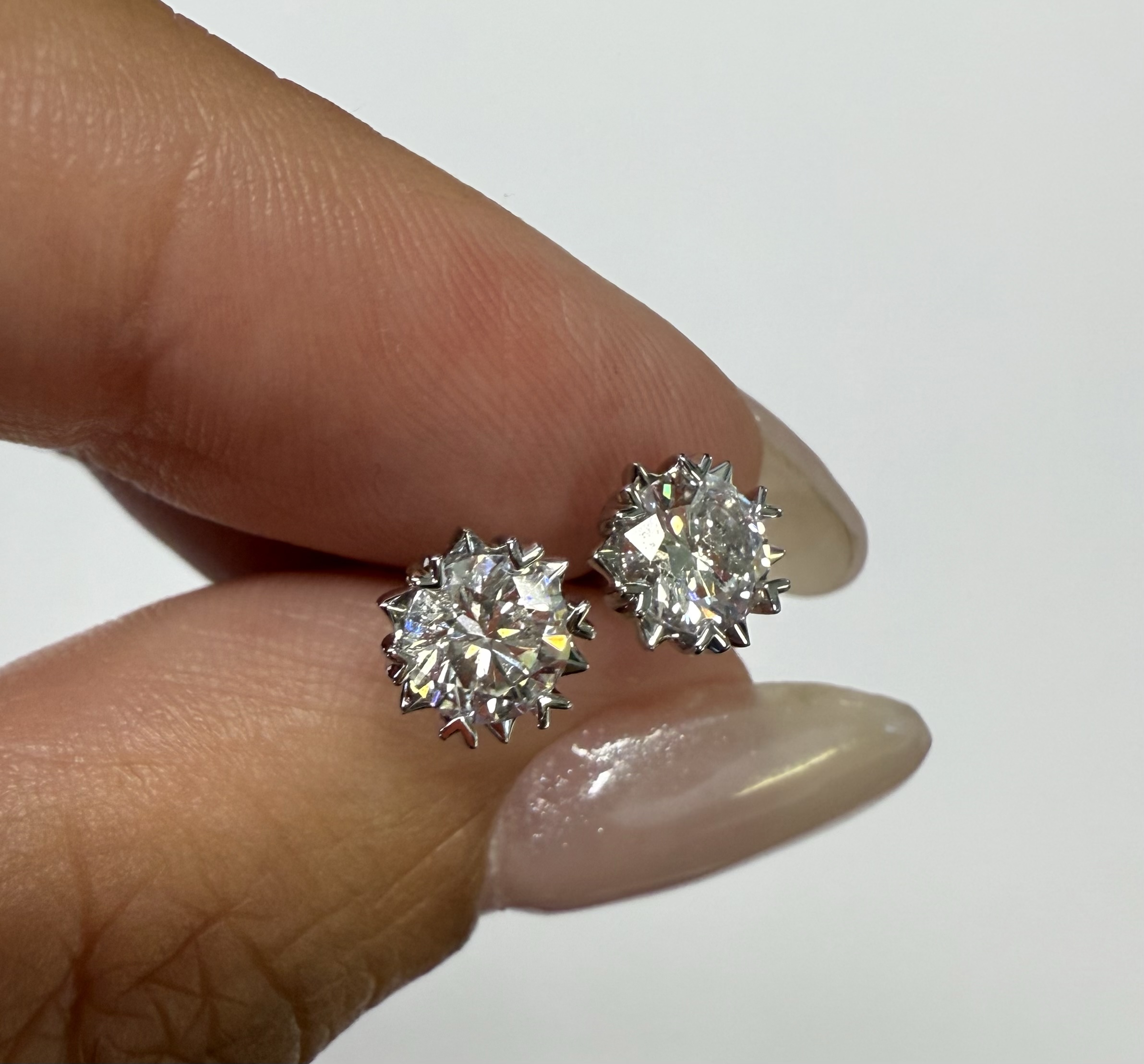 14k white gold genuine 1.03 cttw Laboratory Grown Round Brilliant Cut diamond multi-prong stud earrings. These diamonds average F in color, and VS2 in clarity. These earrings have an entire weight of grams.
