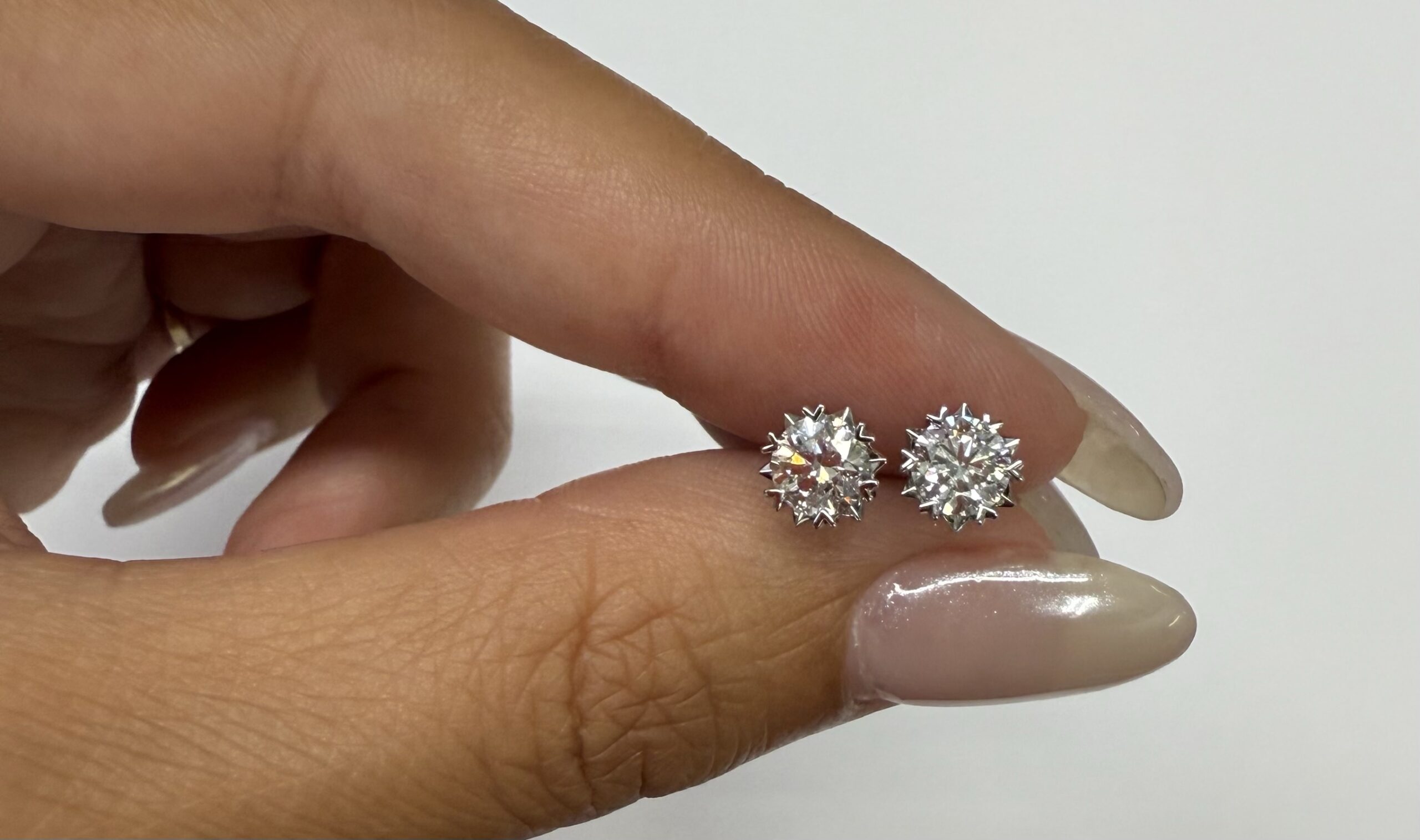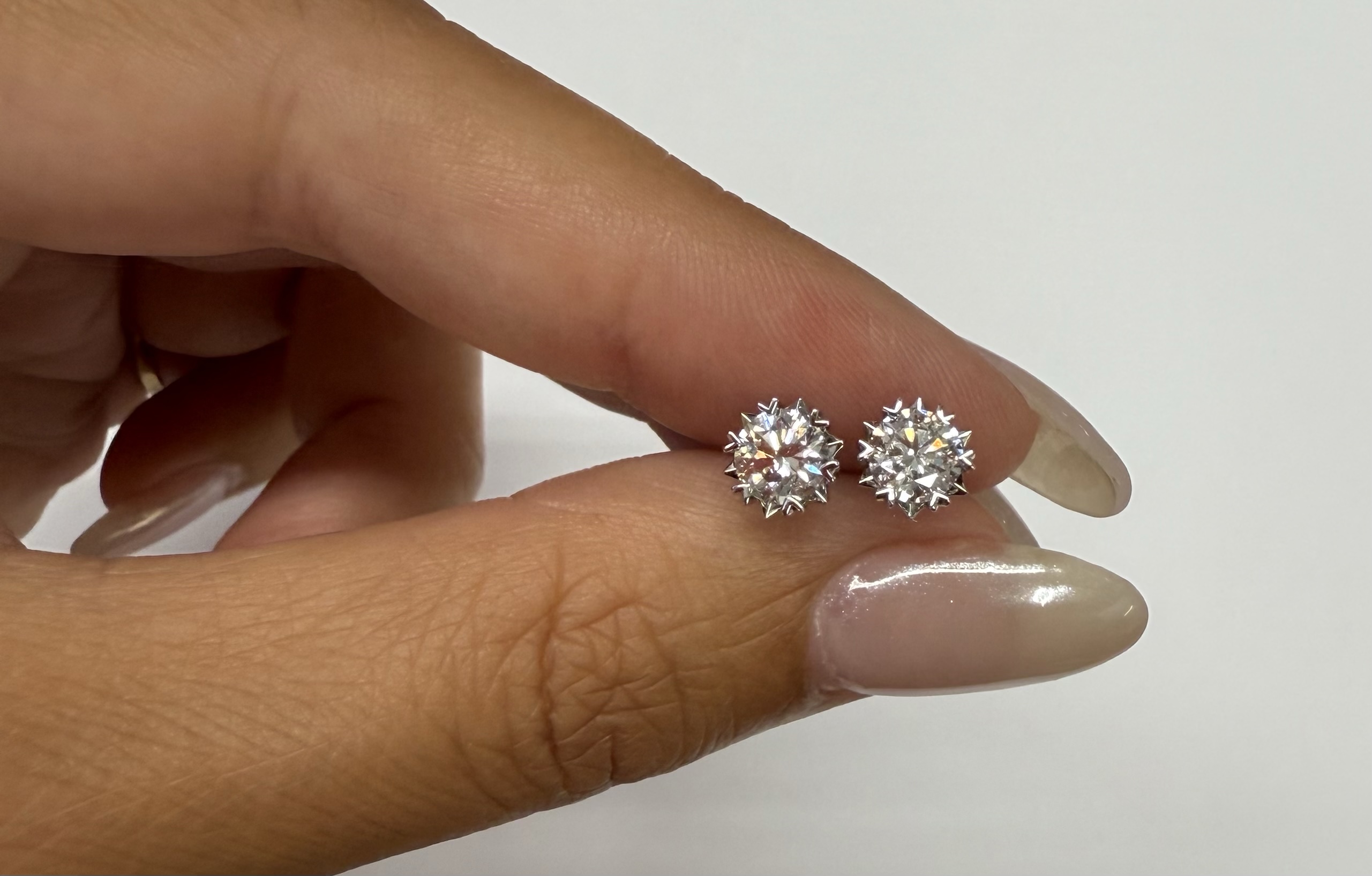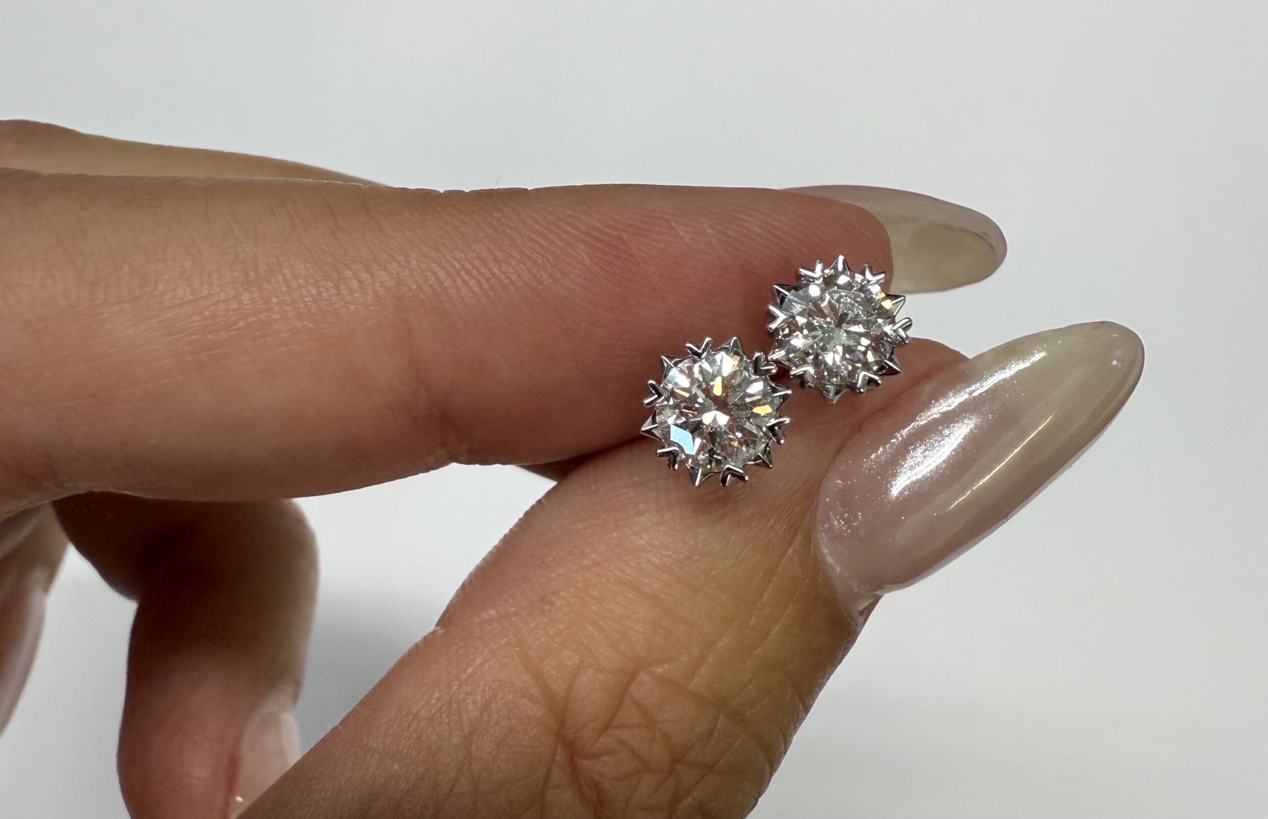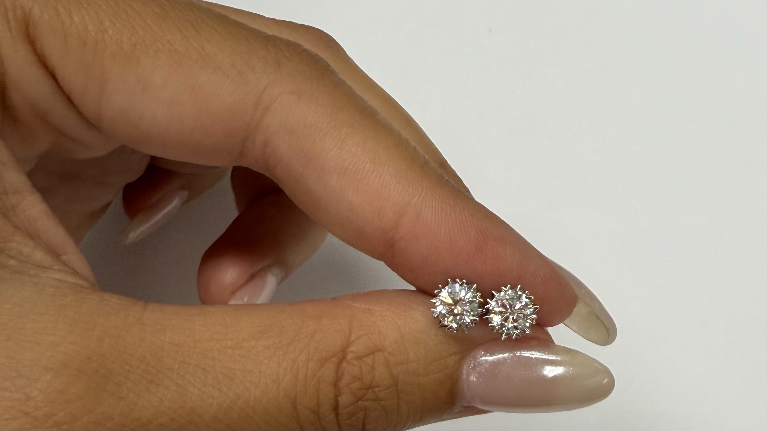 14k white gold genuine 1.03 cttw Laboratory Grown Round Brilliant Cut diamond multi-prong stud earrings. These diamonds average F in color, and VS2 in clarity. These earrings have an entire weight of grams.