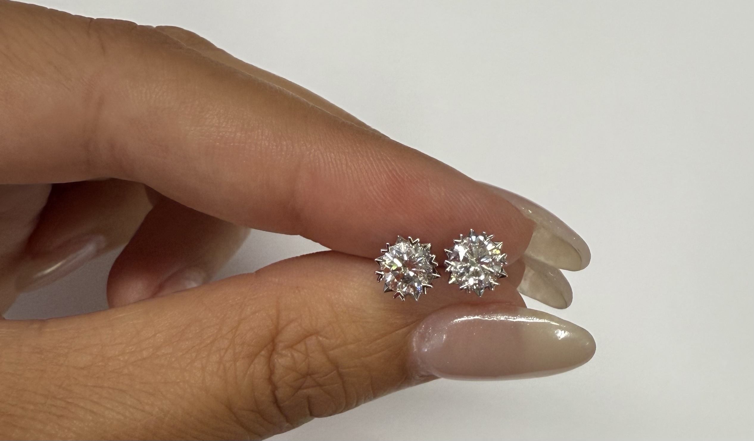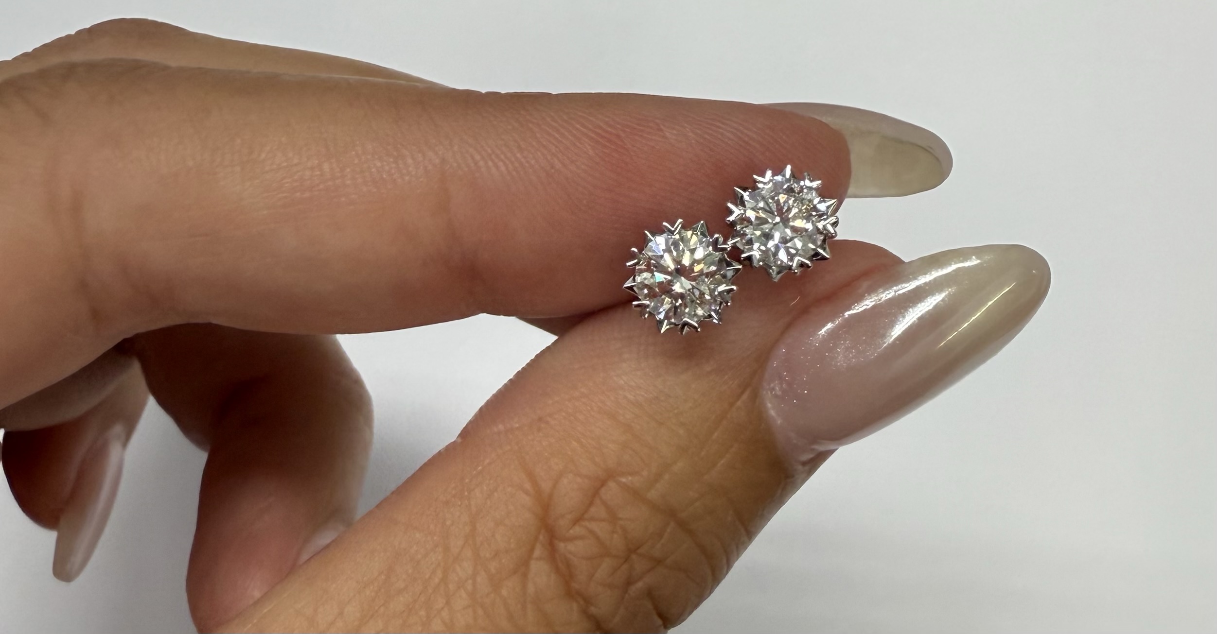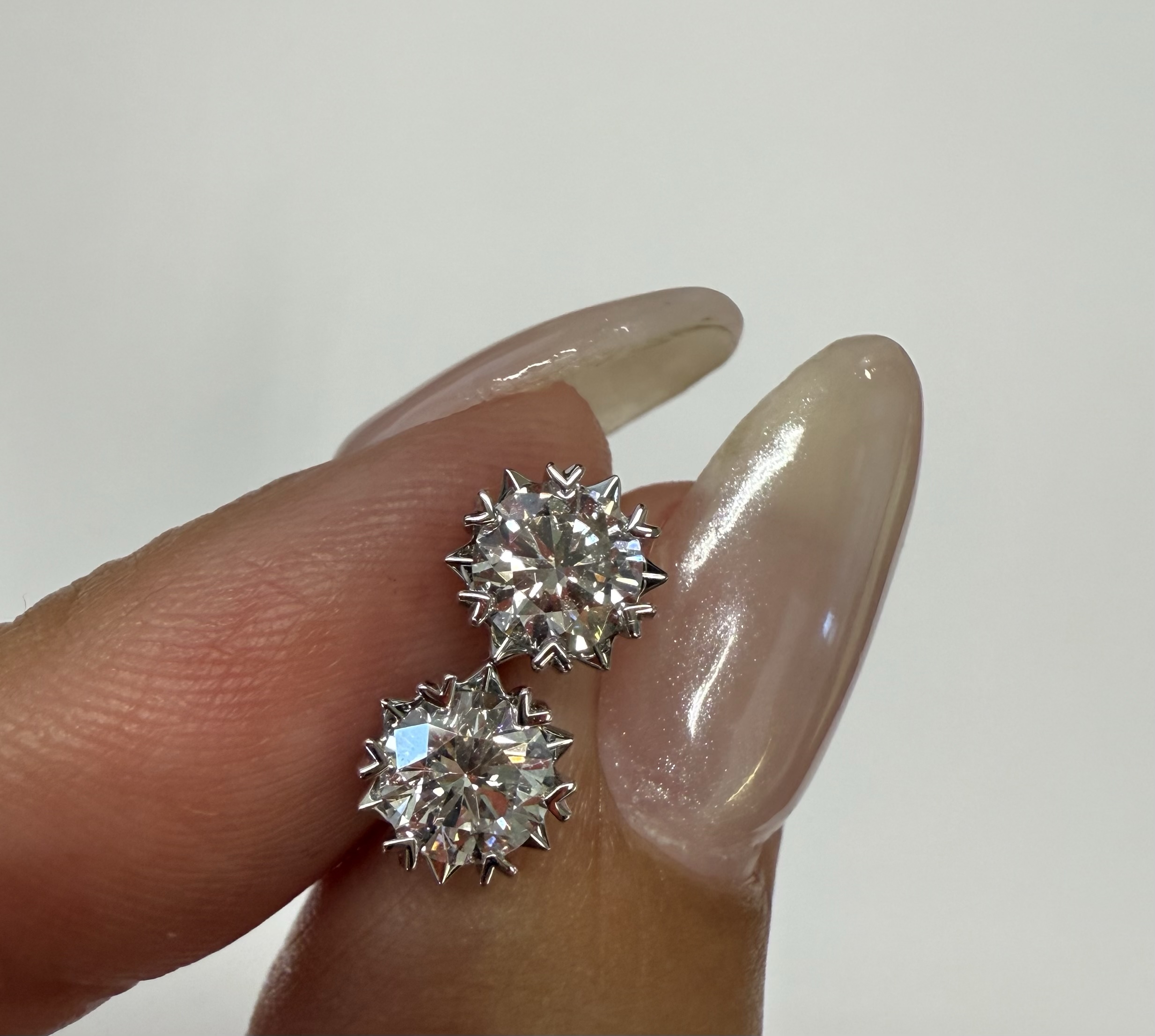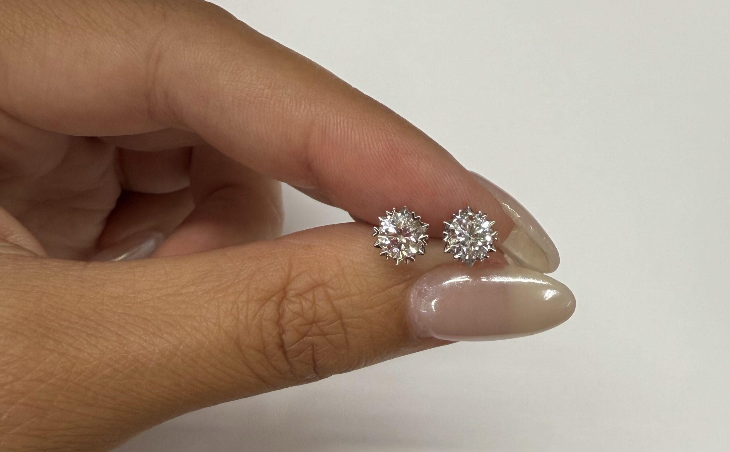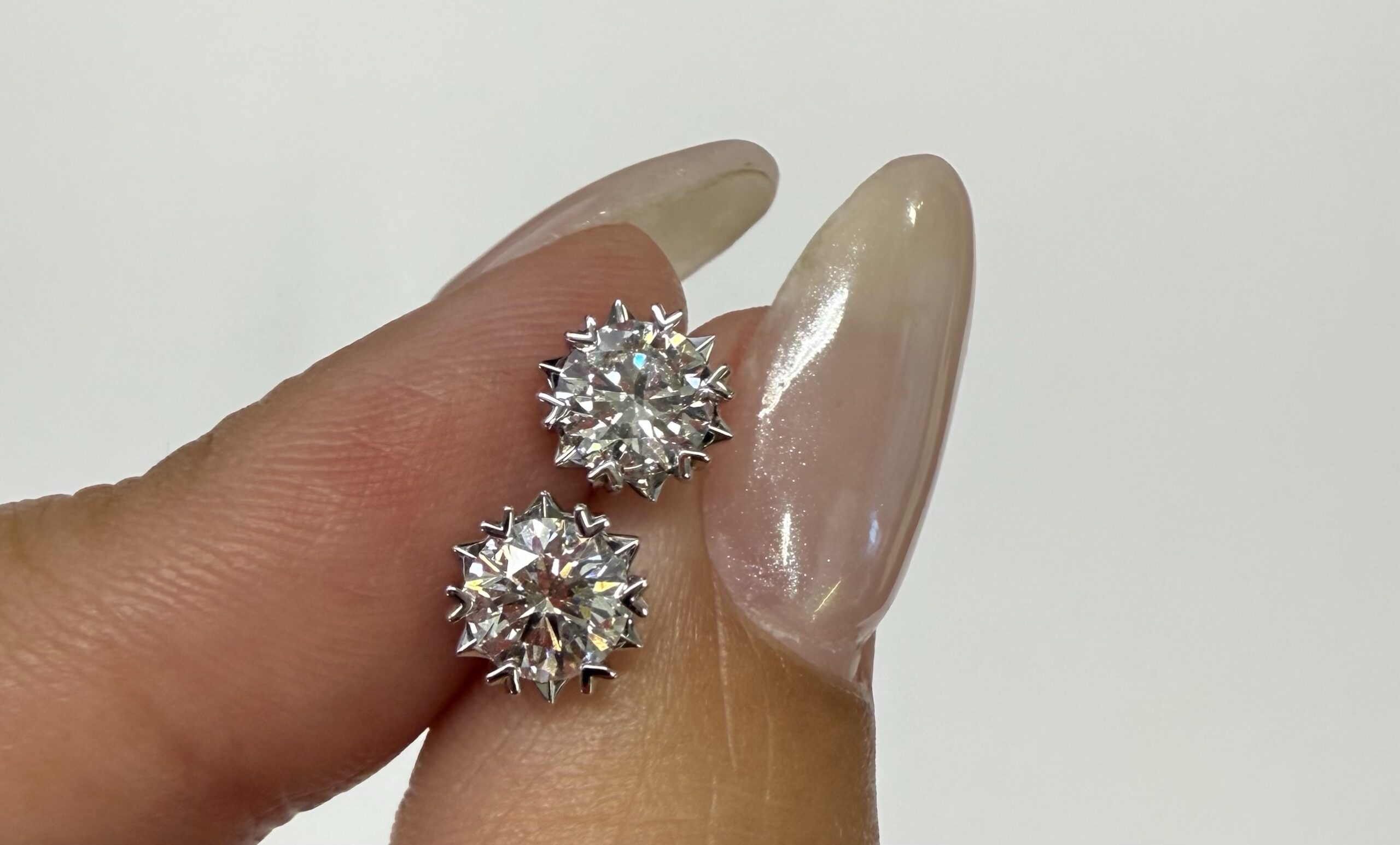 14k white gold genuine 1.03 cttw Laboratory Grown Round Brilliant Cut diamond multi-prong stud earrings. These diamonds average F in color, and VS2 in clarity. These earrings have an entire weight of grams.