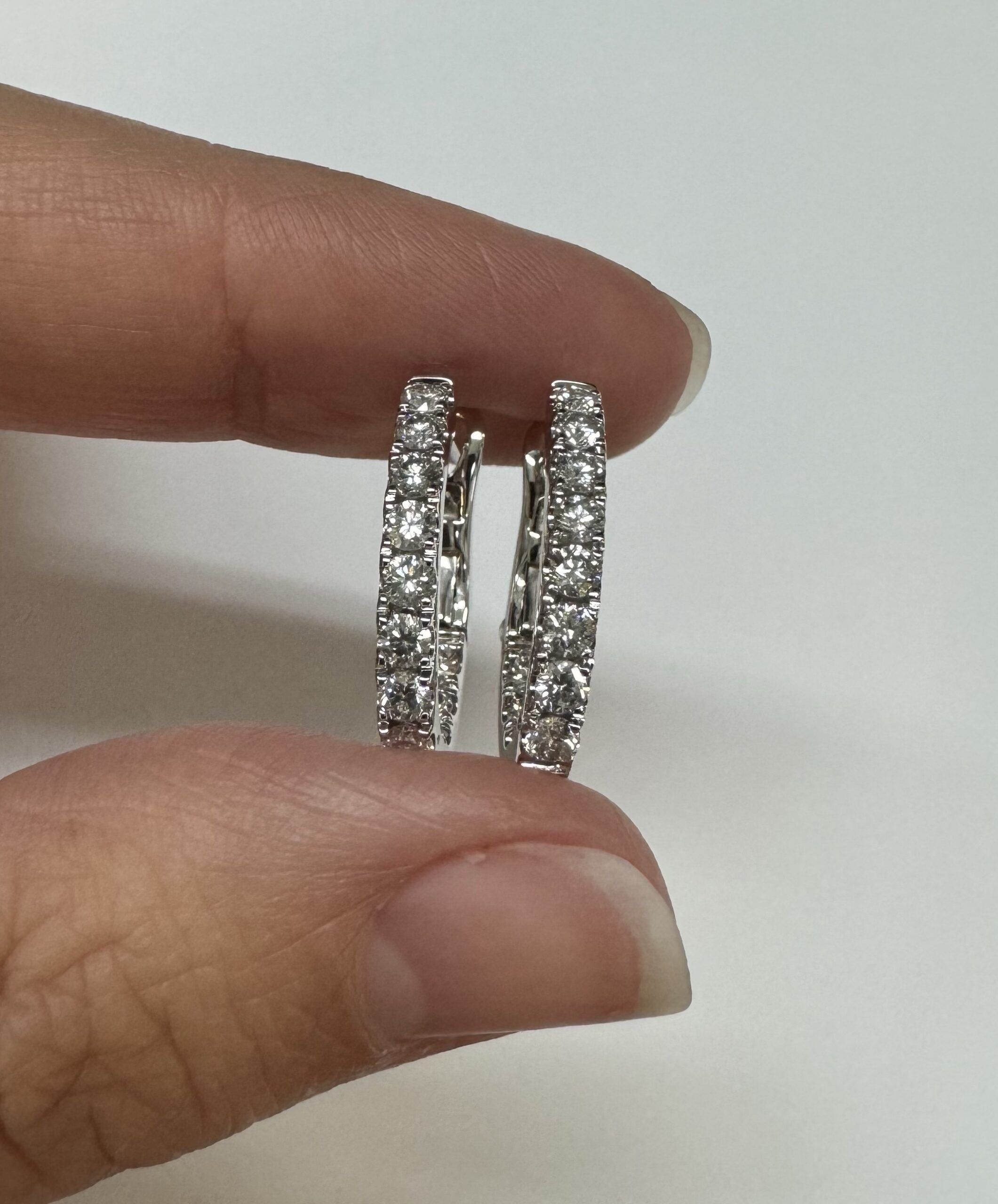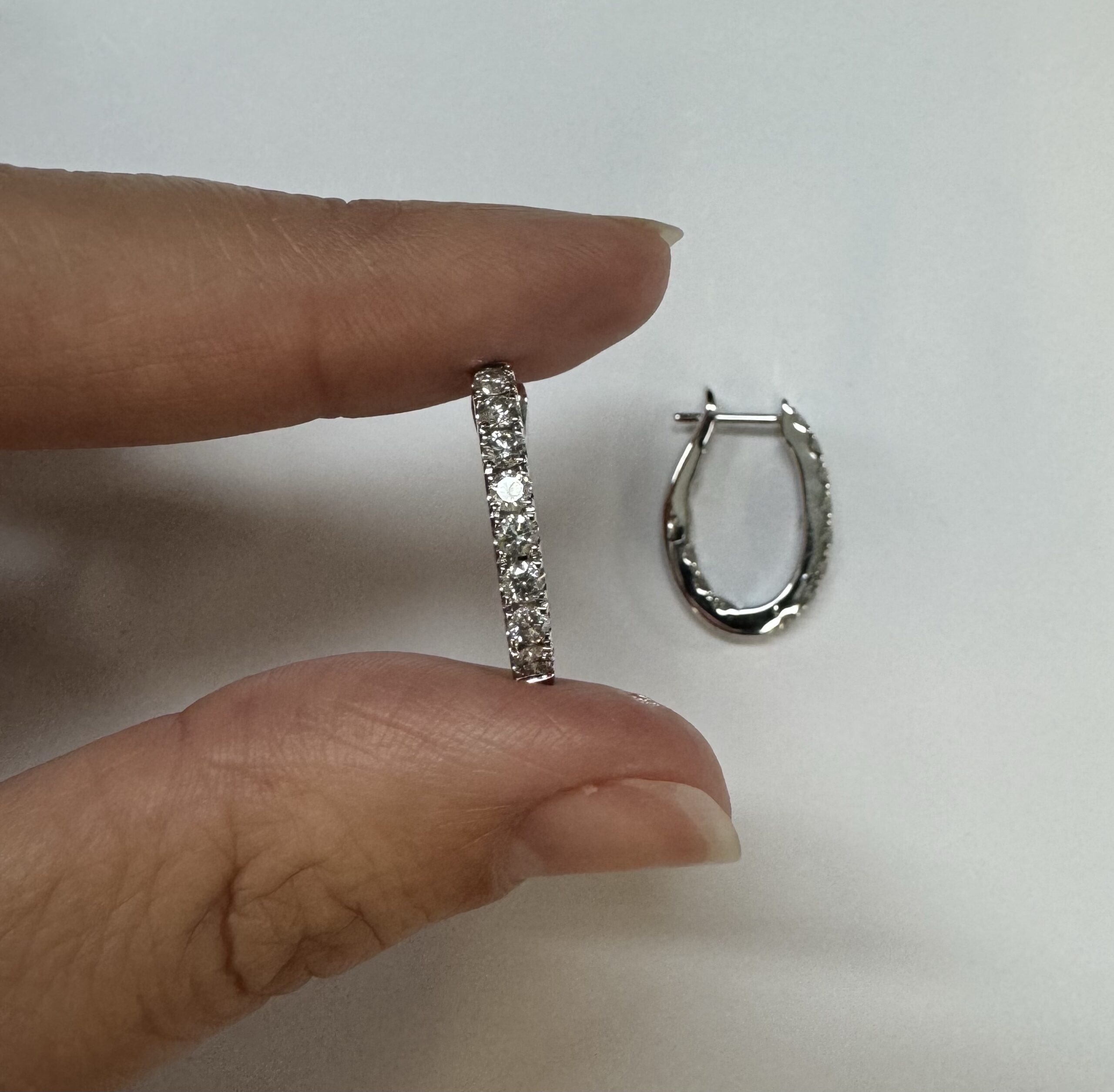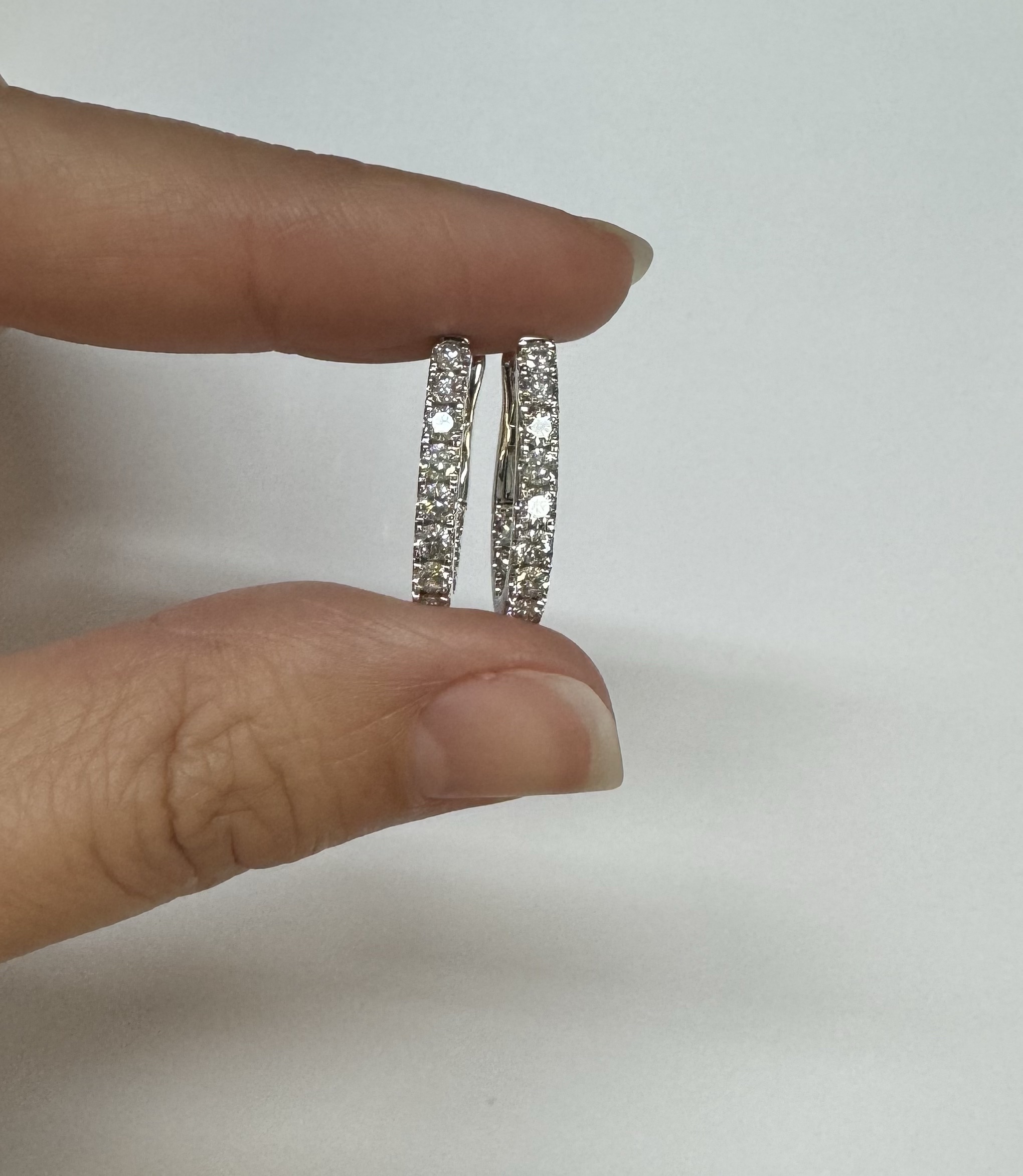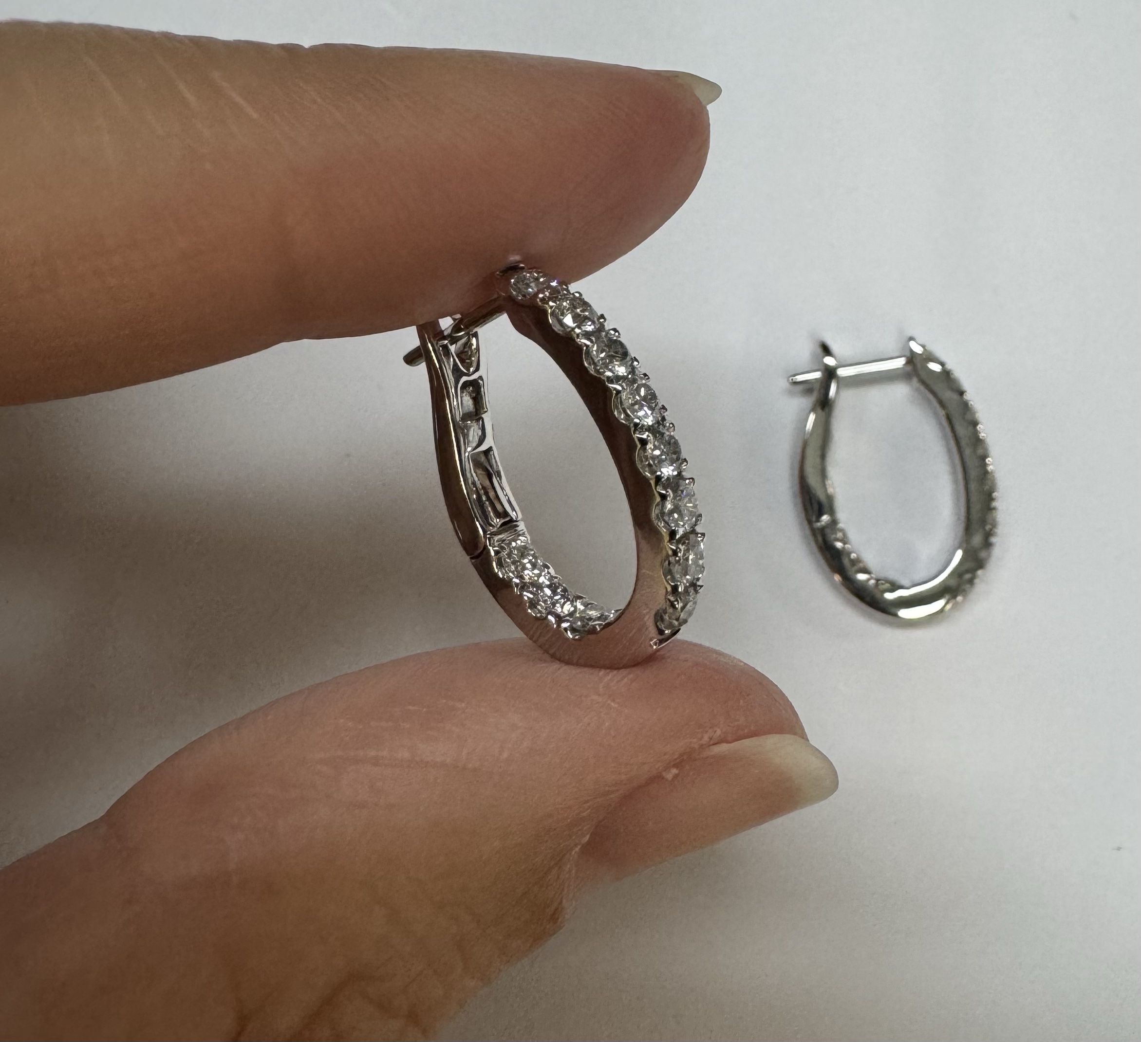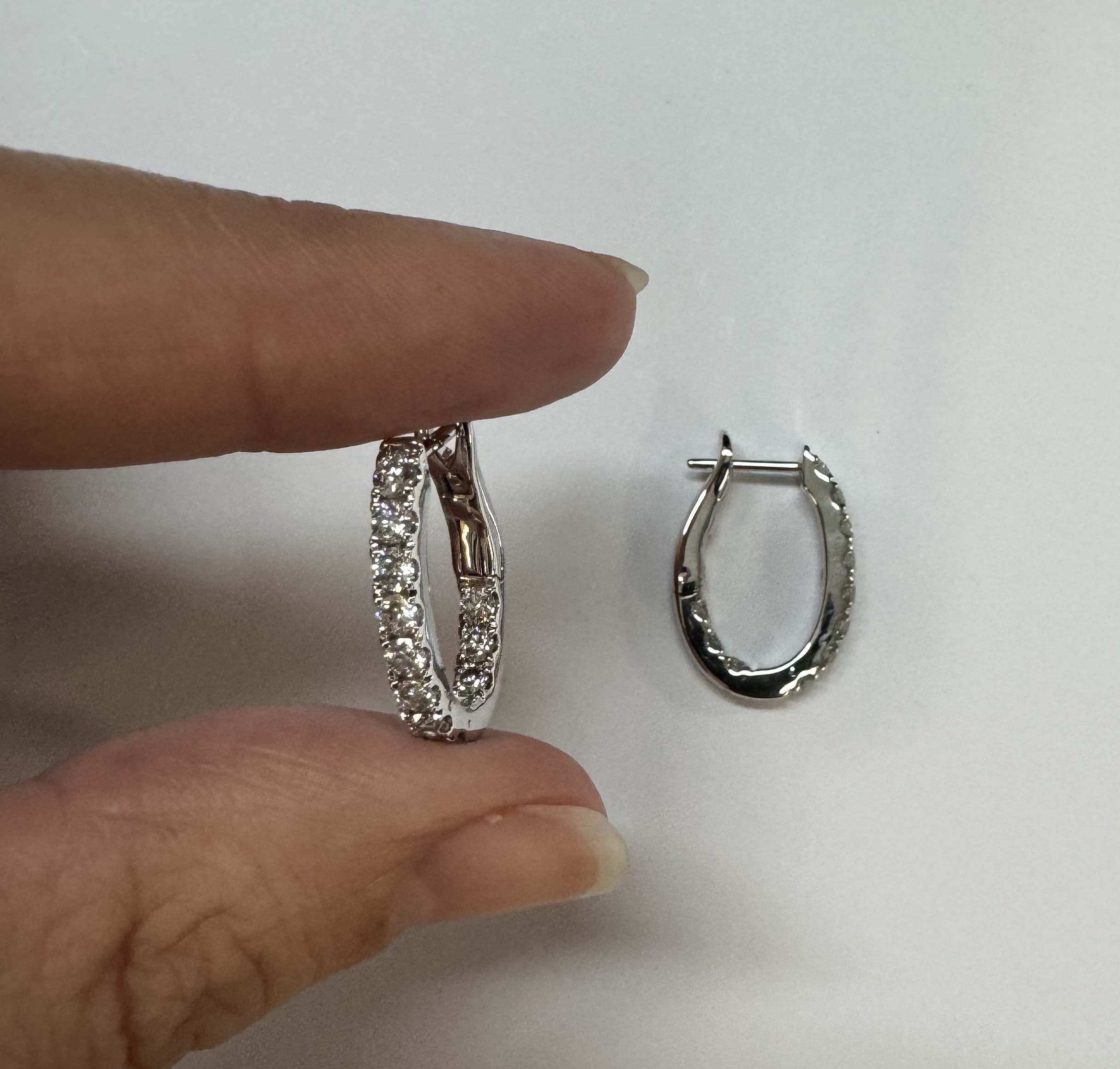 14k white gold genuine 1.03 cttw Round Brilliant Cut diamond “inside out” oval-shaped hoop earrings. These diamonds average H in color and SI1-SI2 in clarity. These diamonds are nicely proportioned and well finished. These earrings measure 2.8 mm x 19.3 mm in size. These earrings have an entire weight of 4.9 grams.