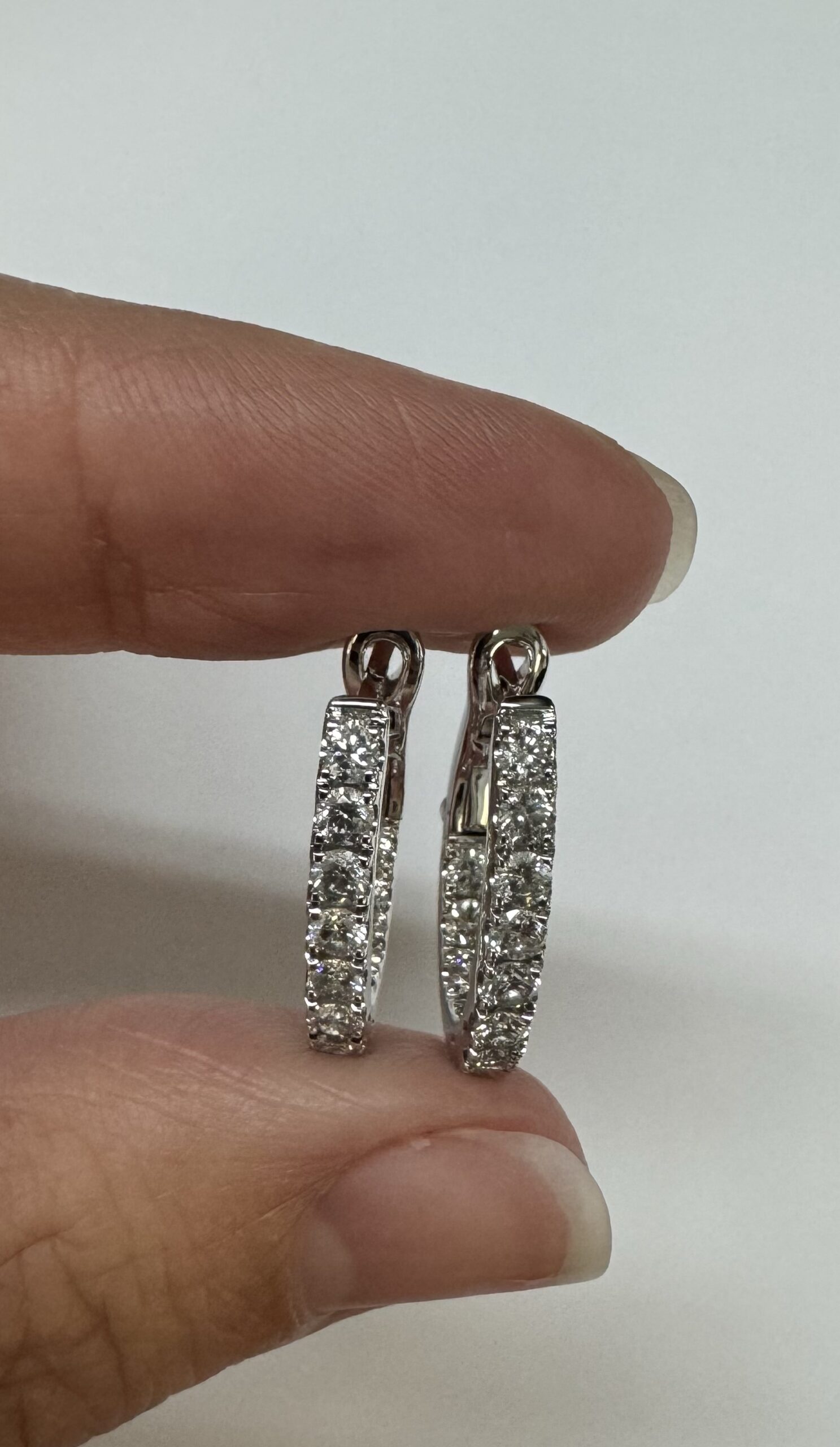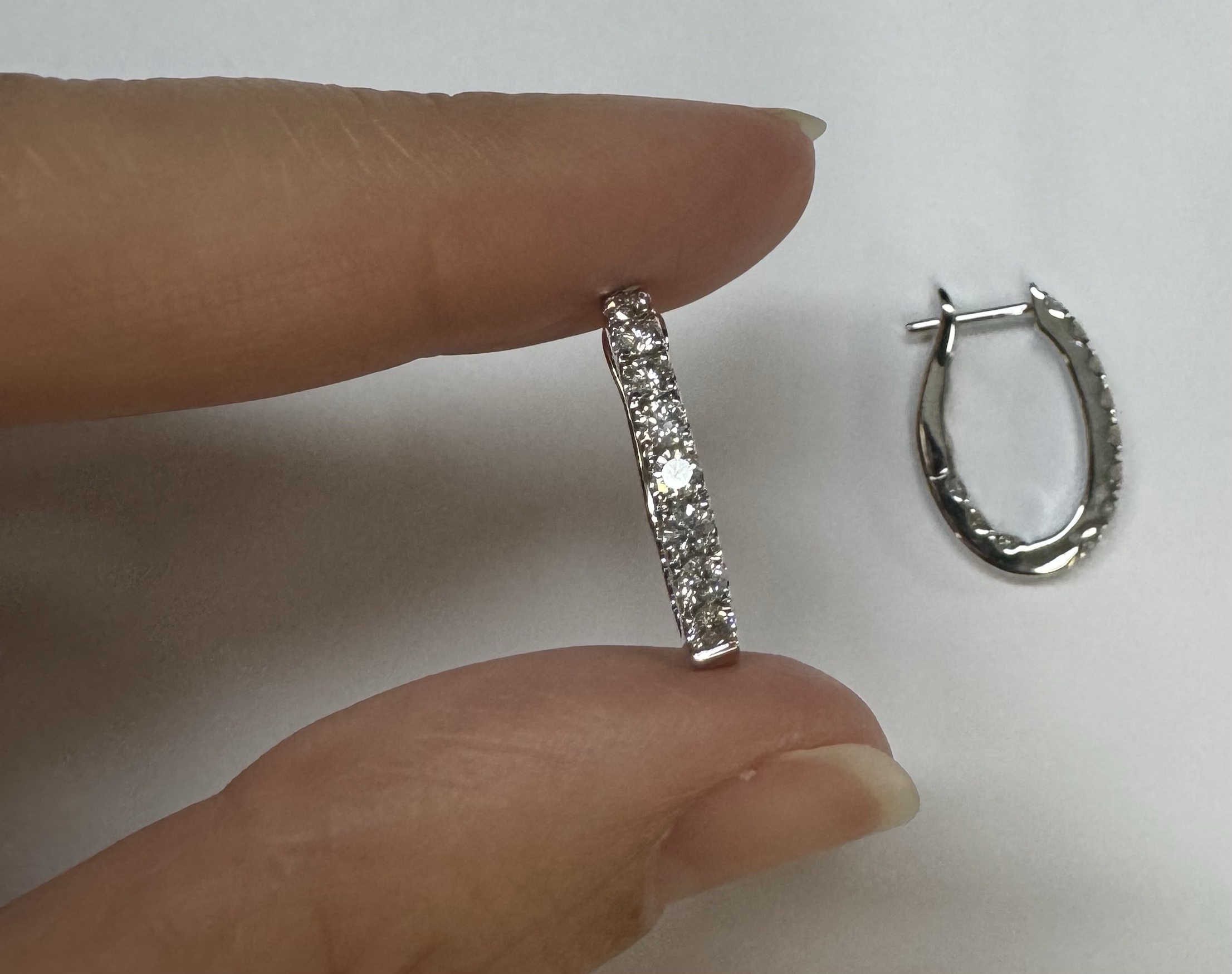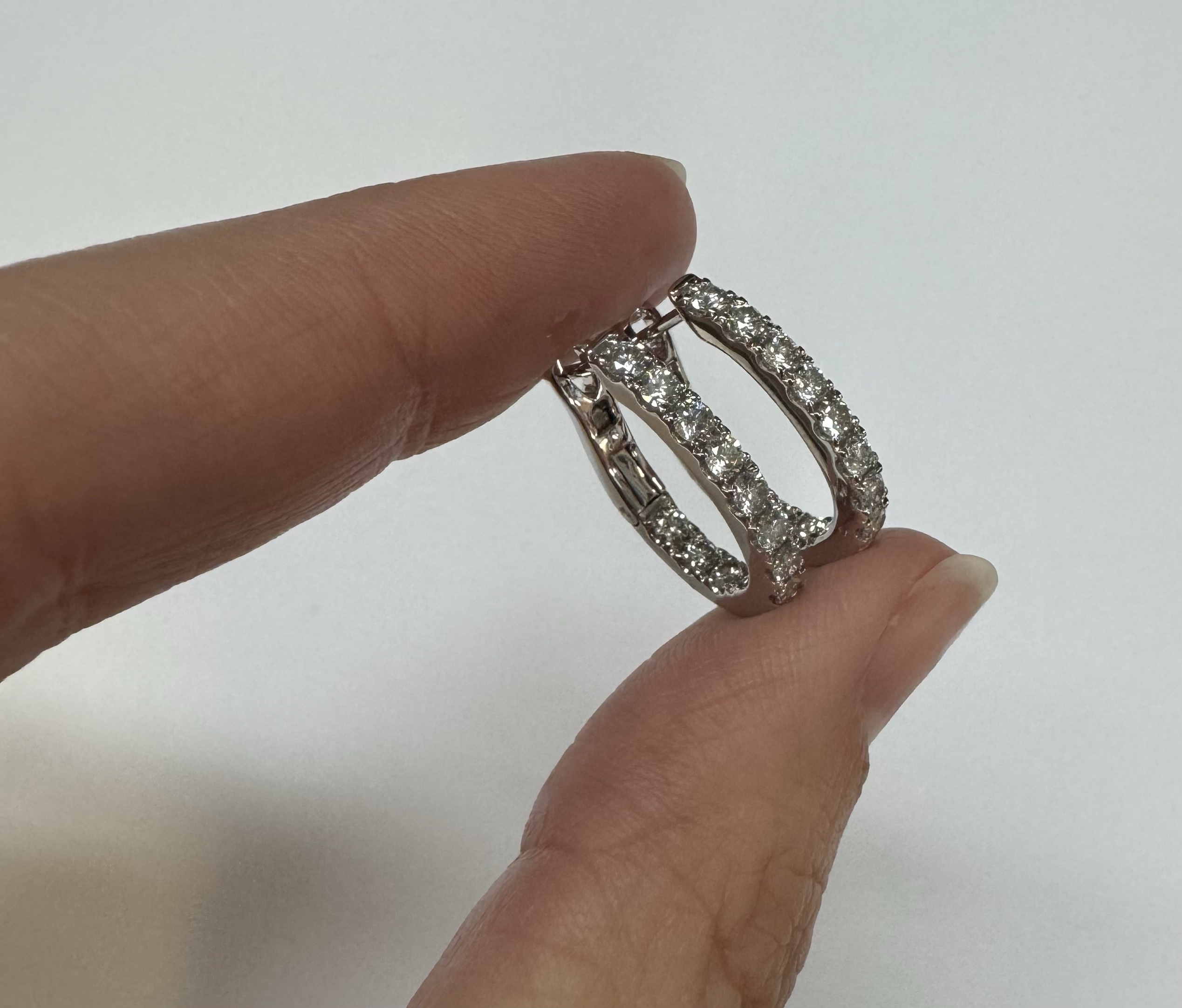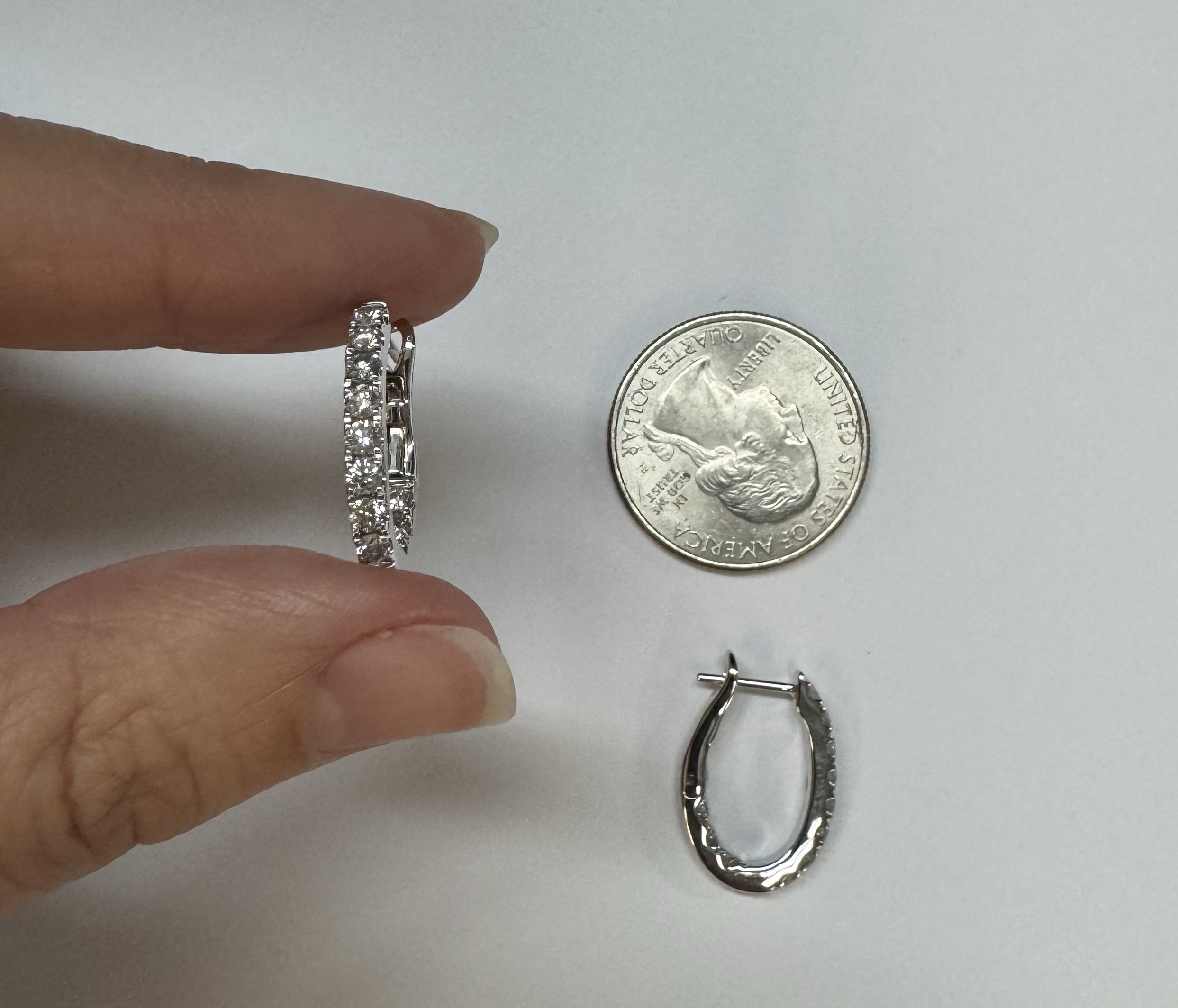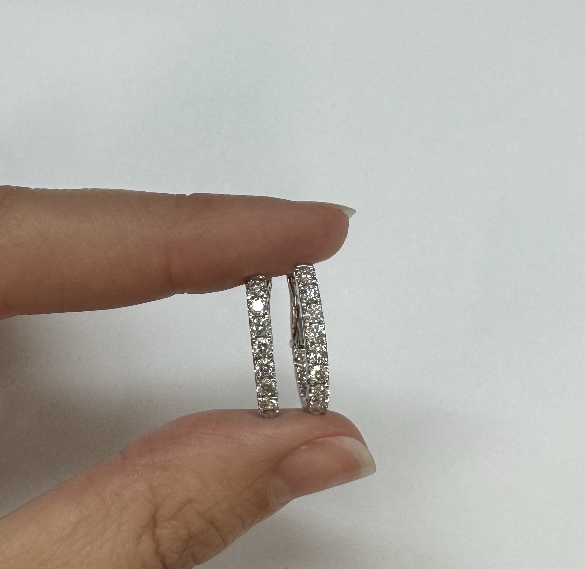 14k white gold genuine 1.03 cttw Round Brilliant Cut diamond “inside out” oval-shaped hoop earrings. These diamonds average H in color and SI1-SI2 in clarity. These diamonds are nicely proportioned and well finished. These earrings measure 2.8 mm x 19.3 mm in size. These earrings have an entire weight of 4.9 grams.