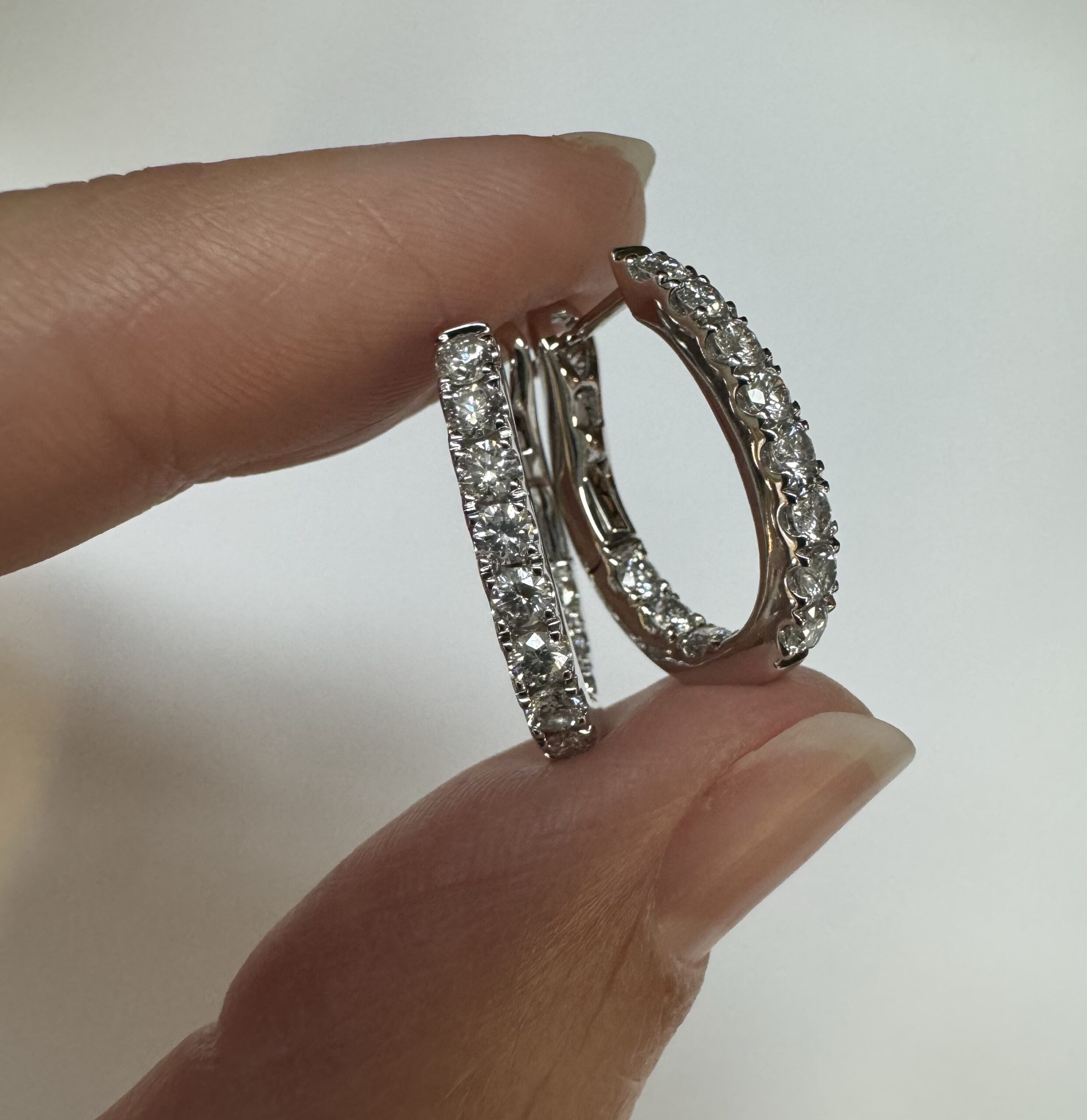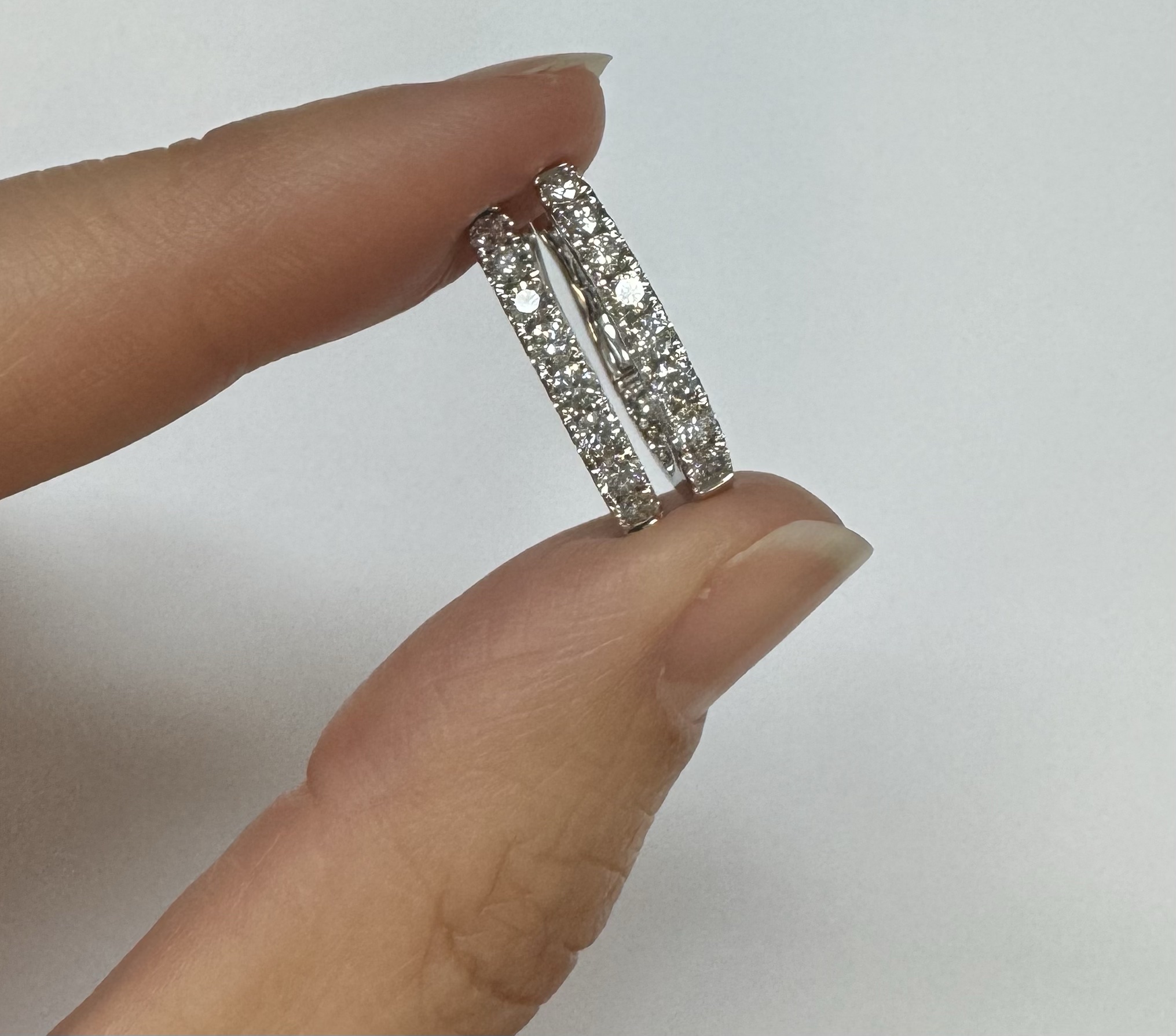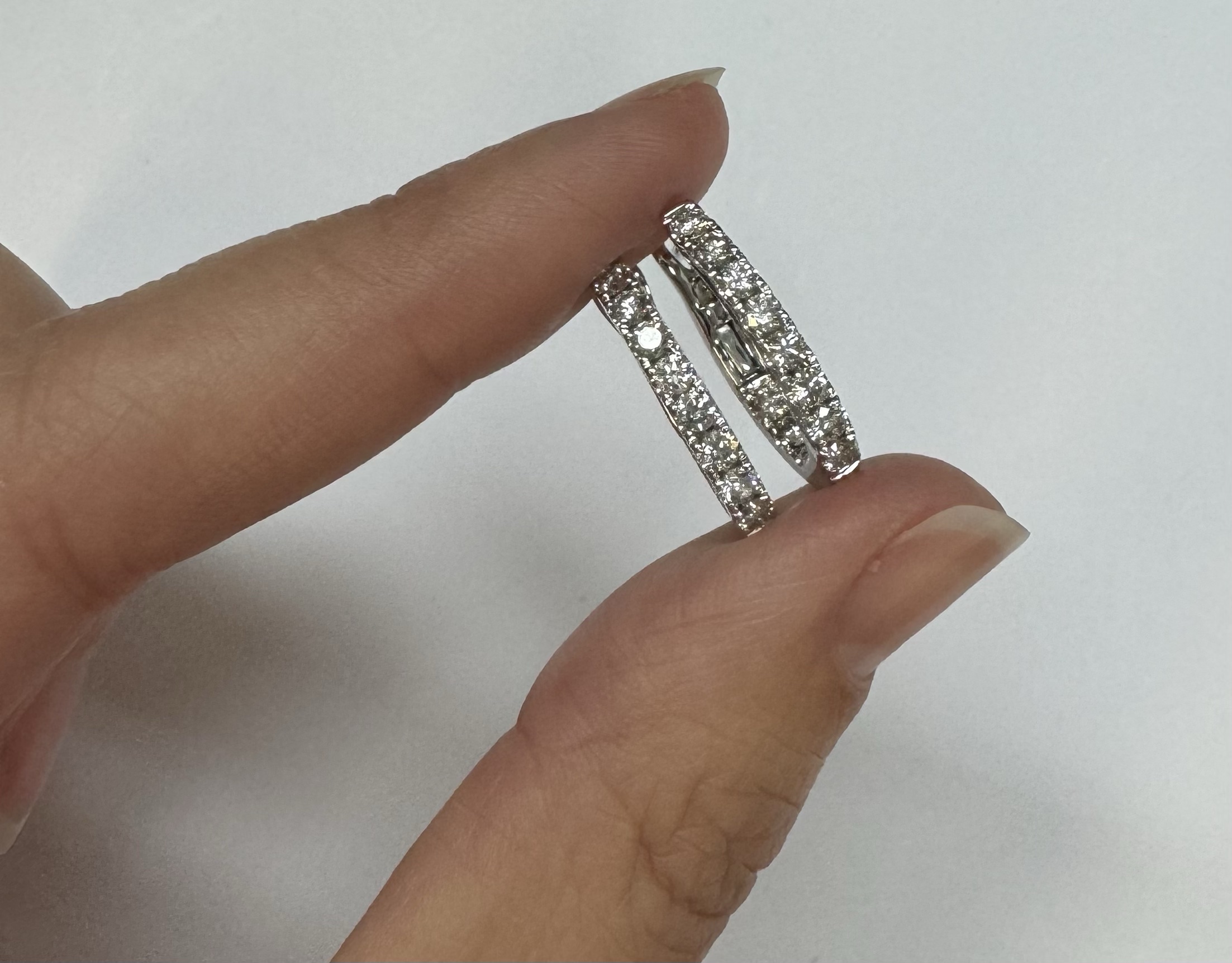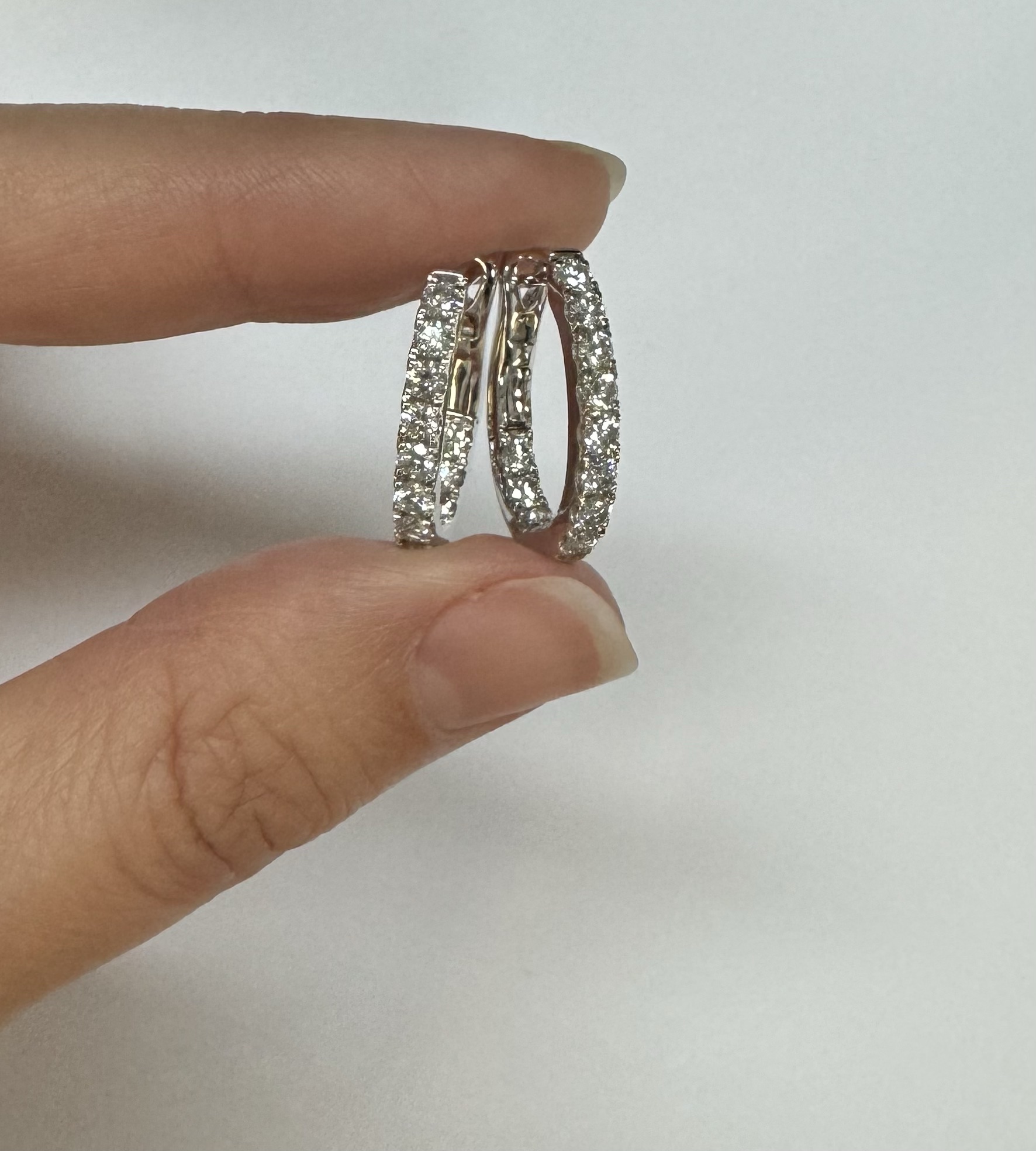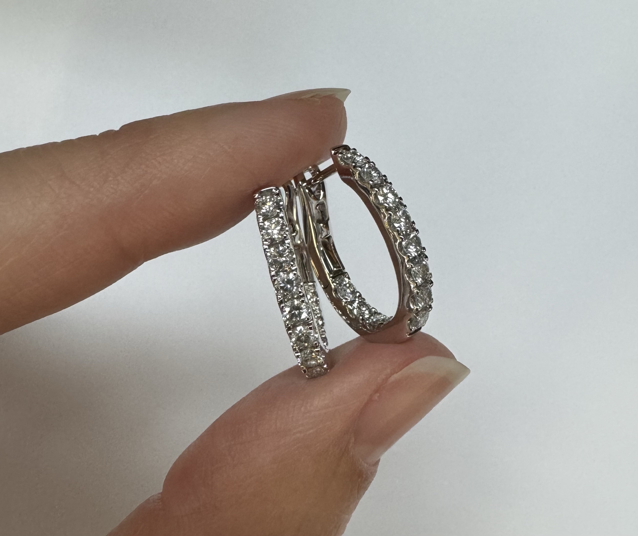 14k white gold genuine 1.03 cttw Round Brilliant Cut diamond “inside out” oval-shaped hoop earrings. These diamonds average H in color and SI1-SI2 in clarity. These diamonds are nicely proportioned and well finished. These earrings measure 2.8 mm x 19.3 mm in size. These earrings have an entire weight of 4.9 grams.