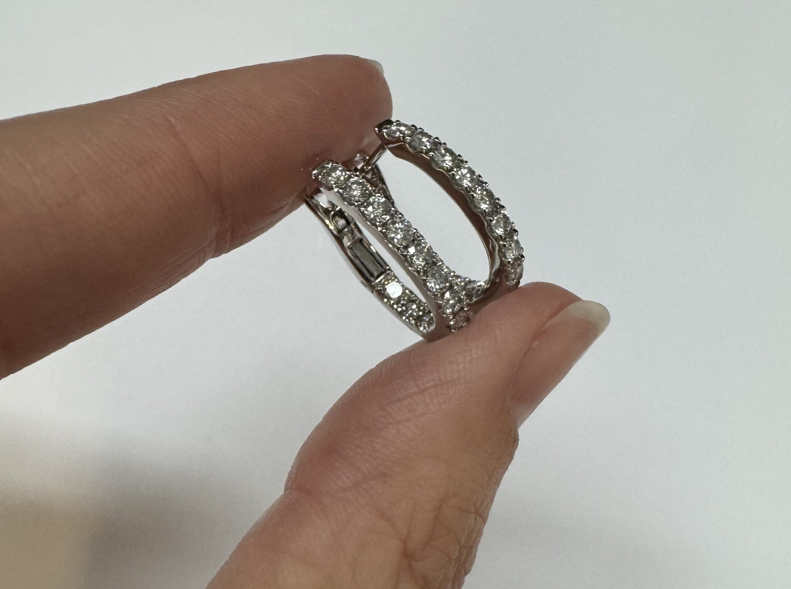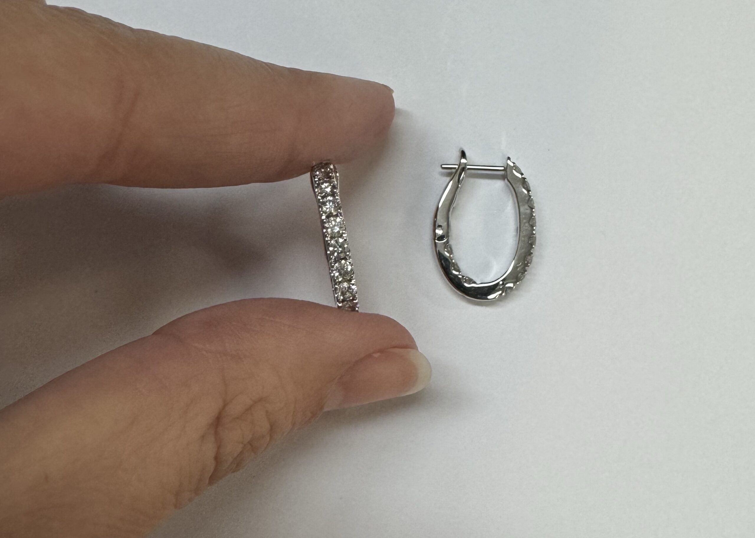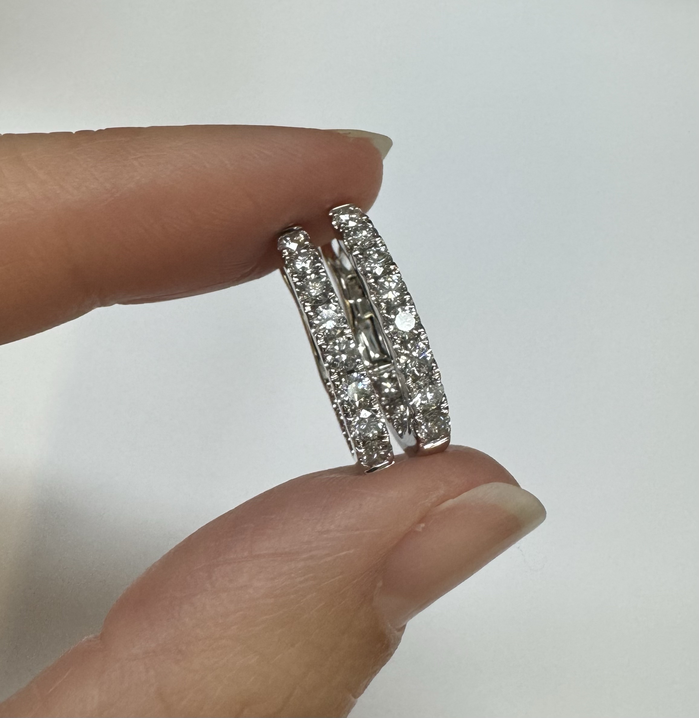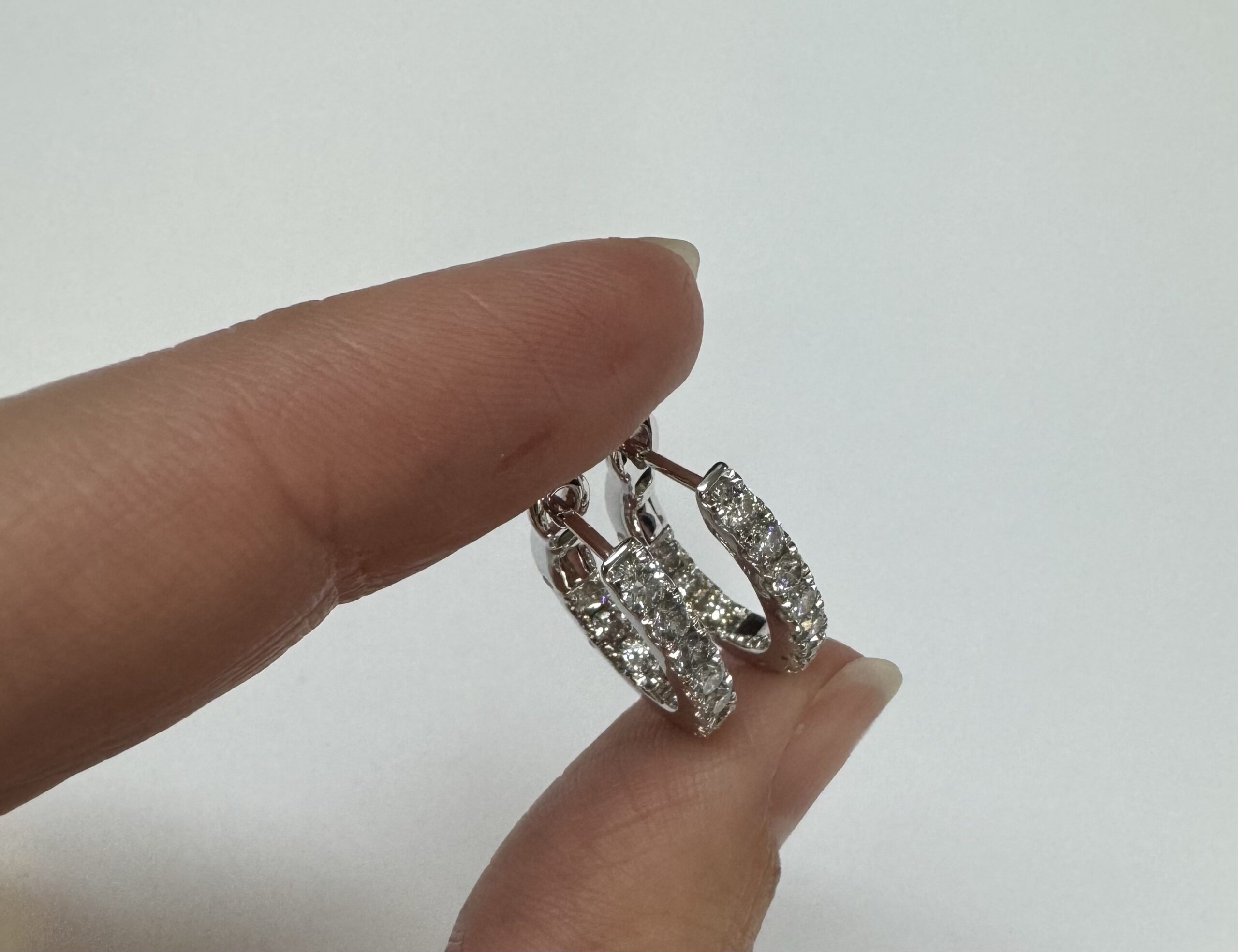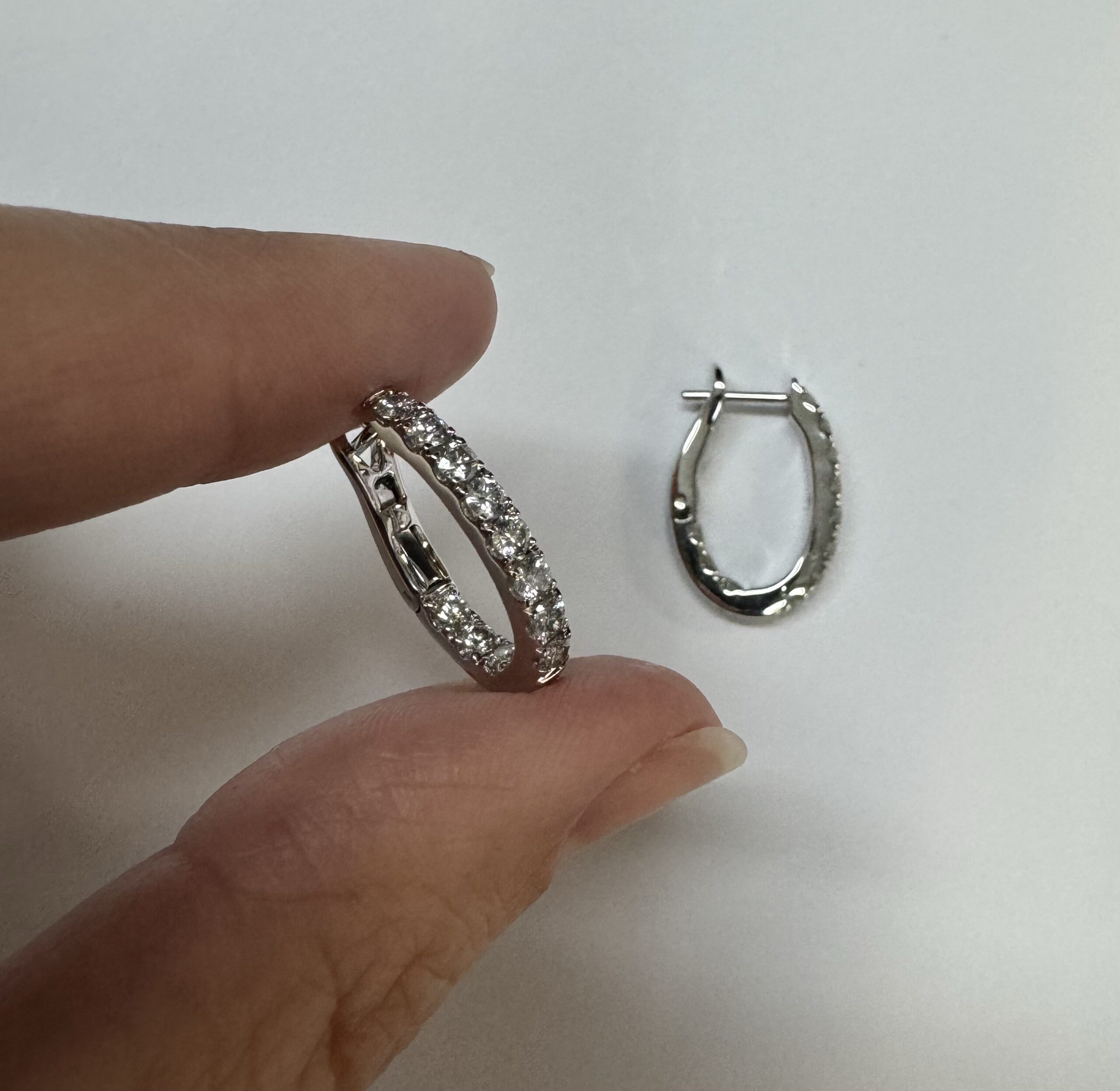 14k white gold genuine 1.03 cttw Round Brilliant Cut diamond “inside out” oval-shaped hoop earrings. These diamonds average H in color and SI1-SI2 in clarity. These diamonds are nicely proportioned and well finished. These earrings measure 2.8 mm x 19.3 mm in size. These earrings have an entire weight of 4.9 grams.