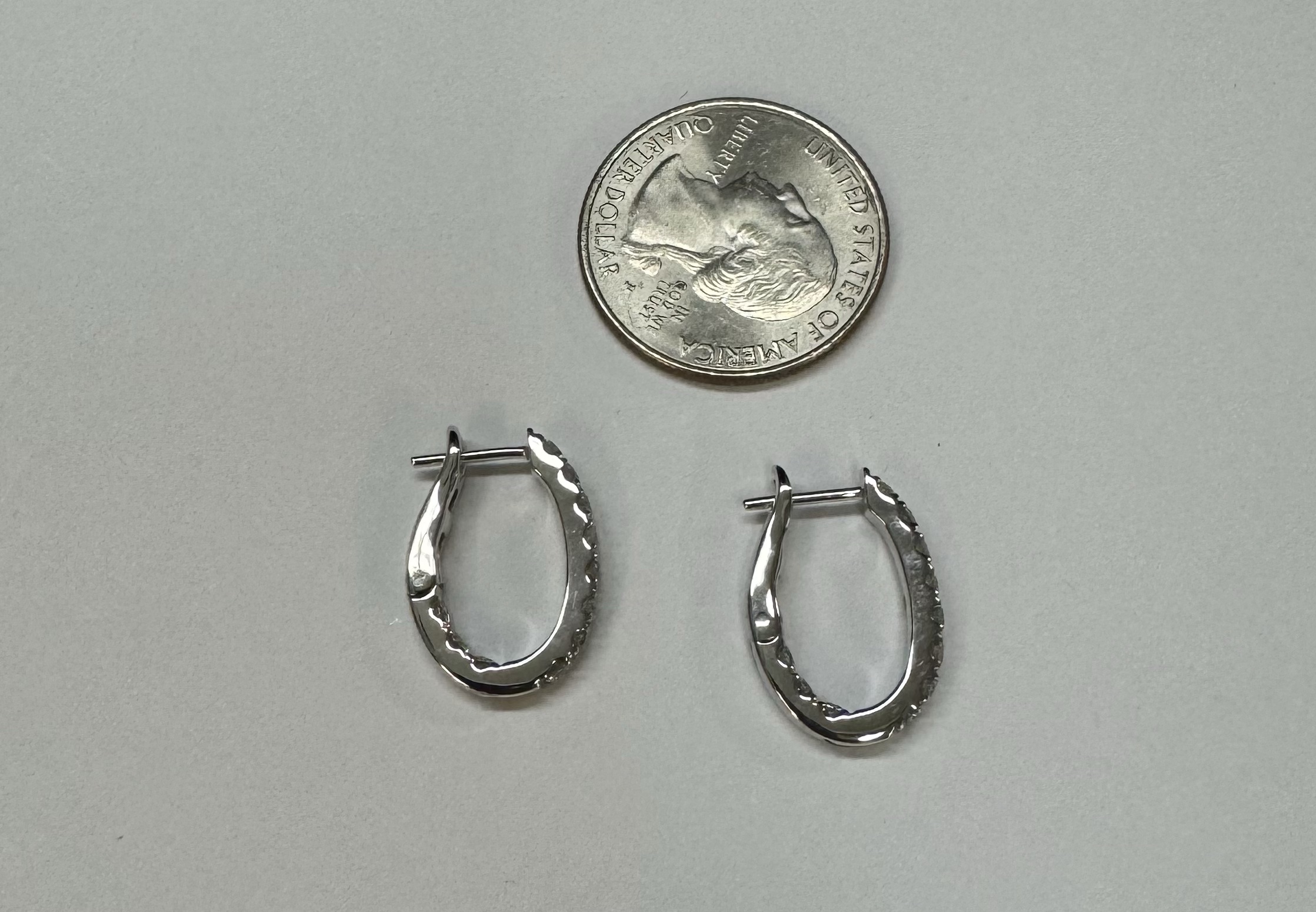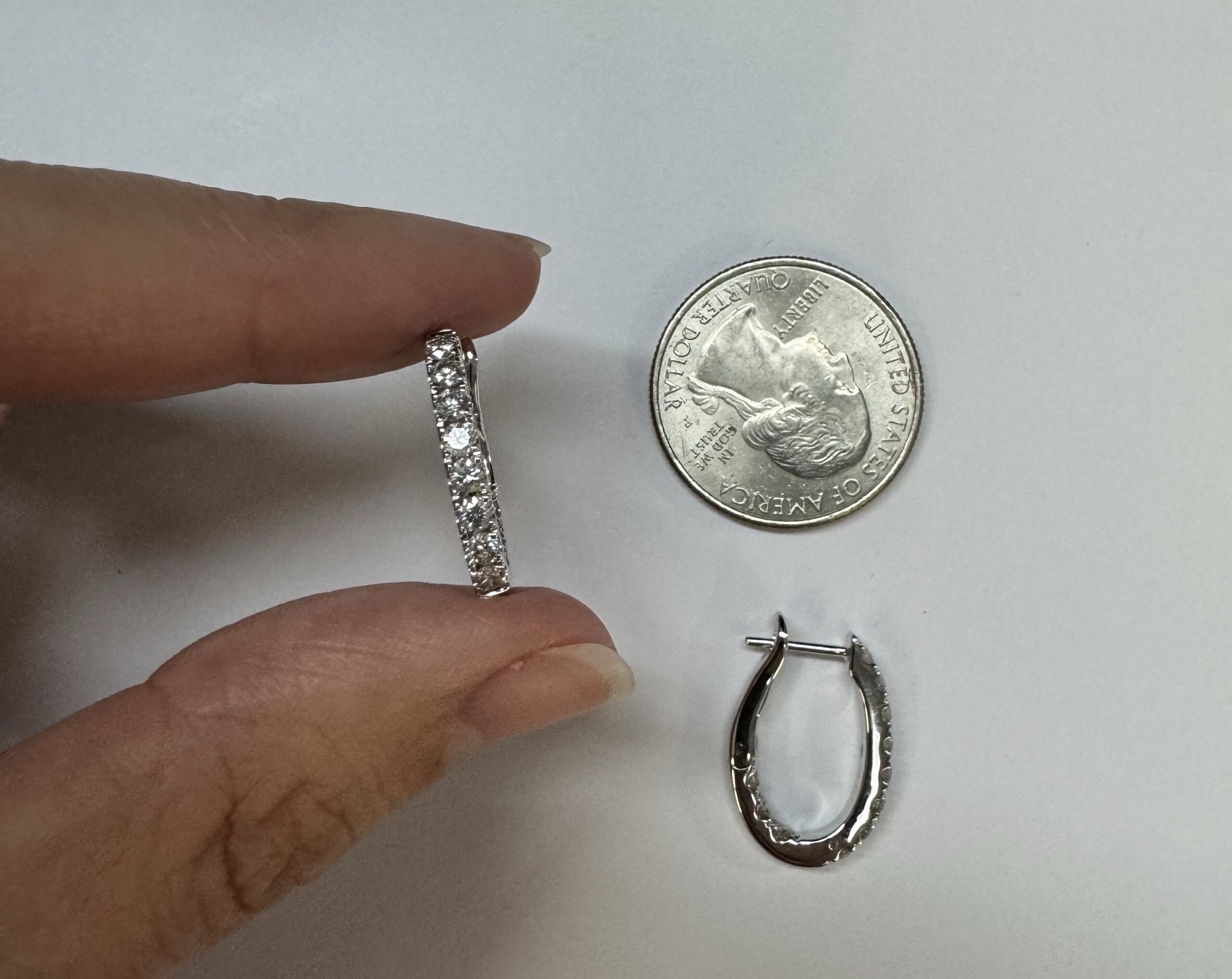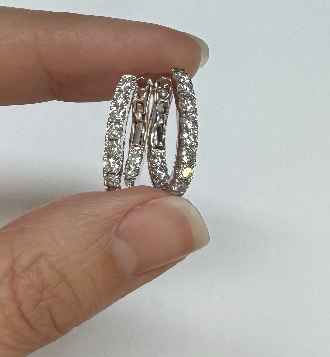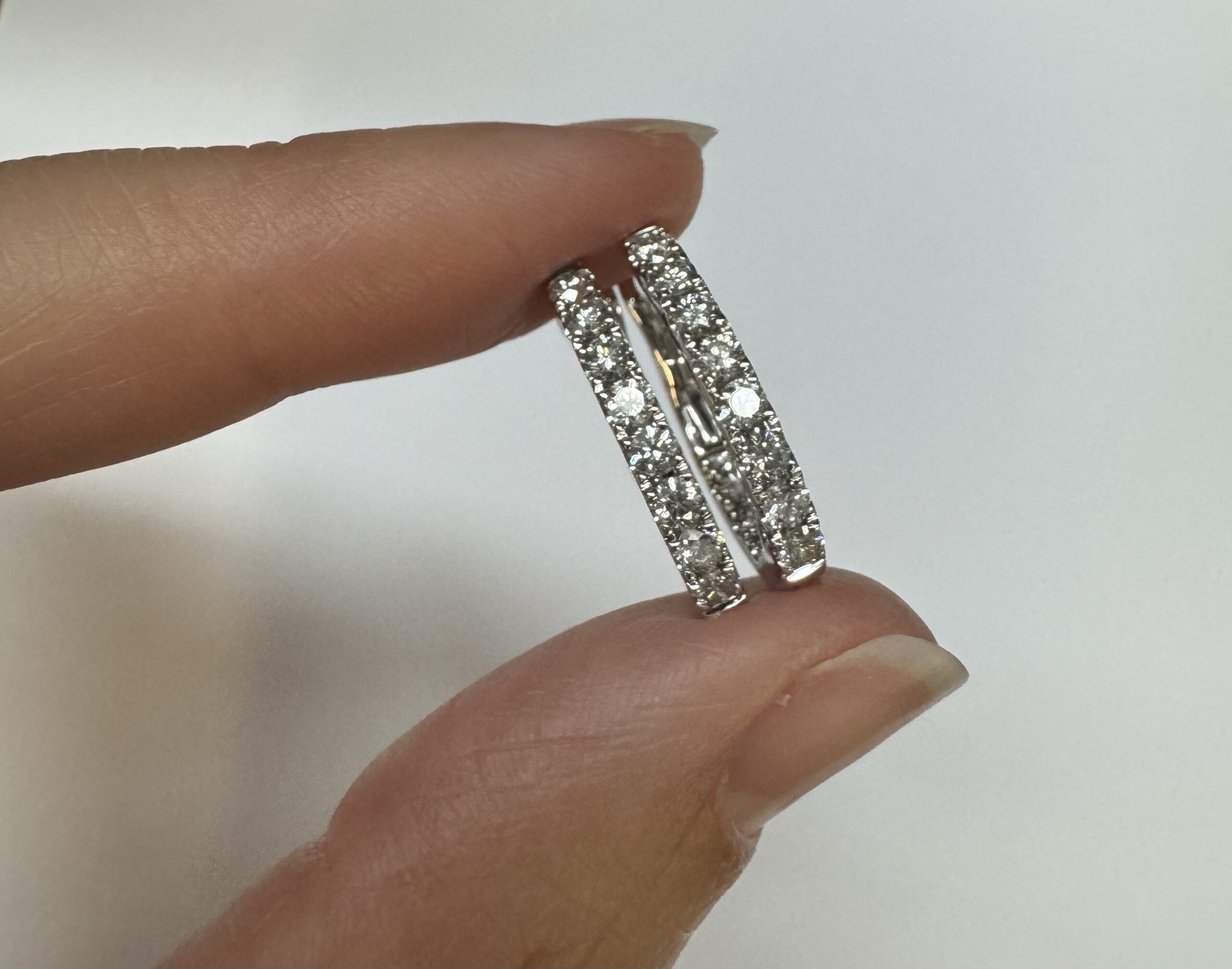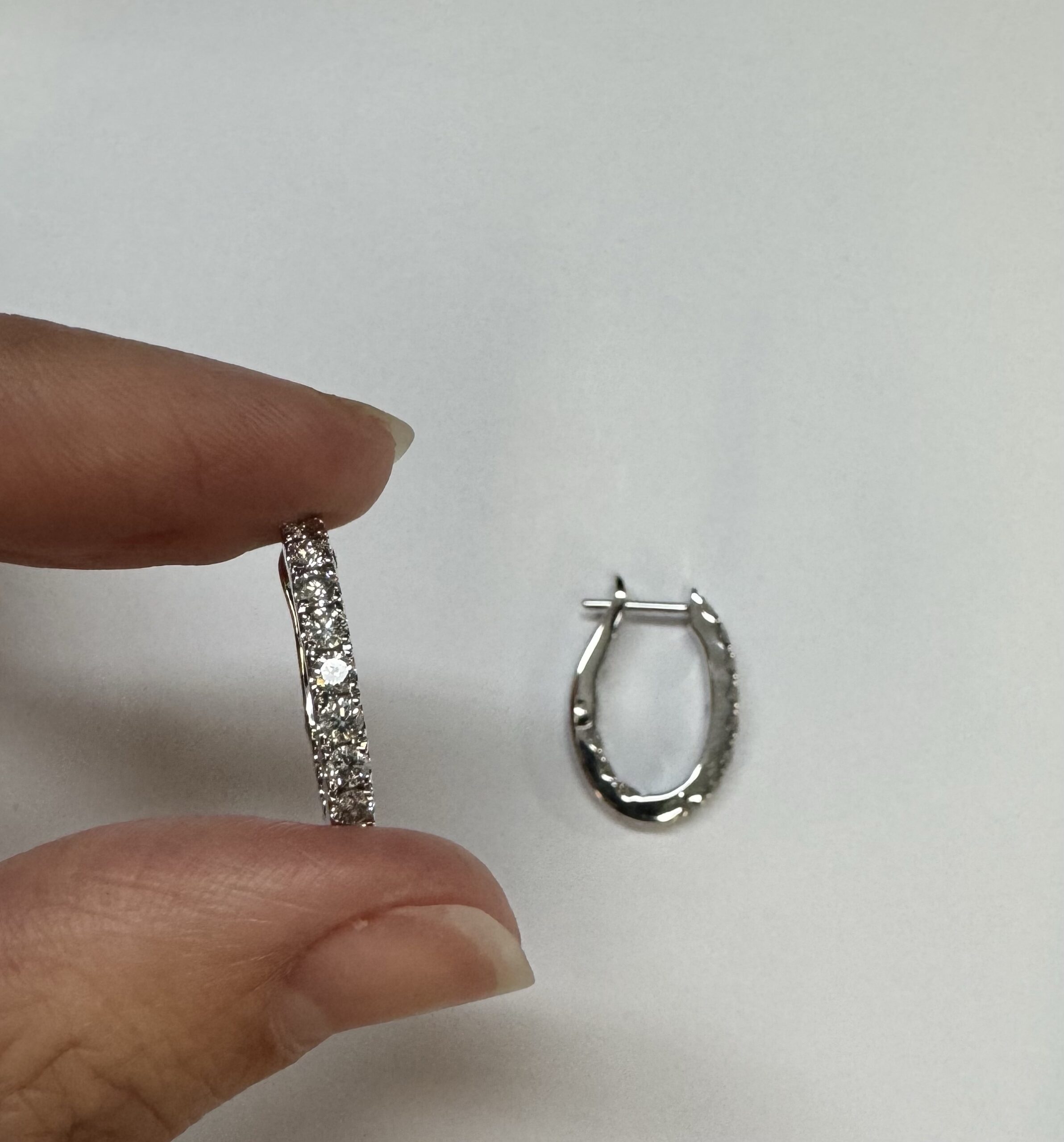 14k white gold genuine 1.03 cttw Round Brilliant Cut diamond “inside out” oval-shaped hoop earrings. These diamonds average H in color and SI1-SI2 in clarity. These diamonds are nicely proportioned and well finished. These earrings measure 2.8 mm x 19.3 mm in size. These earrings have an entire weight of 4.9 grams.