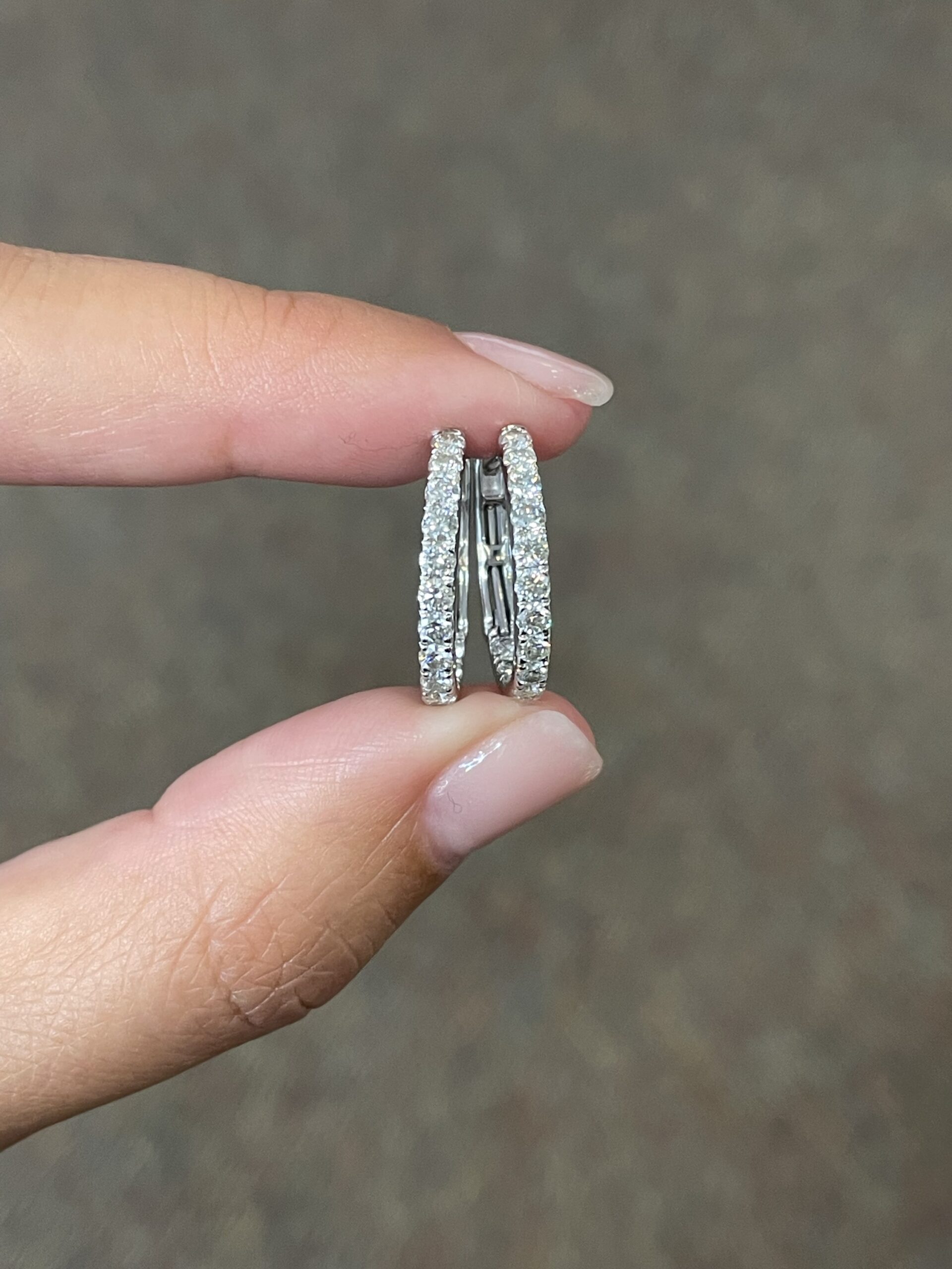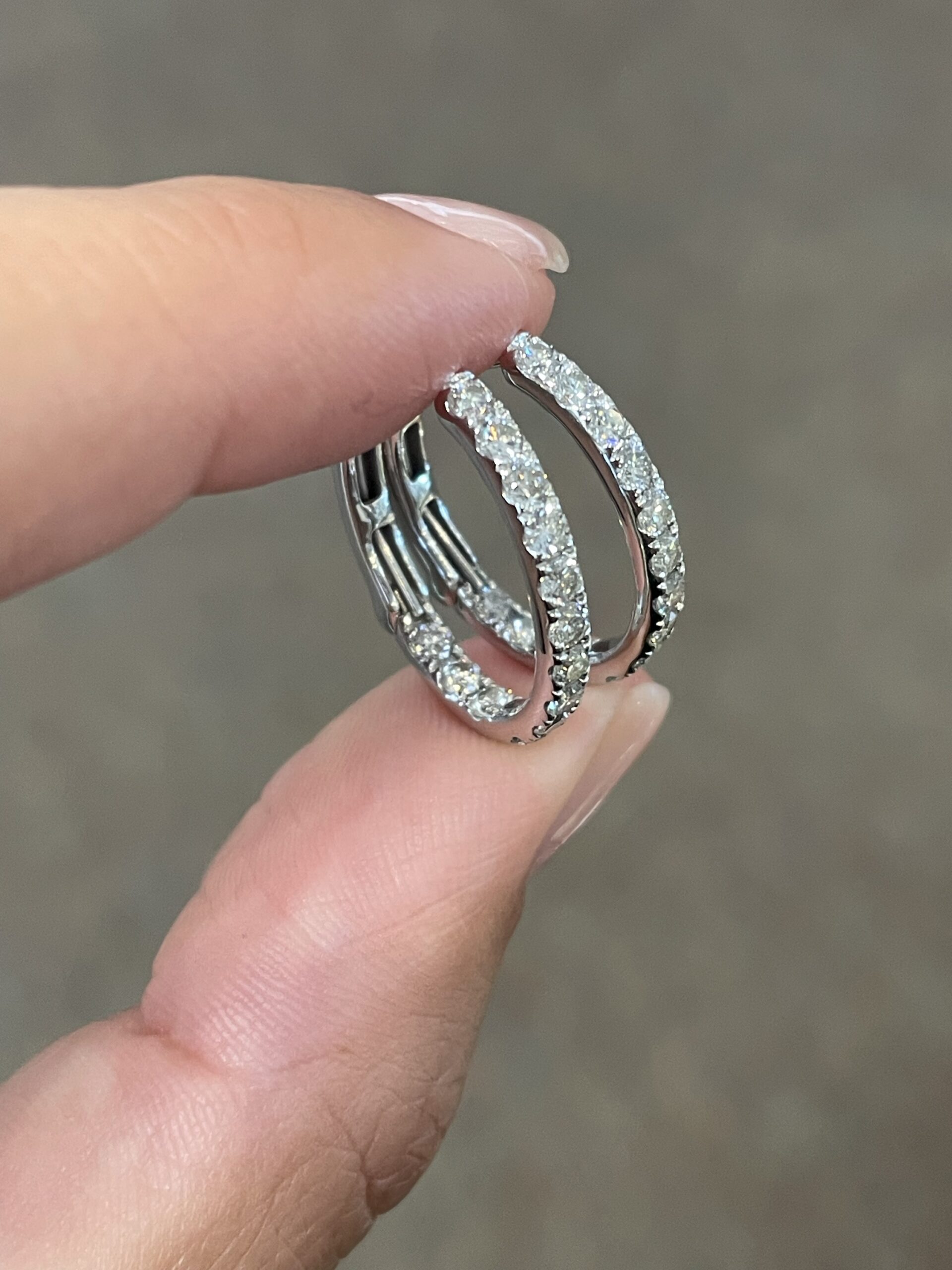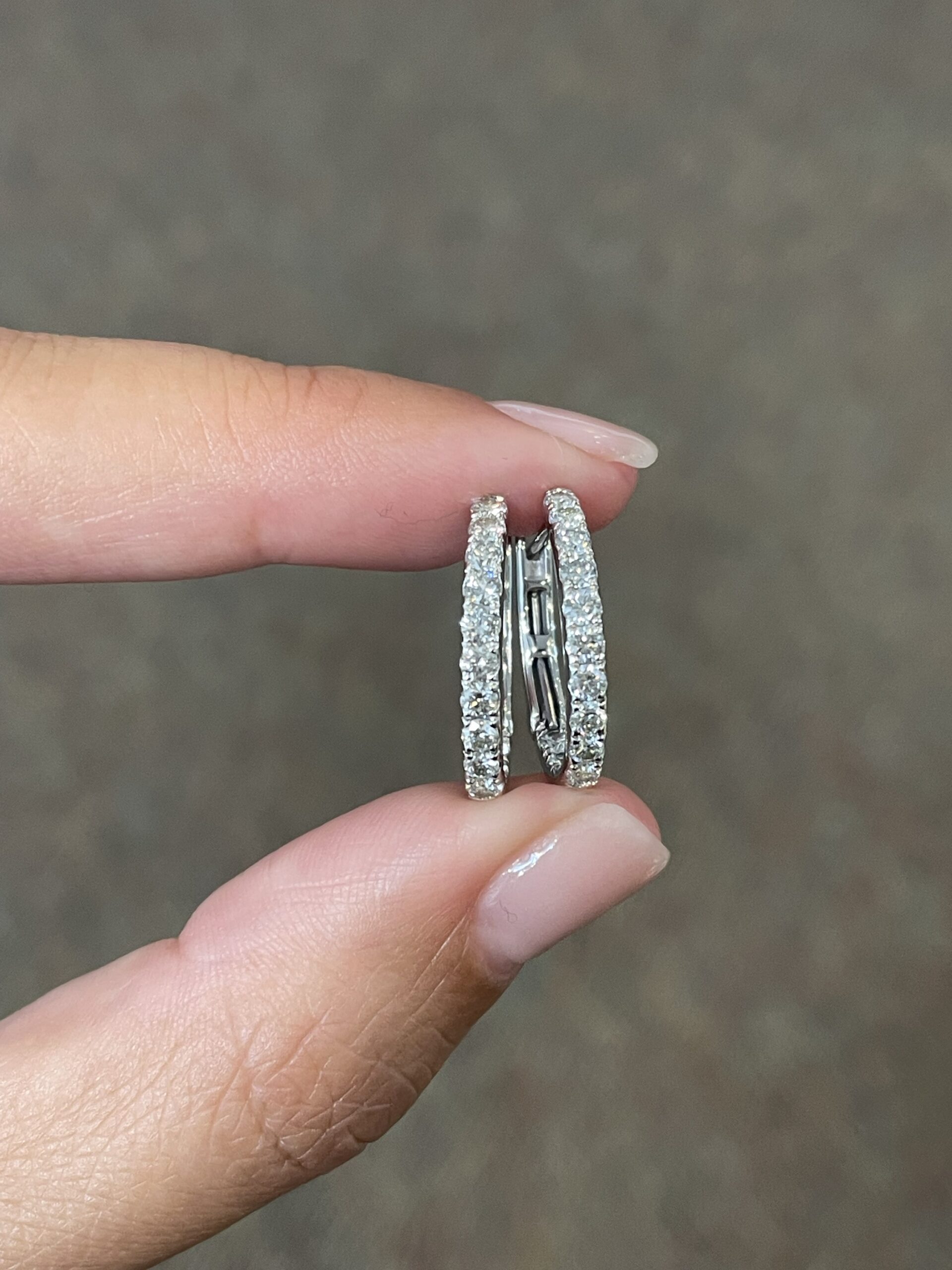 14k white gold genuine 1.04 Cttw Round Brilliant Cut diamond “inside out” prong set hoop earrings. These diamonds average H-I in color, and SI2 in clarity. These diamonds are nicely proportioned and well finished. These earrings are also available in 14k yellow gold. If you would prefer 14k yellow gold please make note in the comments section at checkout.