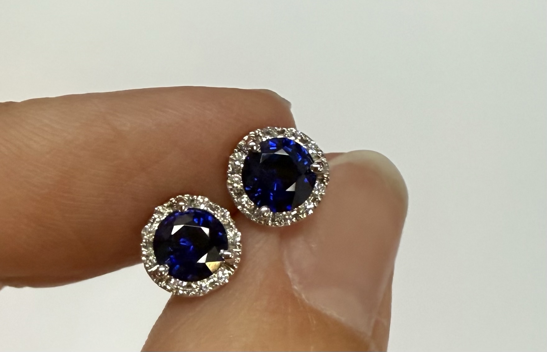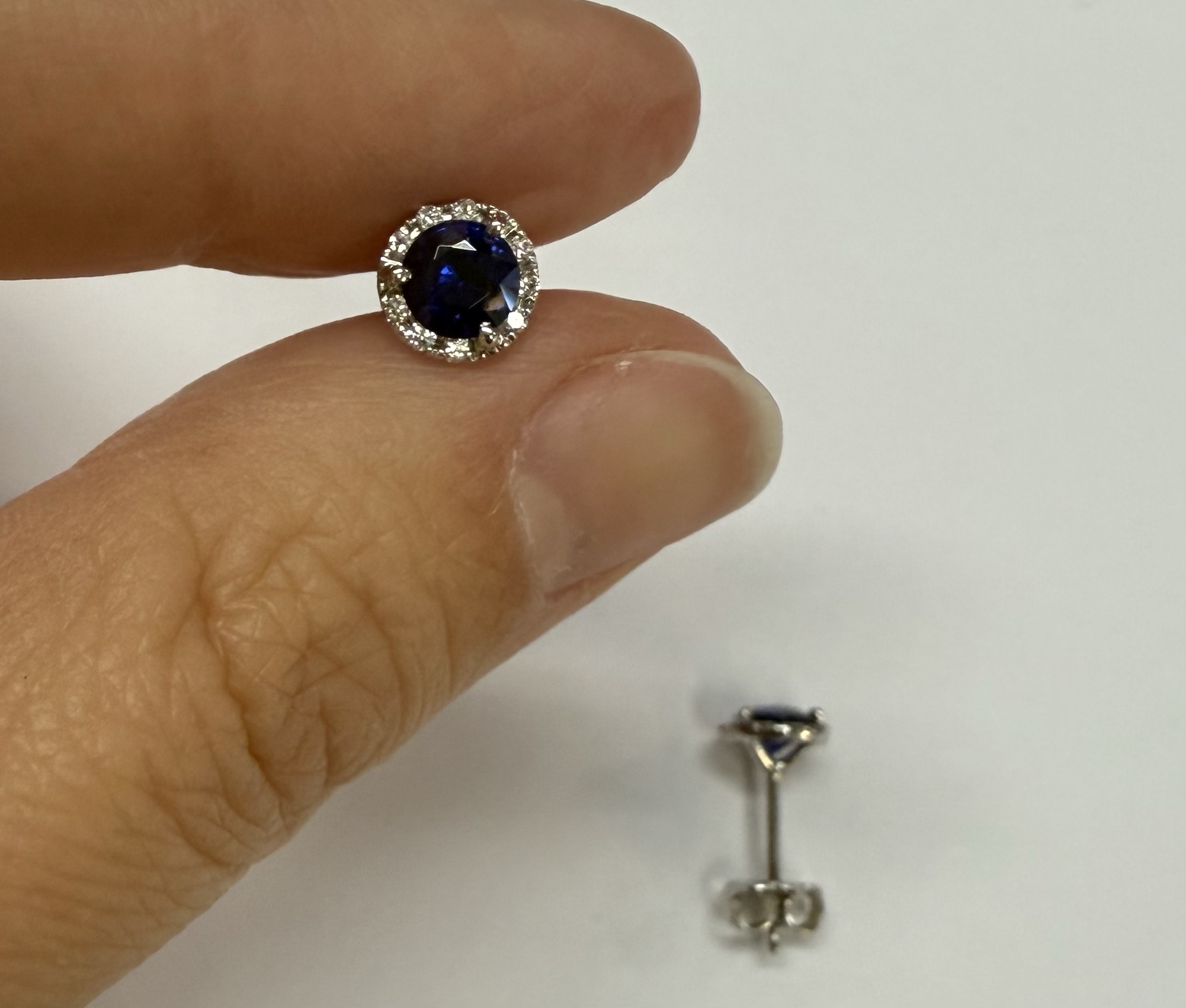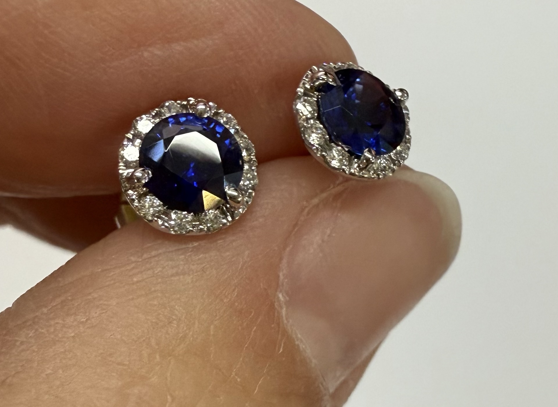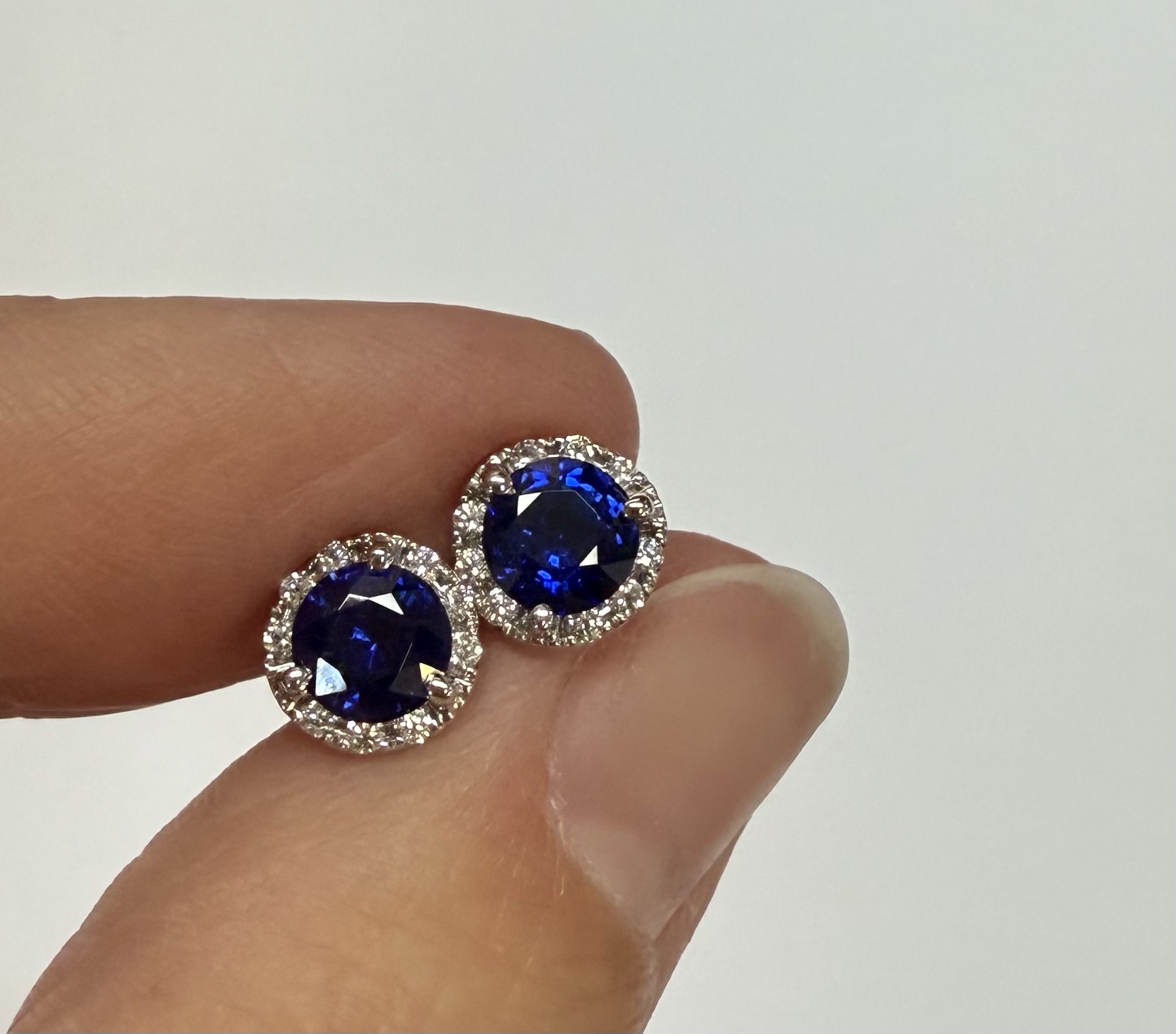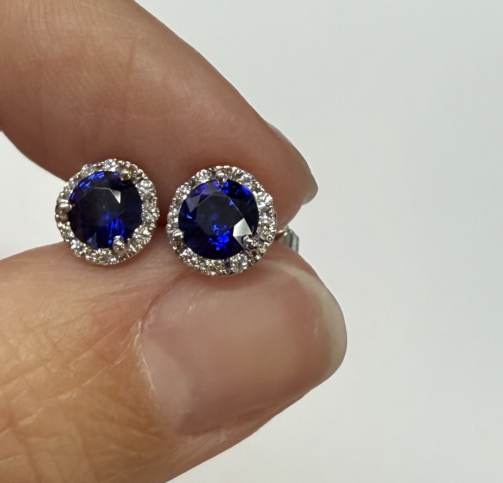 14k white gold genuine round 1.06 cttw Ceylon Sapphire & .12 cttw genuine Round Brilliant Cut diamond halo stud earrings. These diamonds average G in color and SI1 in clarity. These earrings have an entire weight of 1.2 grams.