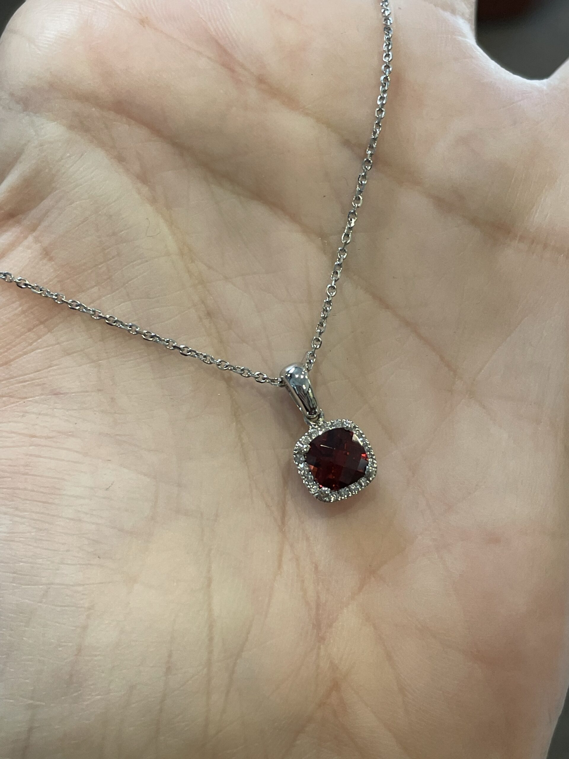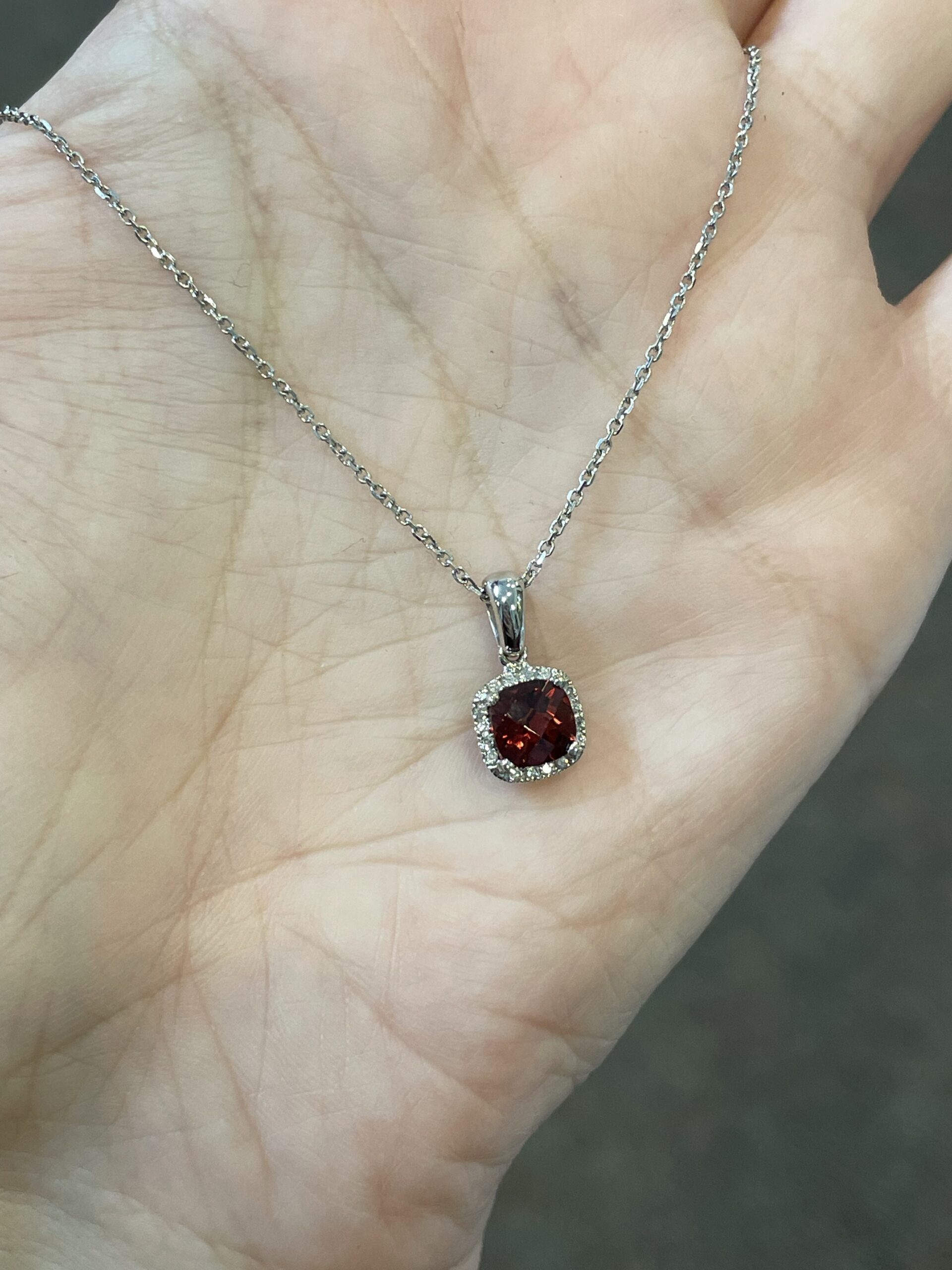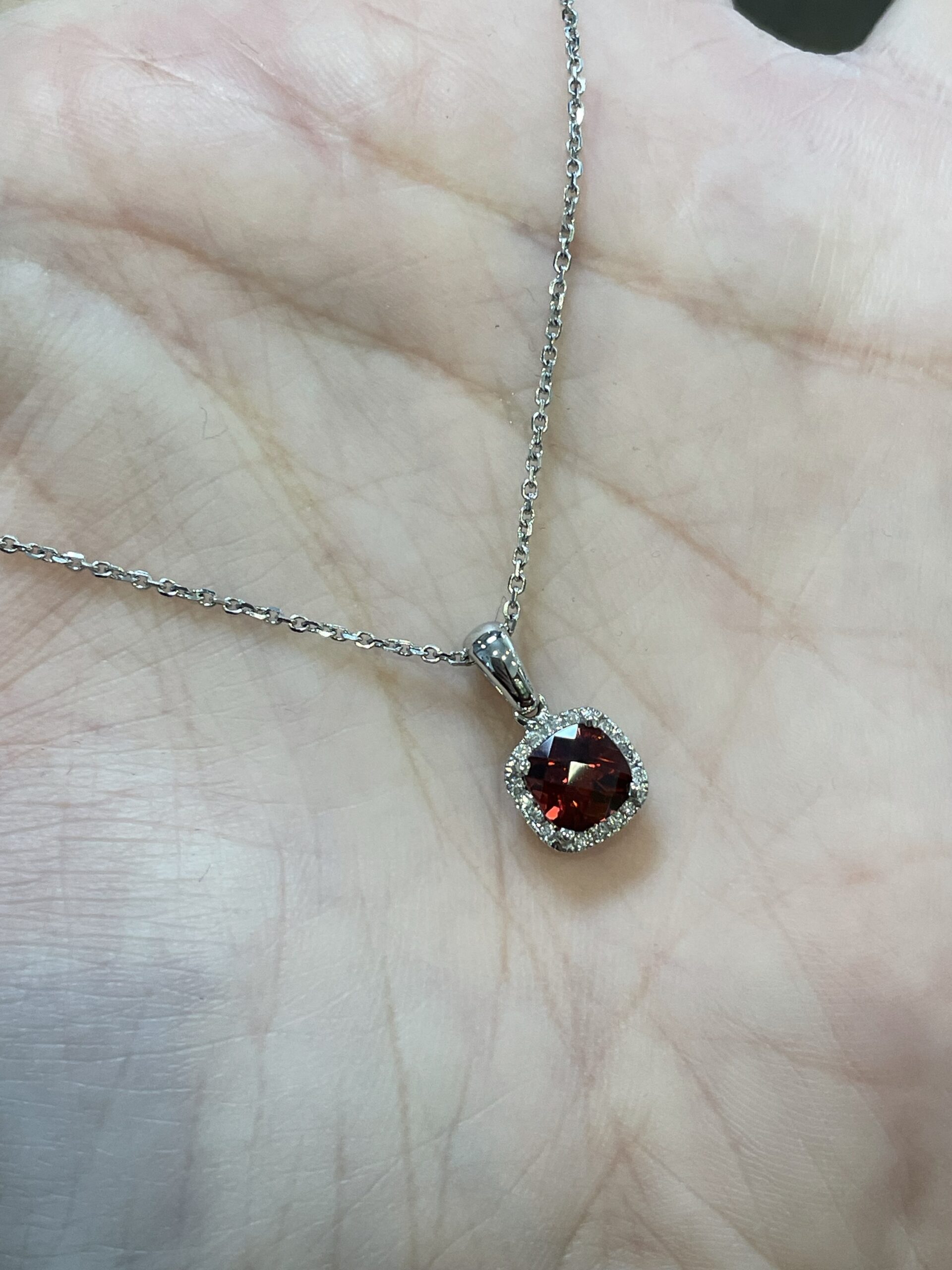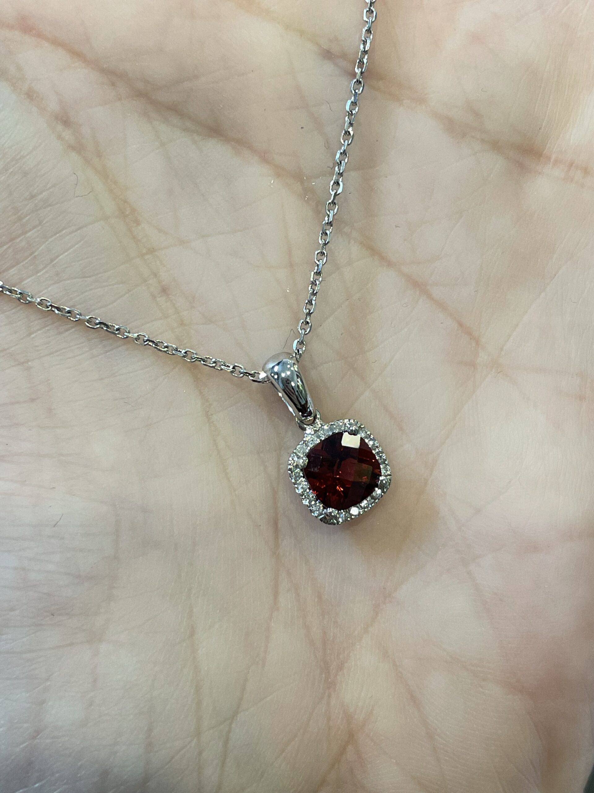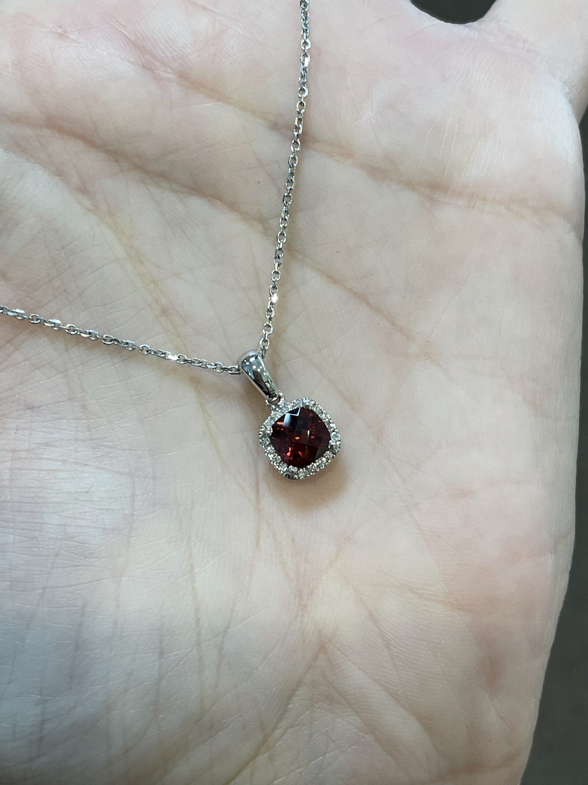 14k white gold genuine cushion shaped, faceted, 1.15 Cttw Garnet (January birthstone) & .08 Cttw genuine Round Brilliant Cut diamond pendant on a 14k white gold 16” forzantina chain. The pendant measures 8 mm in size. The diamonds average H in color and SI in clarity. This piece has an entire weight of 2.6 grams. If you need a longer chain please contact us directly prior to your purchase.