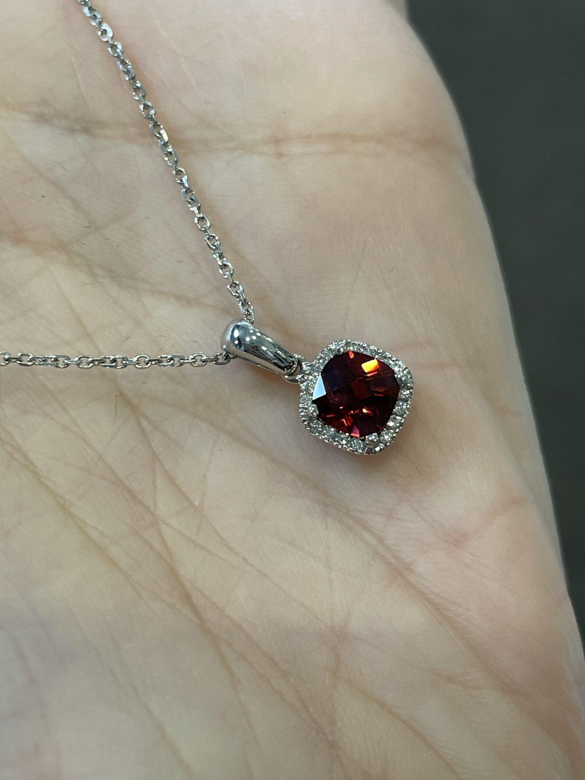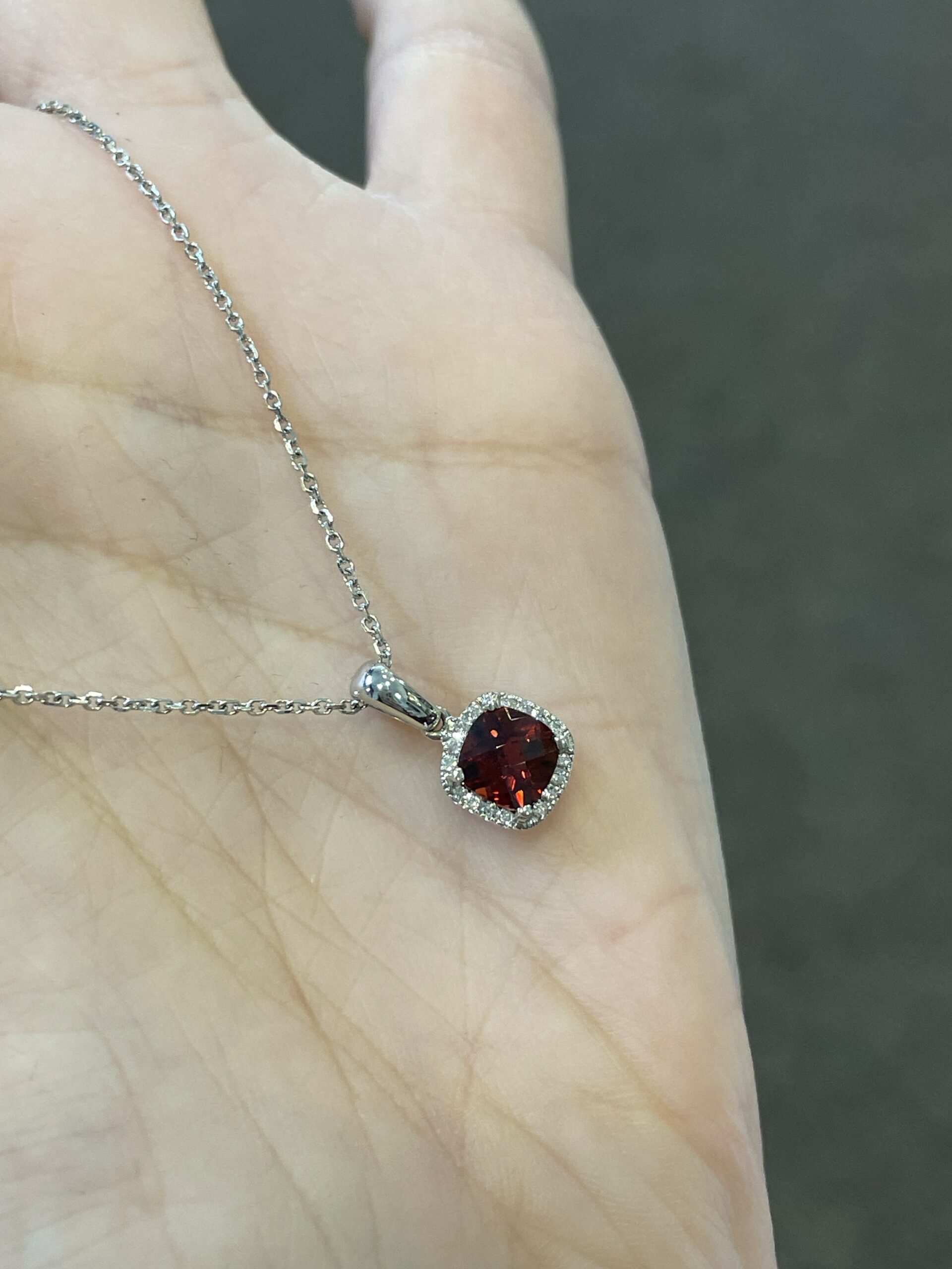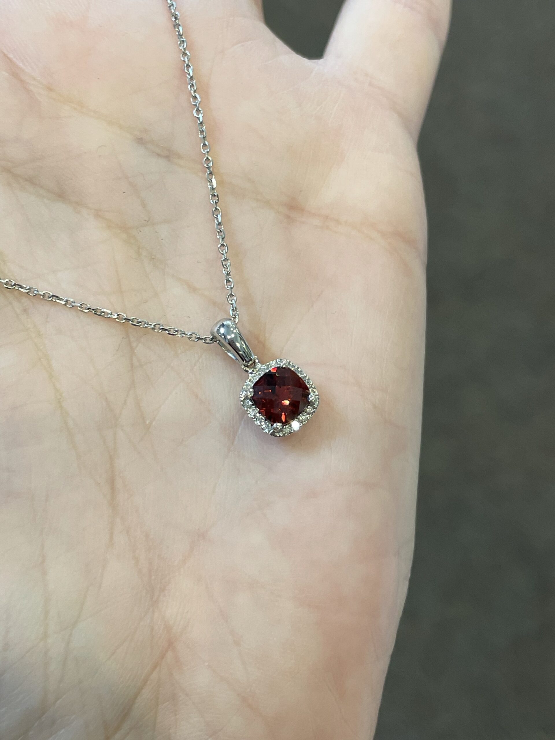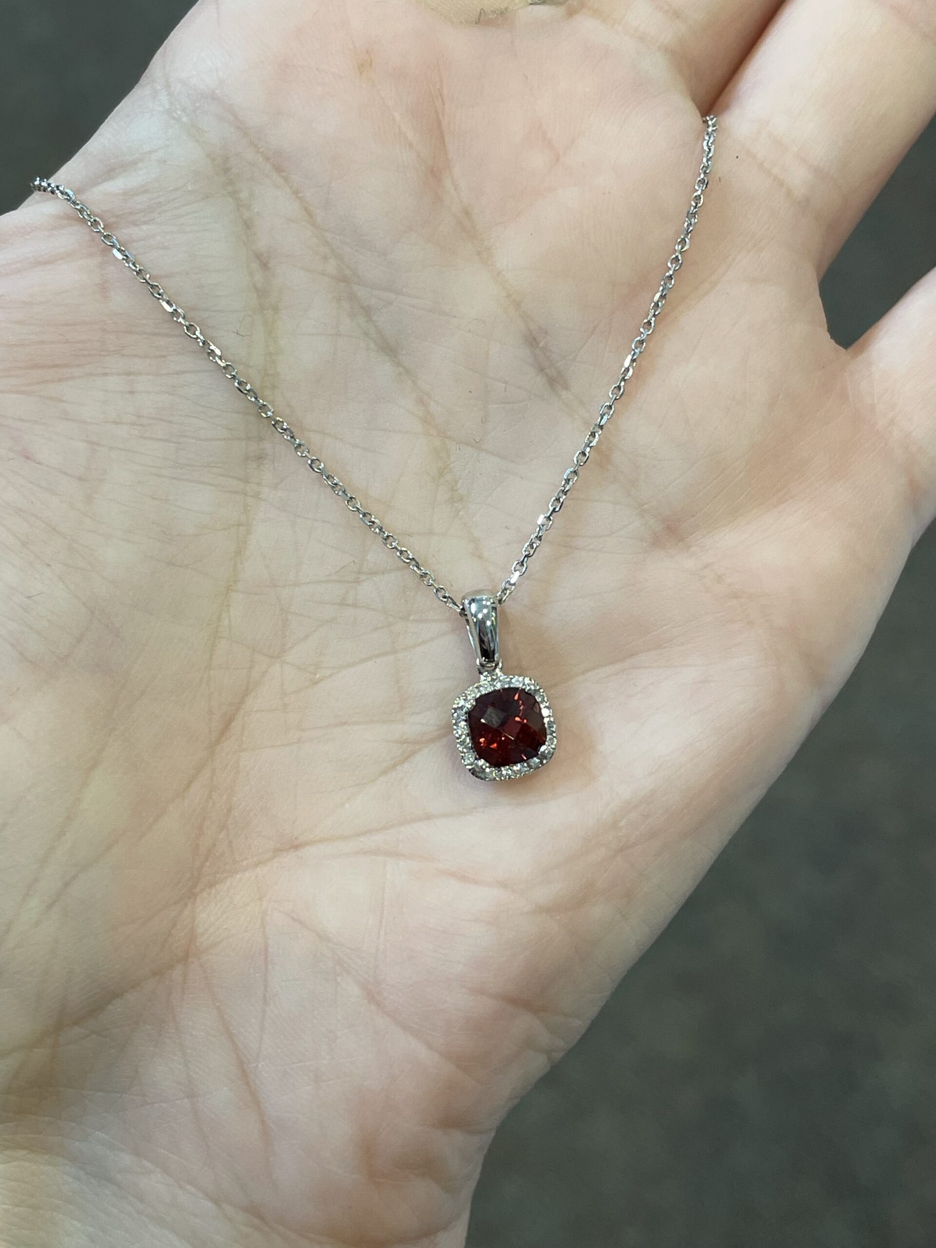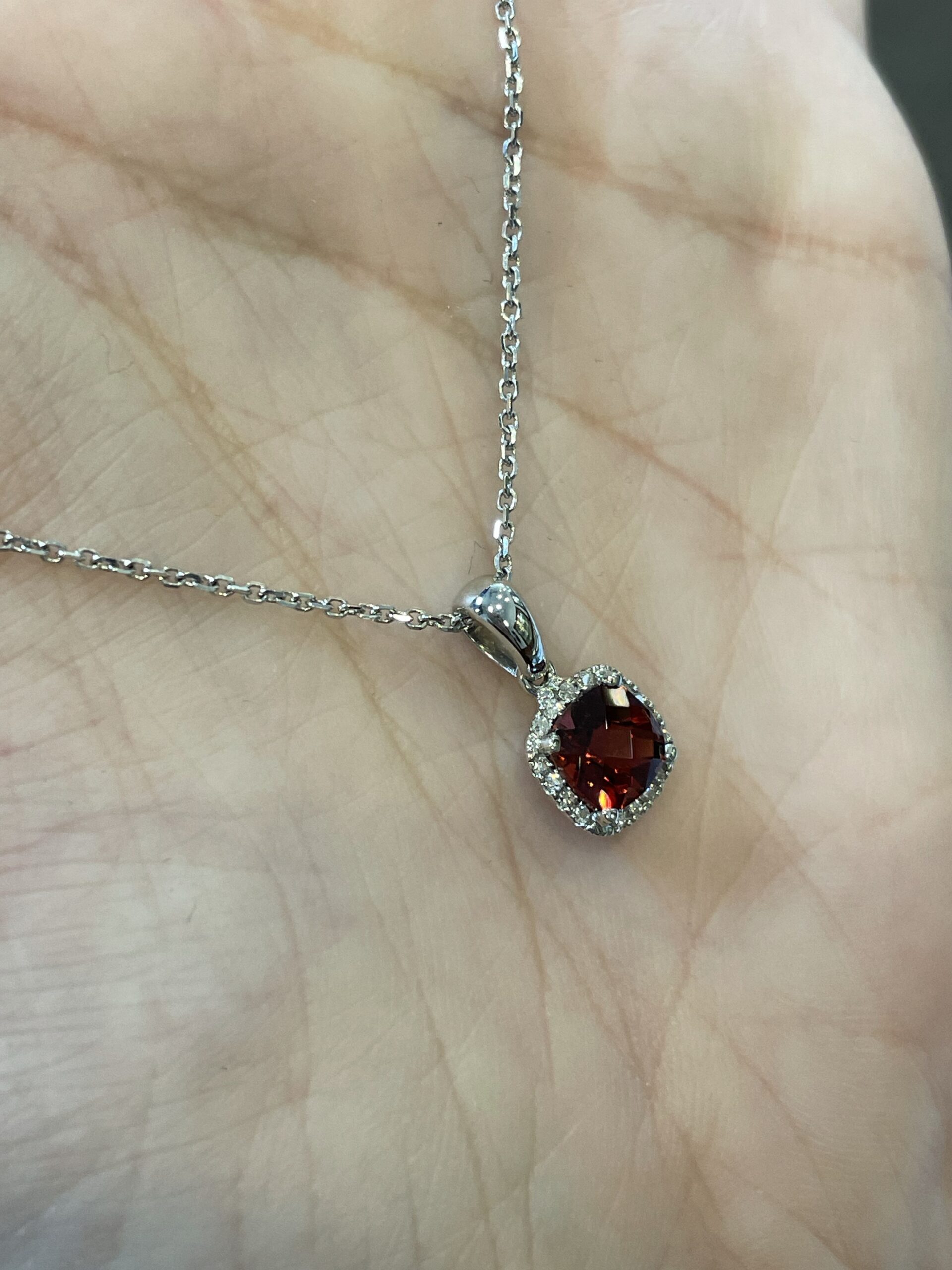 14k white gold genuine cushion shaped, faceted, 1.15 Cttw Garnet (January birthstone) & .08 Cttw genuine Round Brilliant Cut diamond pendant on a 14k white gold 16” forzantina chain. The pendant measures 8 mm in size. The diamonds average H in color and SI in clarity. This piece has an entire weight of 2.6 grams. If you need a longer chain please contact us directly prior to your purchase.