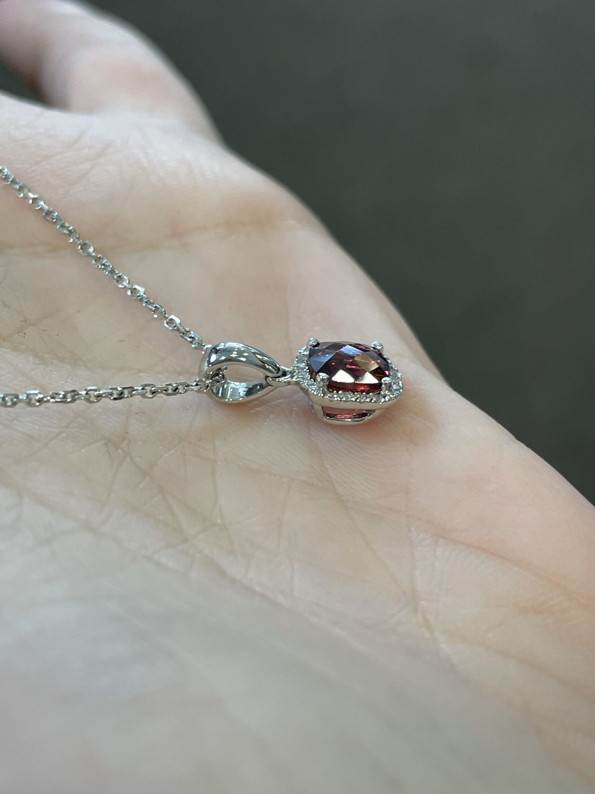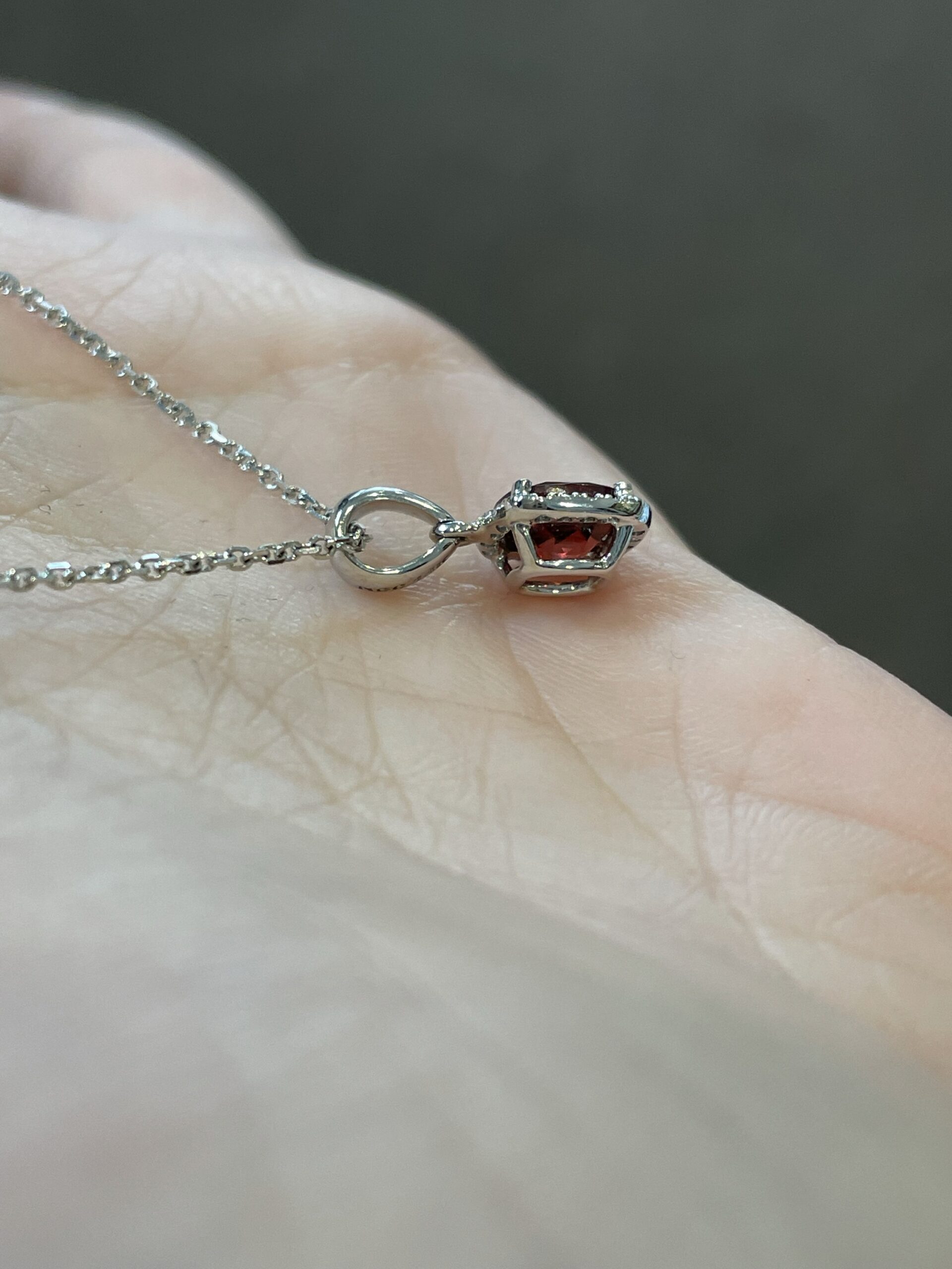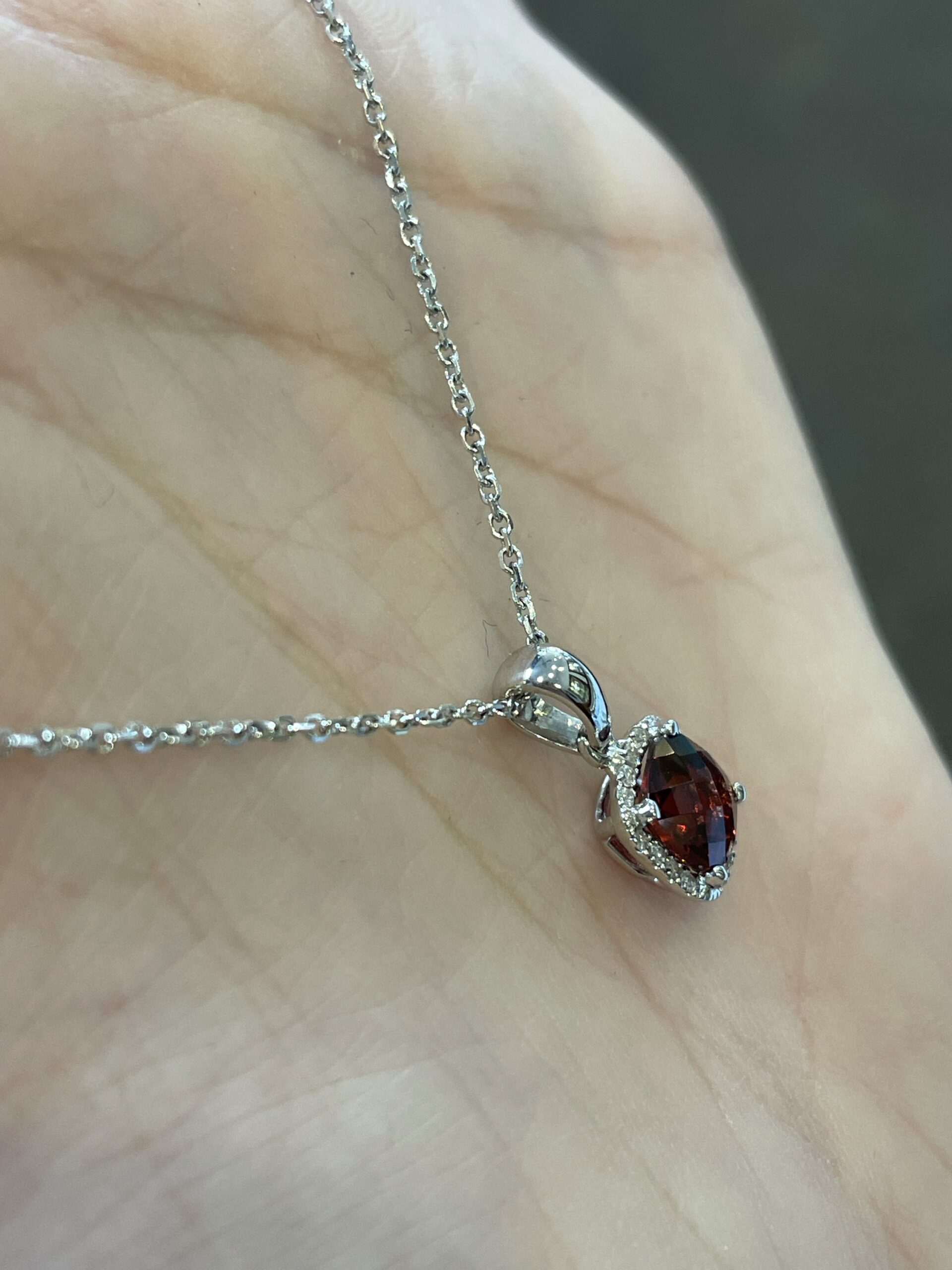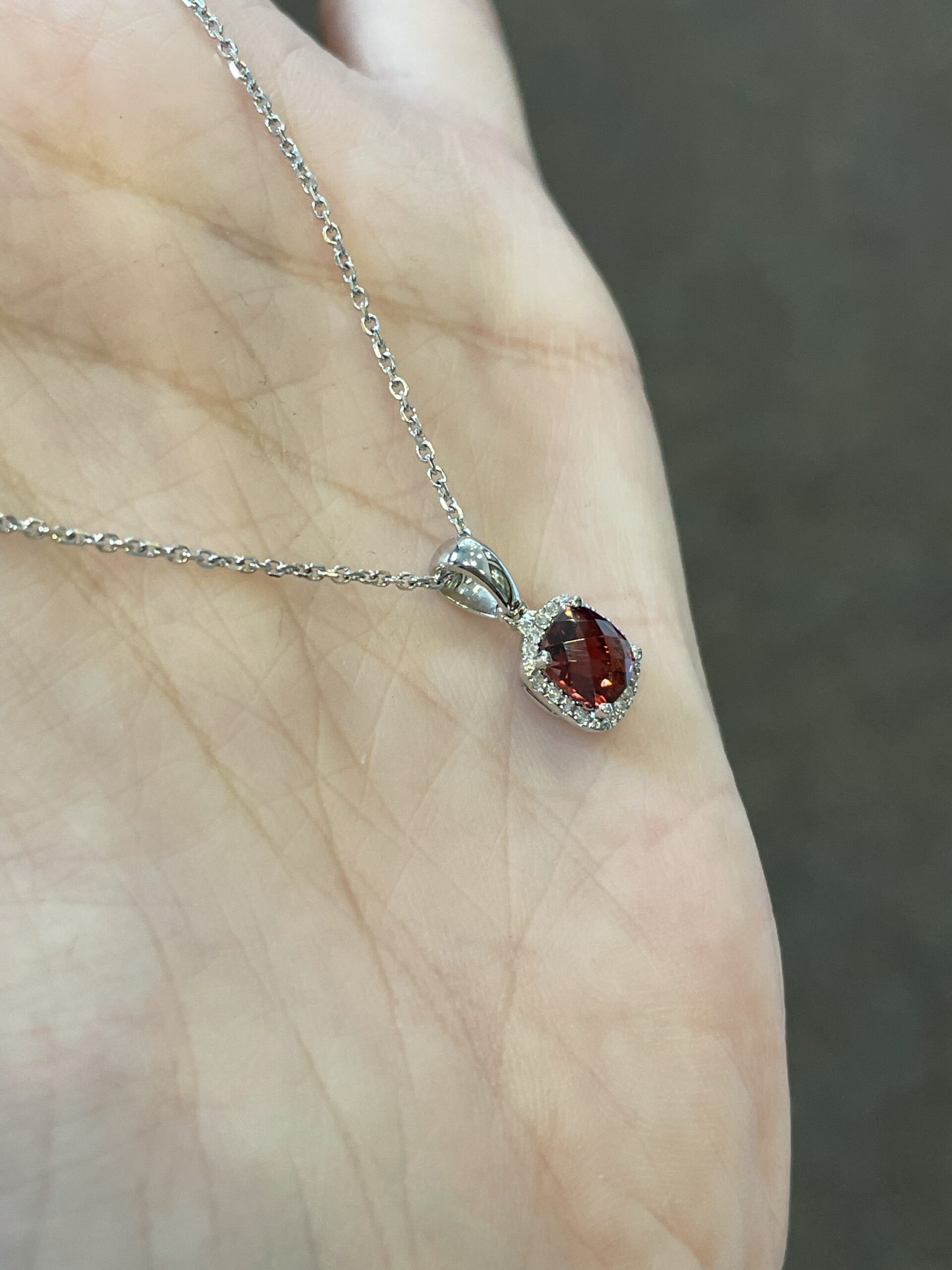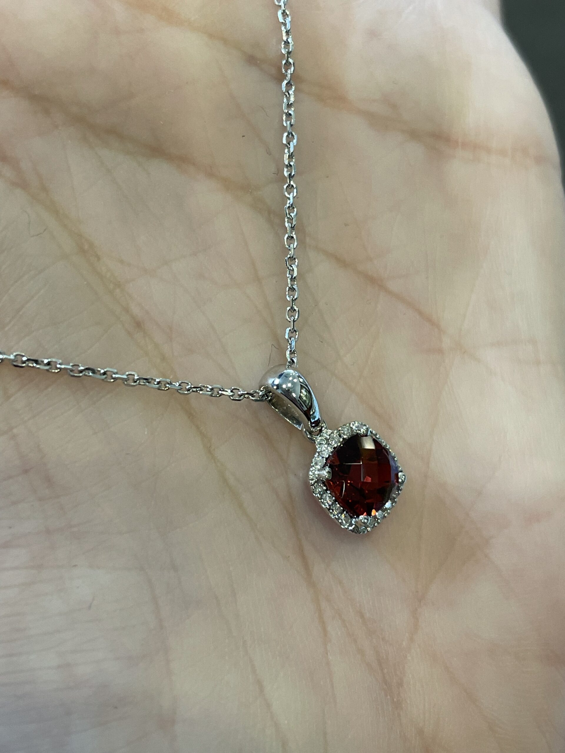 14k white gold genuine cushion shaped, faceted, 1.15 Cttw Garnet (January birthstone) & .08 Cttw genuine Round Brilliant Cut diamond pendant on a 14k white gold 16” forzantina chain. The pendant measures 8 mm in size. The diamonds average H in color and SI in clarity. This piece has an entire weight of 2.6 grams. If you need a longer chain please contact us directly prior to your purchase.