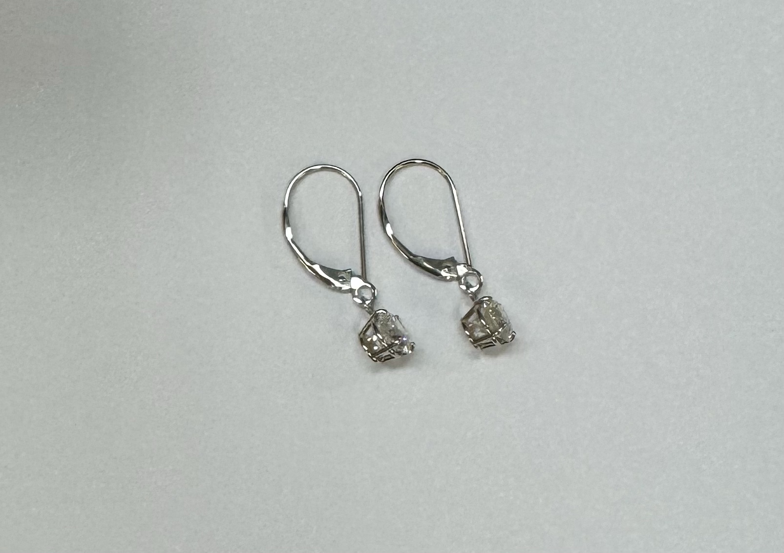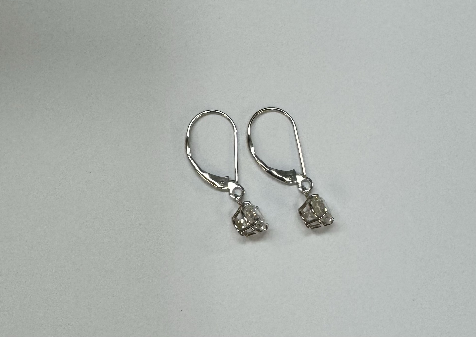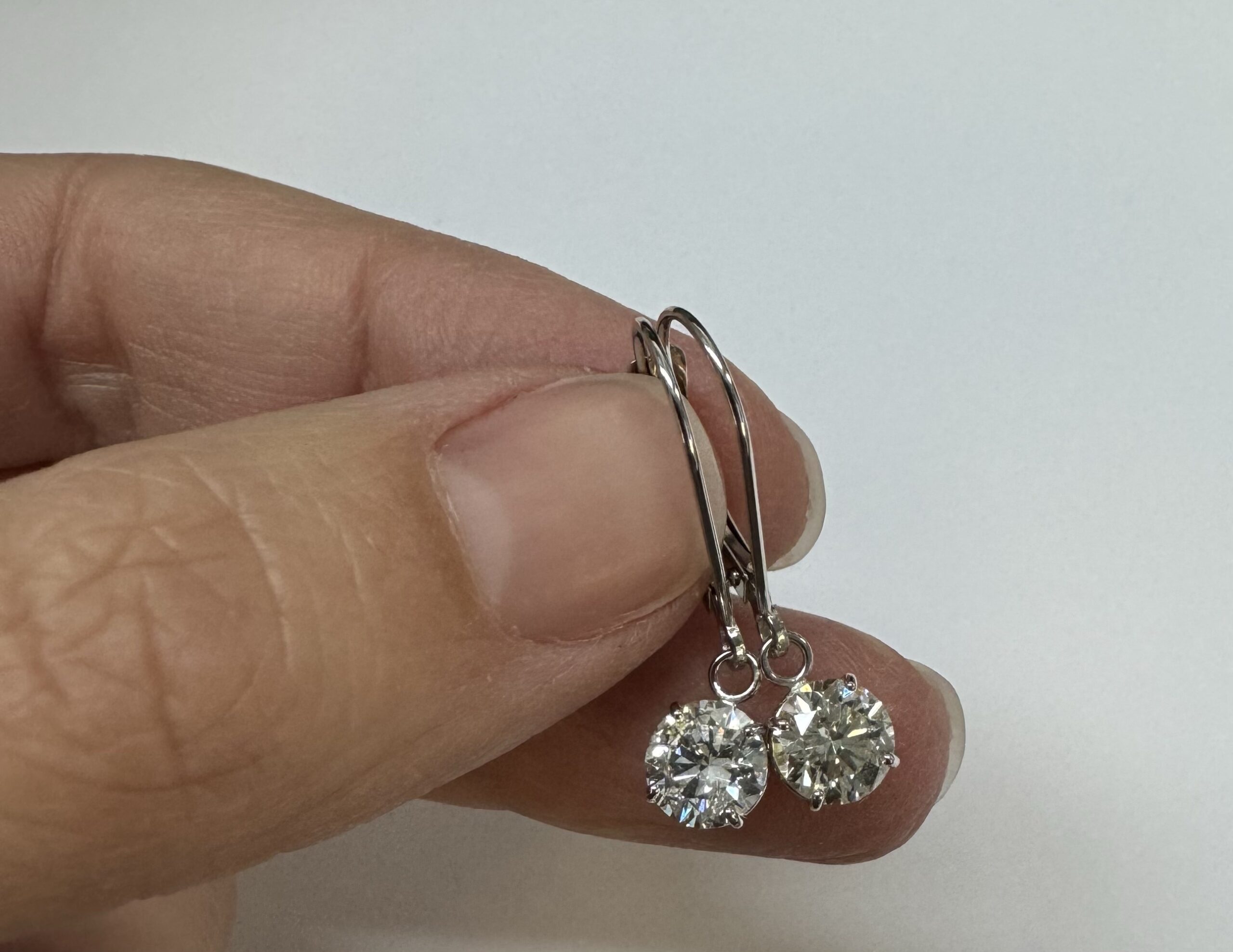14k white gold genuine 1.45 cttw Round Brilliant Cut diamond four prong basket set lever back dangle earrings. These diamonds have H color, SI1 clarity. These earrings have an entire weight of 1.1 grams.