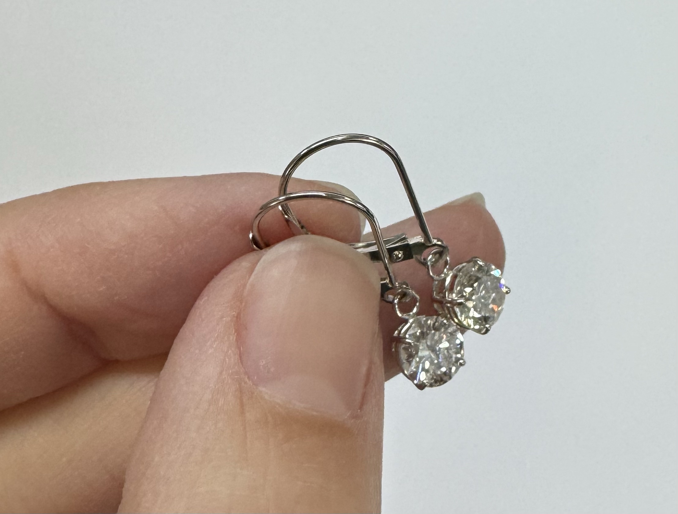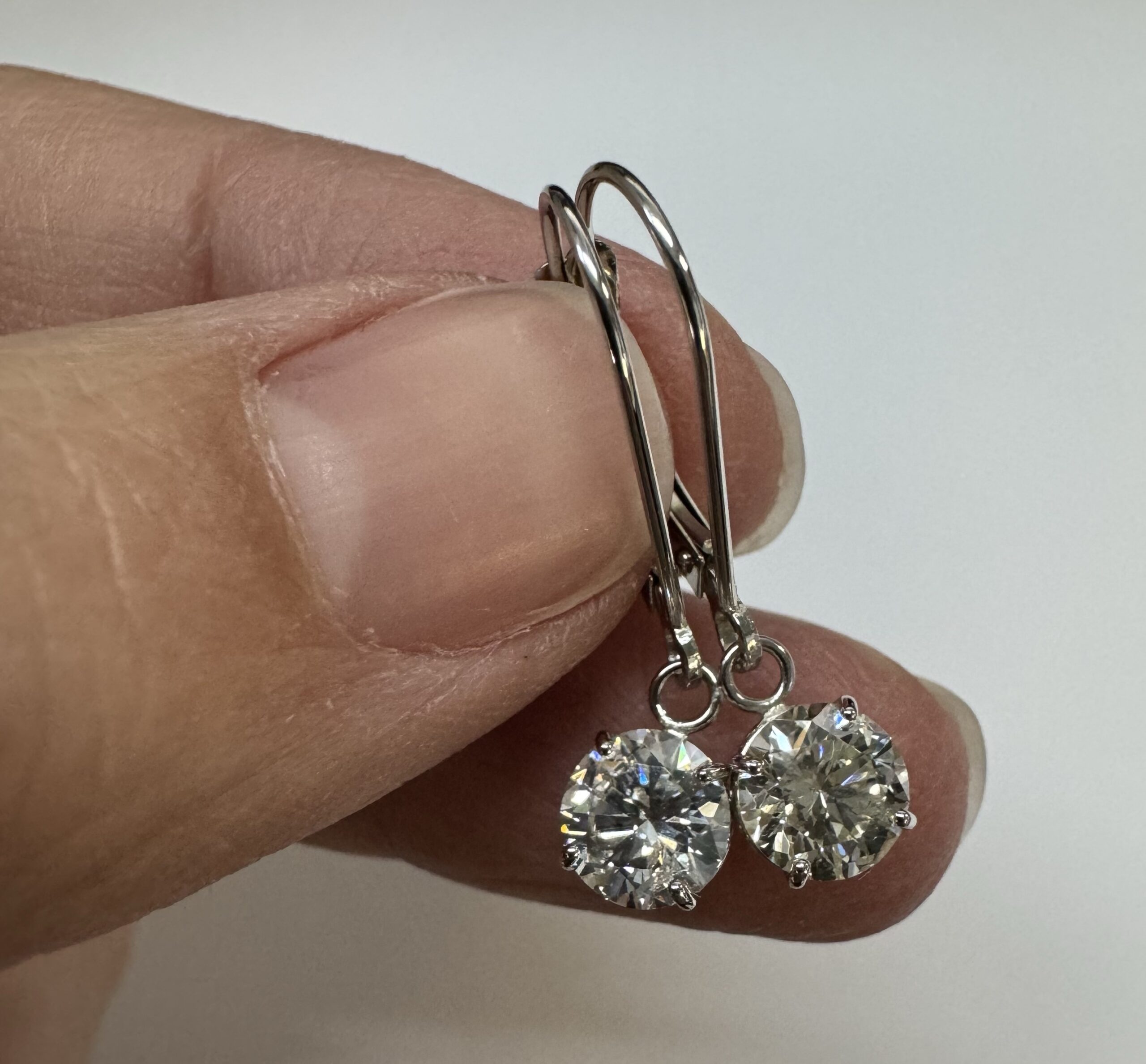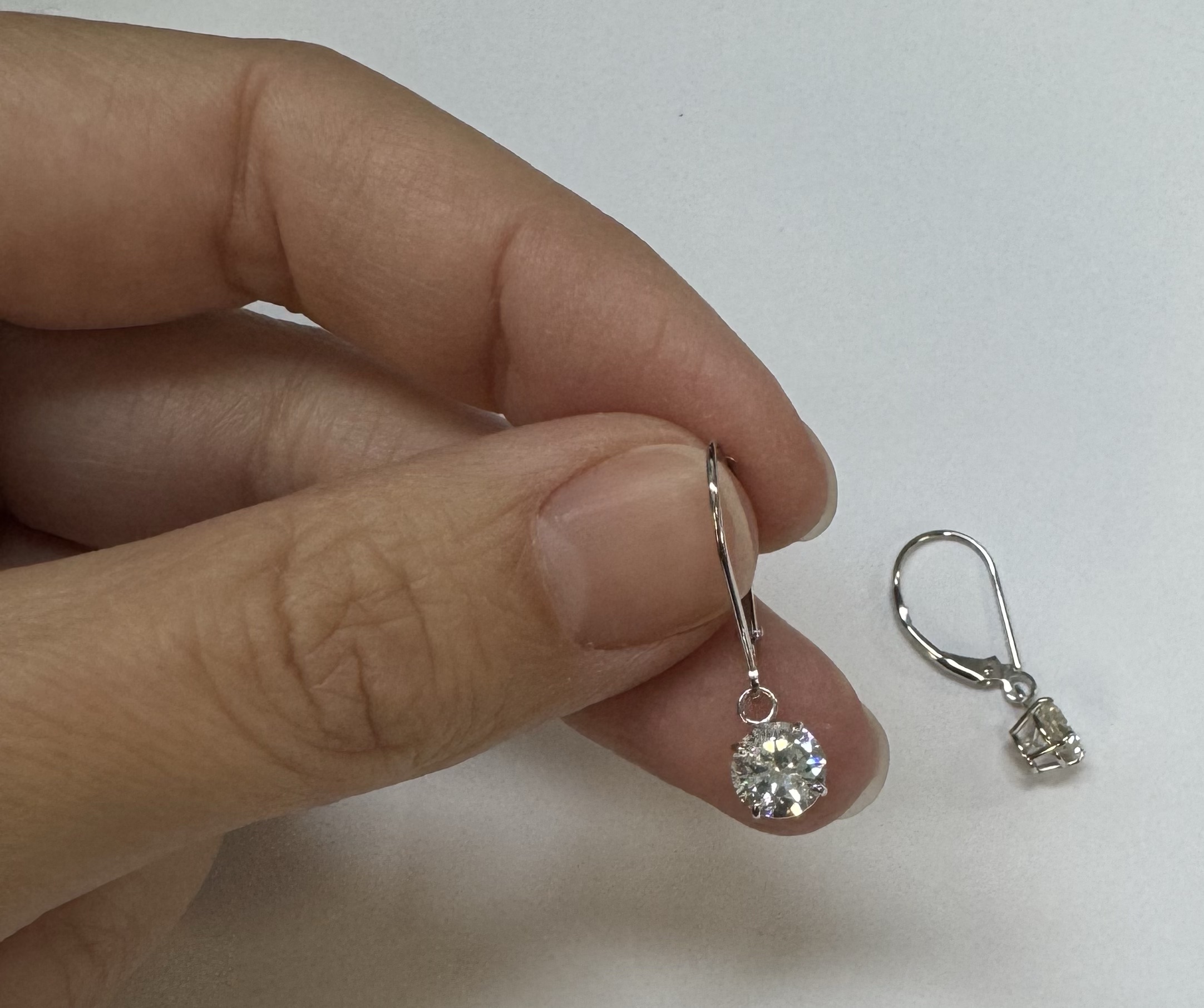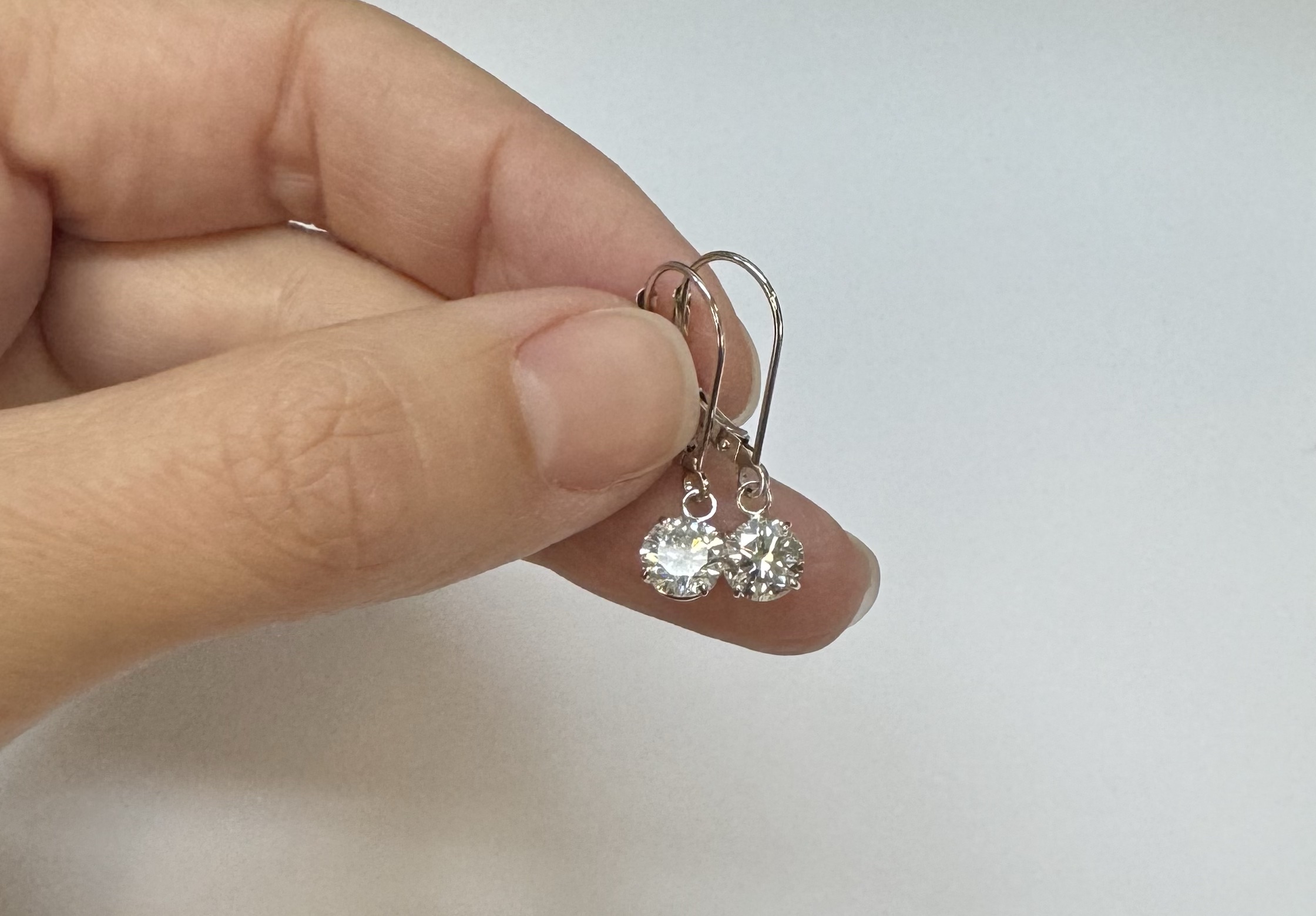 14k white gold genuine 1.45 cttw Round Brilliant Cut diamond four prong basket set lever back dangle earrings. These diamonds have H color, SI1 clarity. These earrings have an entire weight of 1.1 grams.