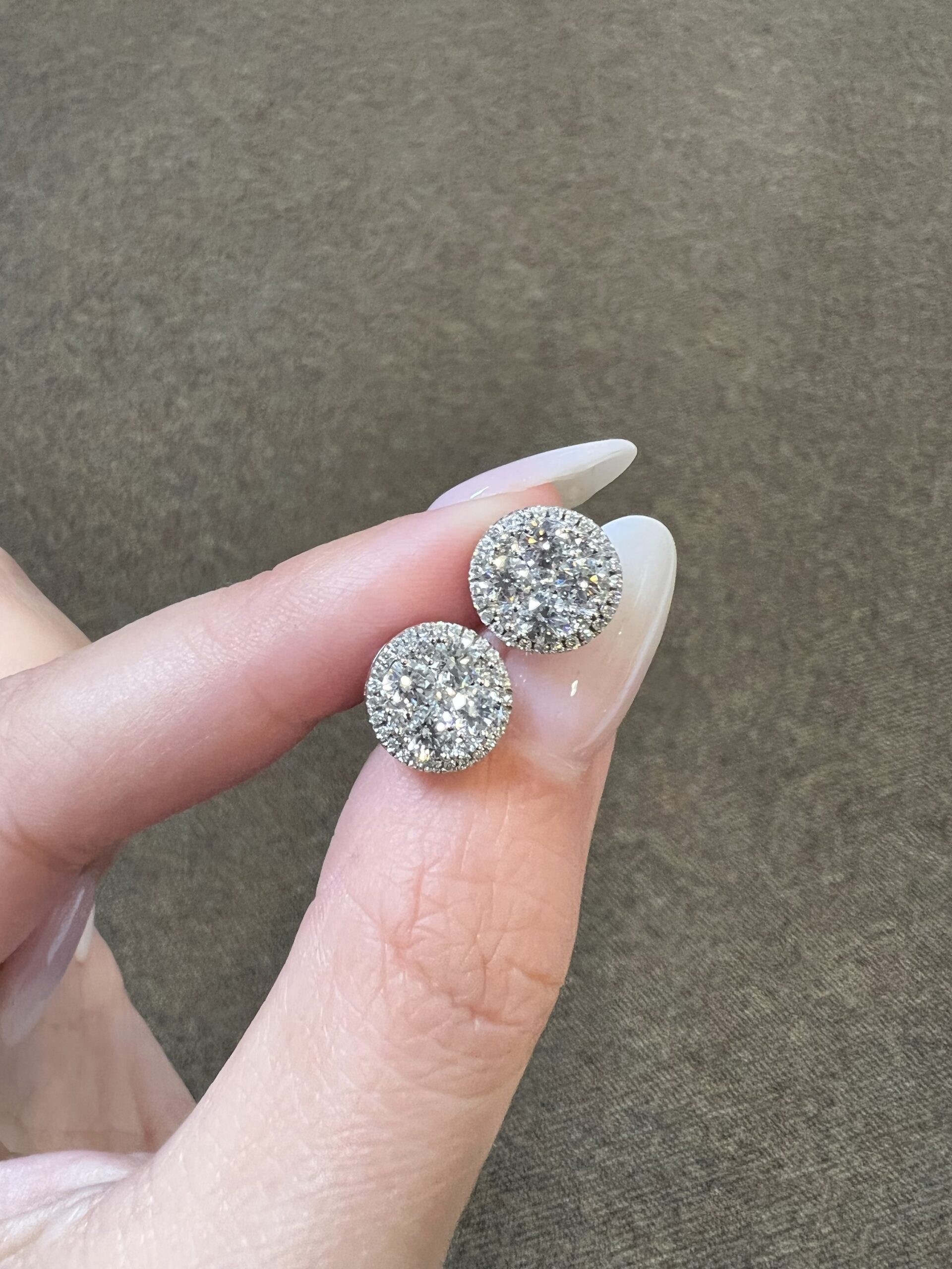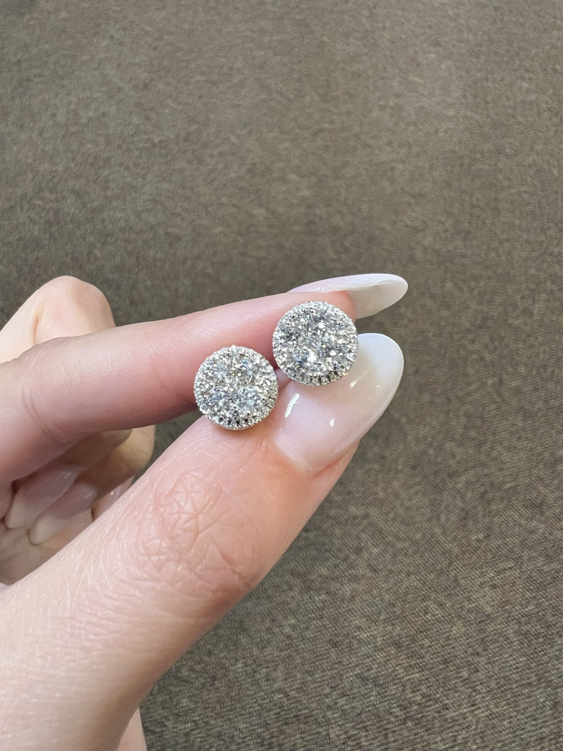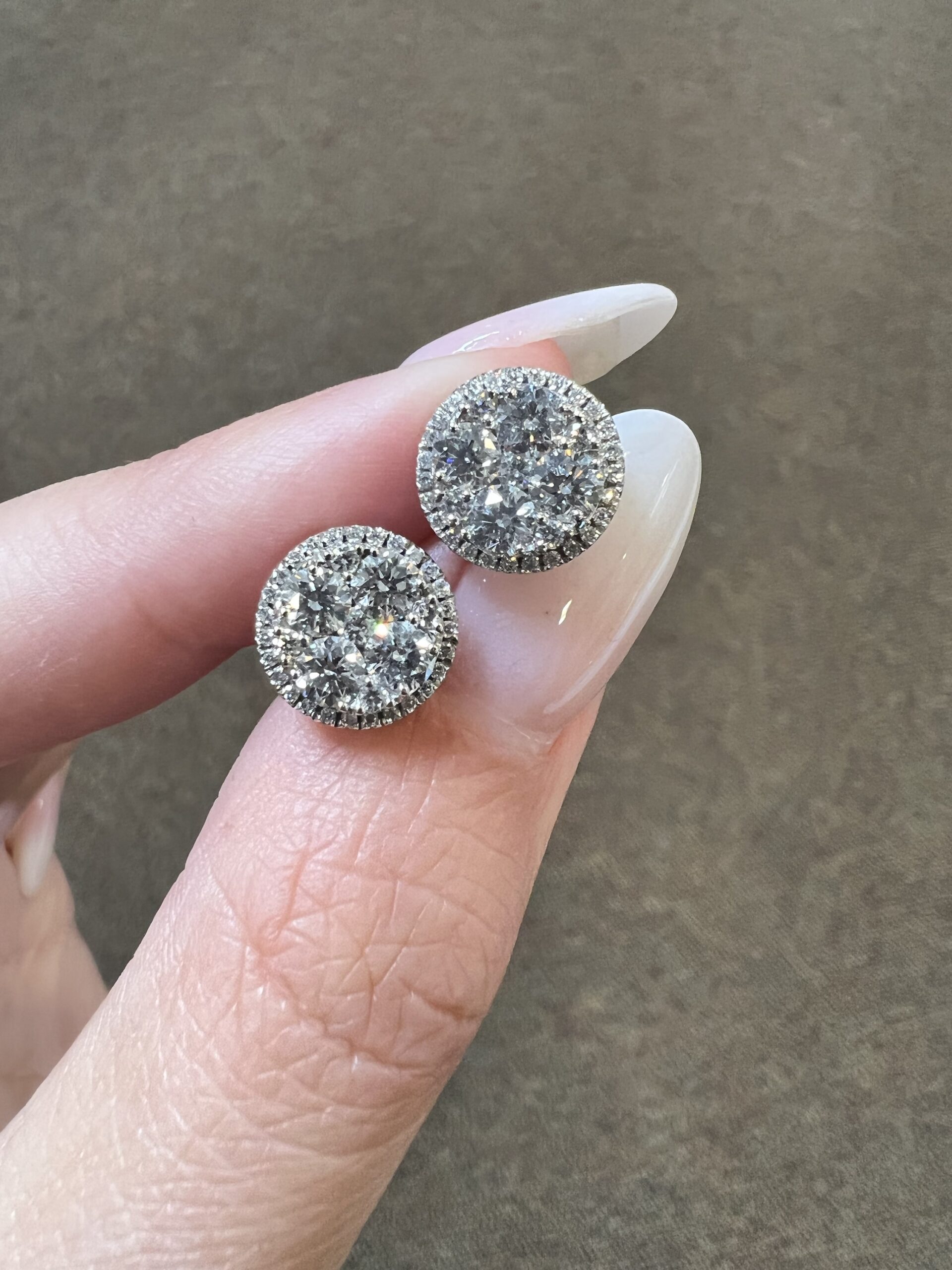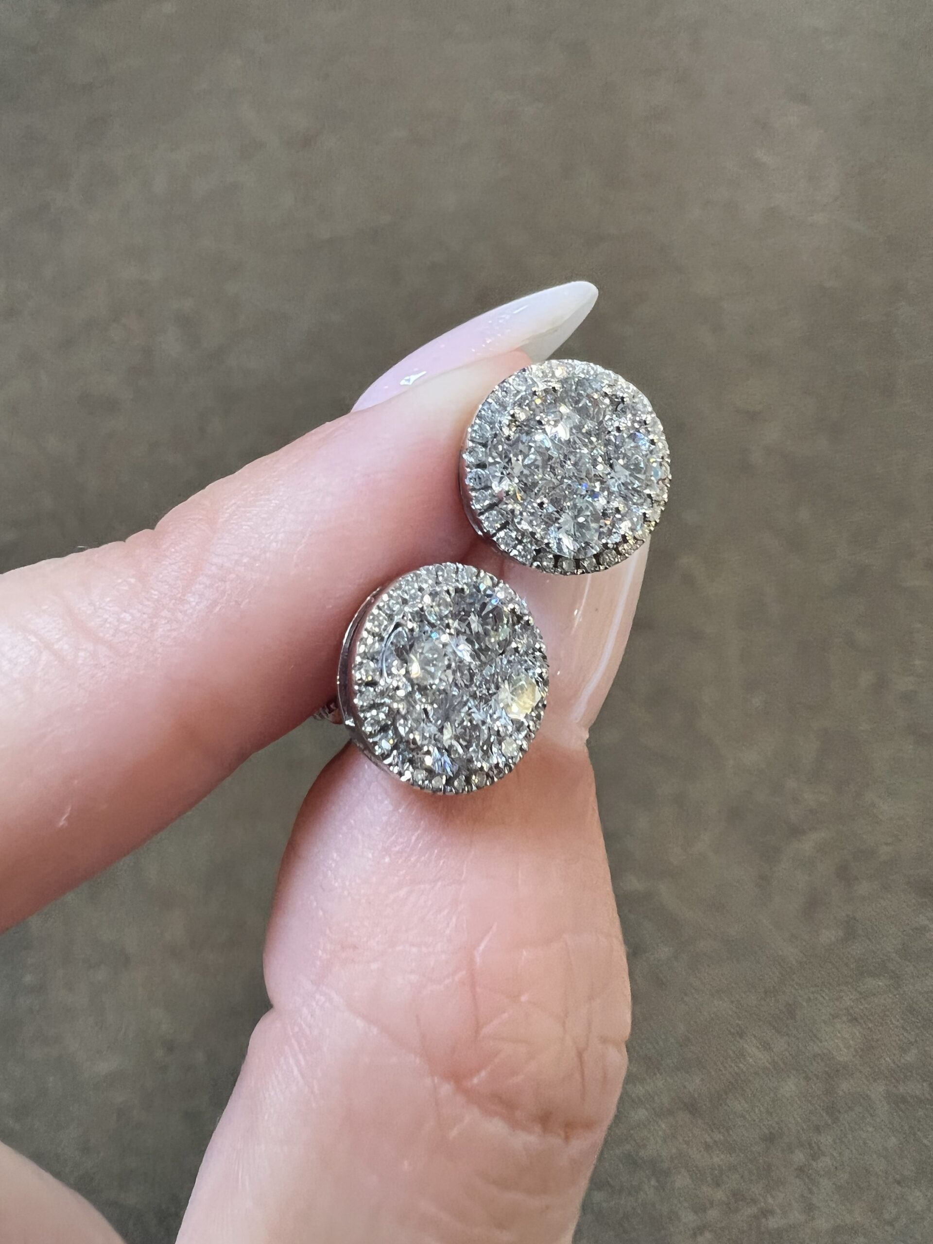 14k white gold genuine Round Brilliant Cut diamond cluster halo stud earrings. Each earring contains 9 larger Round Brilliant Cut diamonds which are set in a cluster fashion, and which are surrounded by a delicate halo of smaller genuine Round Brilliant Cut diamonds. These diamonds average H-I in color, and SI1 in clarity. These diamonds are nicely proportioned and well finished. The earrings measure 10 mm in size, and they have an entire weight of 3.6 grams.