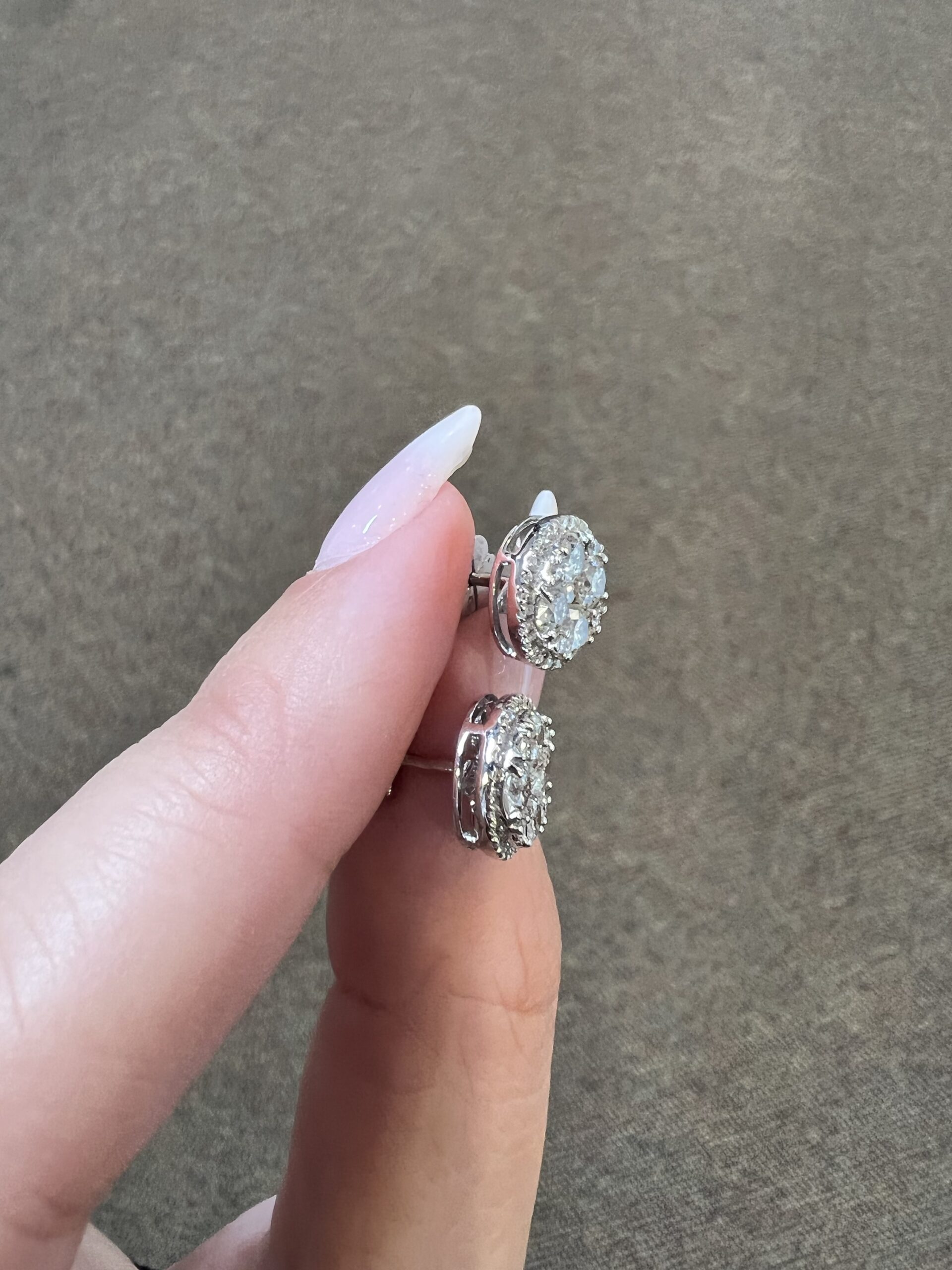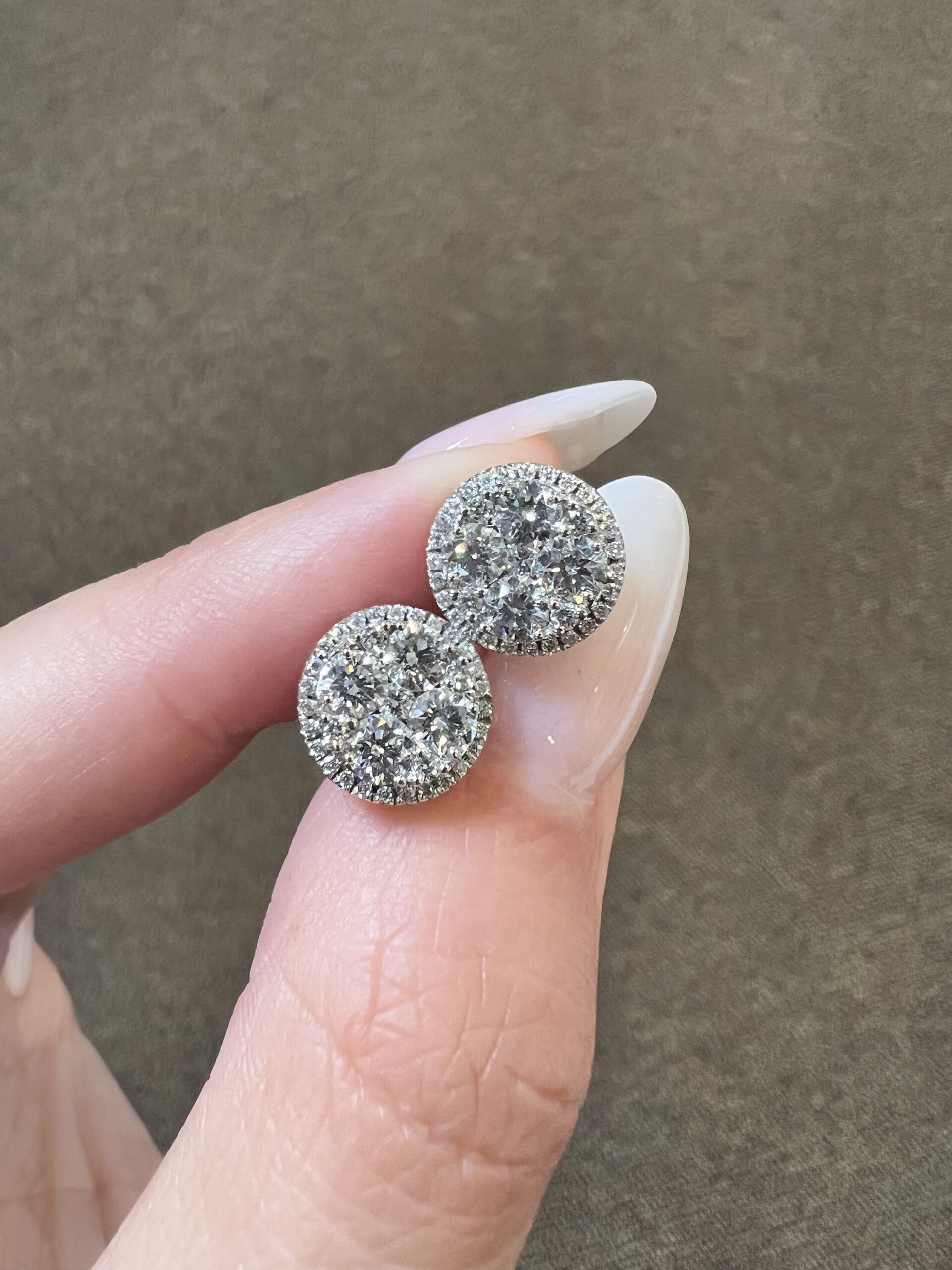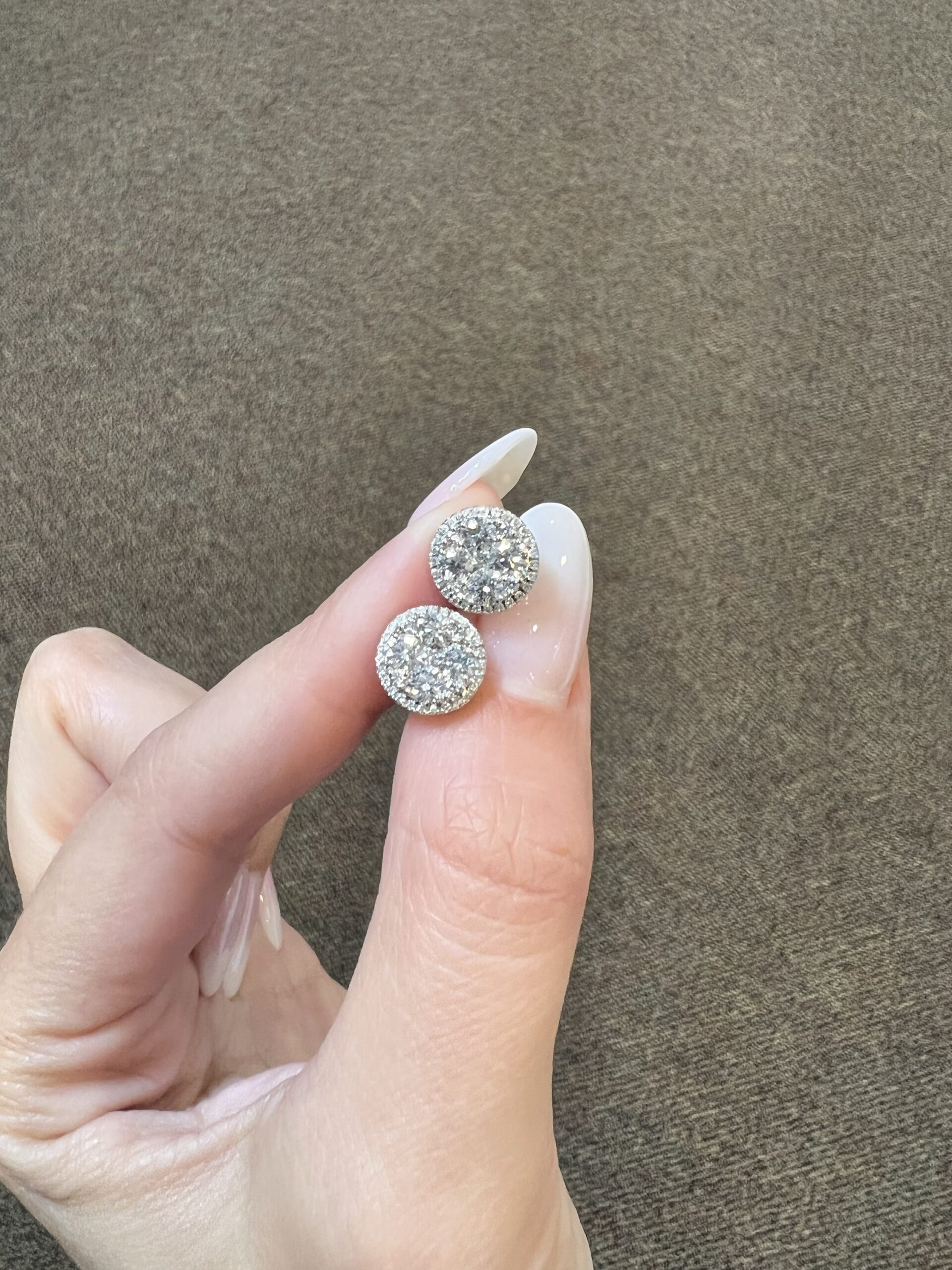 14k white gold genuine Round Brilliant Cut diamond cluster halo stud earrings. Each earring contains 9 larger Round Brilliant Cut diamonds which are set in a cluster fashion, and which are surrounded by a delicate halo of smaller genuine Round Brilliant Cut diamonds. These diamonds average H-I in color, and SI1 in clarity. These diamonds are nicely proportioned and well finished. The earrings measure 10 mm in size, and they have an entire weight of 3.6 grams.
