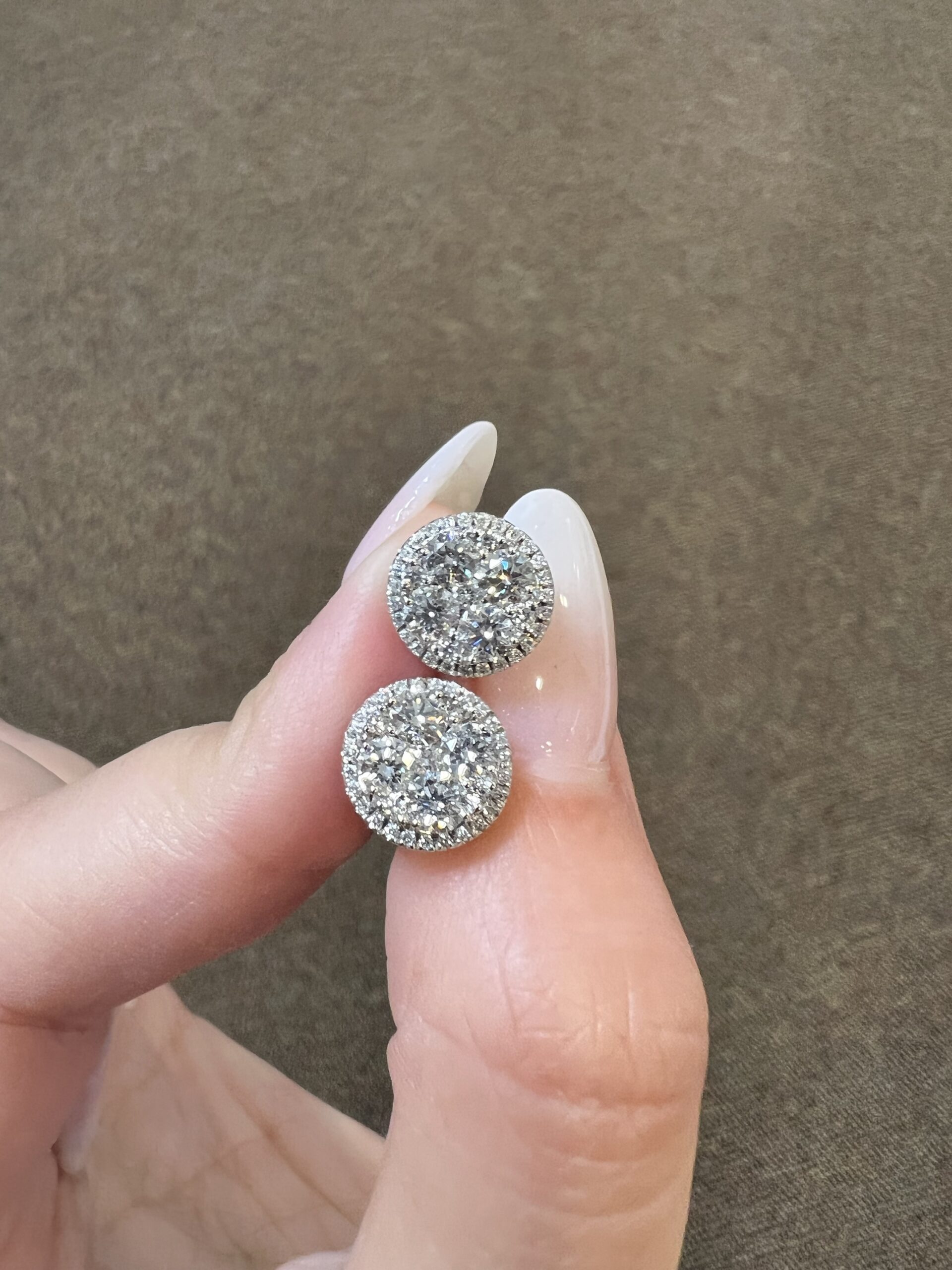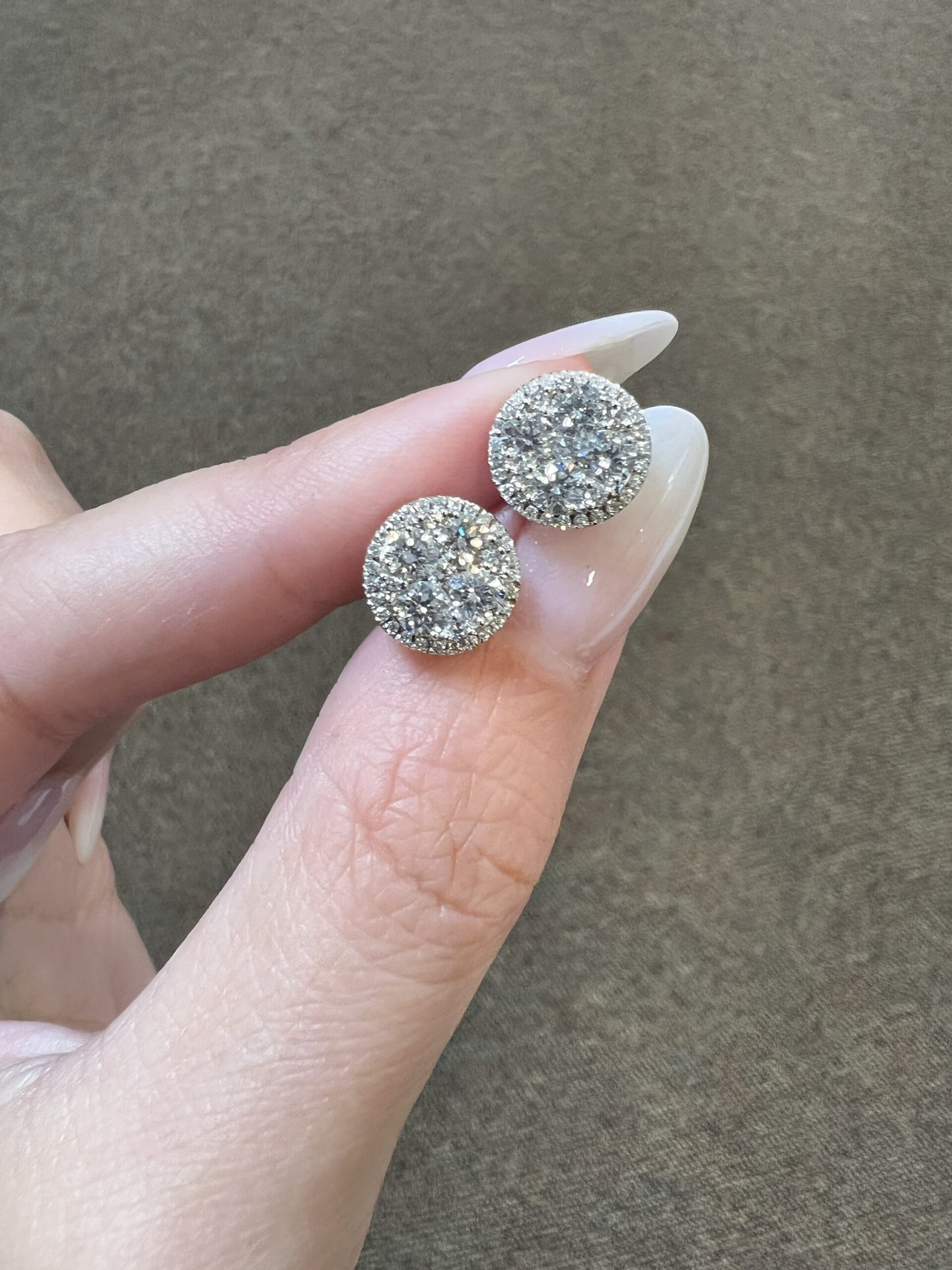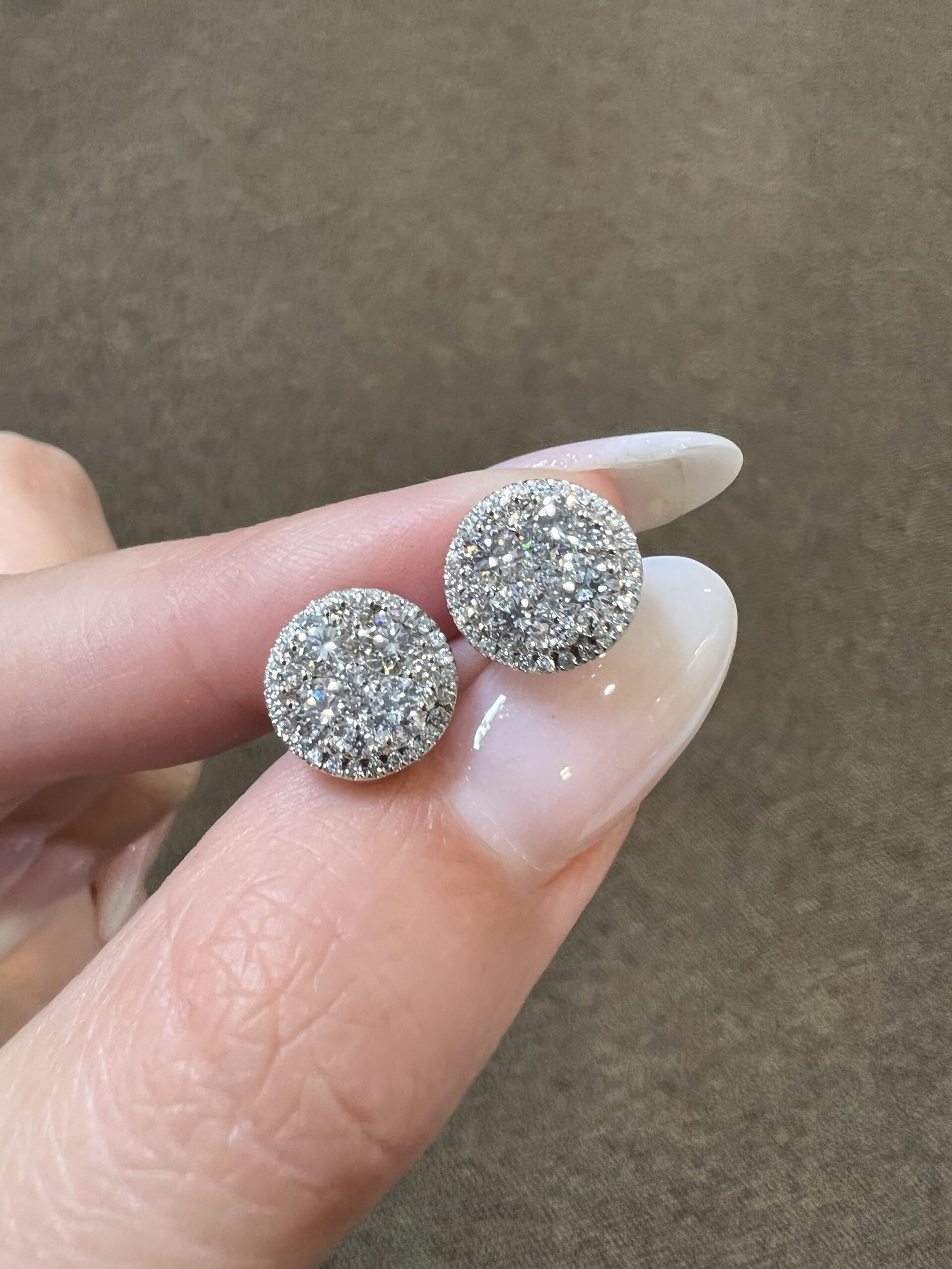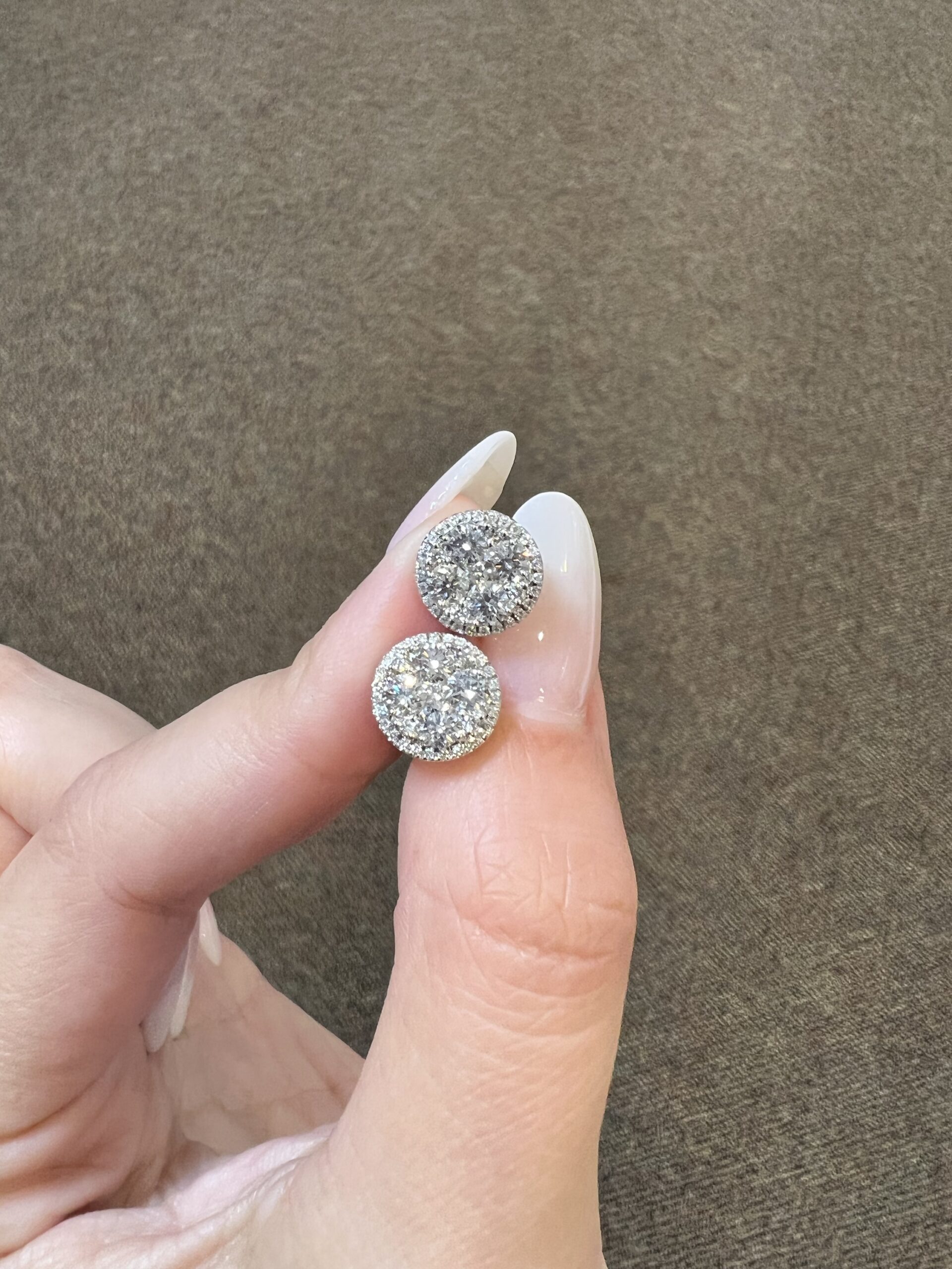 14k white gold genuine Round Brilliant Cut diamond cluster halo stud earrings. Each earring contains 9 larger Round Brilliant Cut diamonds which are set in a cluster fashion, and which are surrounded by a delicate halo of smaller genuine Round Brilliant Cut diamonds. These diamonds average H-I in color, and SI1 in clarity. These diamonds are nicely proportioned and well finished. The earrings measure 10 mm in size, and they have an entire weight of 3.6 grams.