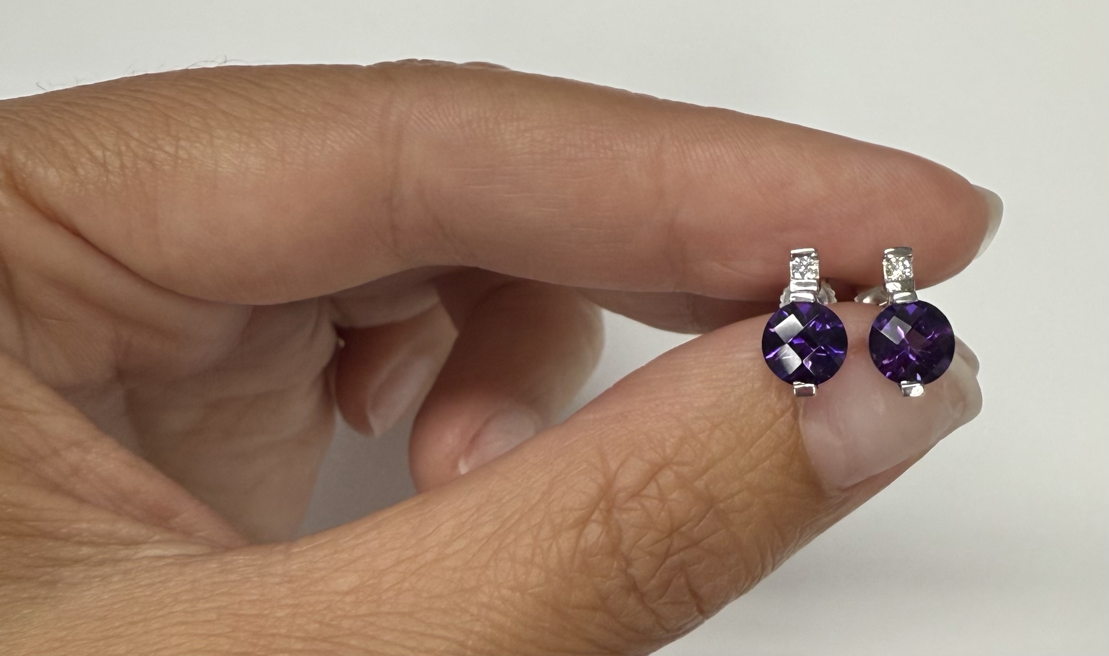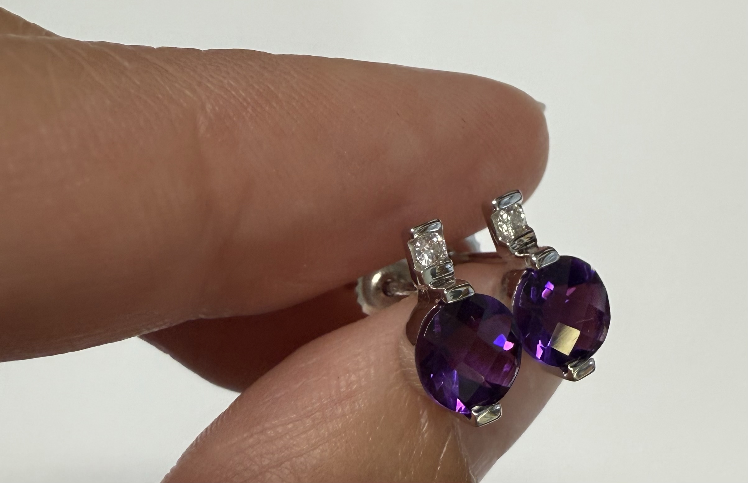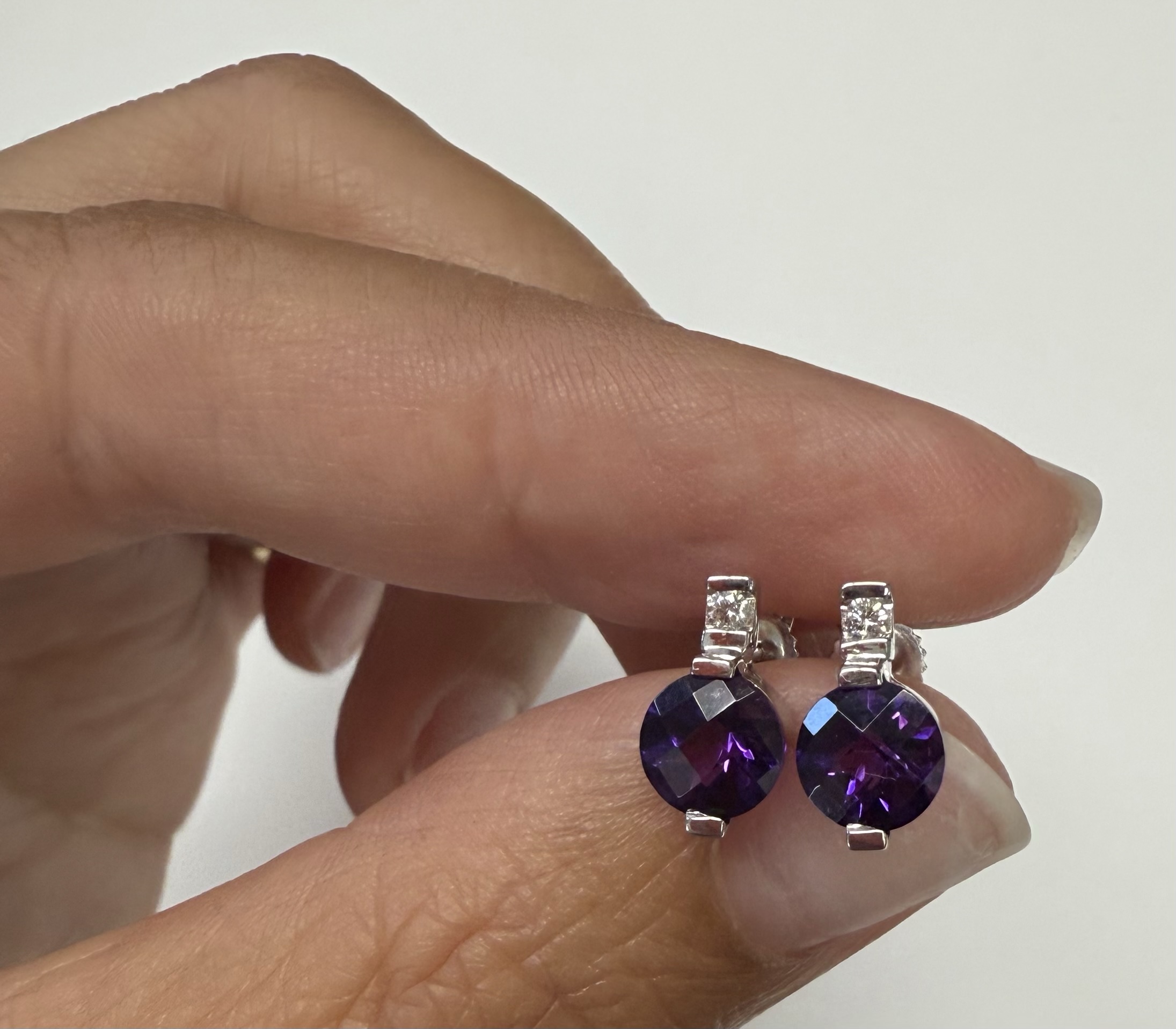14k white gold round genuine 1.70 cttw Amethyst (February birthstone) and genuine .05 cttw Round Brilliant Cut diamond stud earrings. The diamonds average G in color, and SI1 in clarity. These earrings have an entire weight of 1.5 grams.