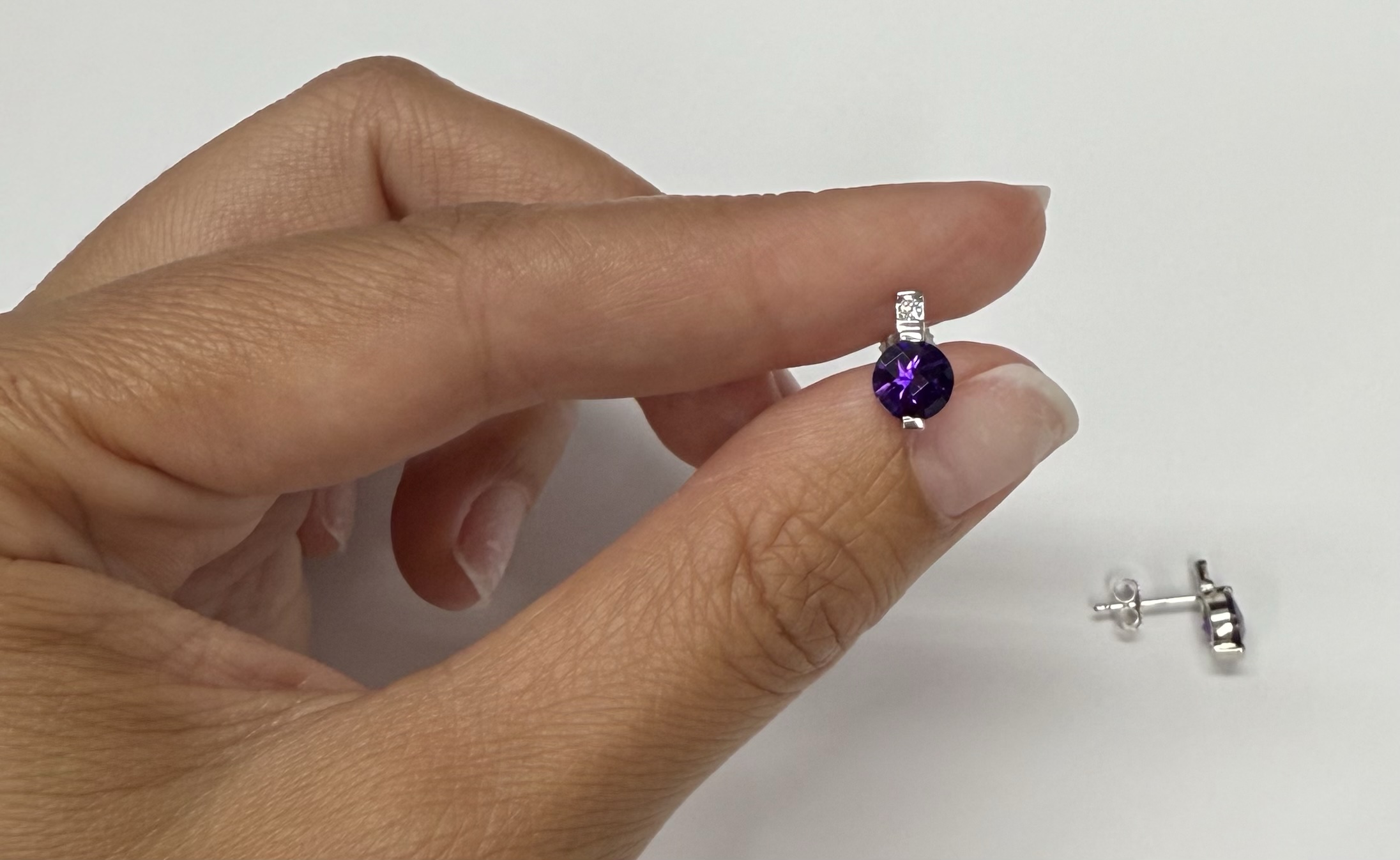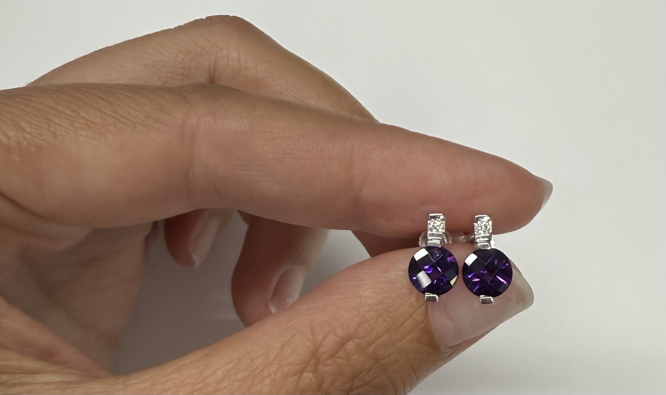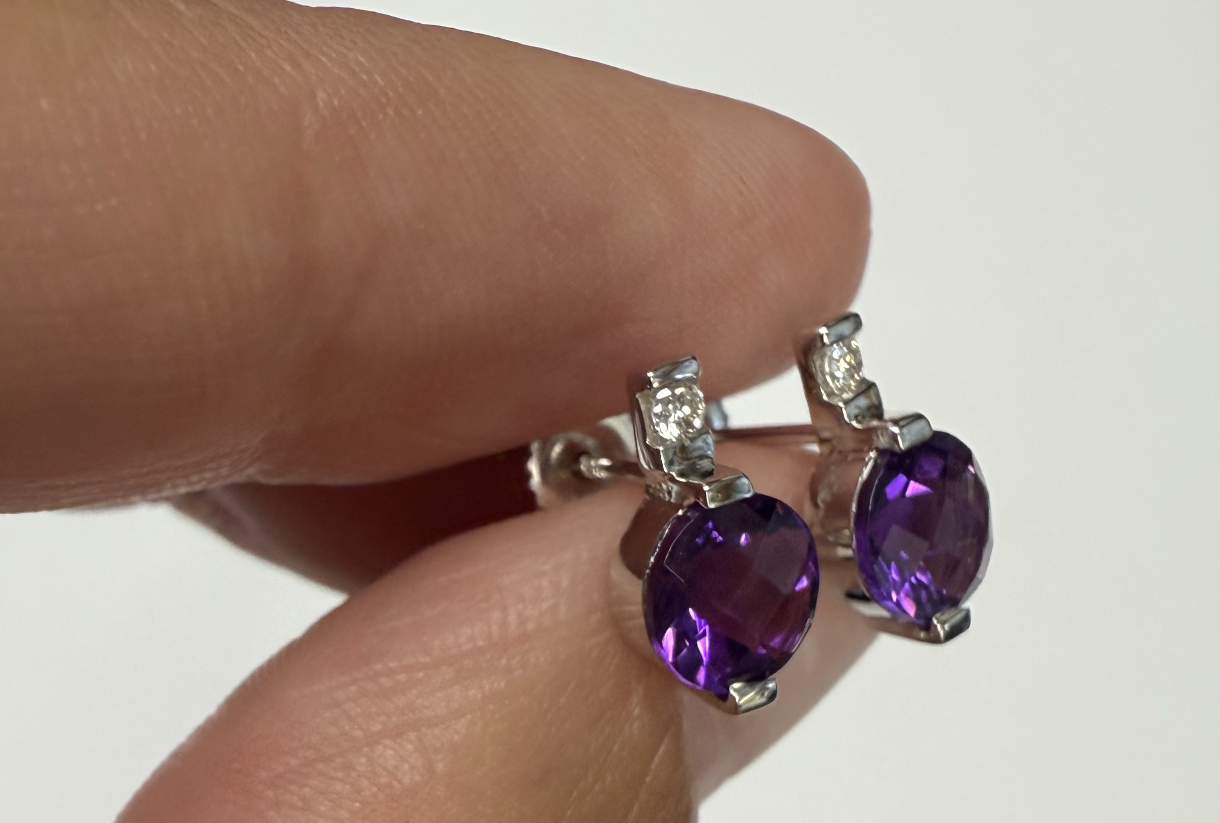14k white gold round genuine 1.70 cttw Amethyst (February birthstone) and genuine .05 cttw Round Brilliant Cut diamond stud earrings. The diamonds average G in color, and SI1 in clarity. These earrings have an entire weight of 1.5 grams.