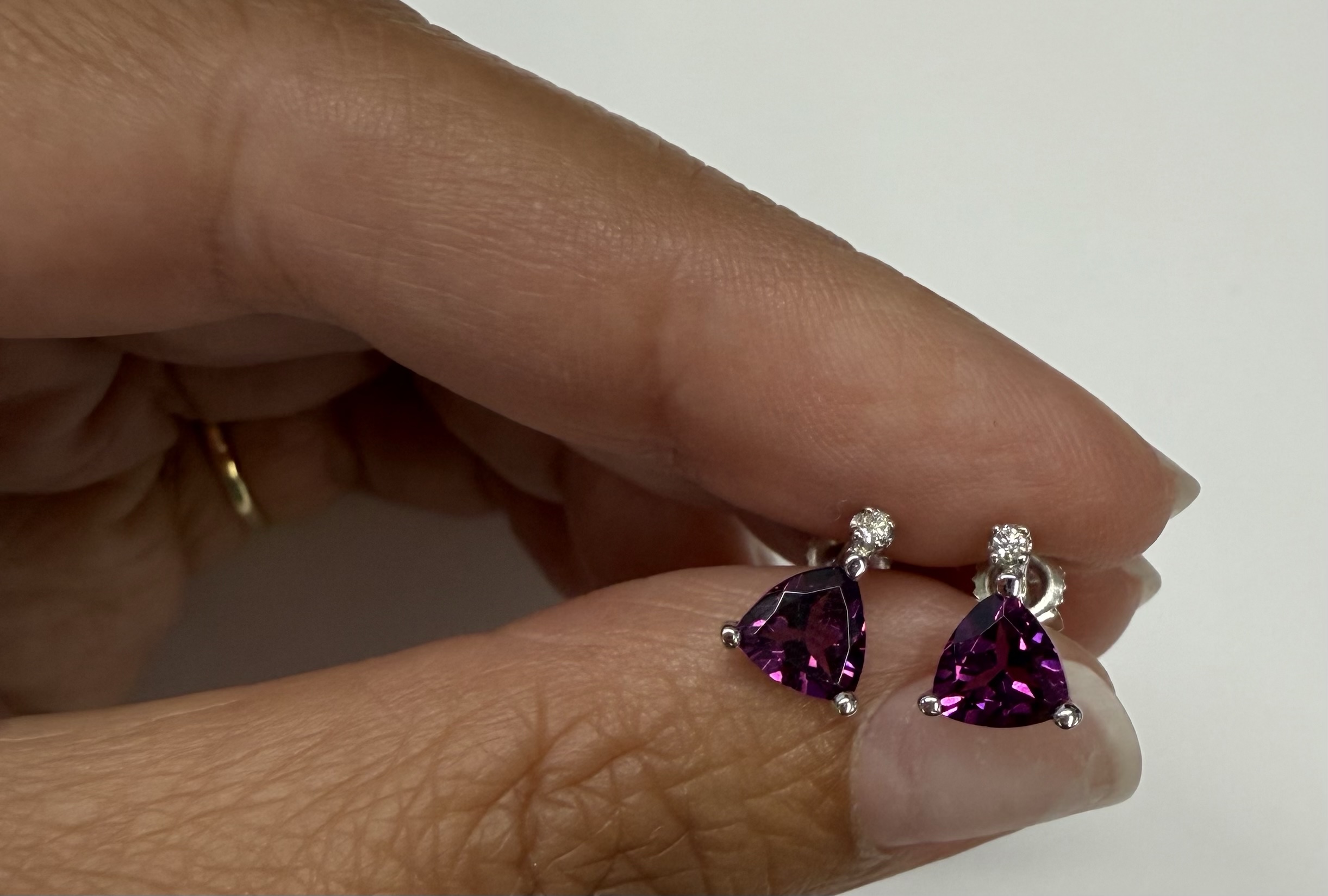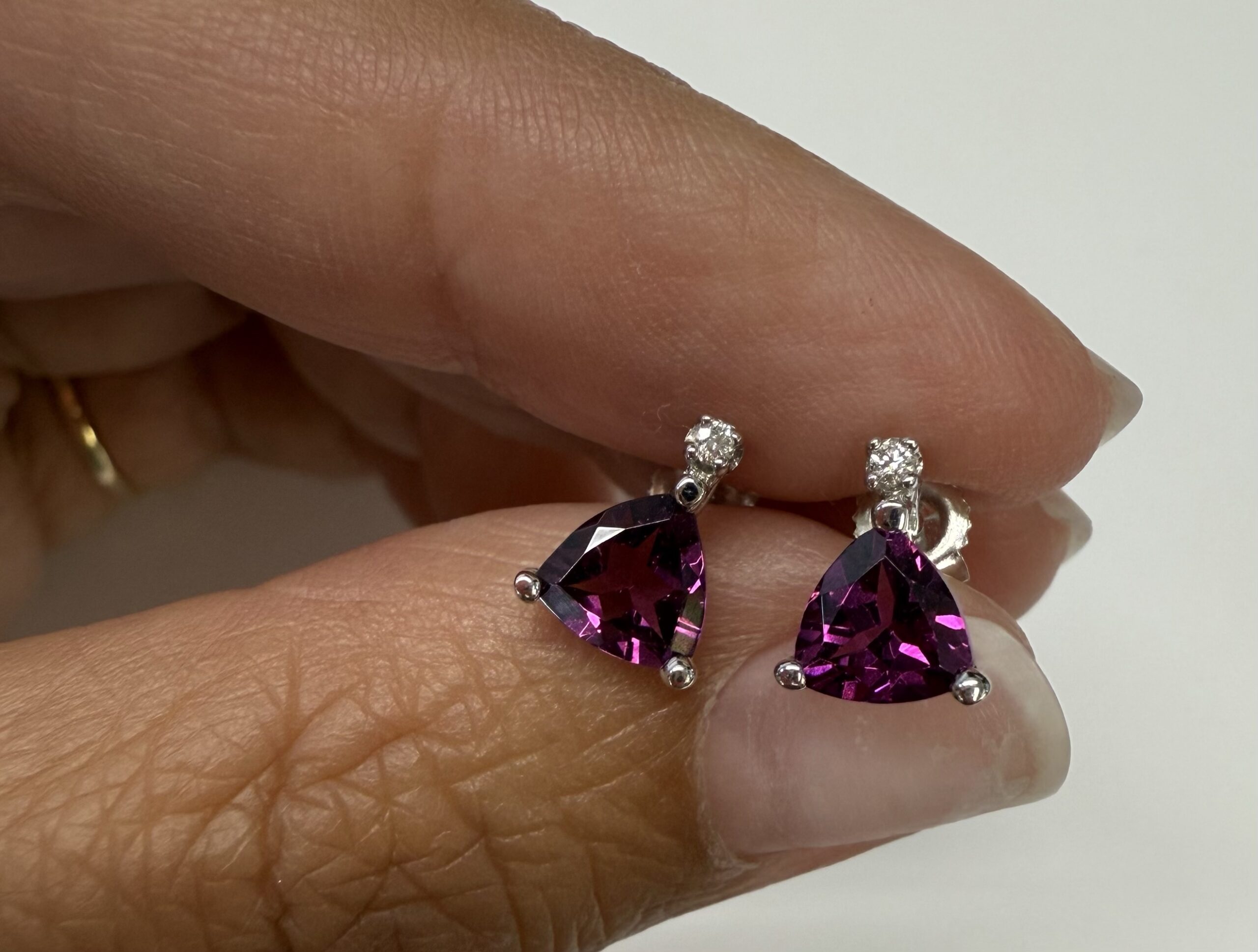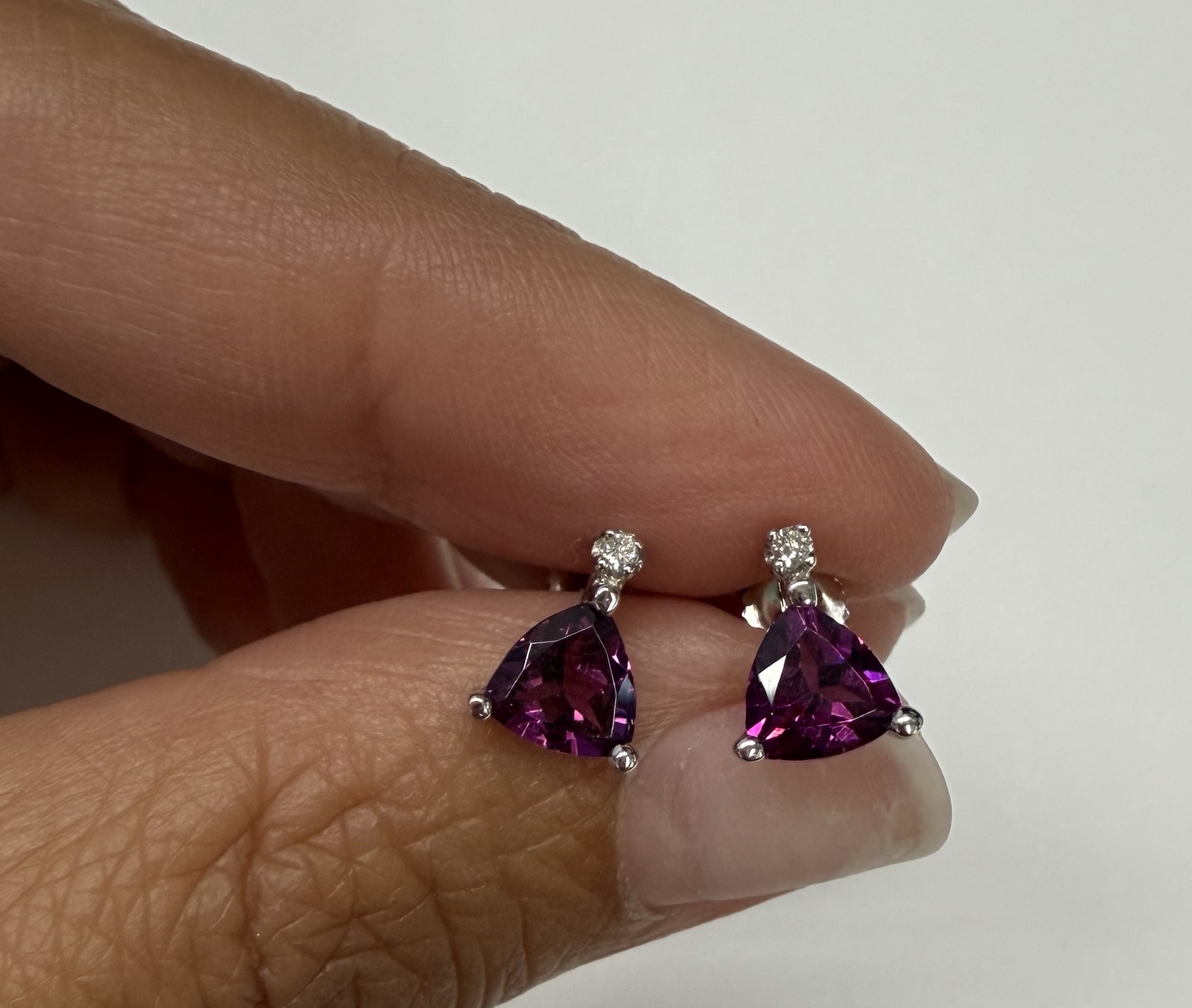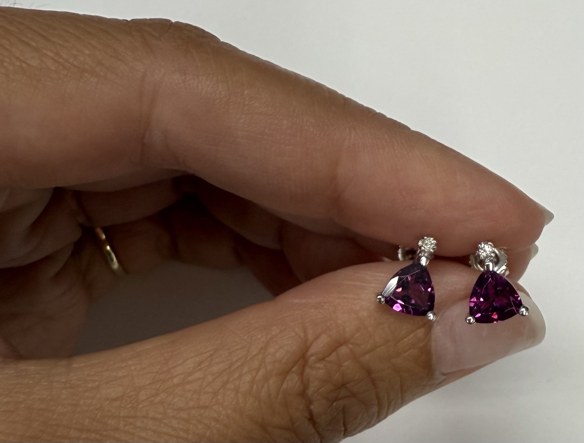14k white gold trillion shaped genuine 1.80 Cttw Rhodolite Garnet and genuine .03 cttw Round Brilliant Cut diamond stud earrings. These diamonds average G-H in color and SI1 in clarity. These earrings have an entire weight of 1.5 grams.