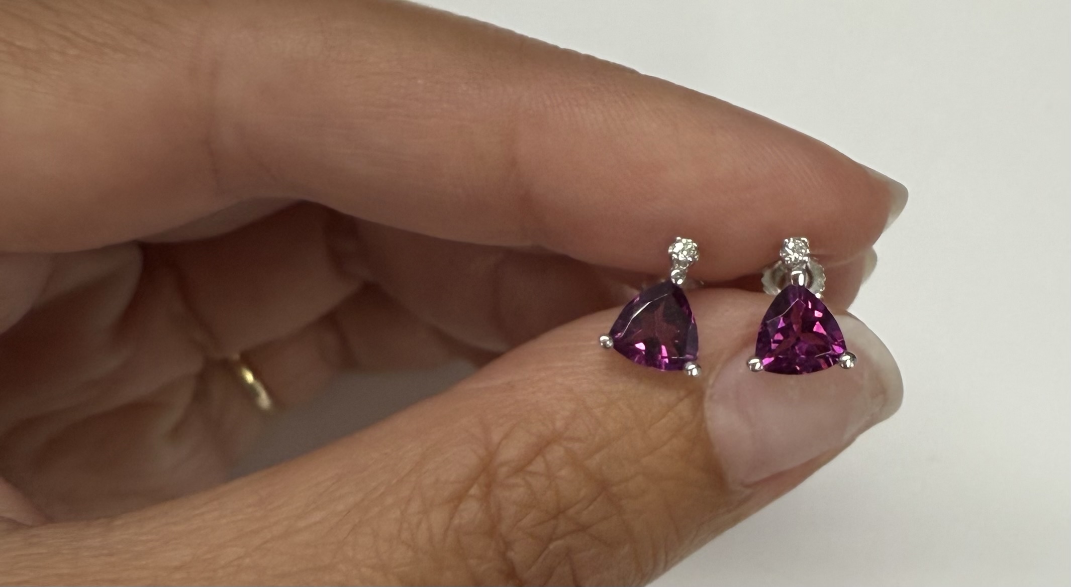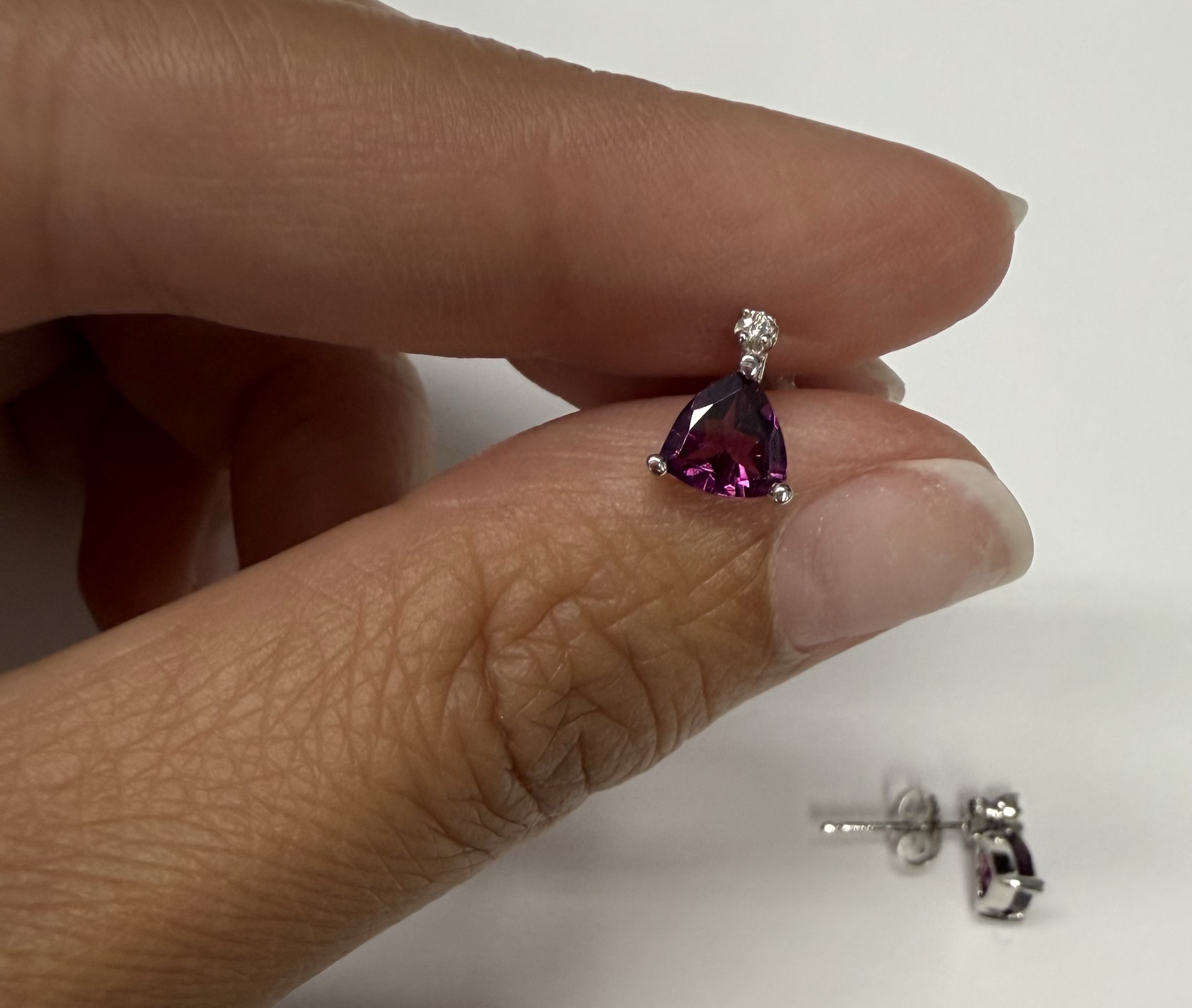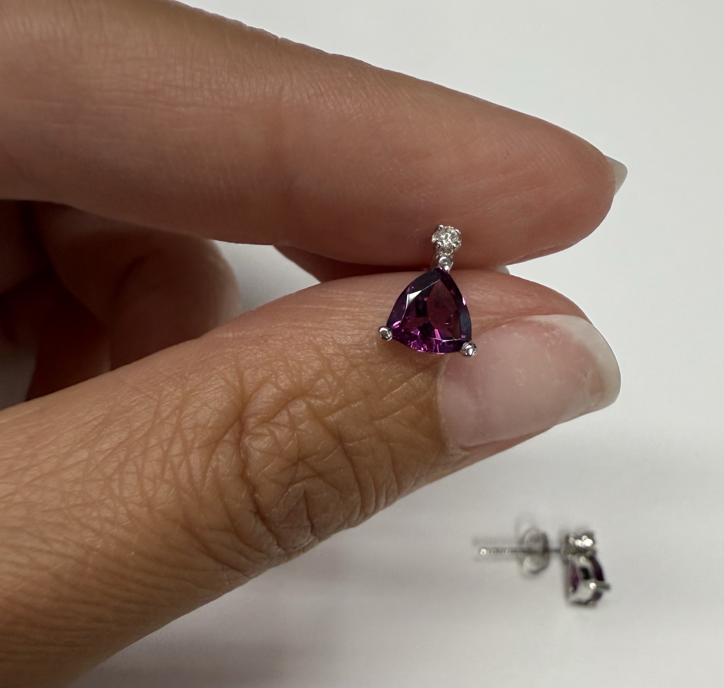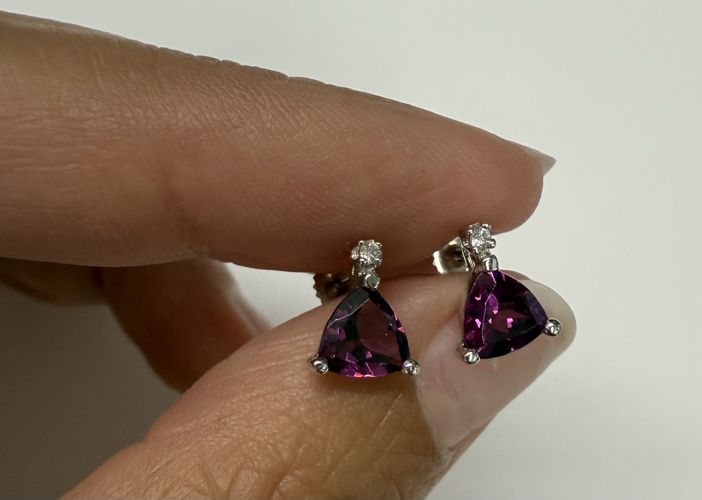 14k white gold trillion shaped genuine 1.80 Cttw Rhodolite Garnet and genuine .03 cttw Round Brilliant Cut diamond stud earrings. These diamonds average G-H in color and SI1 in clarity. These earrings have an entire weight of 1.5 grams.