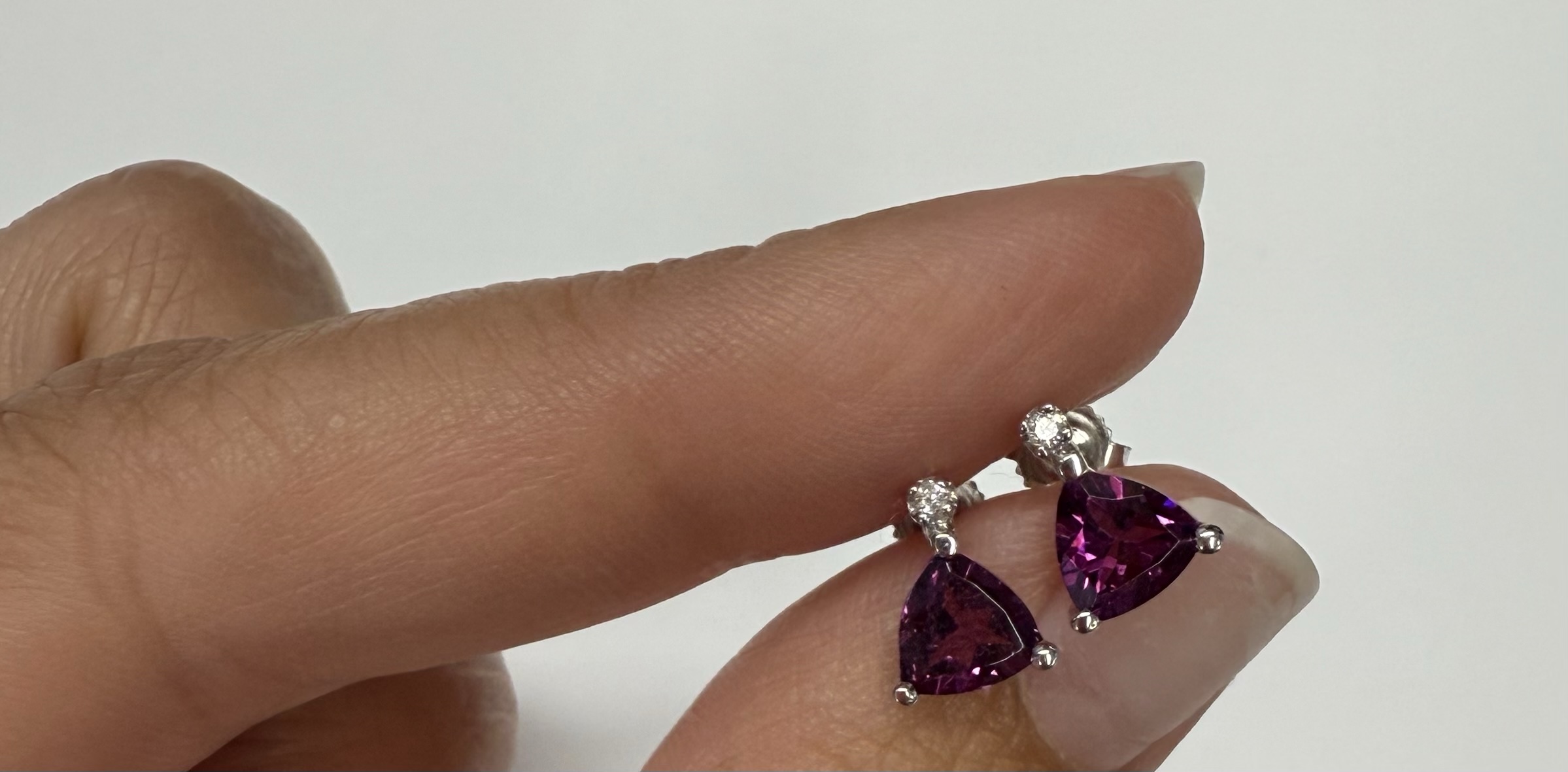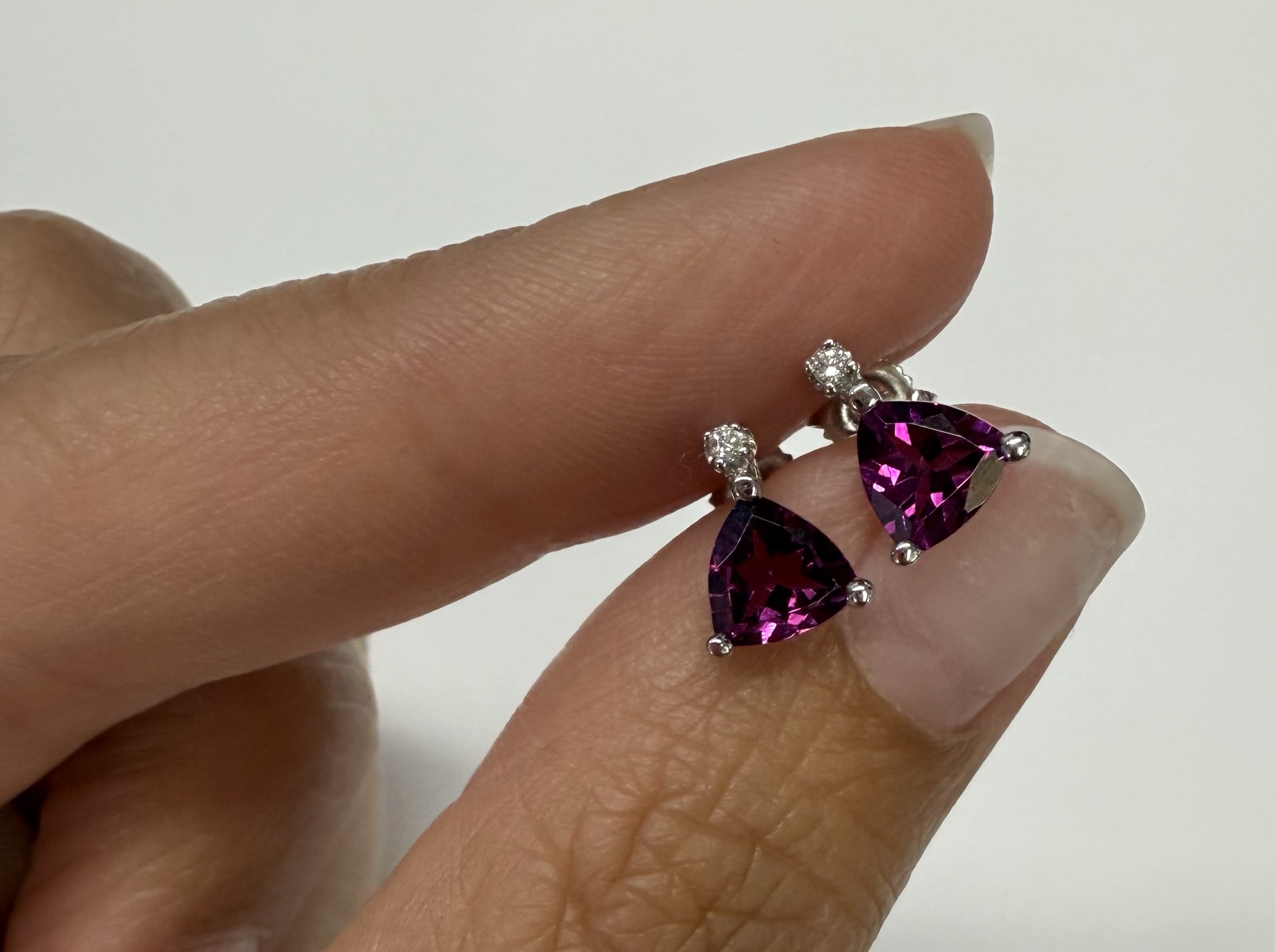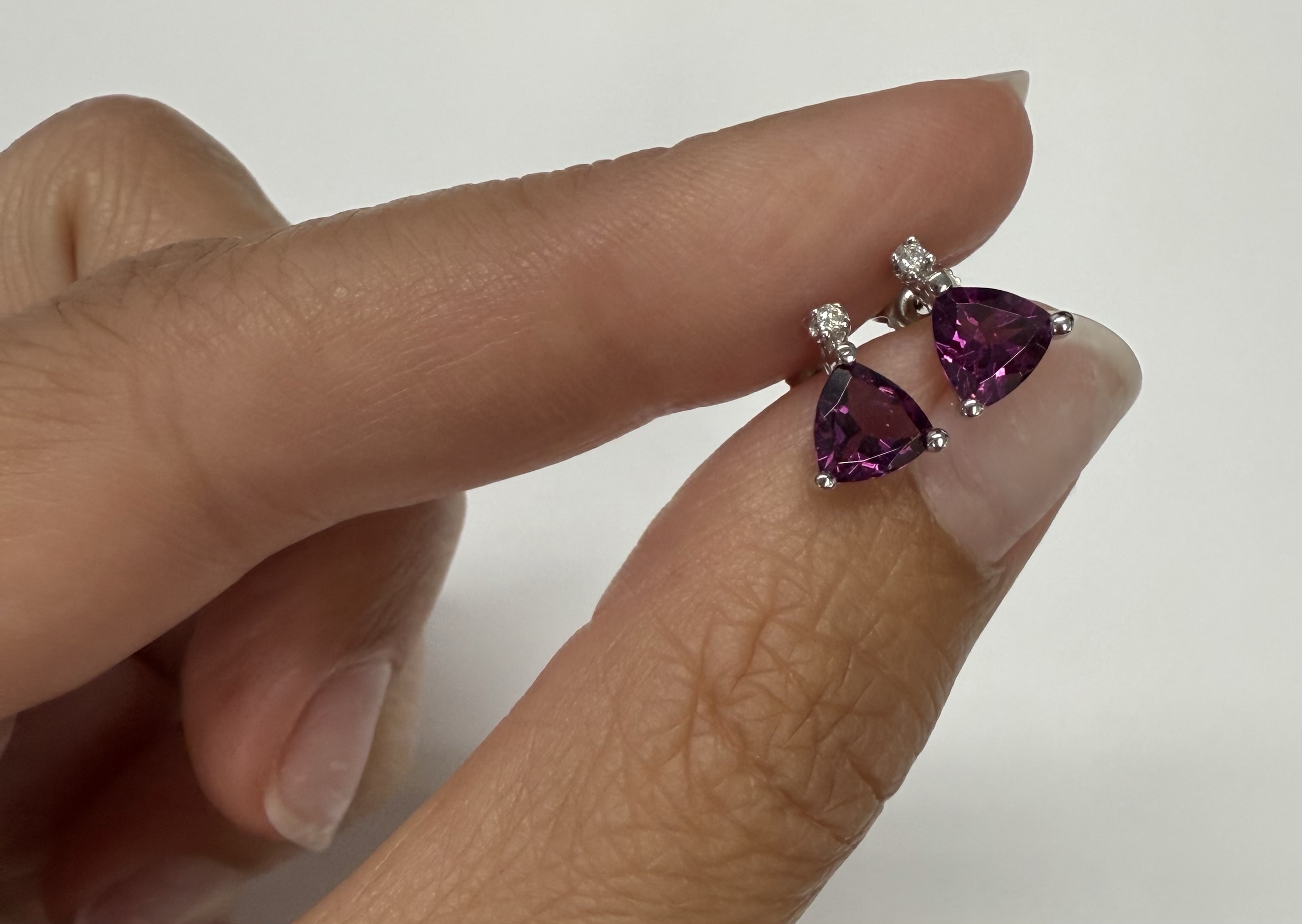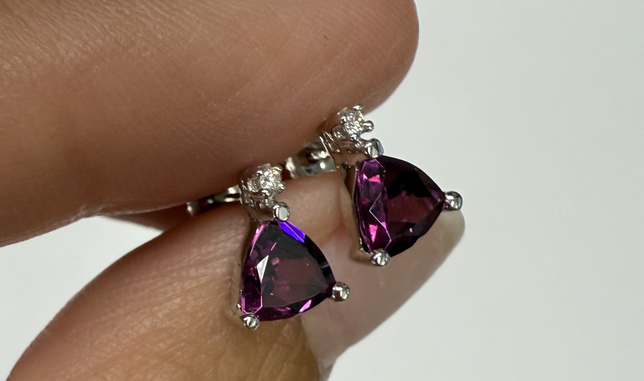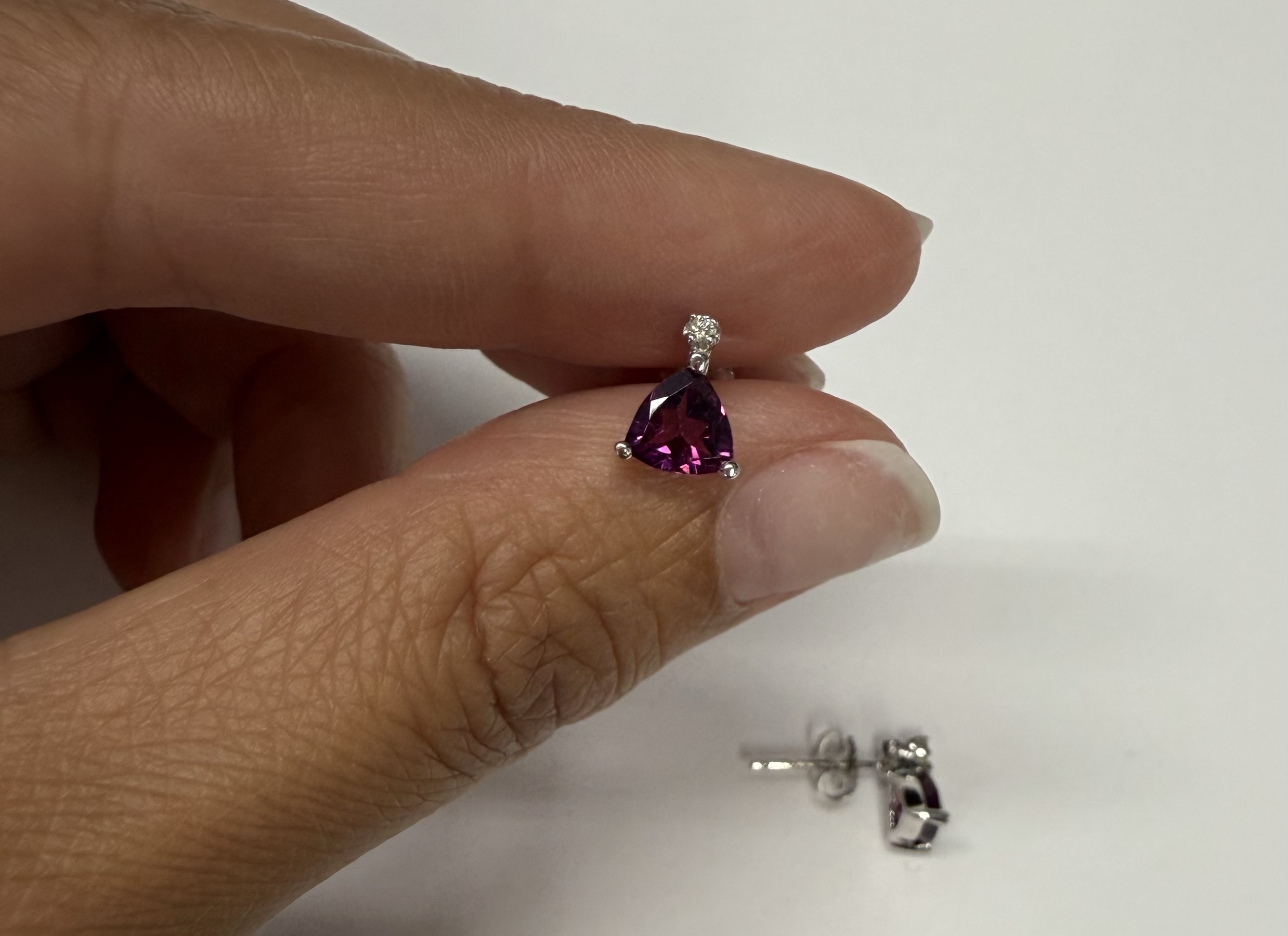 14k white gold trillion shaped genuine 1.80 Cttw Rhodolite Garnet and genuine .03 cttw Round Brilliant Cut diamond stud earrings. These diamonds average G-H in color and SI1 in clarity. These earrings have an entire weight of 1.5 grams.
