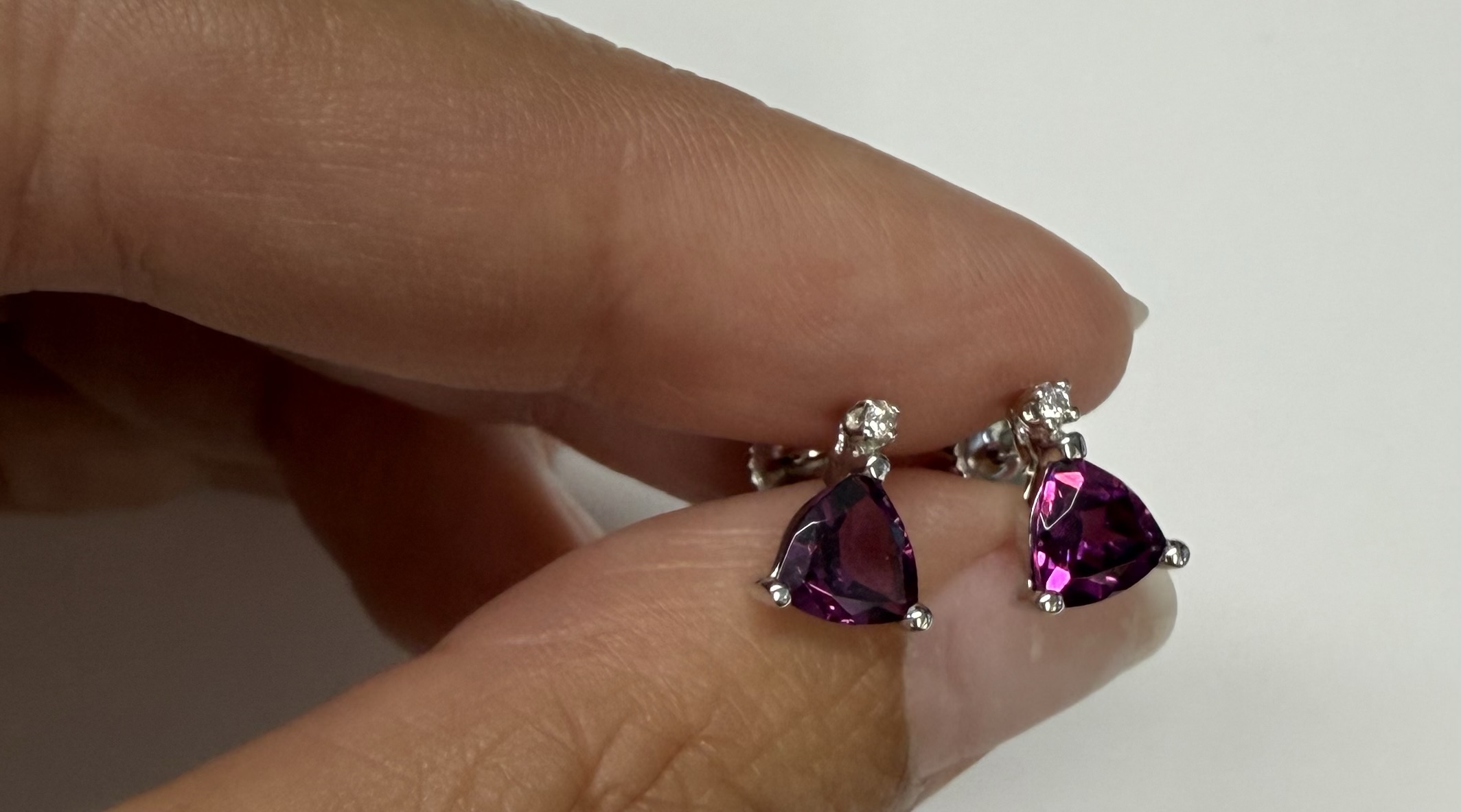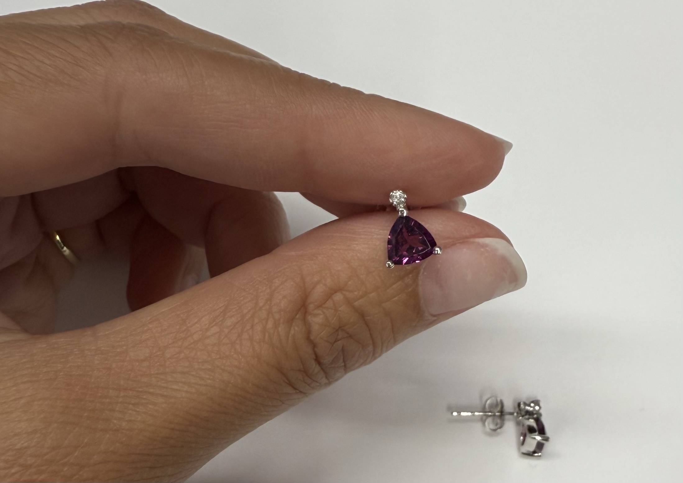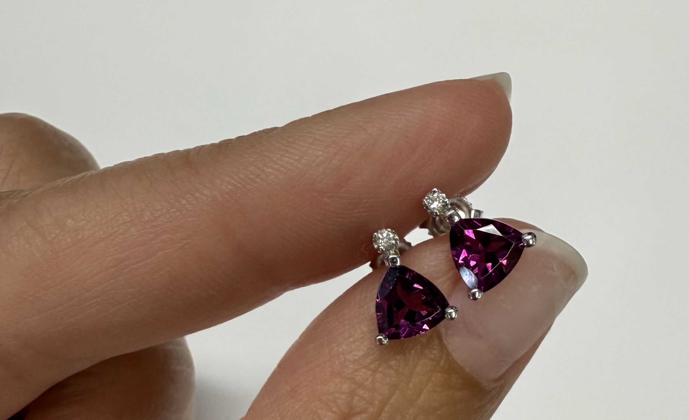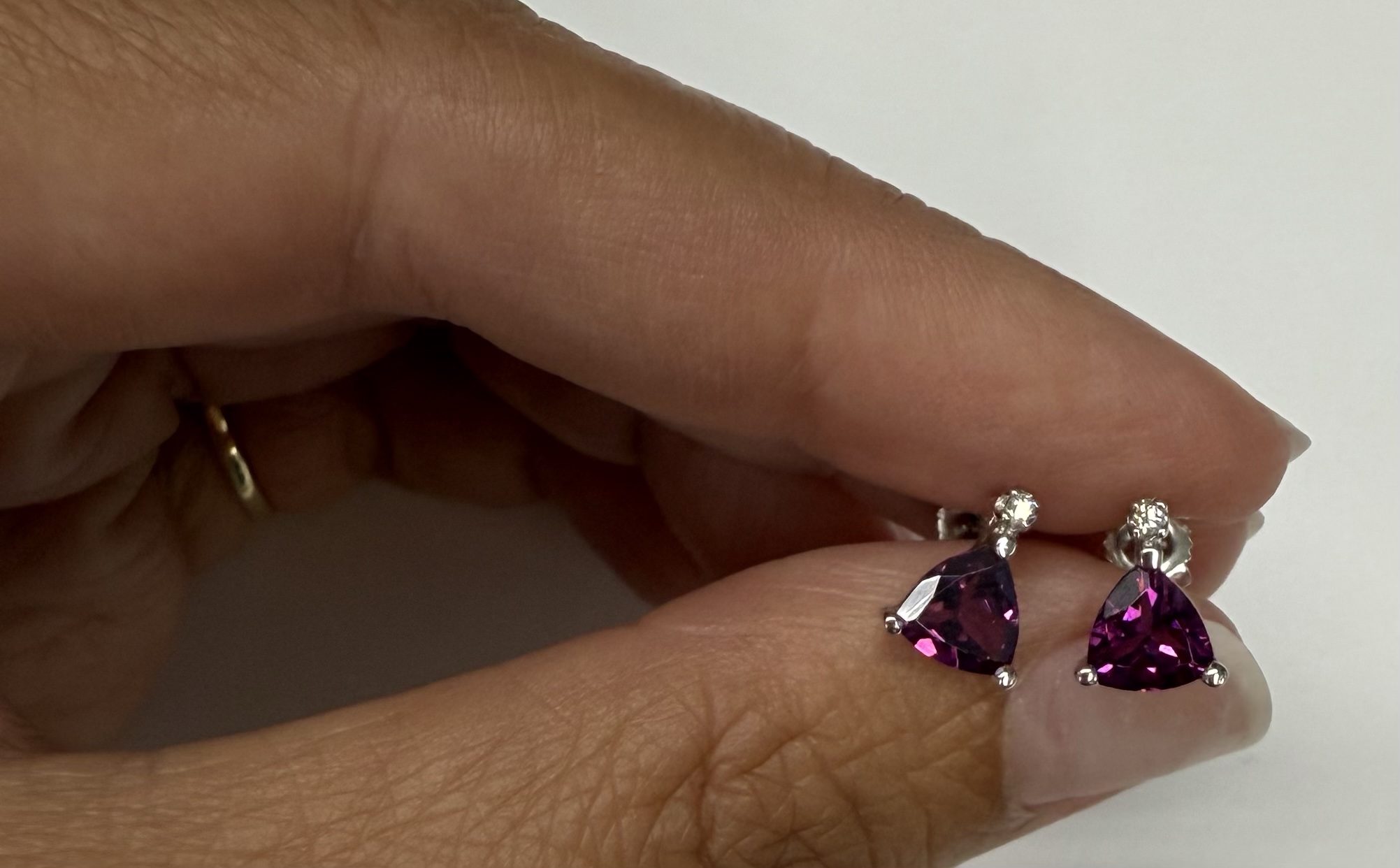 14k white gold trillion shaped genuine 1.80 Cttw Rhodolite Garnet and genuine .03 cttw Round Brilliant Cut diamond stud earrings. These diamonds average G-H in color and SI1 in clarity. These earrings have an entire weight of 1.5 grams.
