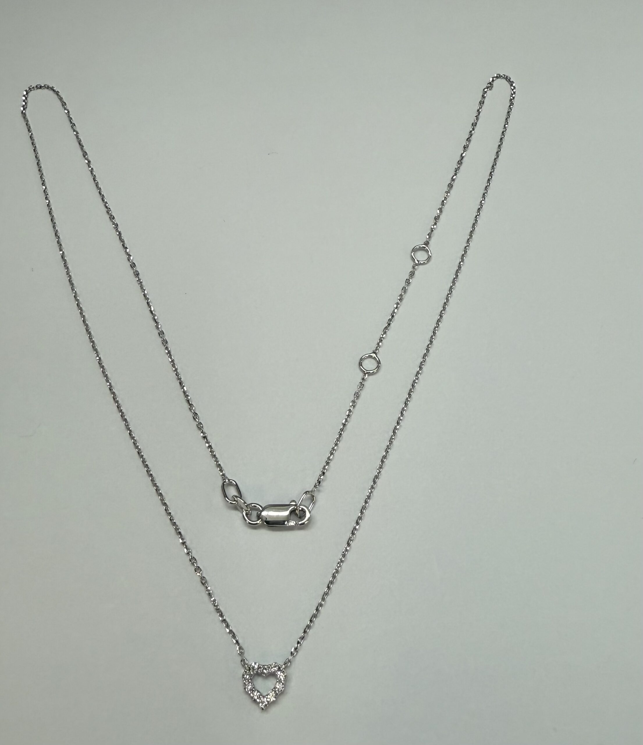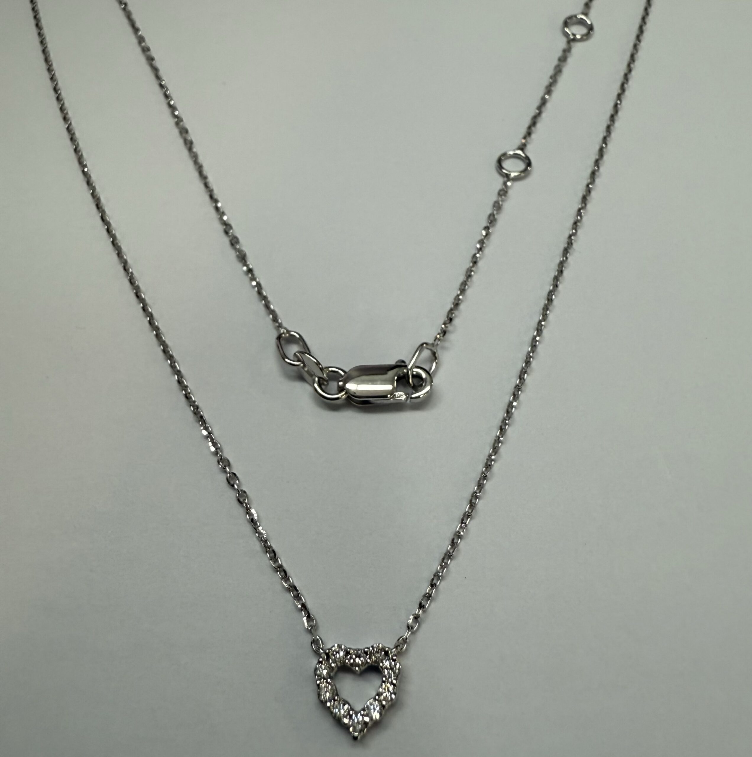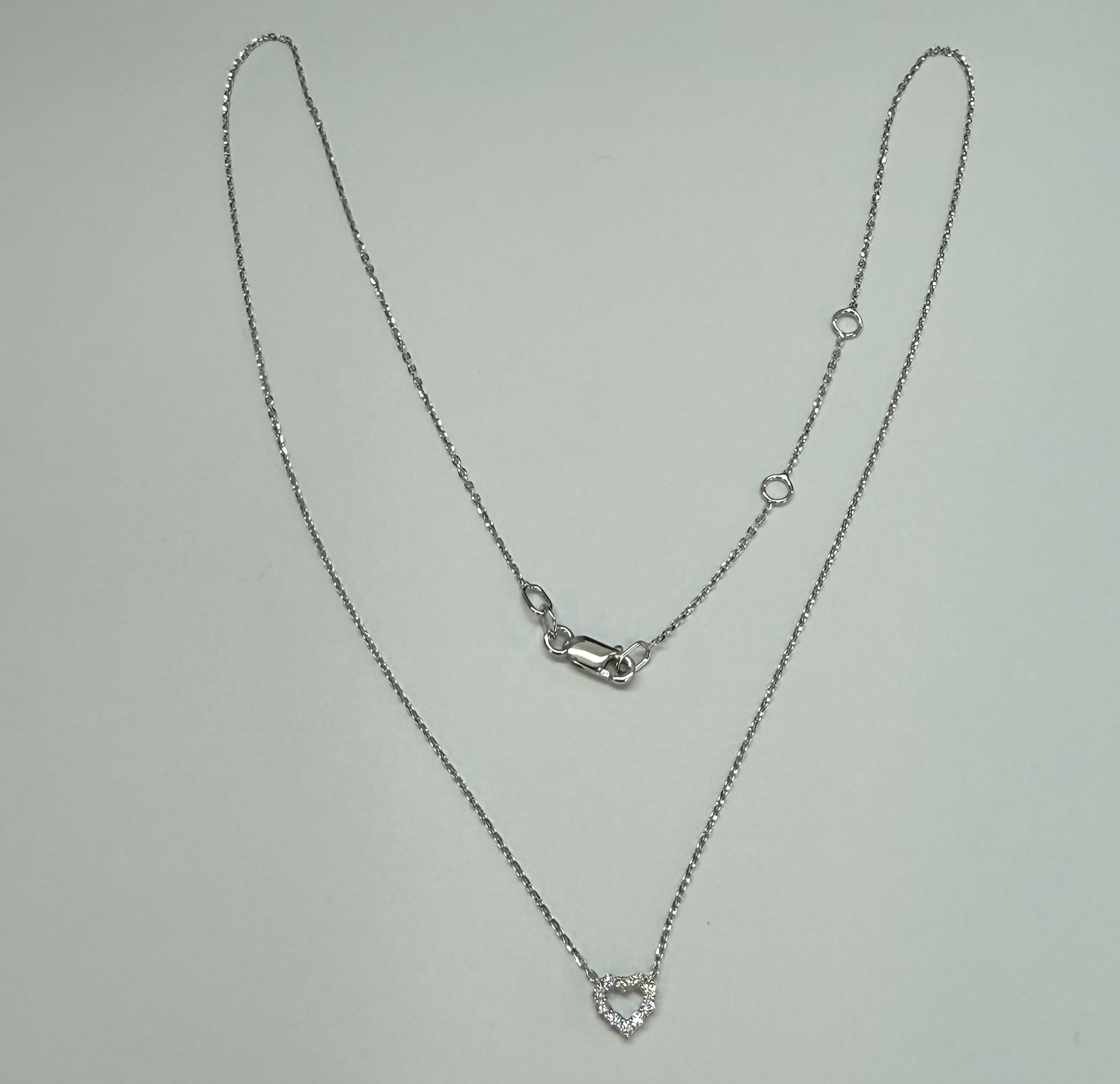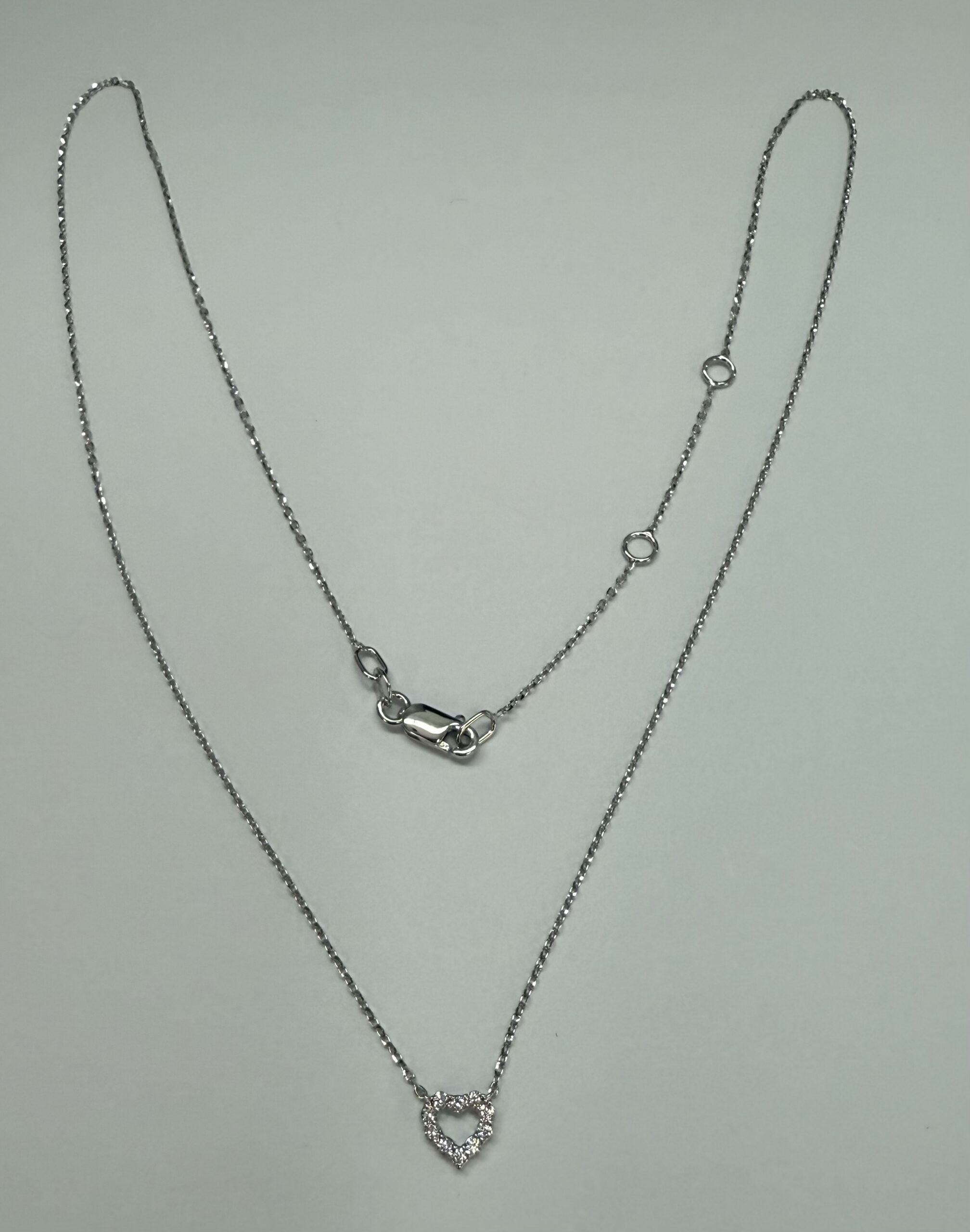14k white gold genuine .10 cttw Round Brilliant Cut diamond open heart pendant. These diamonds average G-H in color, and SI1 in clarity. This pendant is adjustable 16-18″ in length, and it has an entire weight of 1.6 grams.
