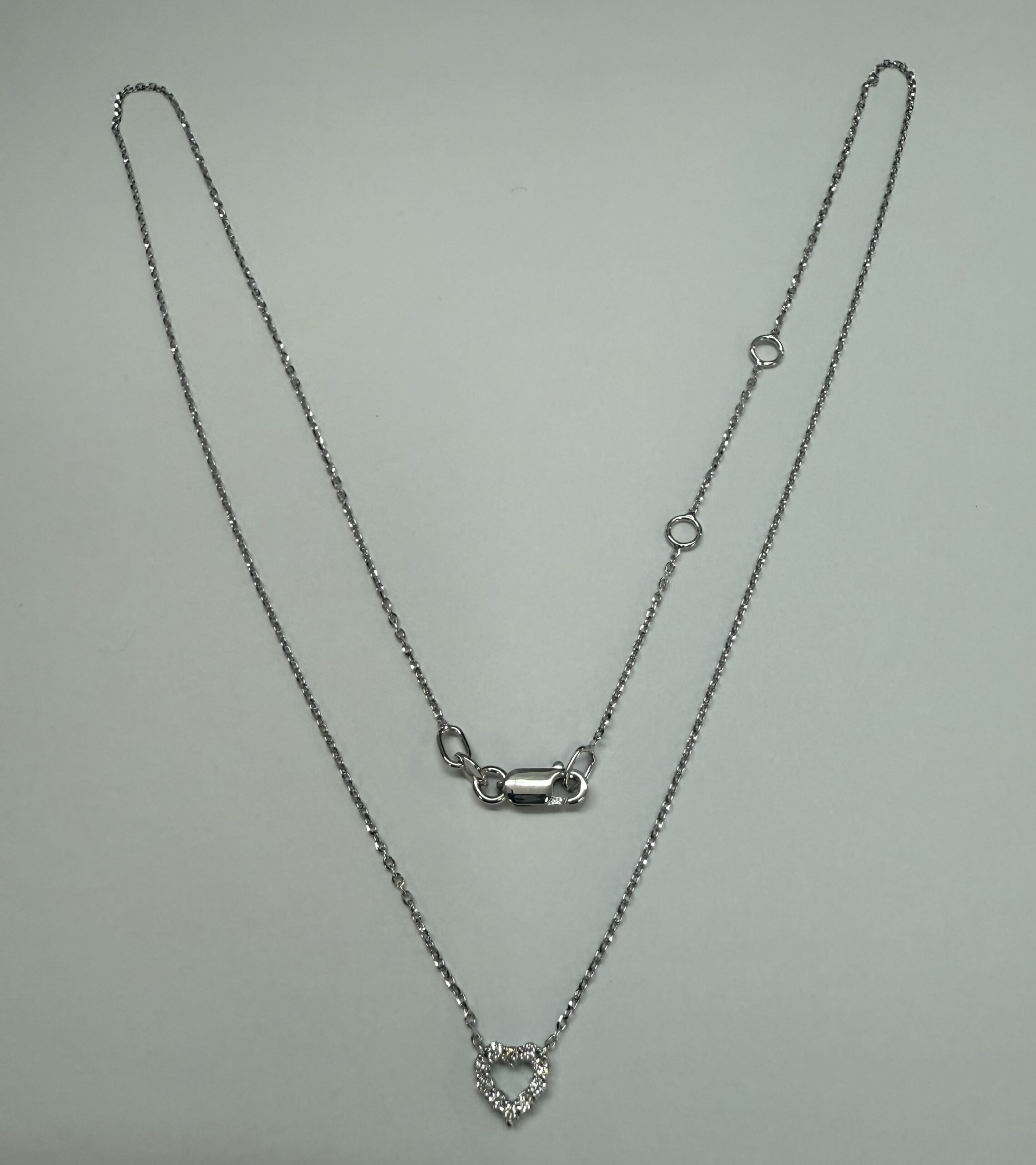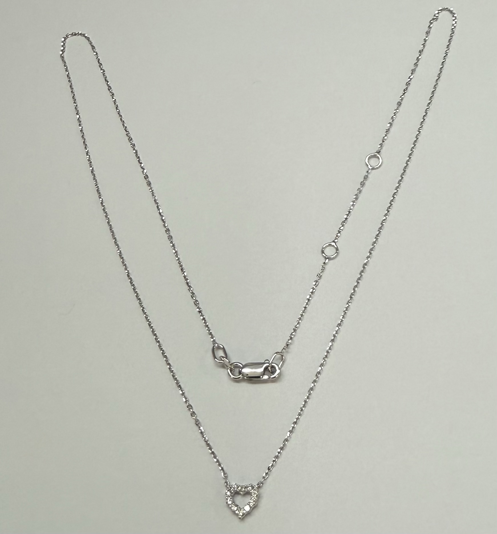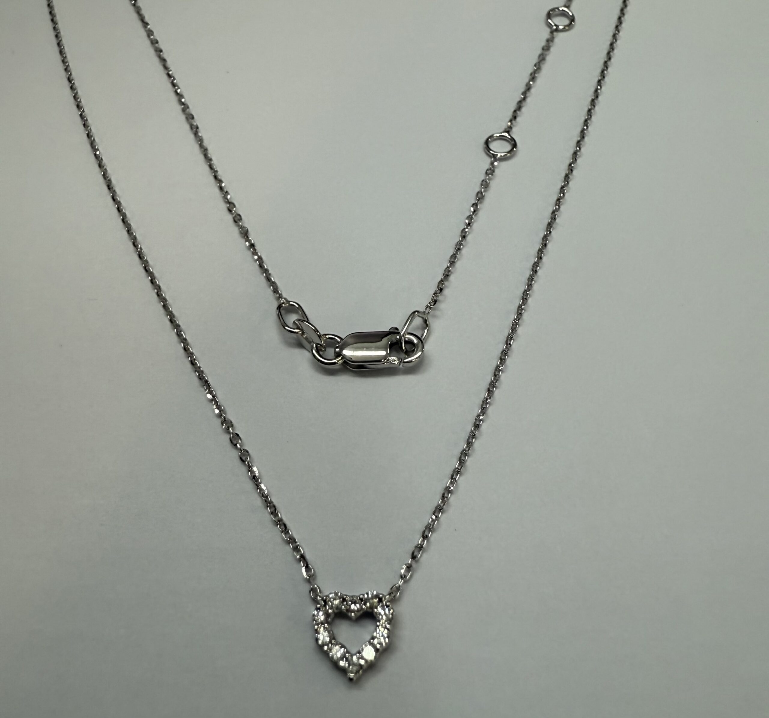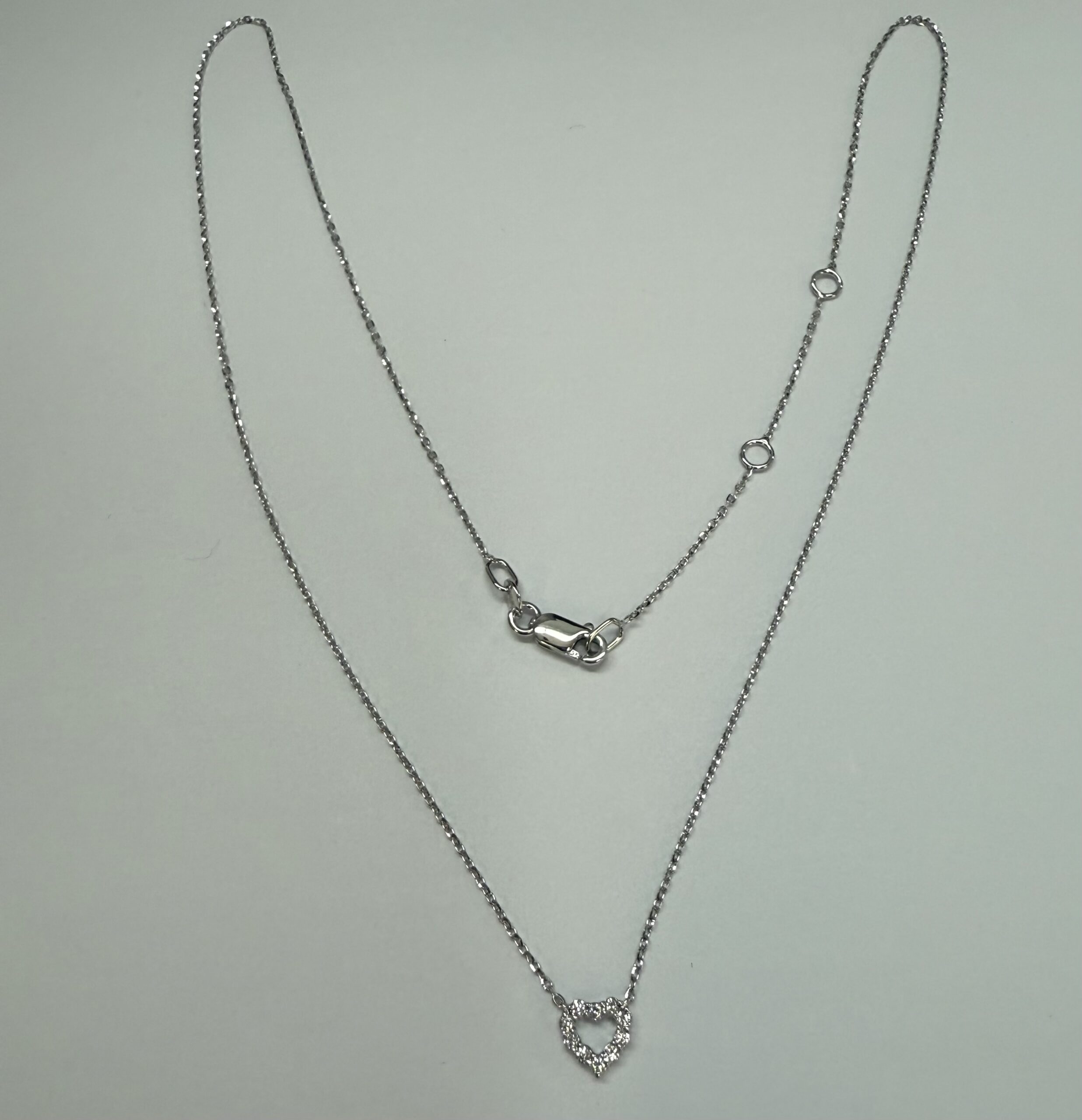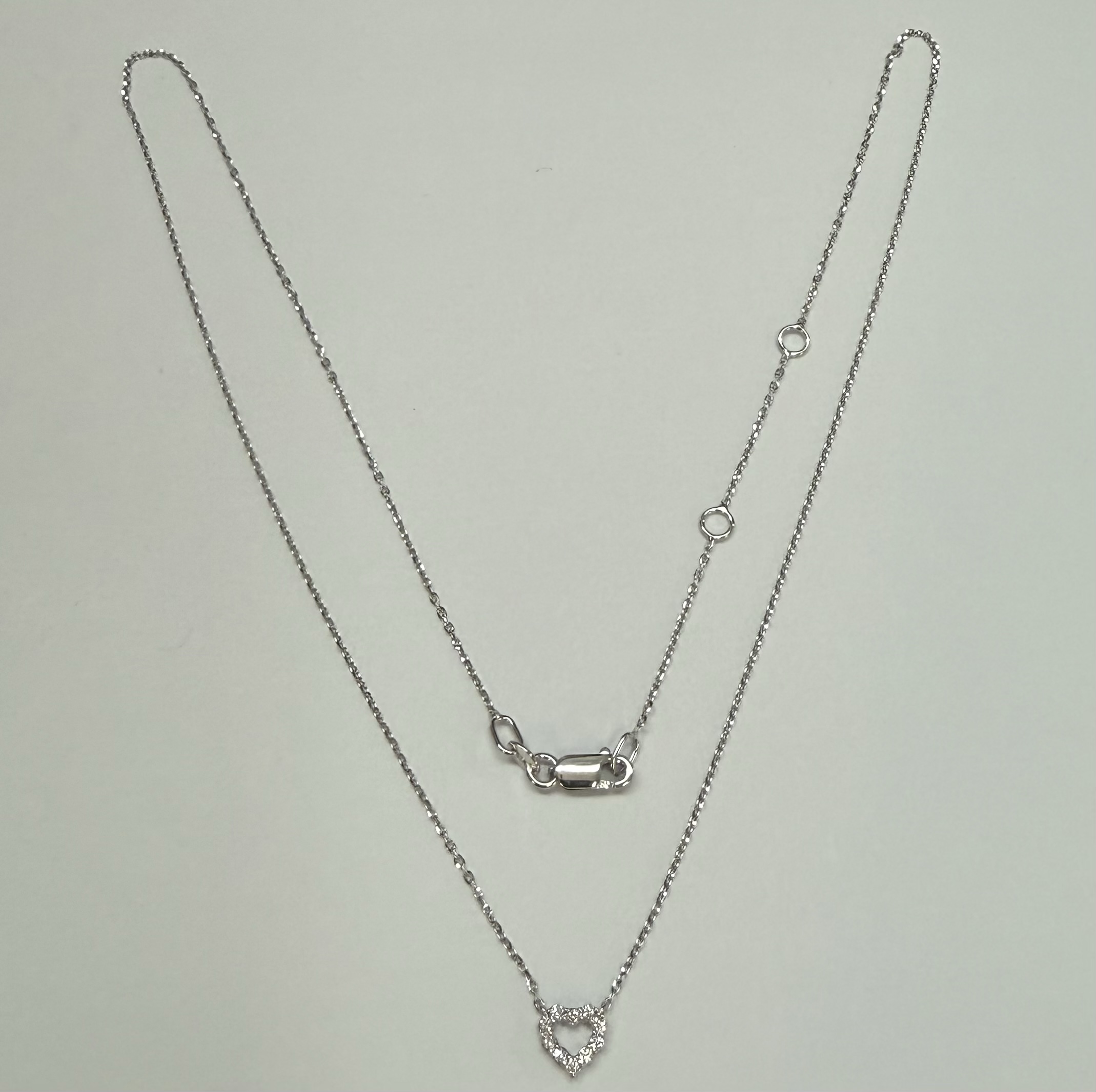 14k white gold genuine .10 cttw Round Brilliant Cut diamond open heart pendant. These diamonds average G-H in color, and SI1 in clarity. This pendant is adjustable 16-18″ in length, and it has an entire weight of 1.6 grams.