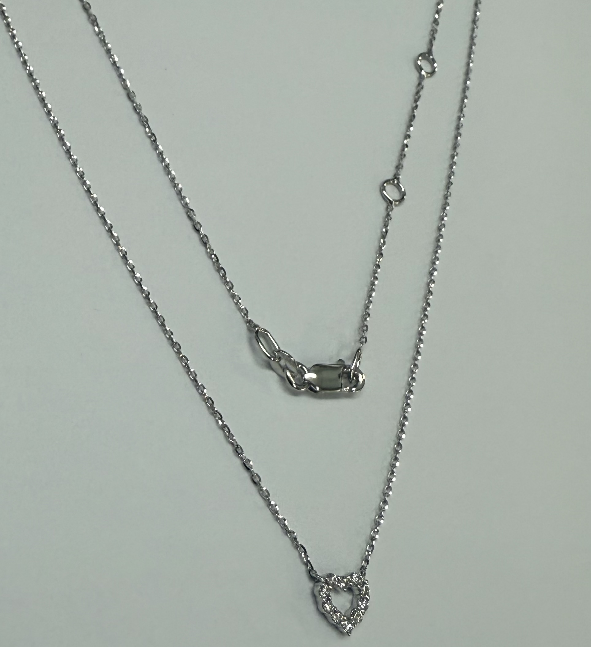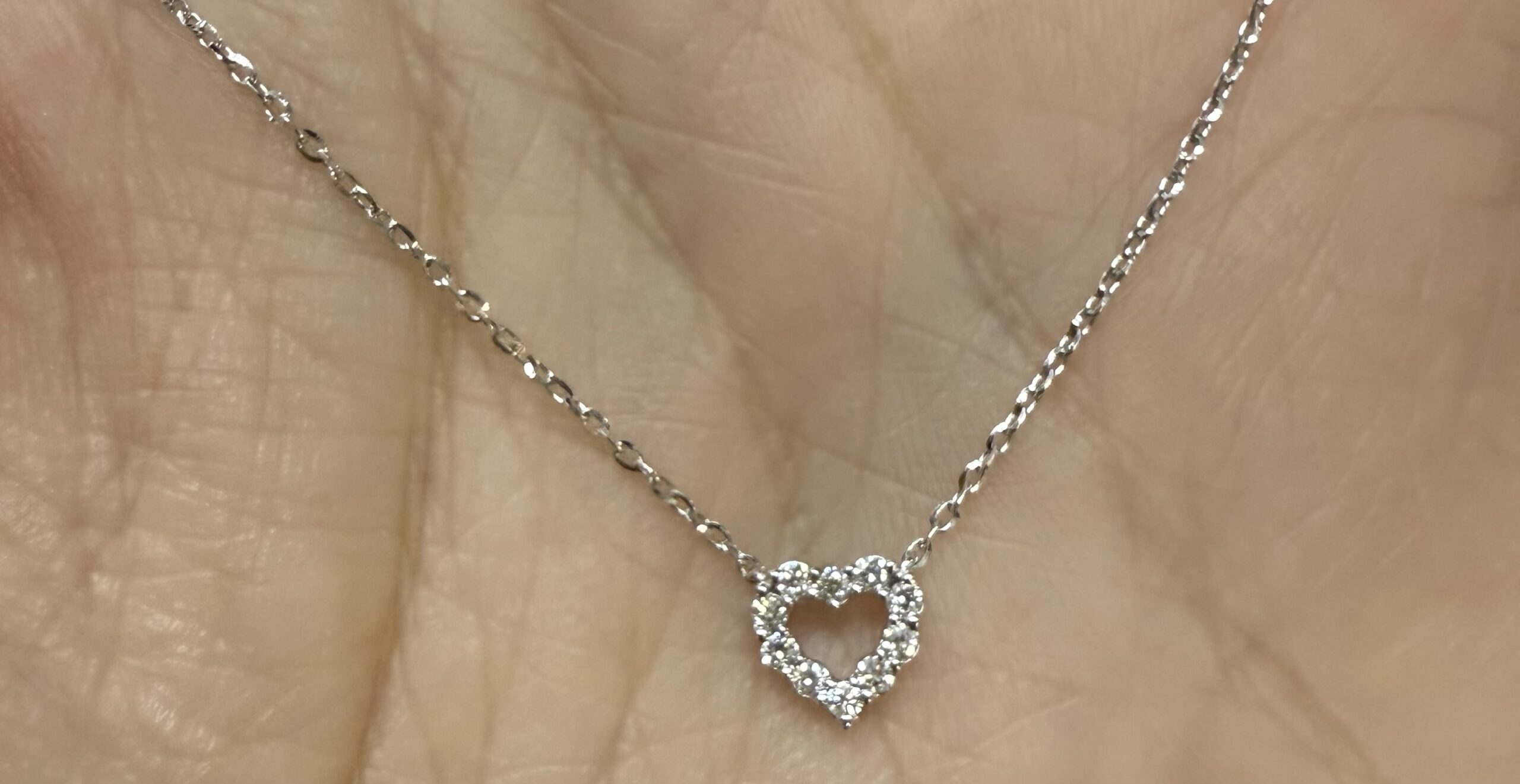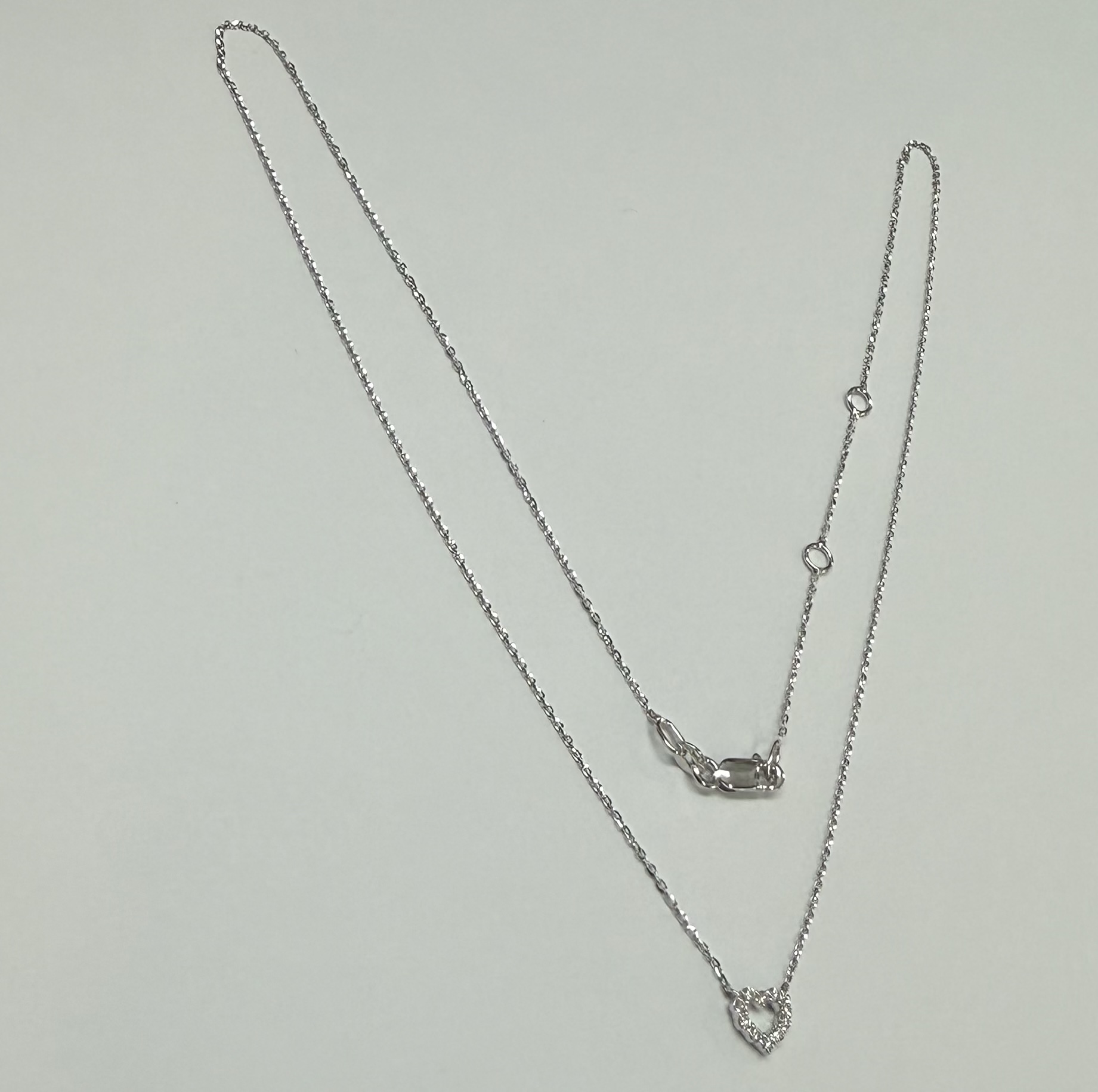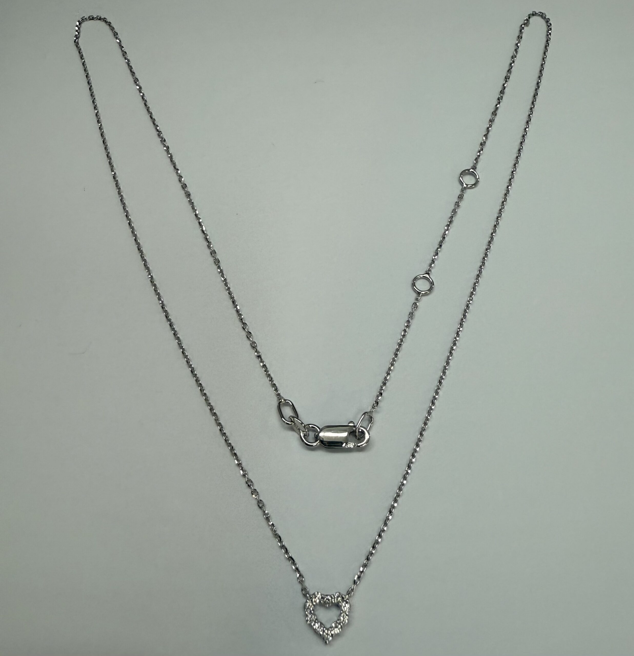14k white gold genuine .10 cttw Round Brilliant Cut diamond open heart pendant. These diamonds average G-H in color, and SI1 in clarity. This pendant is adjustable 16-18″ in length, and it has an entire weight of 1.6 grams.