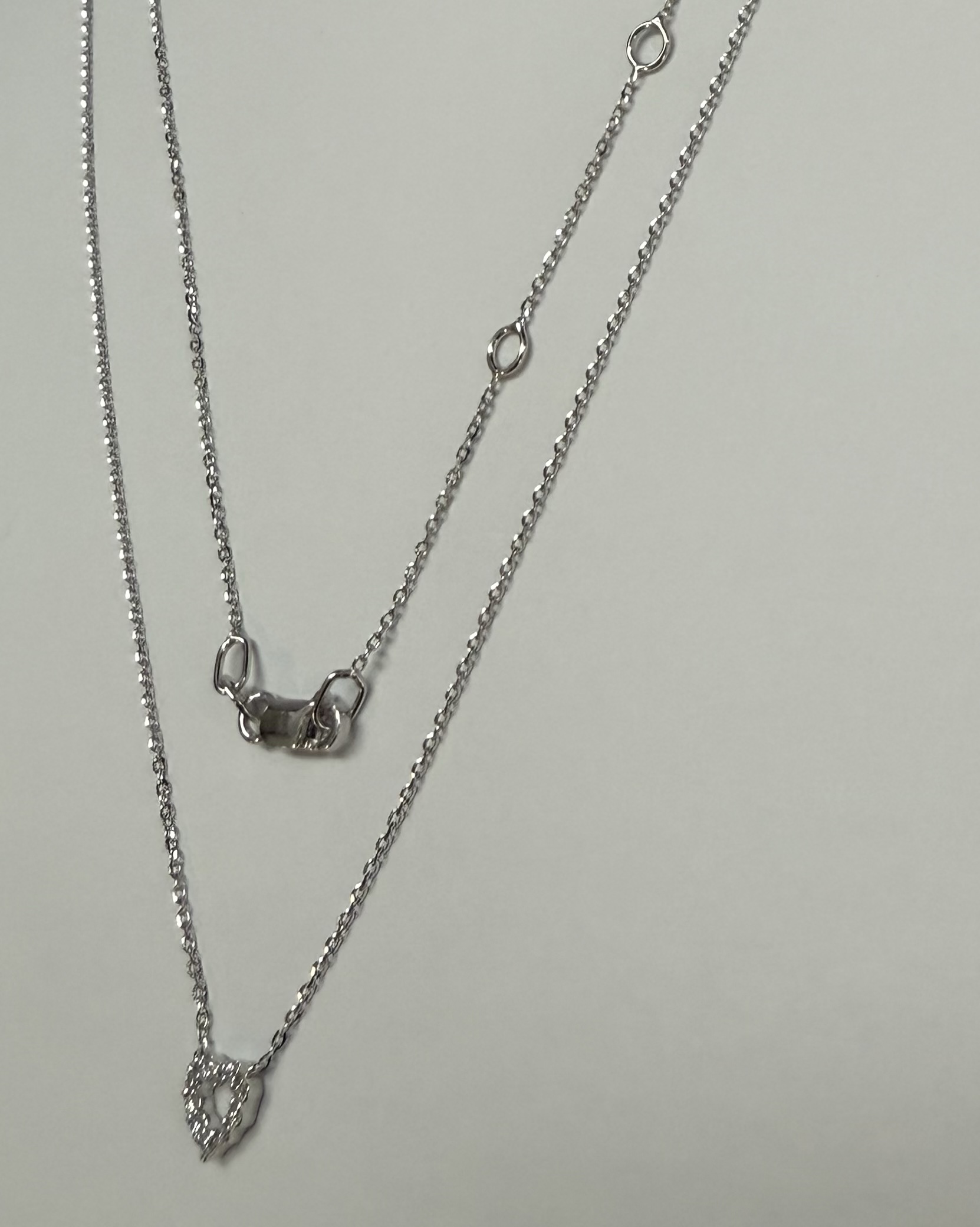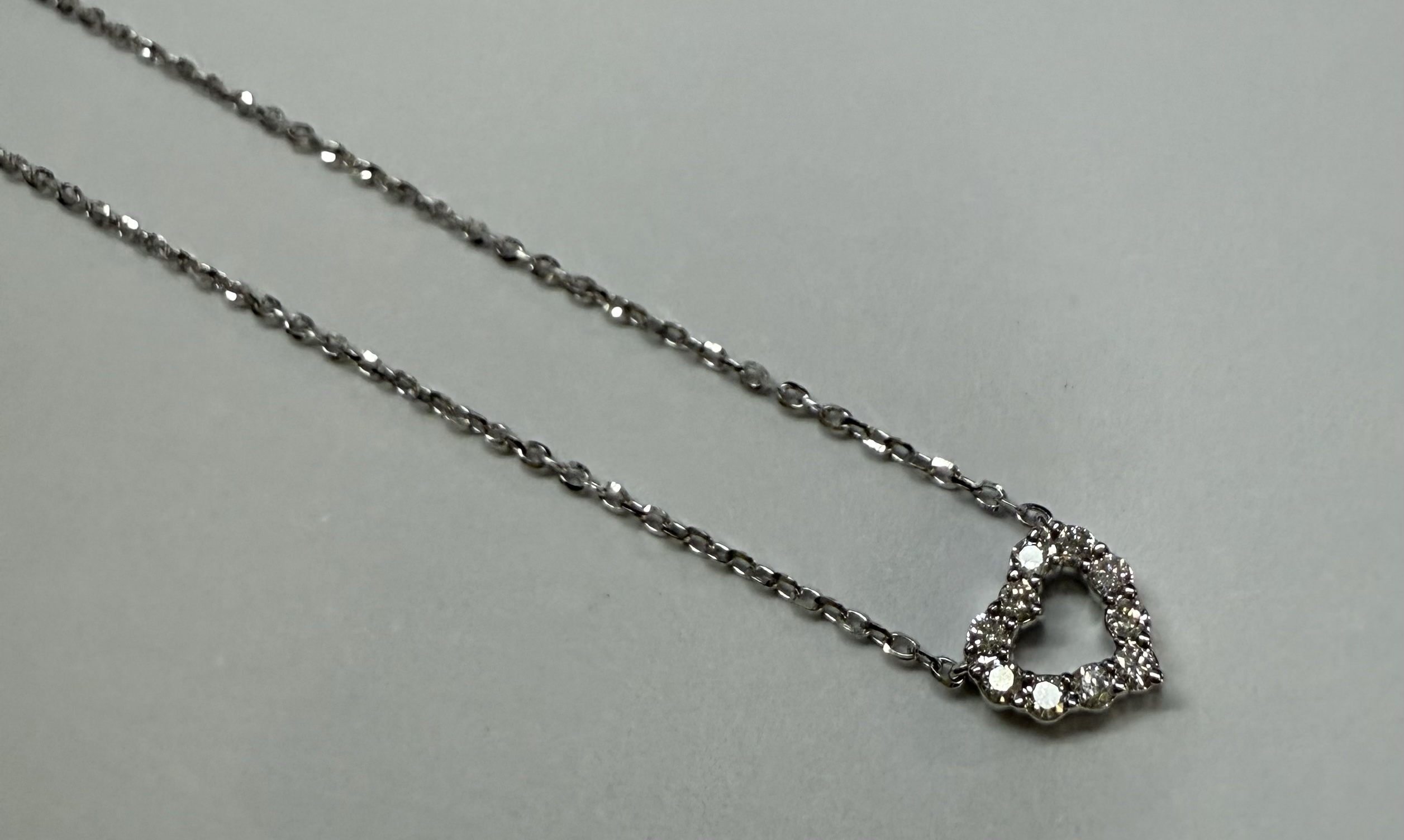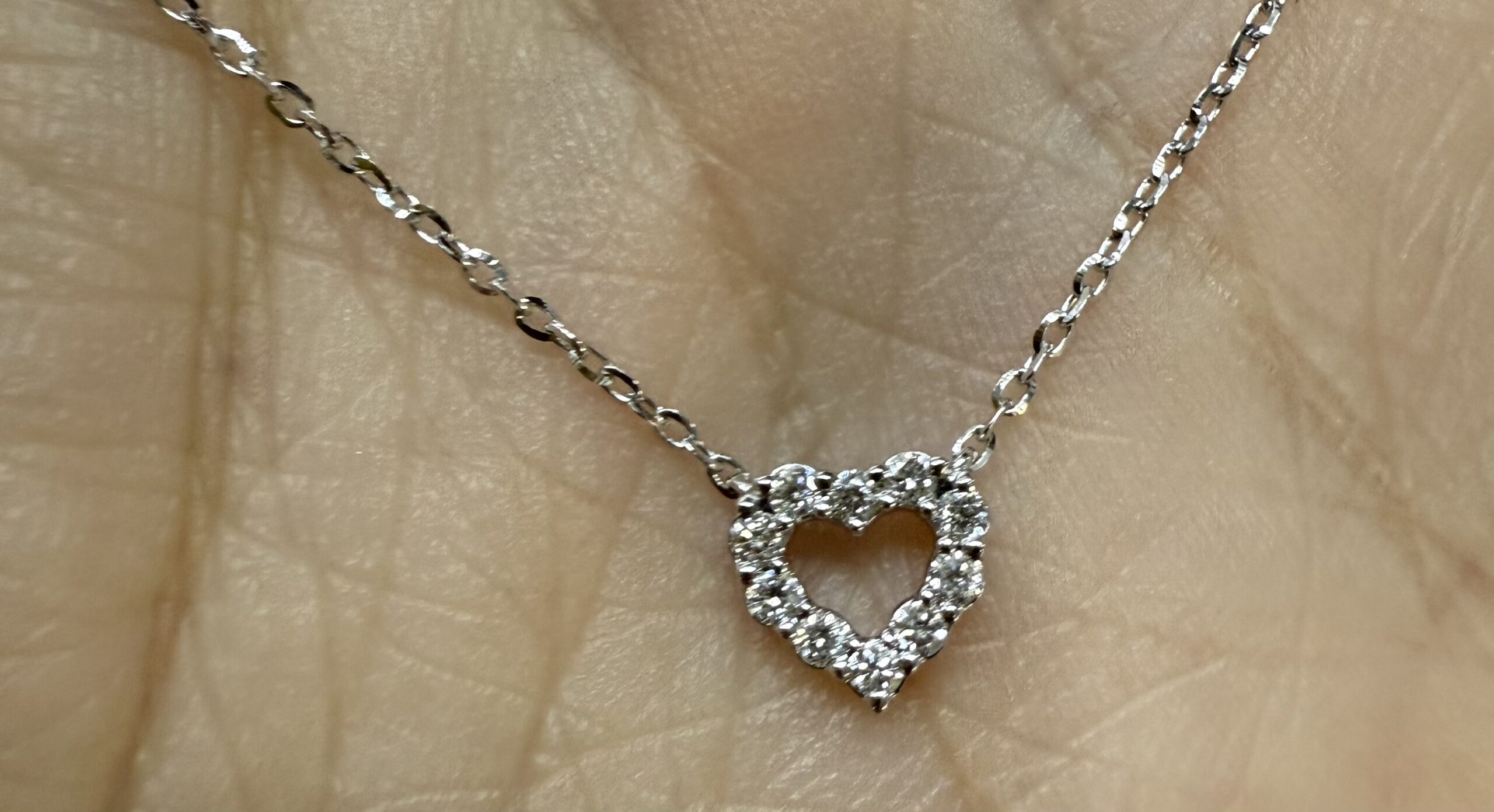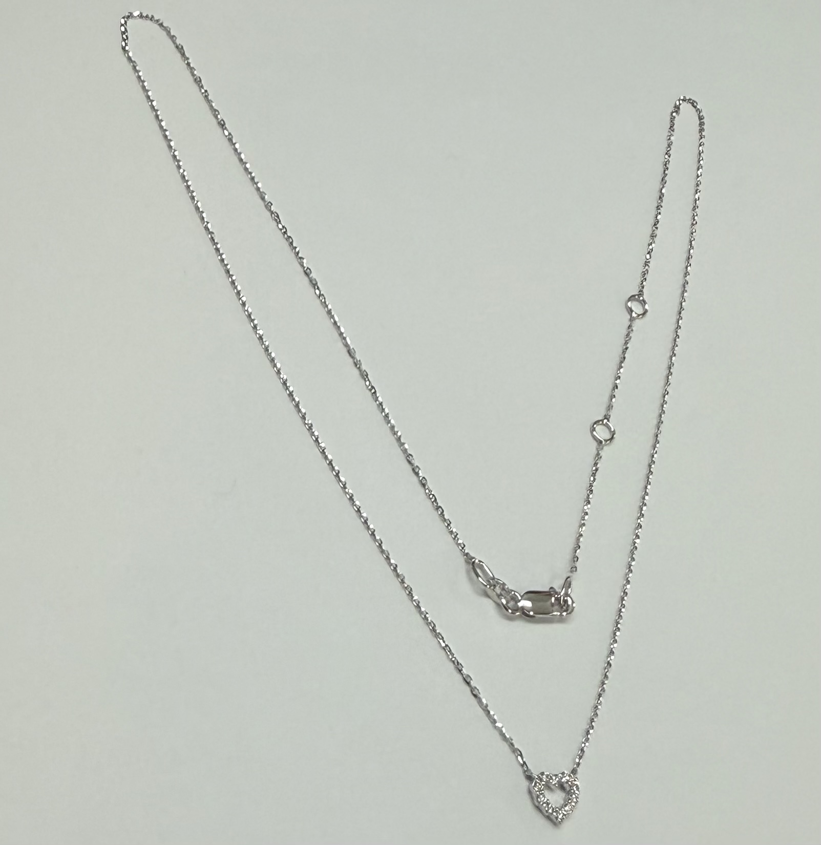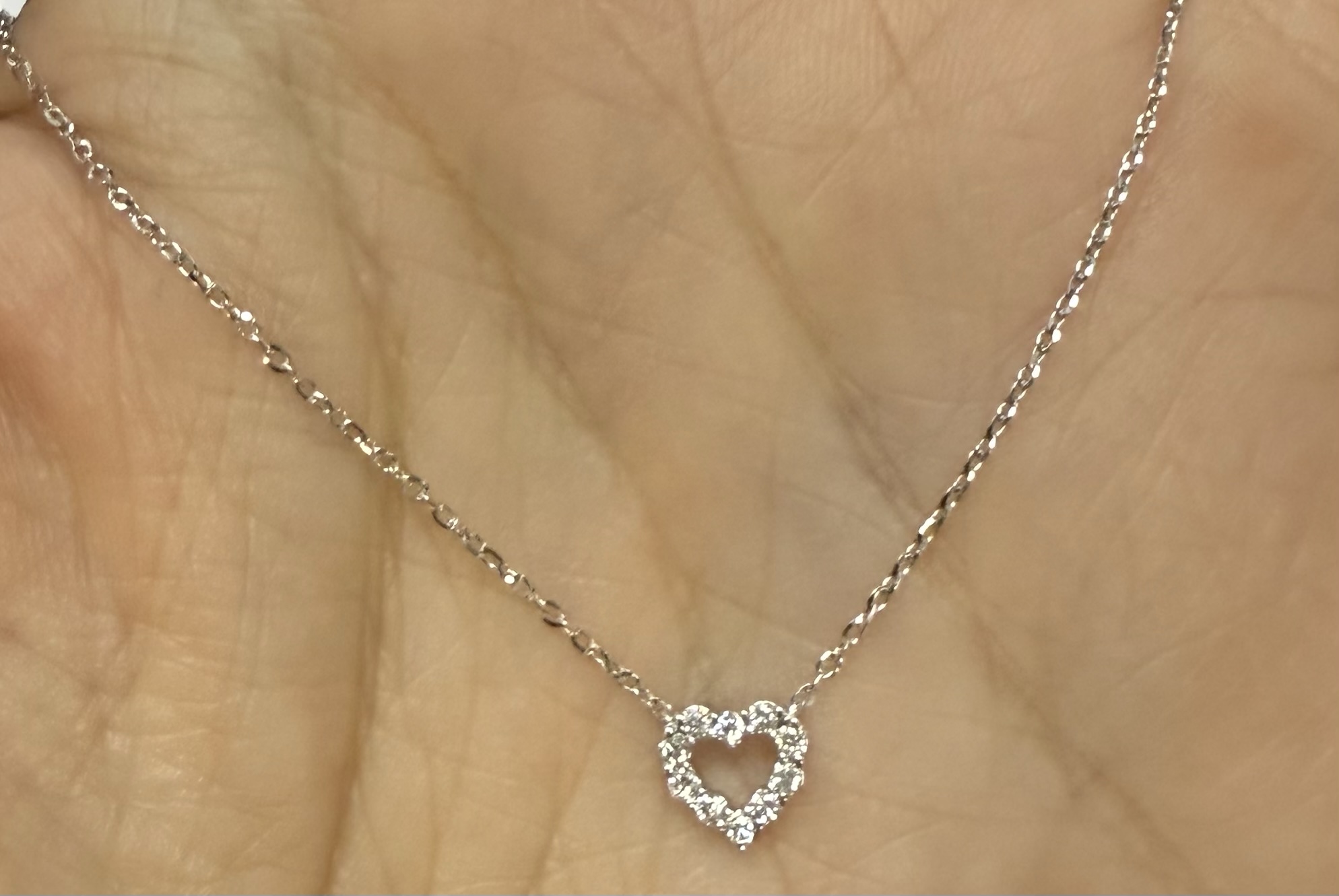 14k white gold genuine .10 cttw Round Brilliant Cut diamond open heart pendant. These diamonds average G-H in color, and SI1 in clarity. This pendant is adjustable 16-18″ in length, and it has an entire weight of 1.6 grams.